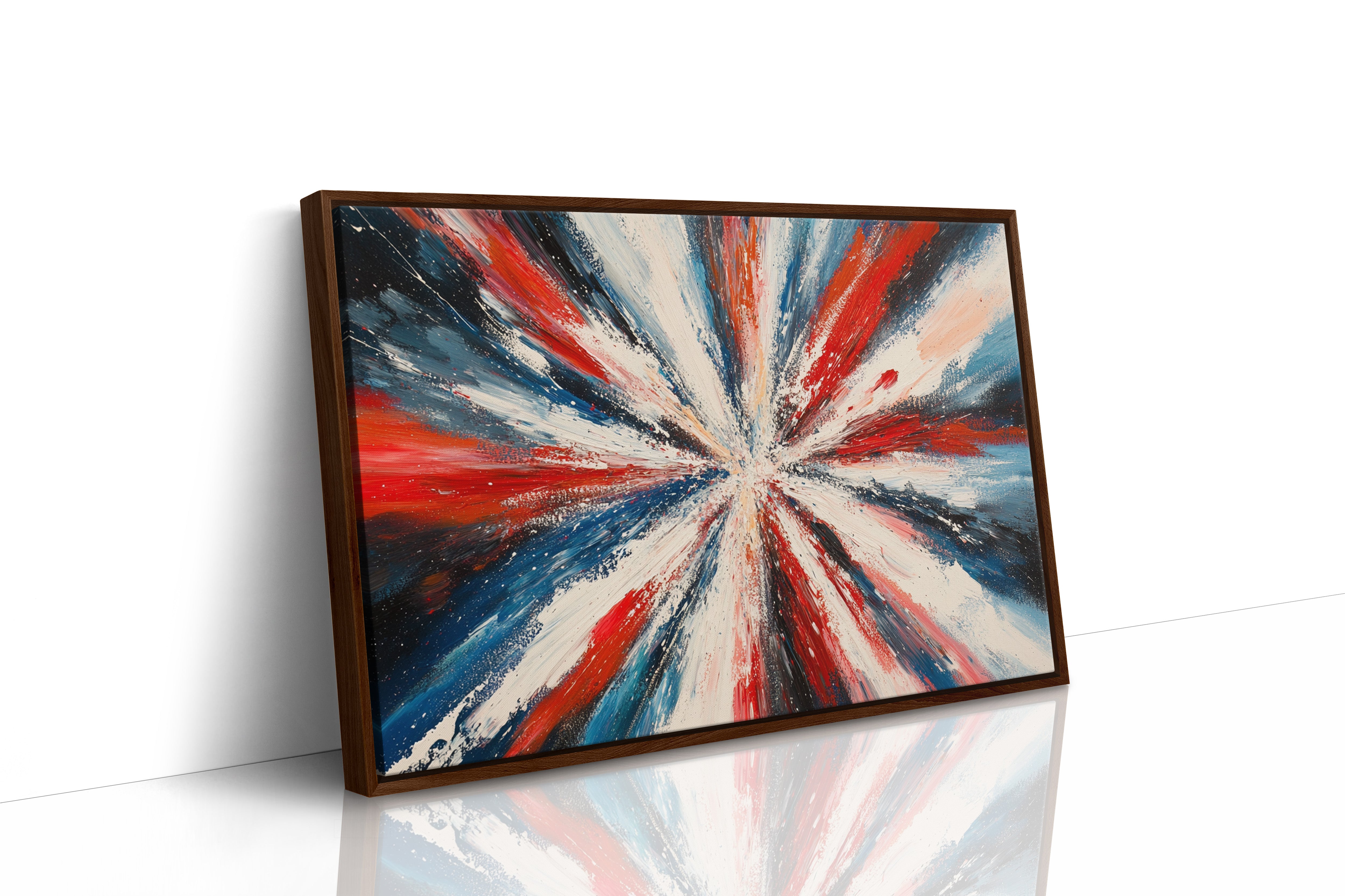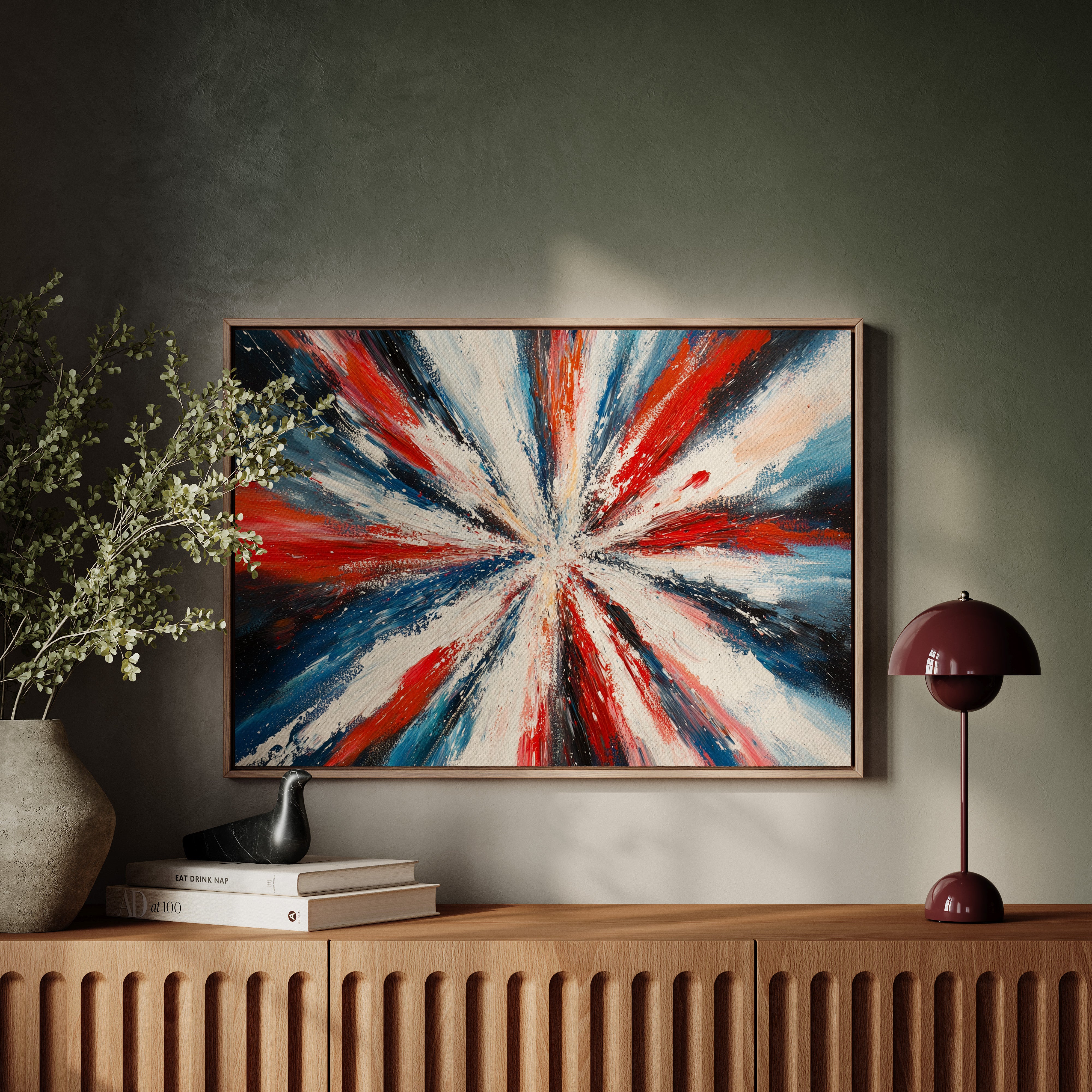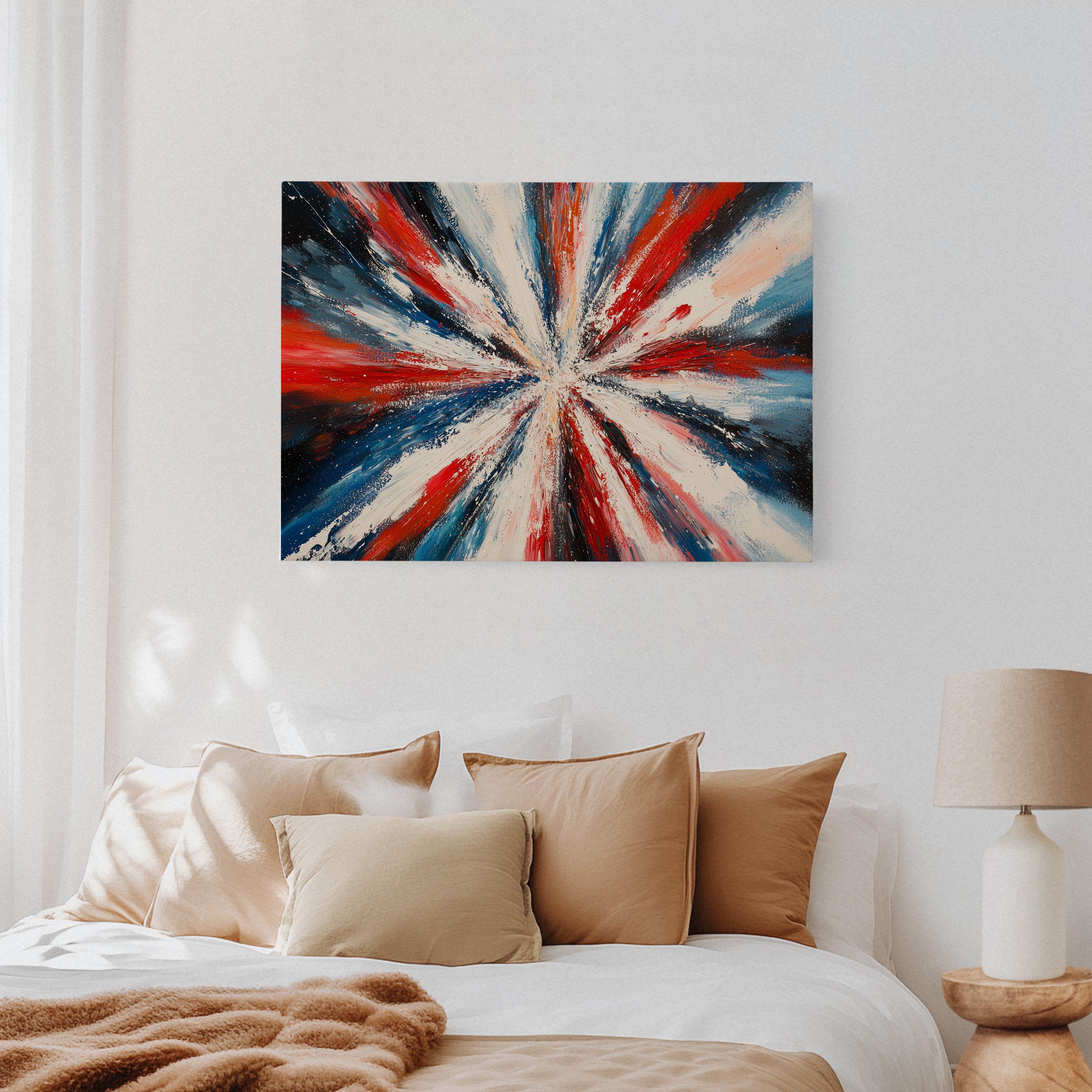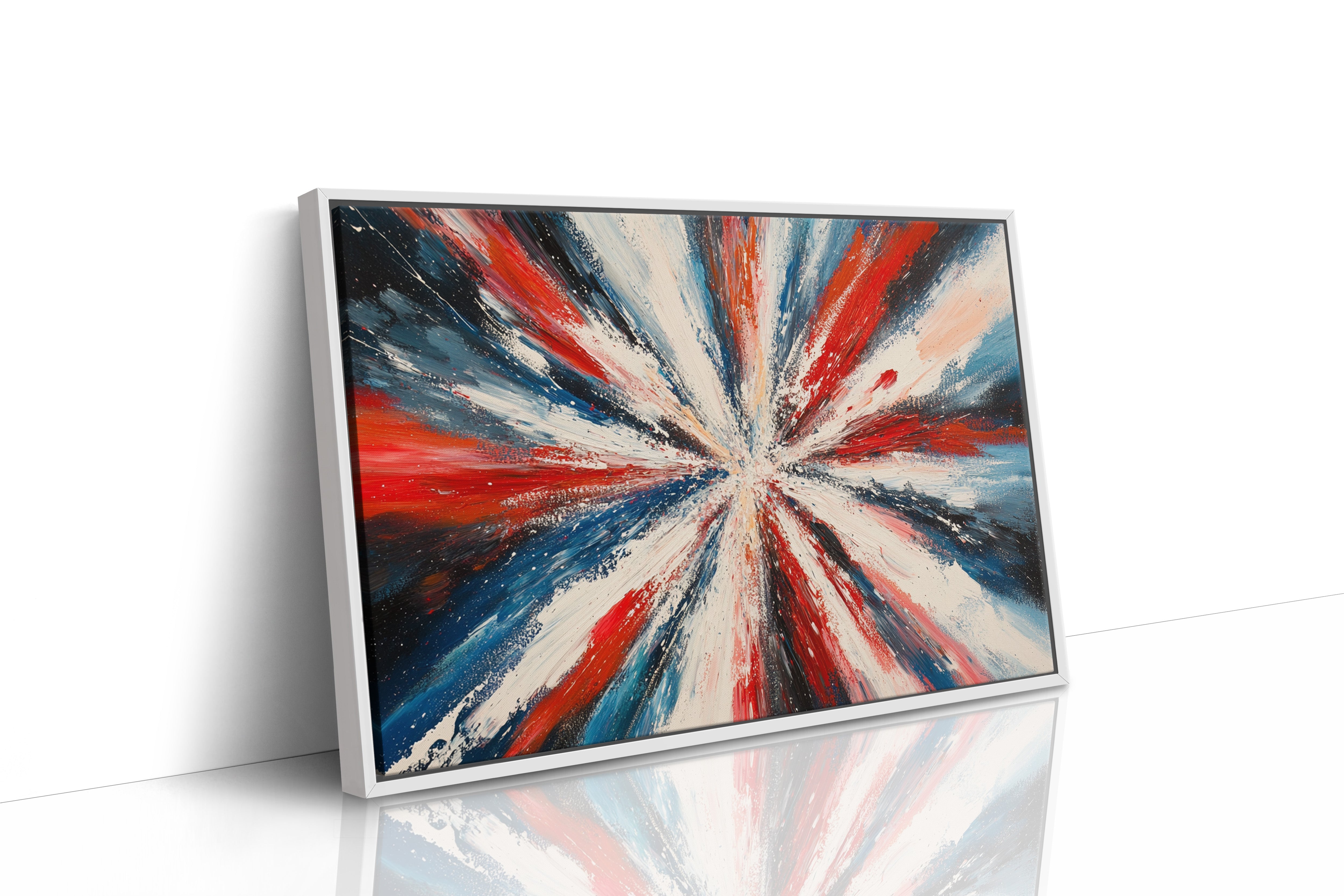 A spectacular burst of energy radiates from a central point, like a cosmic explosion frozen in time. Bold strokes of crimson red and deep navy blue streak outward against pristine white, creating a dynamic sense of movement and raw power. The textured brushwork captures the essence of an unstoppable force, with paint splatters and bold gestures suggesting both chaos and perfect harmony. This piece would command attention in a modern living space or add dramatic energy to a minimalist office, where its explosive vitality can serve as a focal point for contemplation and conversation.