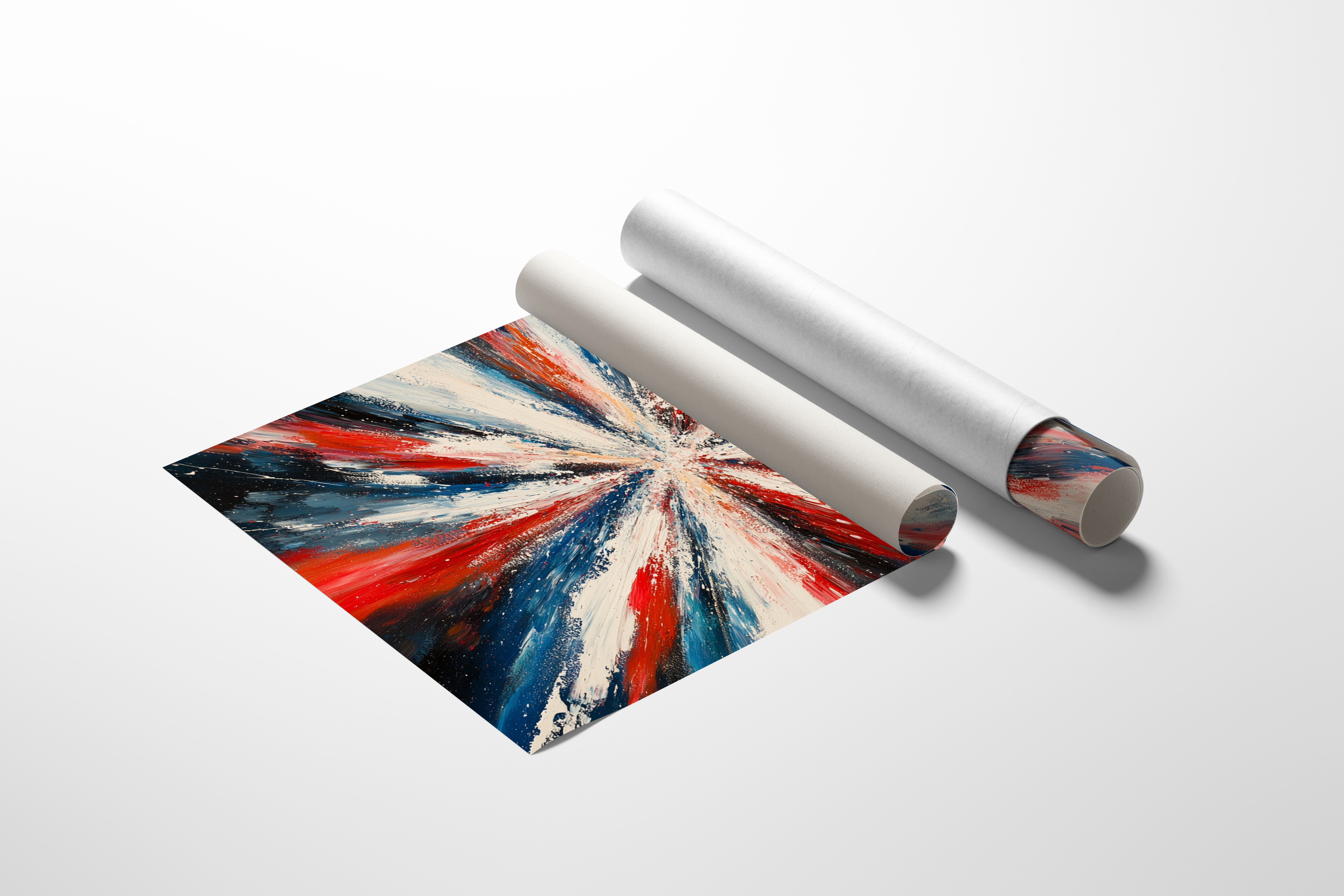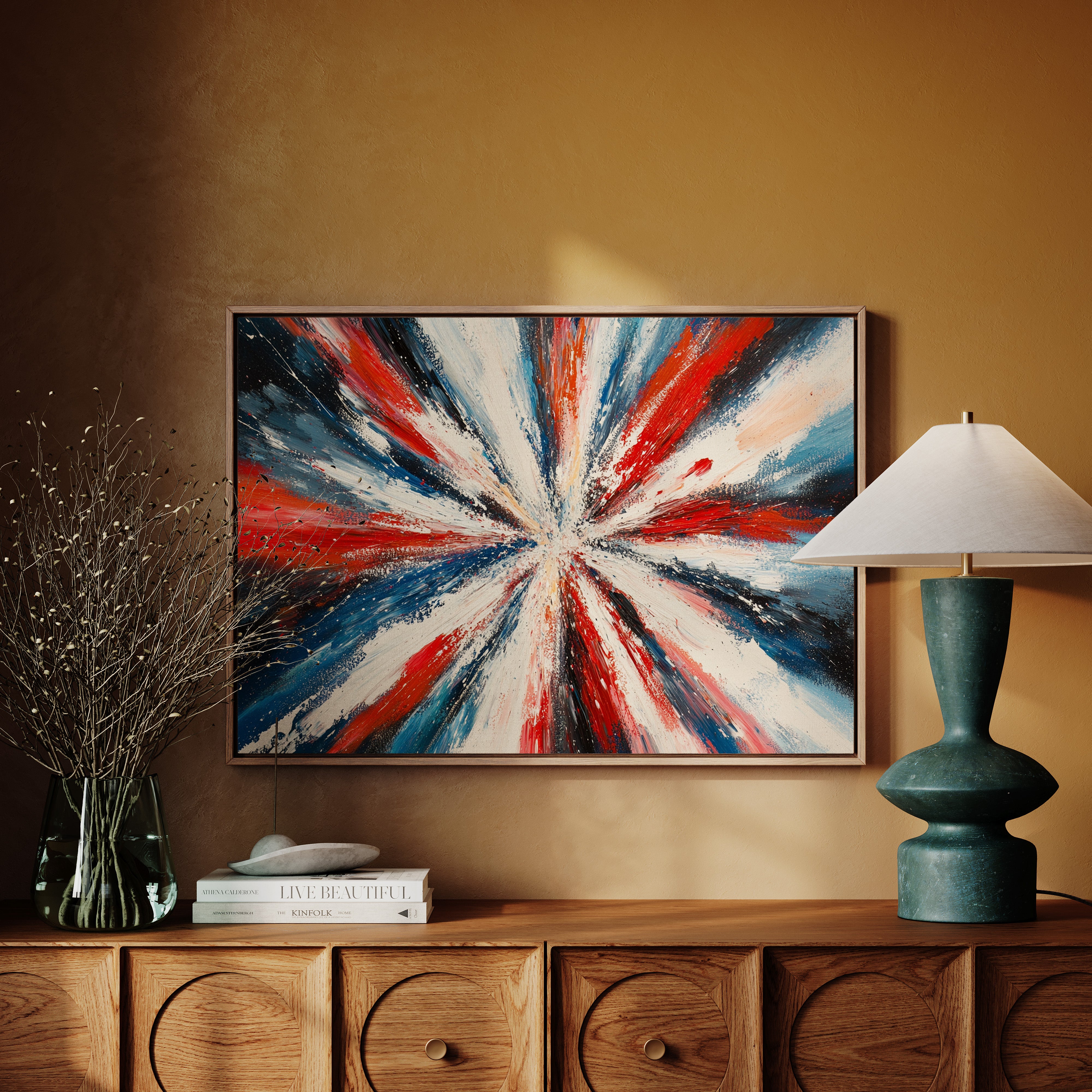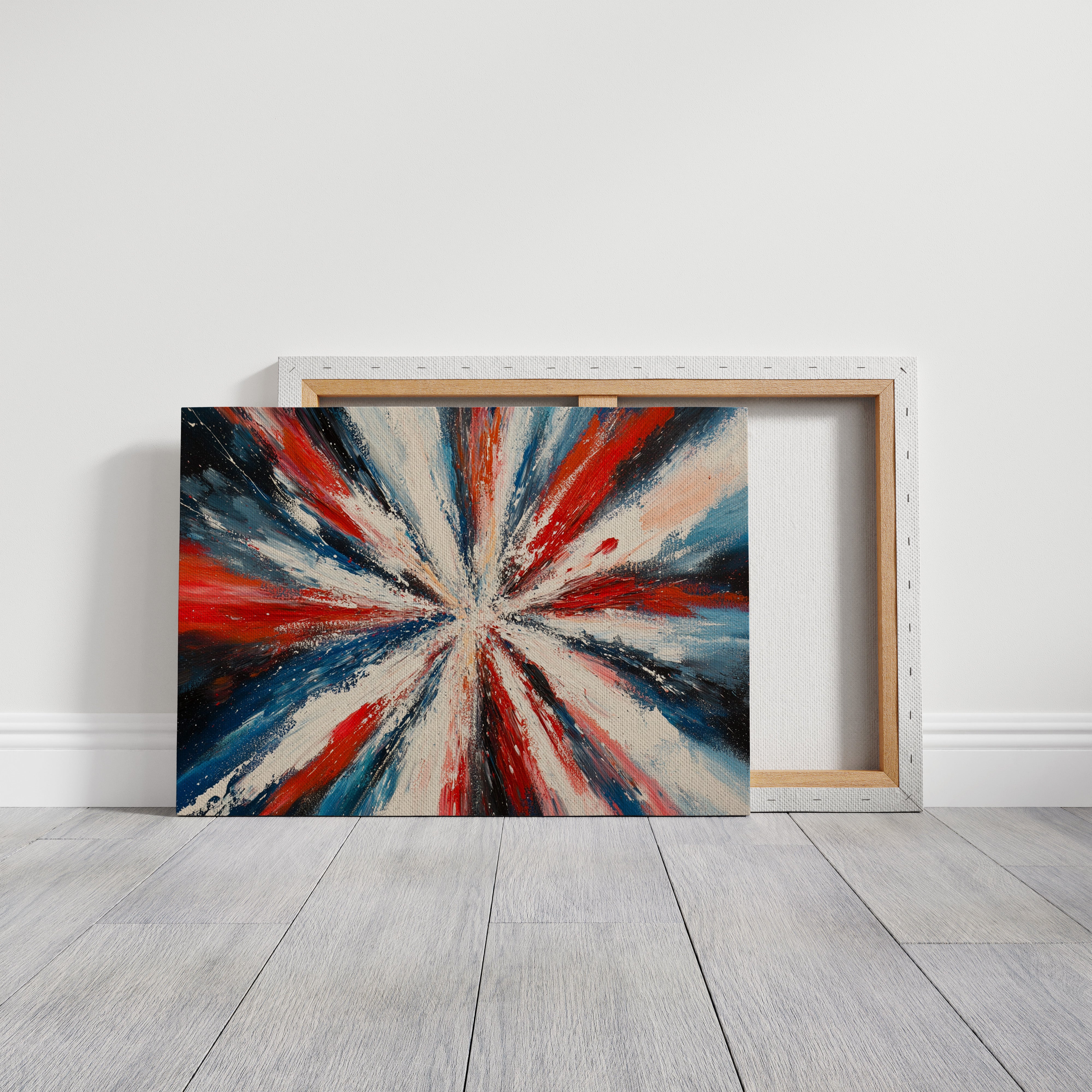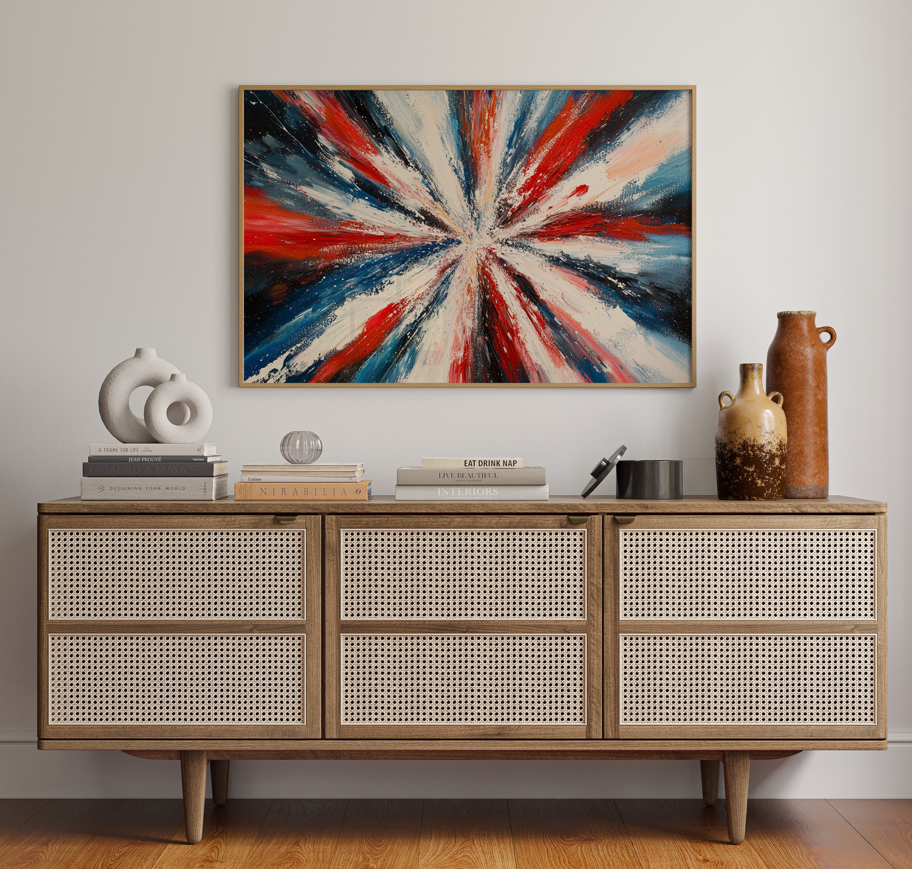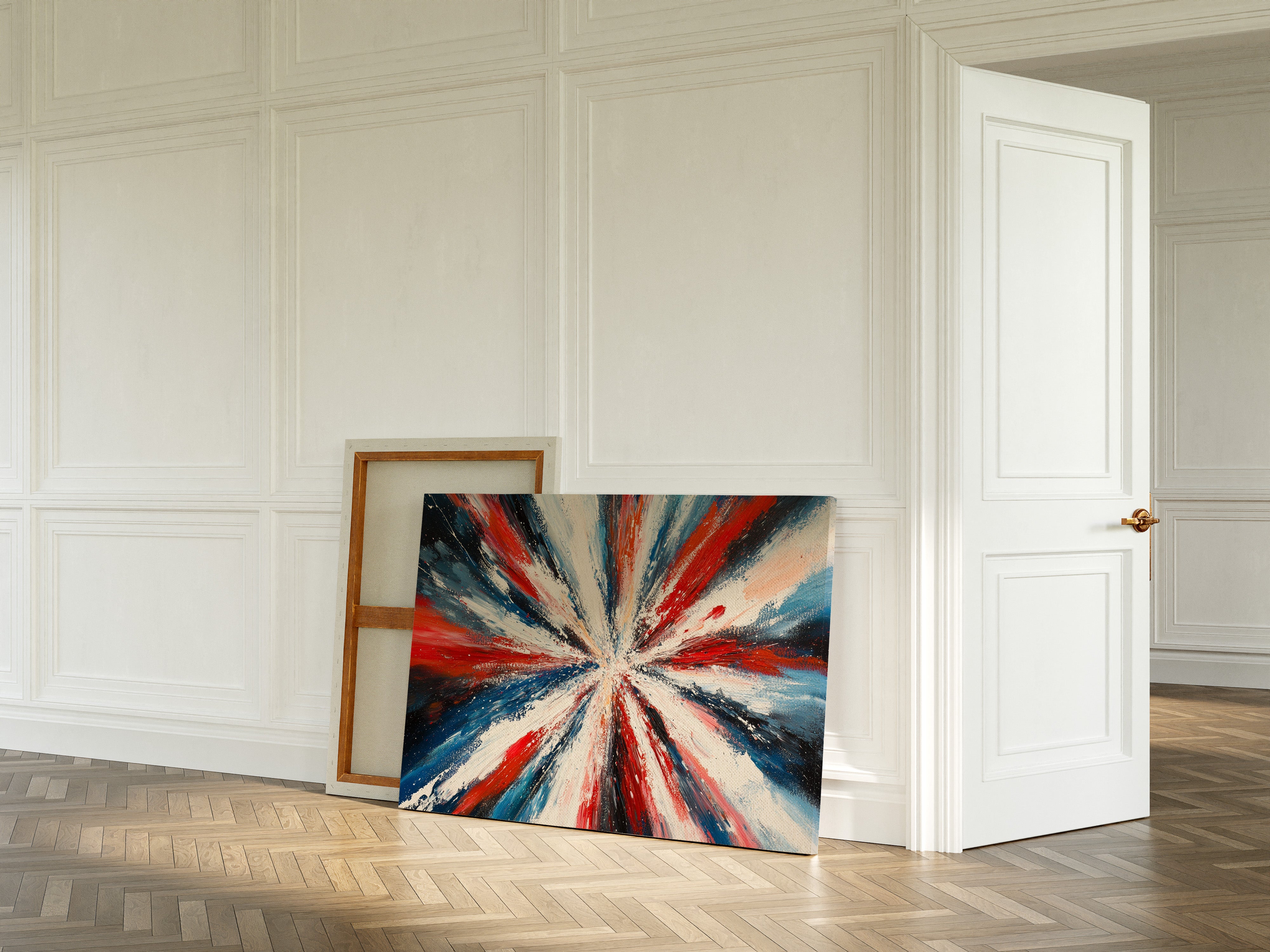 A spectacular burst of energy radiates from a central point, like a cosmic explosion frozen in time. Bold strokes of crimson red and deep navy blue streak outward against pristine white, creating a dynamic sense of movement and raw power. The textured brushwork captures the essence of an unstoppable force, with paint splatters and bold gestures suggesting both chaos and perfect harmony. This piece would command attention in a modern living space or add dramatic energy to a minimalist office, where its explosive vitality can serve as a focal point for contemplation and conversation.