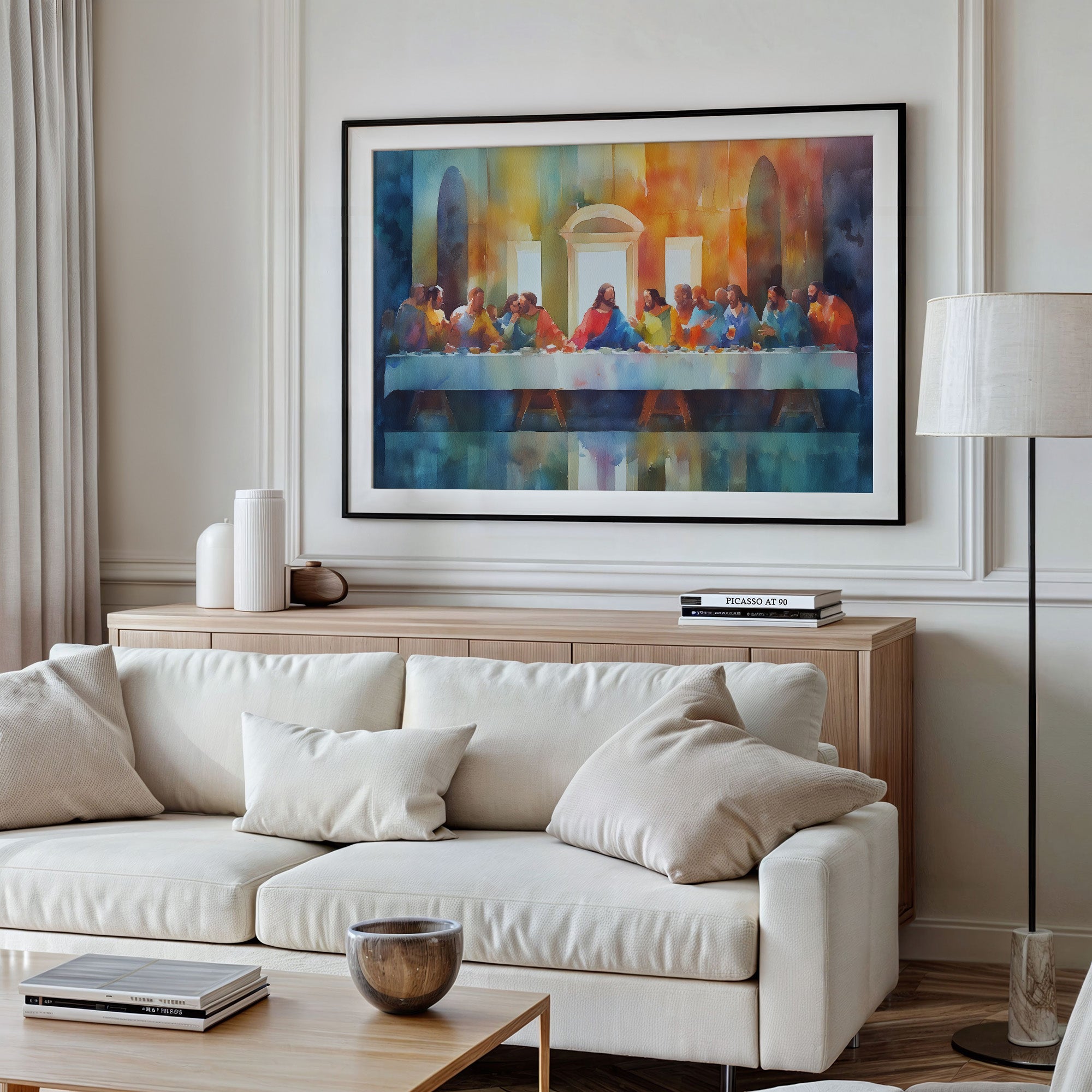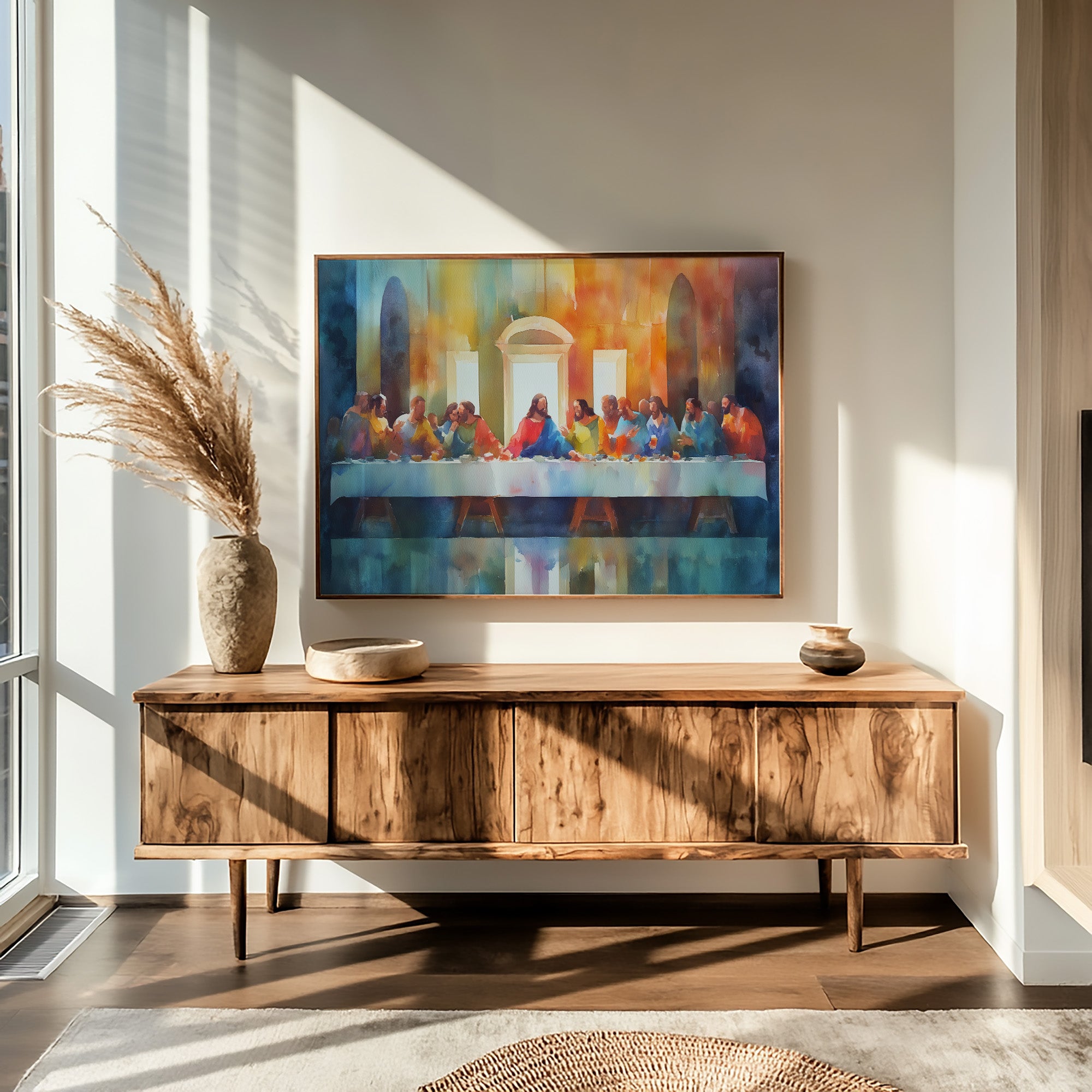 Watercolor hues dance across the canvas, reimagining an iconic moment of communion with vibrant warmth. The painting's soft brushstrokes blend oranges, blues, and yellows, creating an atmosphere both reverent and inviting as figures gather around a table bathed in ethereal light. Nestled among literary companions on wooden shelves, the framed artwork creates a thoughtful focal point, complemented by the quiet presence of dried pampas grass.