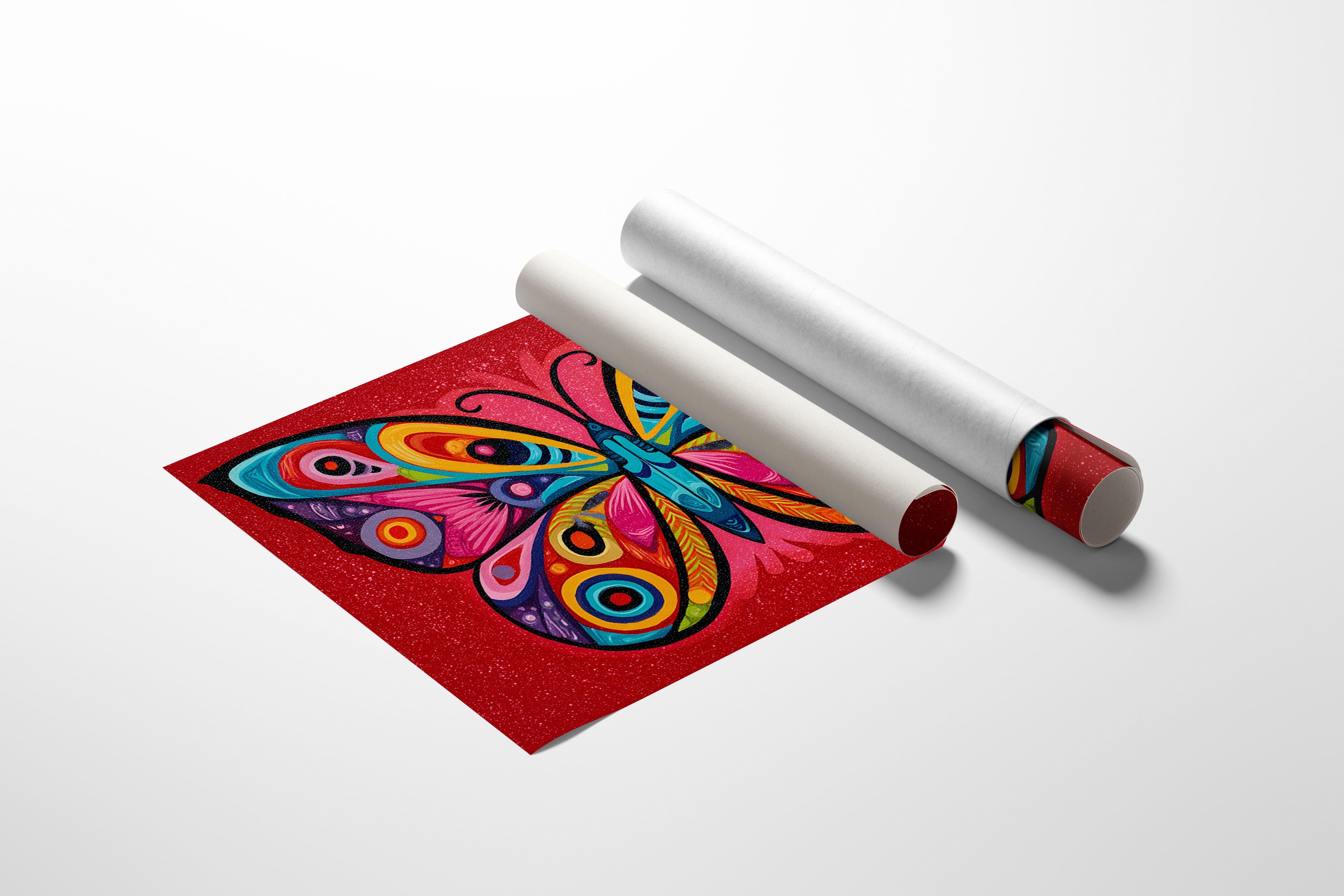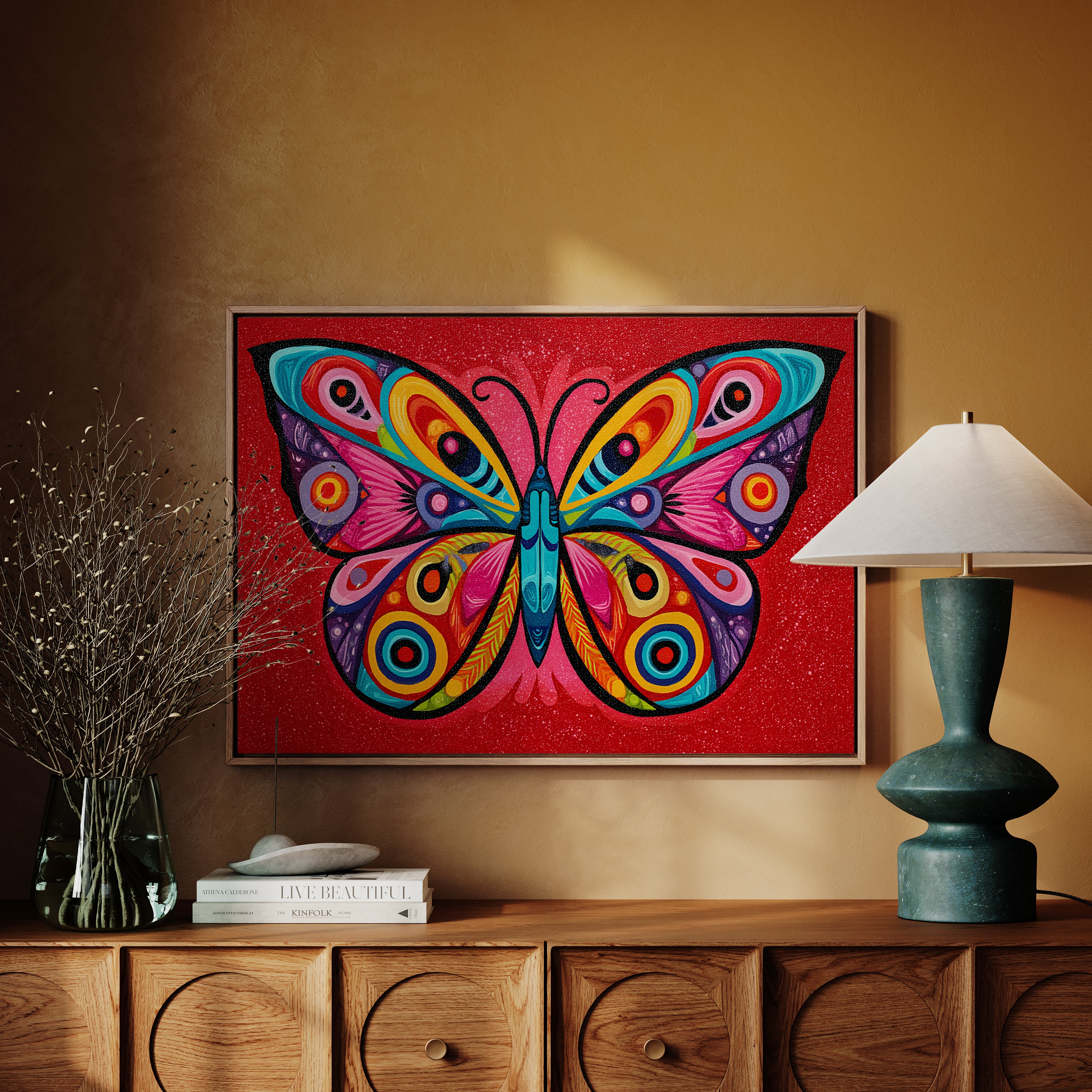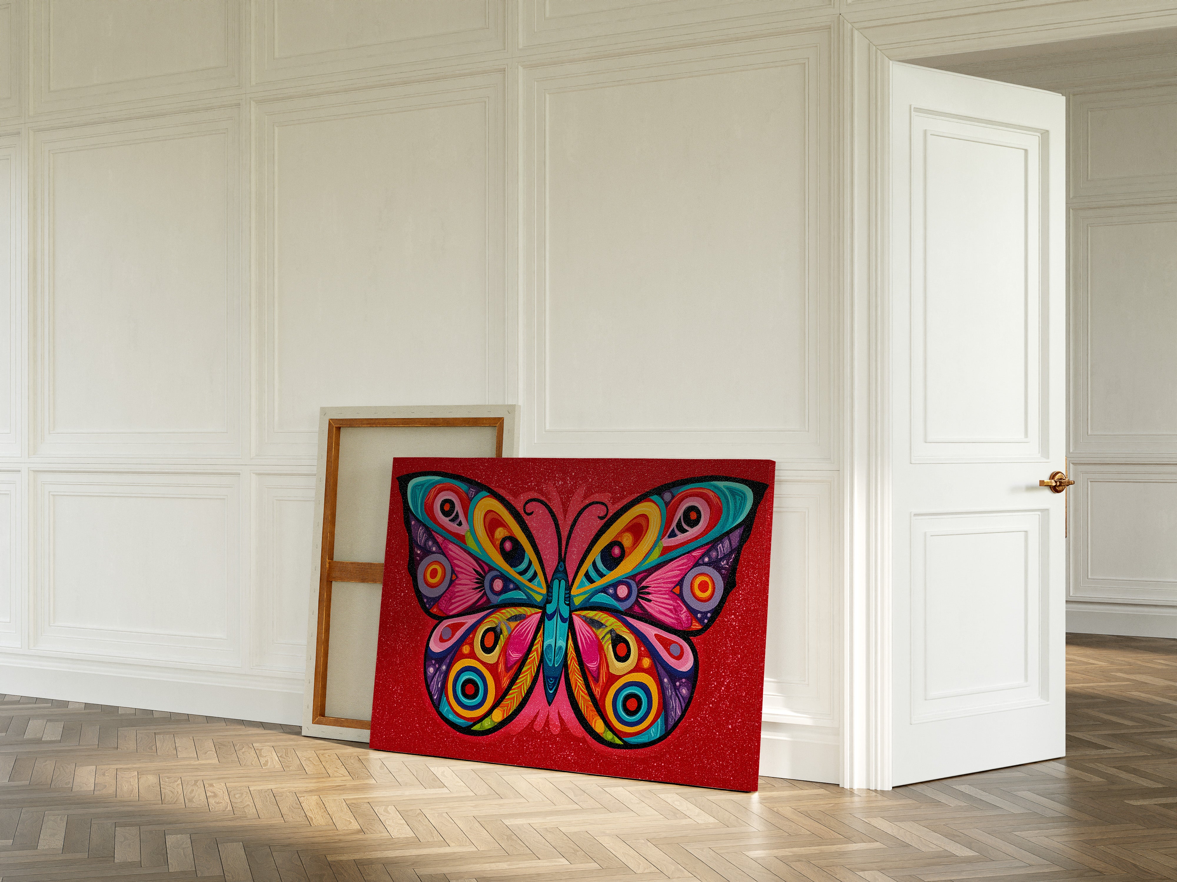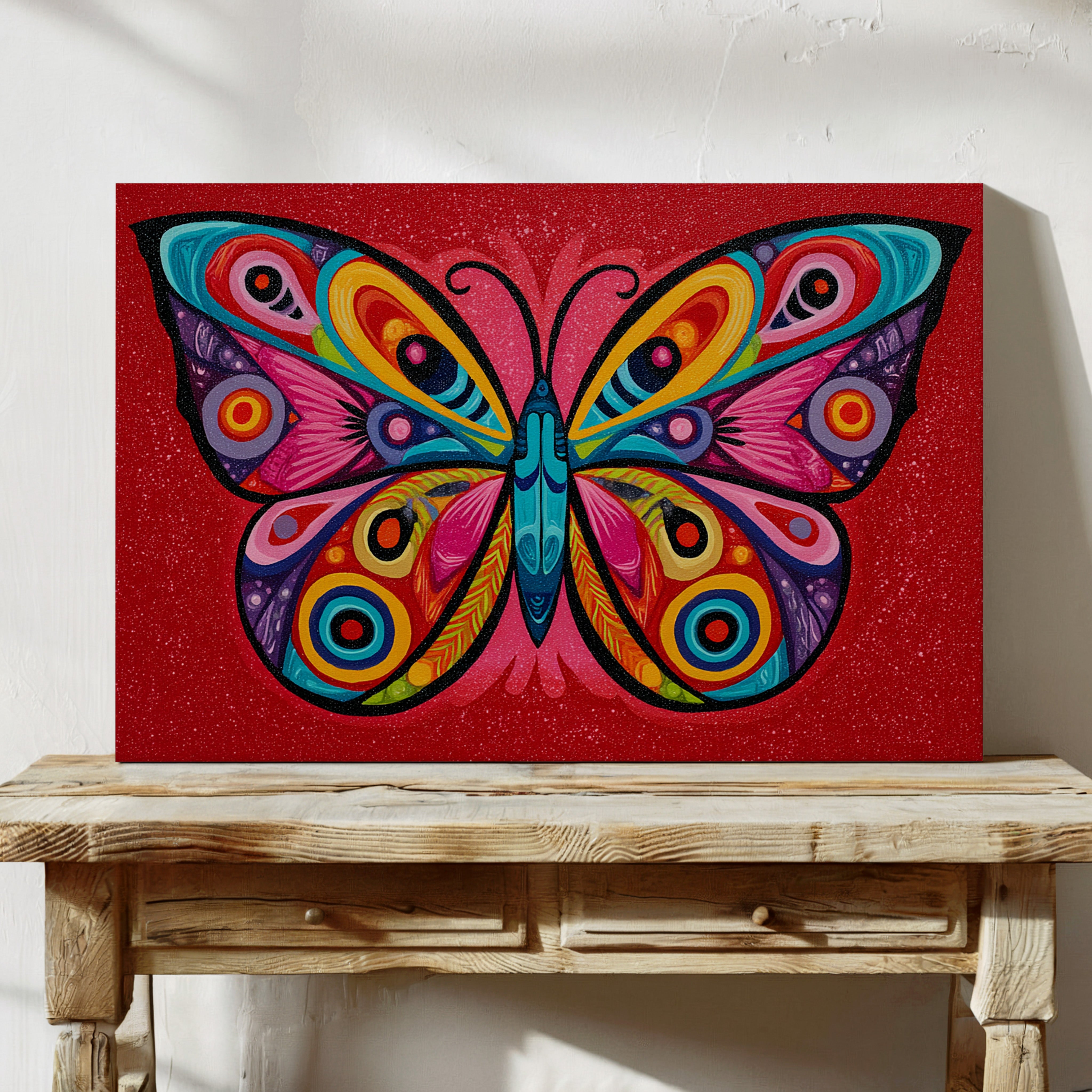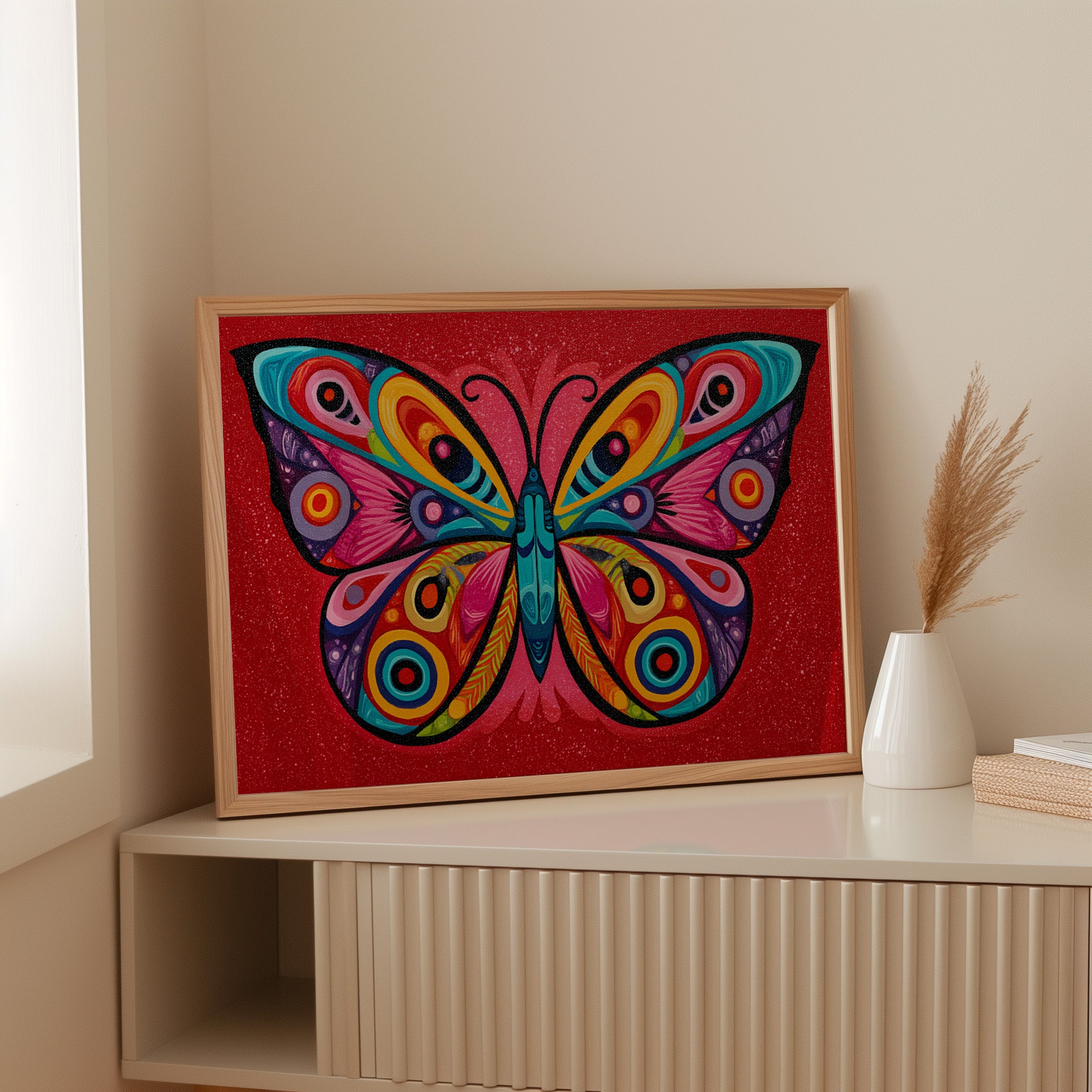 A kaleidoscope of vibrant energy dances across delicate wings, each pattern telling its own story of transformation. Bold circles and sweeping curves create a mesmerizing symmetry, while turquoise, magenta, and golden yellows pulse against a deep crimson background scattered with starlike specks. The butterfly's folk art-inspired design speaks to ancient traditions while embracing modern color psychology, creating a powerful symbol of joy and rebirth. This statement piece would transform any space into a celebration of life, particularly stunning in a bohemian living room or as an unexpected burst of color in a minimalist bedroom.