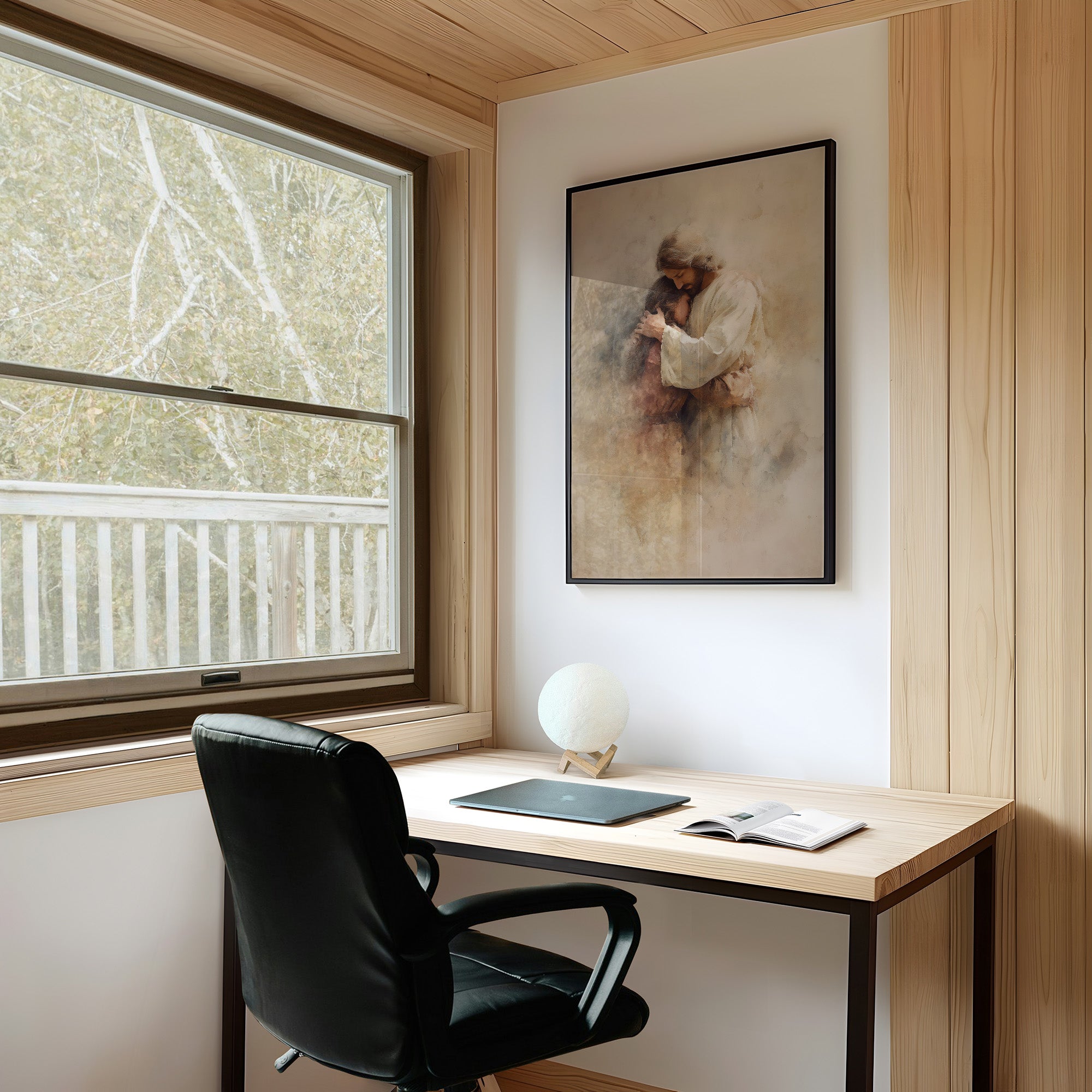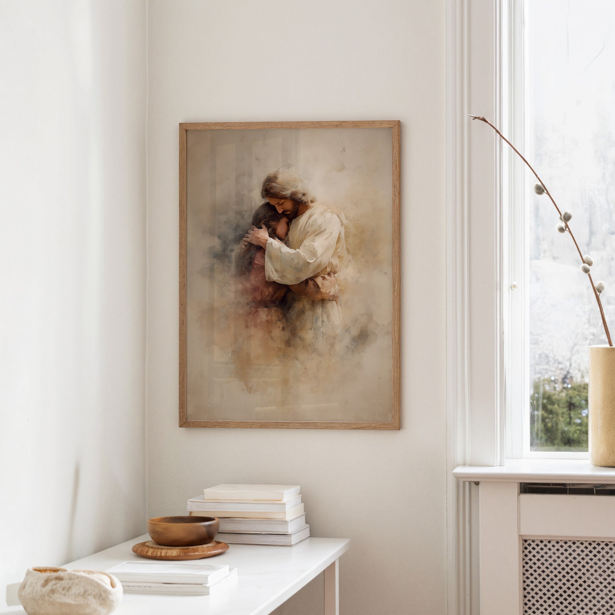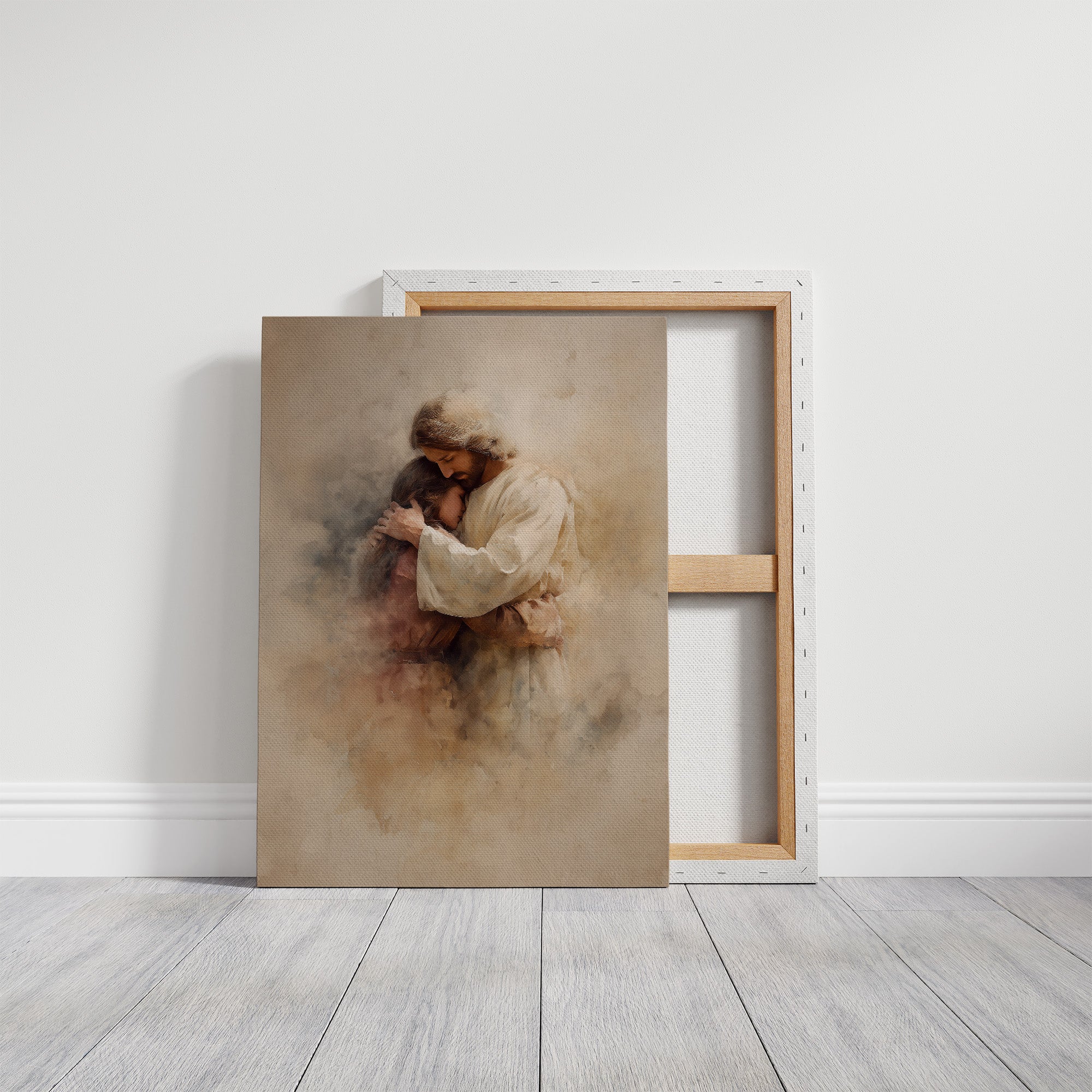 Morning light spills across a rustic wooden table where a softly rendered artwork rests in peaceful solitude. The muted sepia tones and delicate brushwork create an atmosphere of tender protection, with gentle forms emerging from misty backgrounds like memories made visible. A cup of coffee waits nearby, inviting quiet contemplation of connection and care captured in the ethereal composition. This piece would bring a sense of peace to a reading nook, prayer space, or any corner of the home where moments of reflection are treasured.
