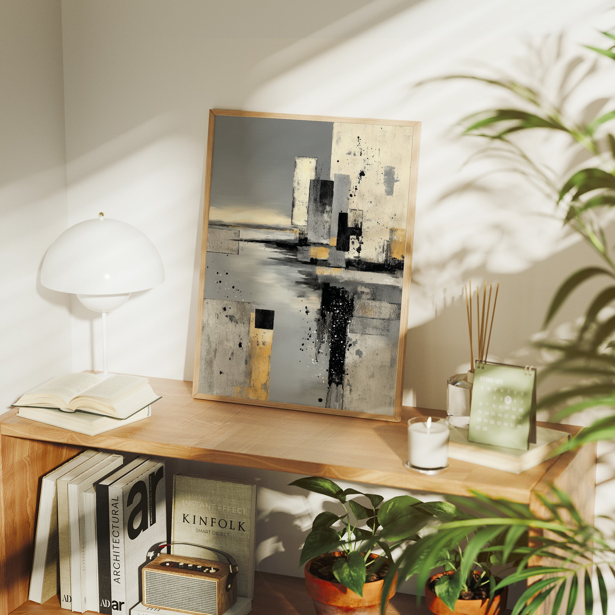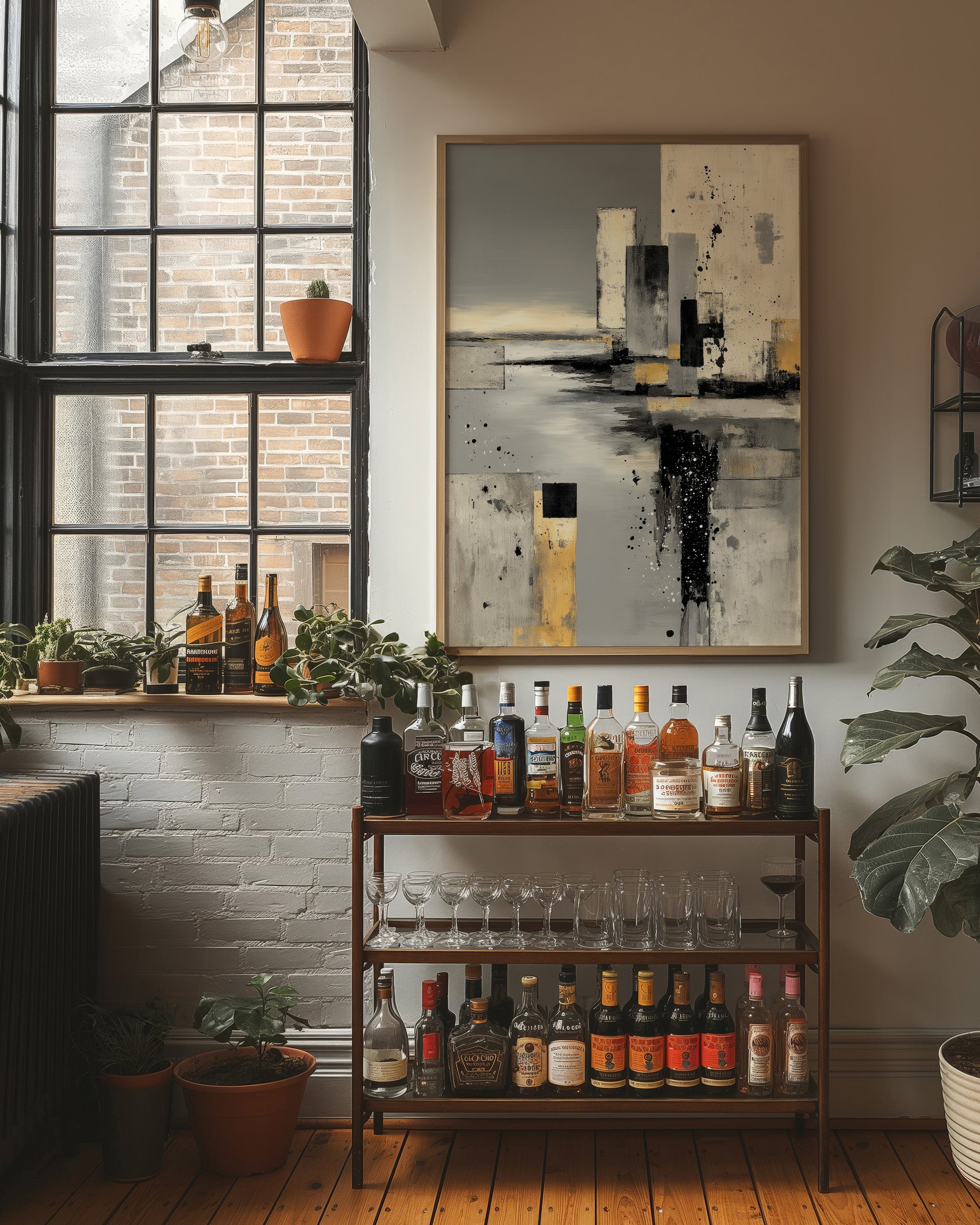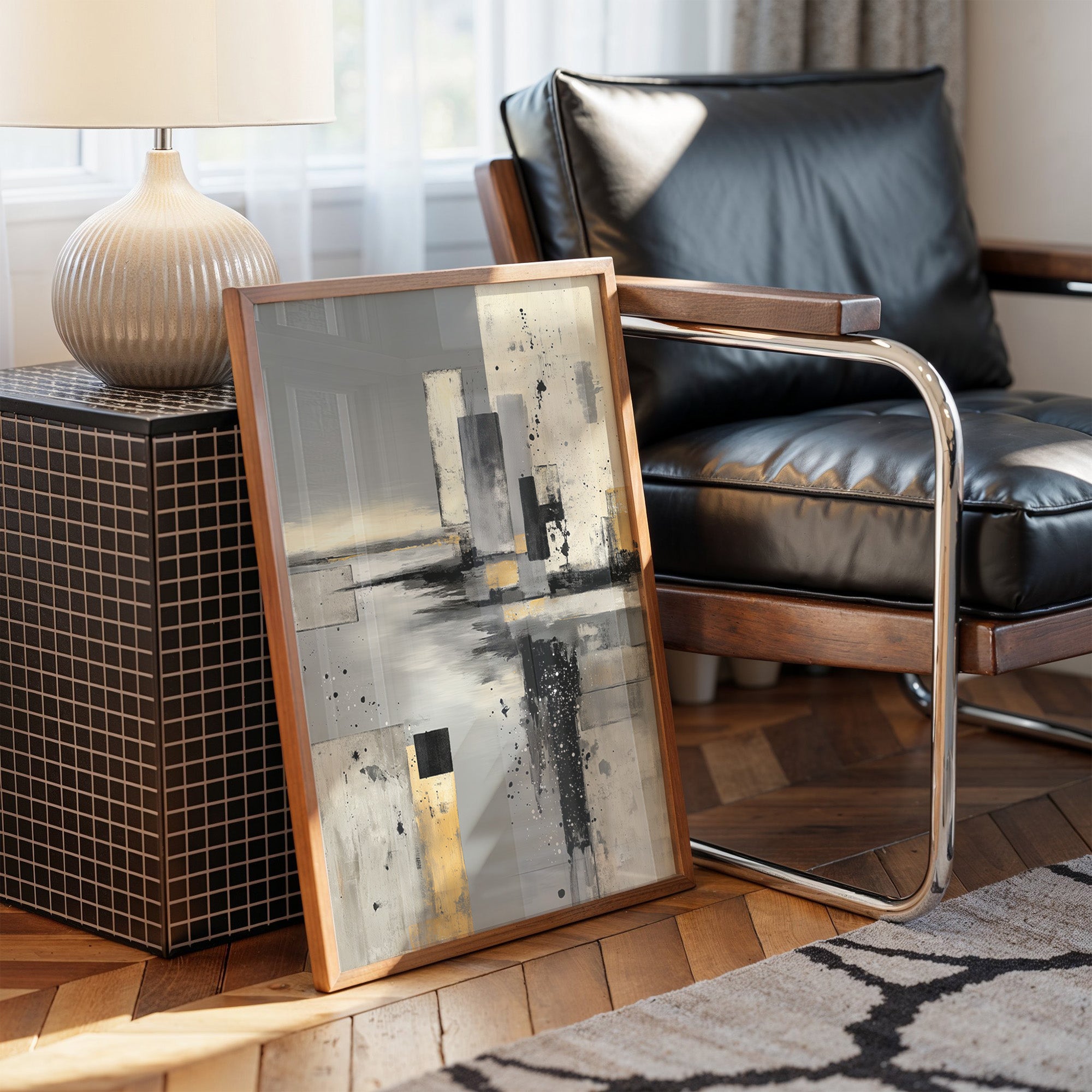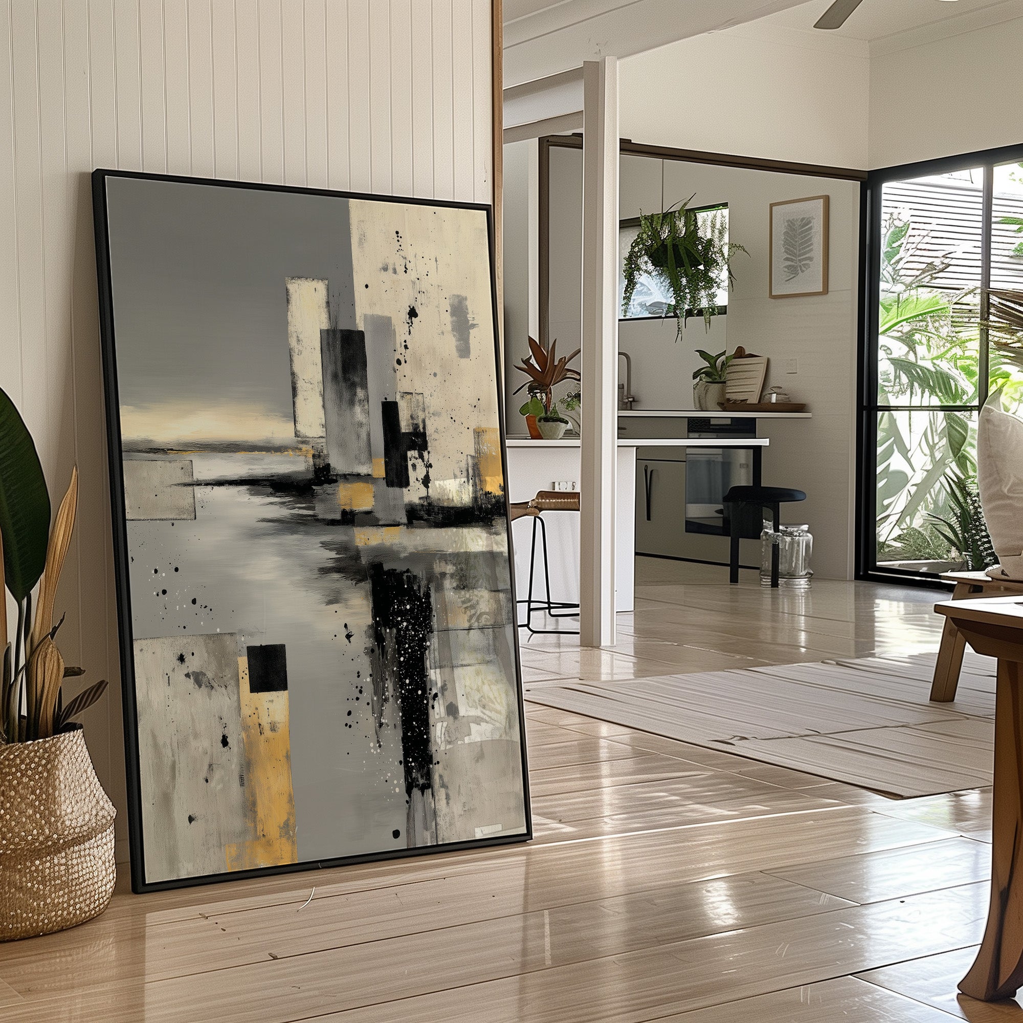 Abstract forms rise like urban monuments through layers of fog and possibility. Bold strokes of black and gold pierce through ethereal greys, creating a dramatic interplay of structure and atmosphere that speaks to both chaos and order. The composition's modern aesthetic balances raw expression with refined technique, where splattered elements dance with geometric precision. This statement piece commands attention in a minimalist living space, bringing sophisticated drama to contemporary interiors with clean lines and neutral palettes.