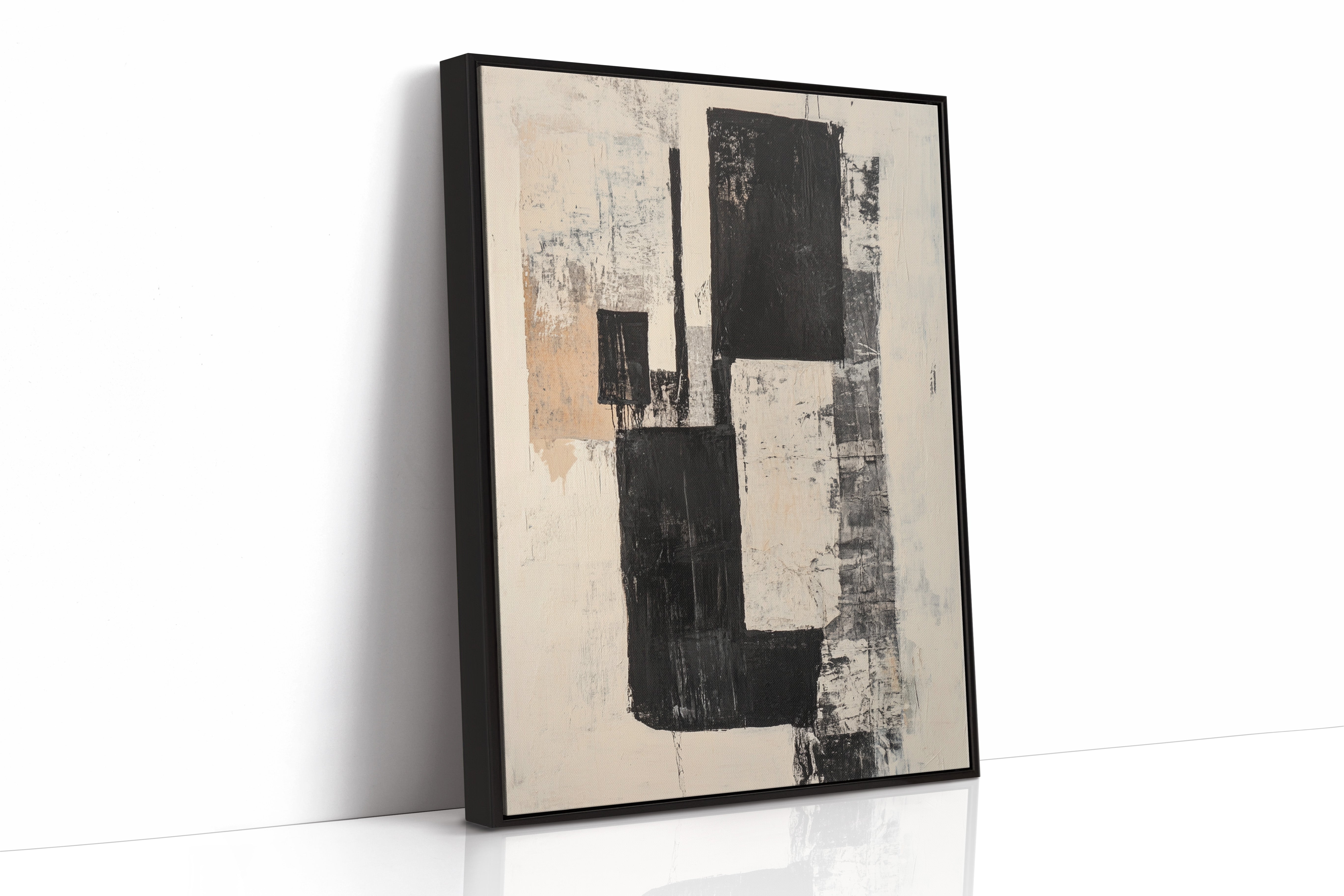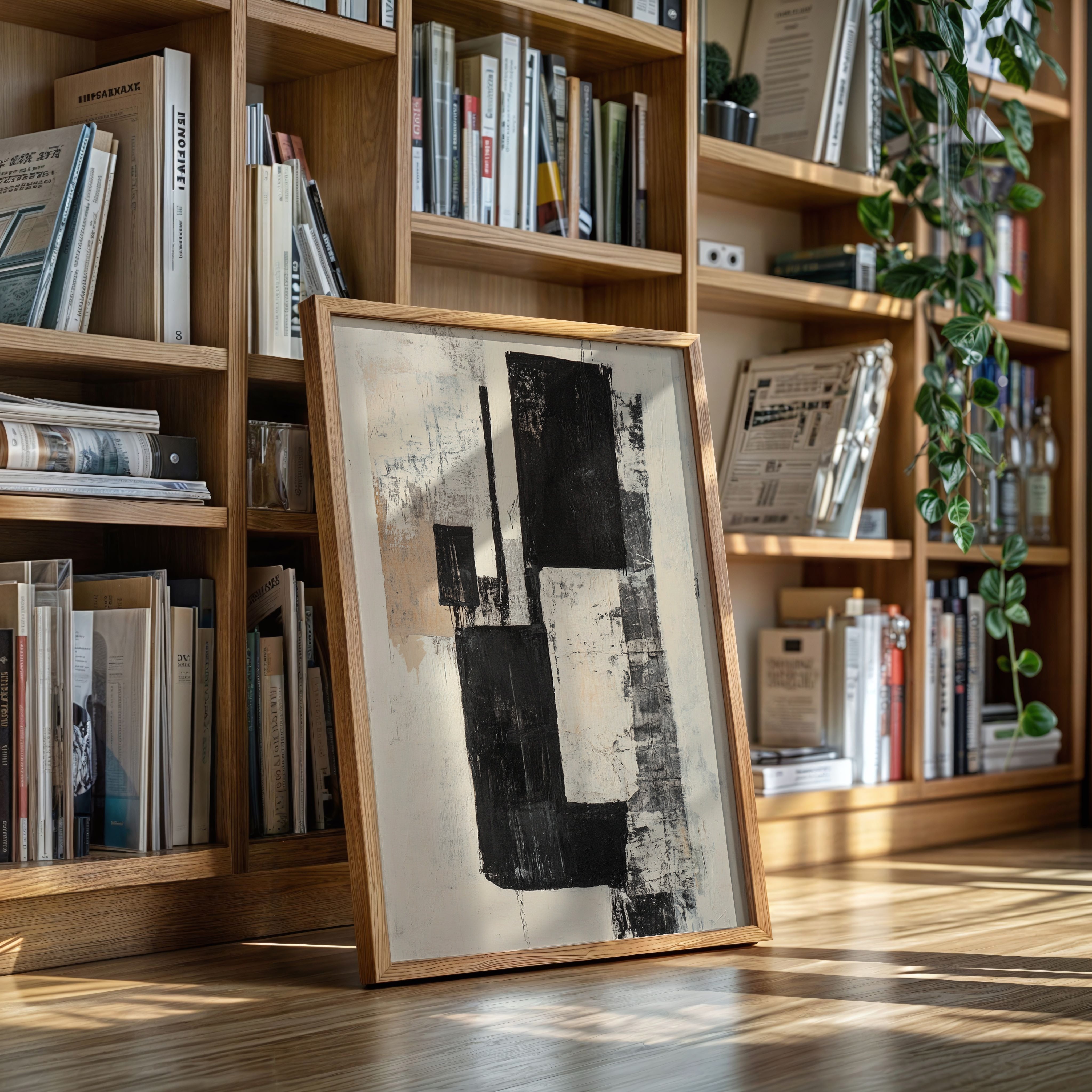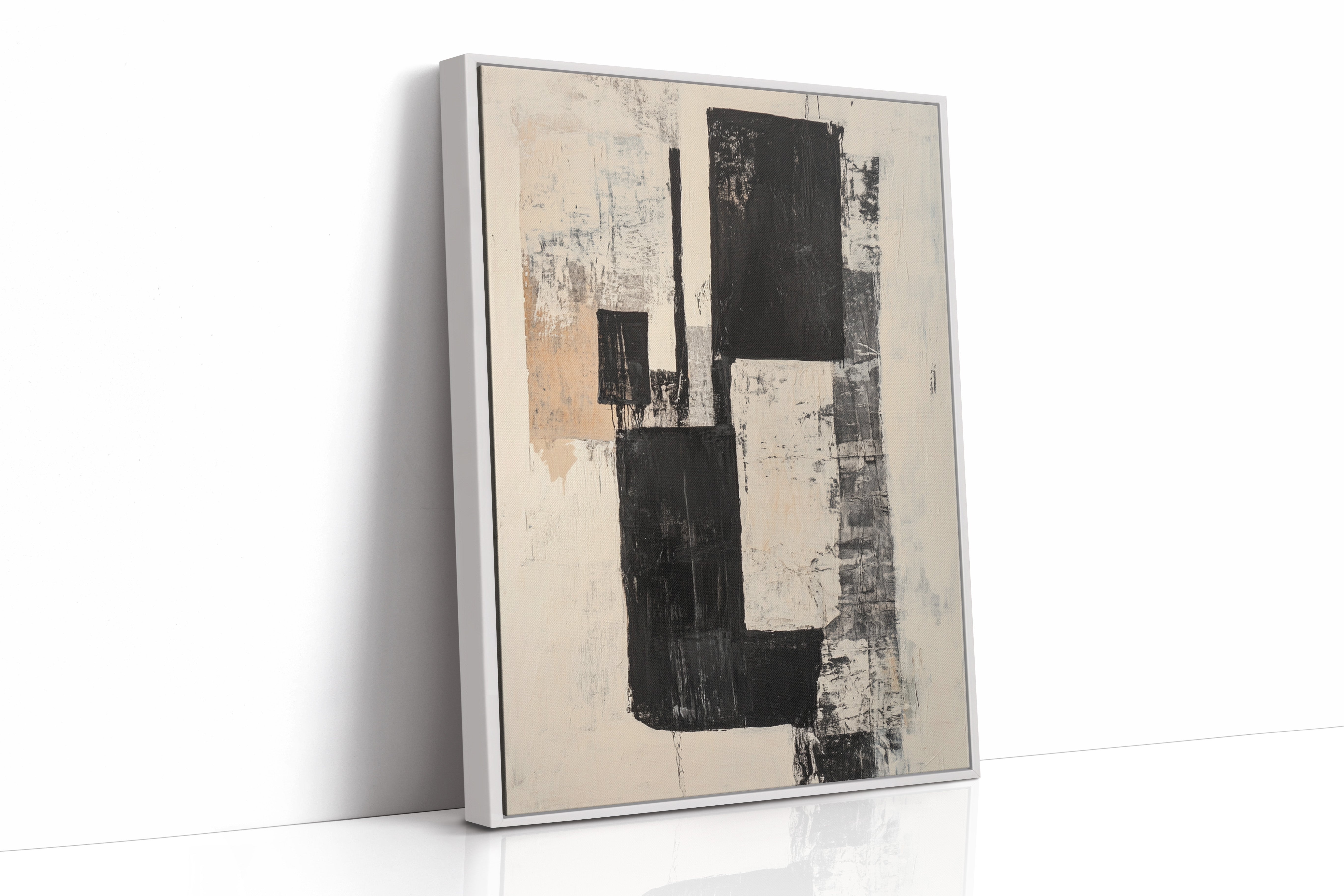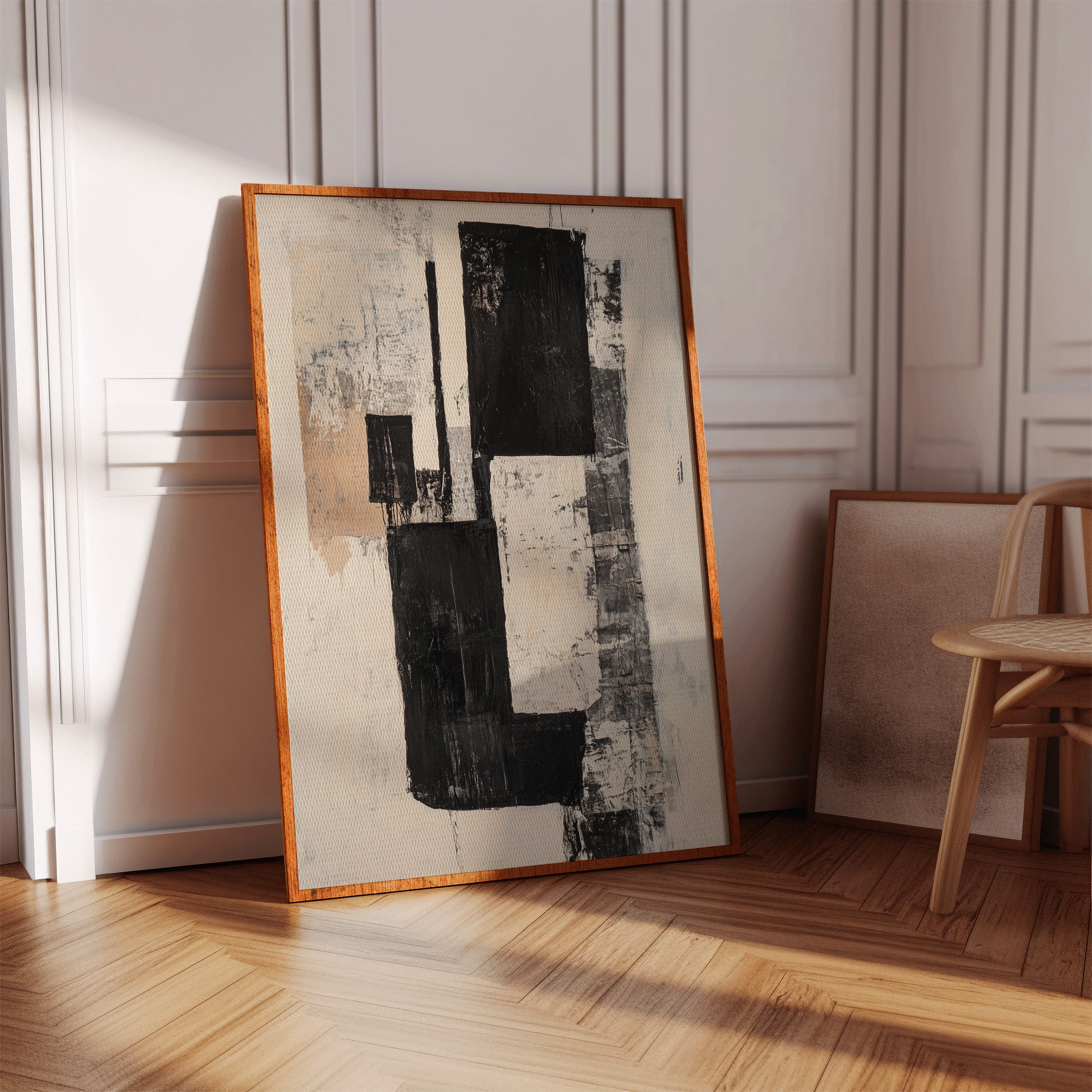 Bold strokes of midnight black cut through creamy white space like urban poetry written in architectural forms. The composition speaks through contrasting geometries, where rough-hewn rectangles stack and overlap with the raw energy of a city in motion. Textured surfaces reveal layers of history, like weathered walls that have witnessed countless stories. This piece captures the essence of modern minimalism while maintaining an organic, lived-in quality through its distressed details and subtle warm undertones.
