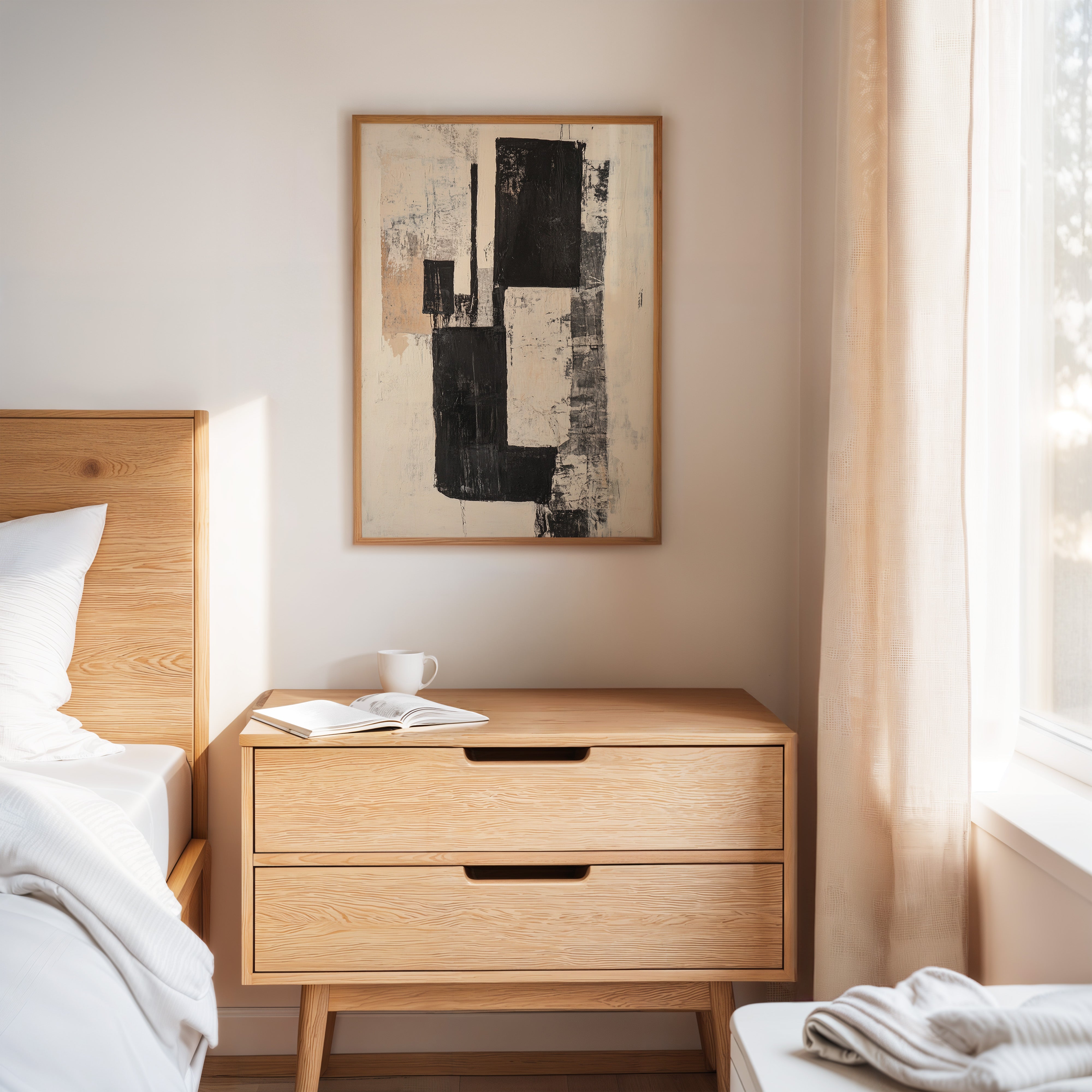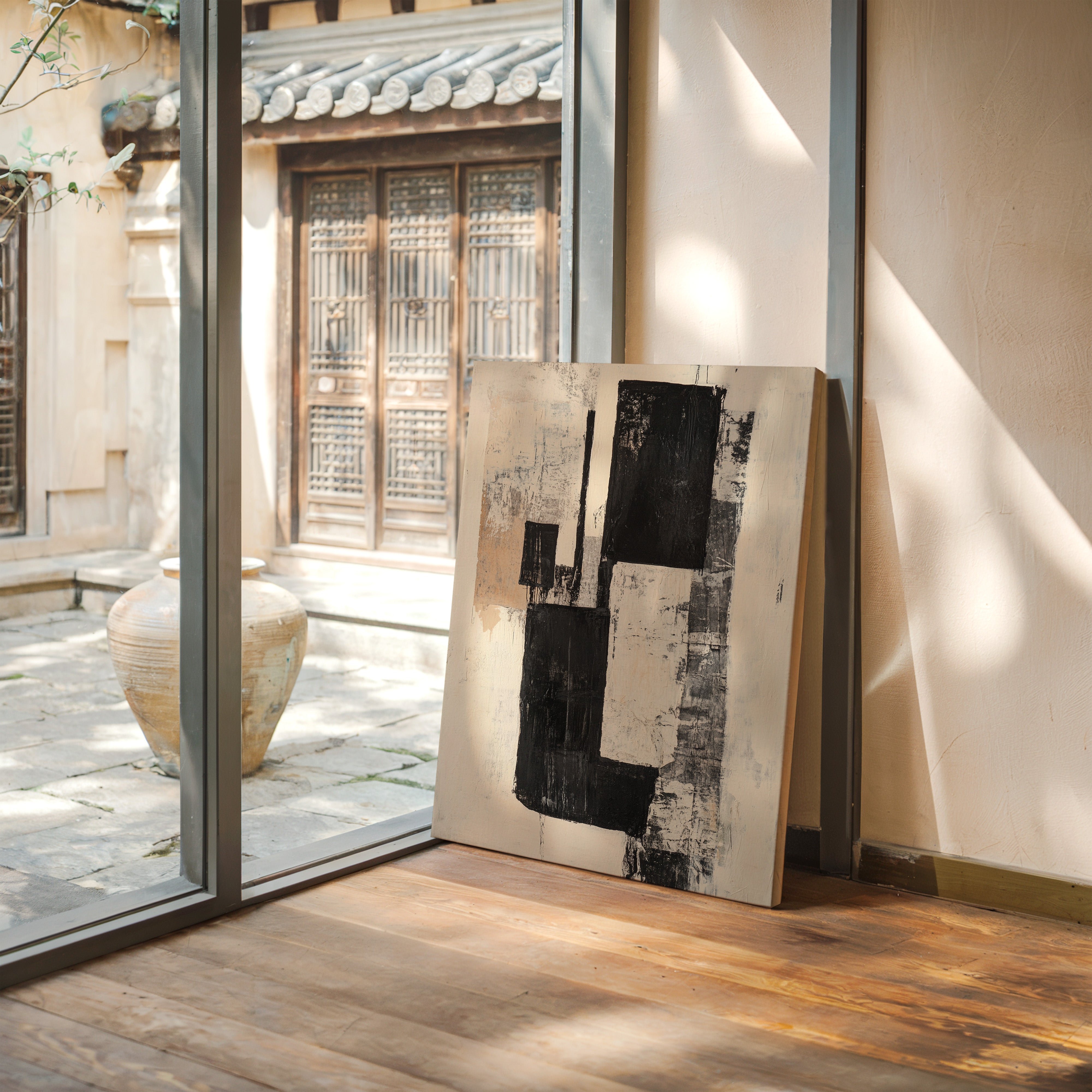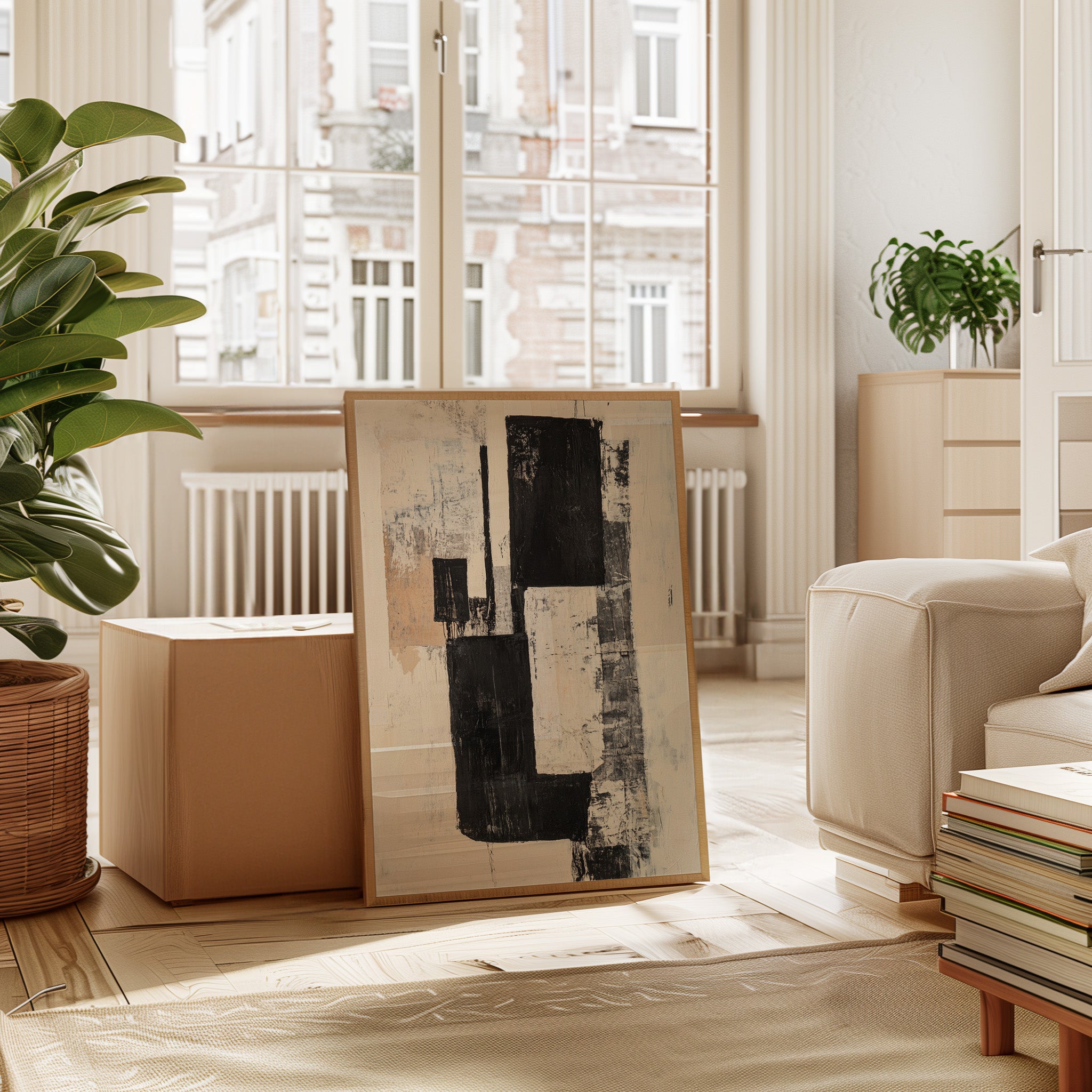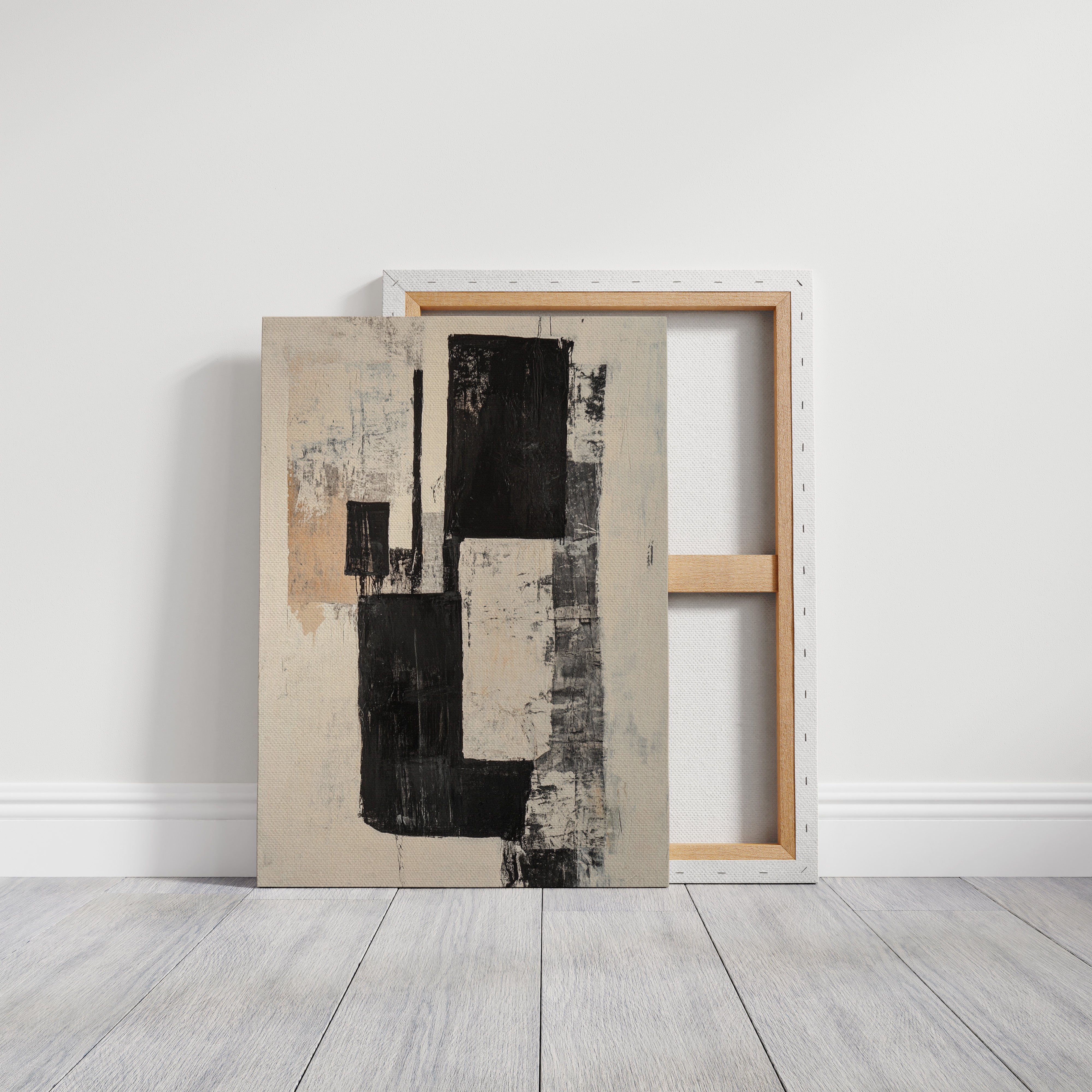 Bold strokes of midnight black cut through creamy white space like urban poetry written in architectural forms. The composition speaks through contrasting geometries, where rough-hewn rectangles stack and overlap with the raw energy of a city in motion. Textured surfaces reveal layers of history, like weathered walls that have witnessed countless stories. This piece captures the essence of modern minimalism while maintaining an organic, lived-in quality through its distressed details and subtle warm undertones.