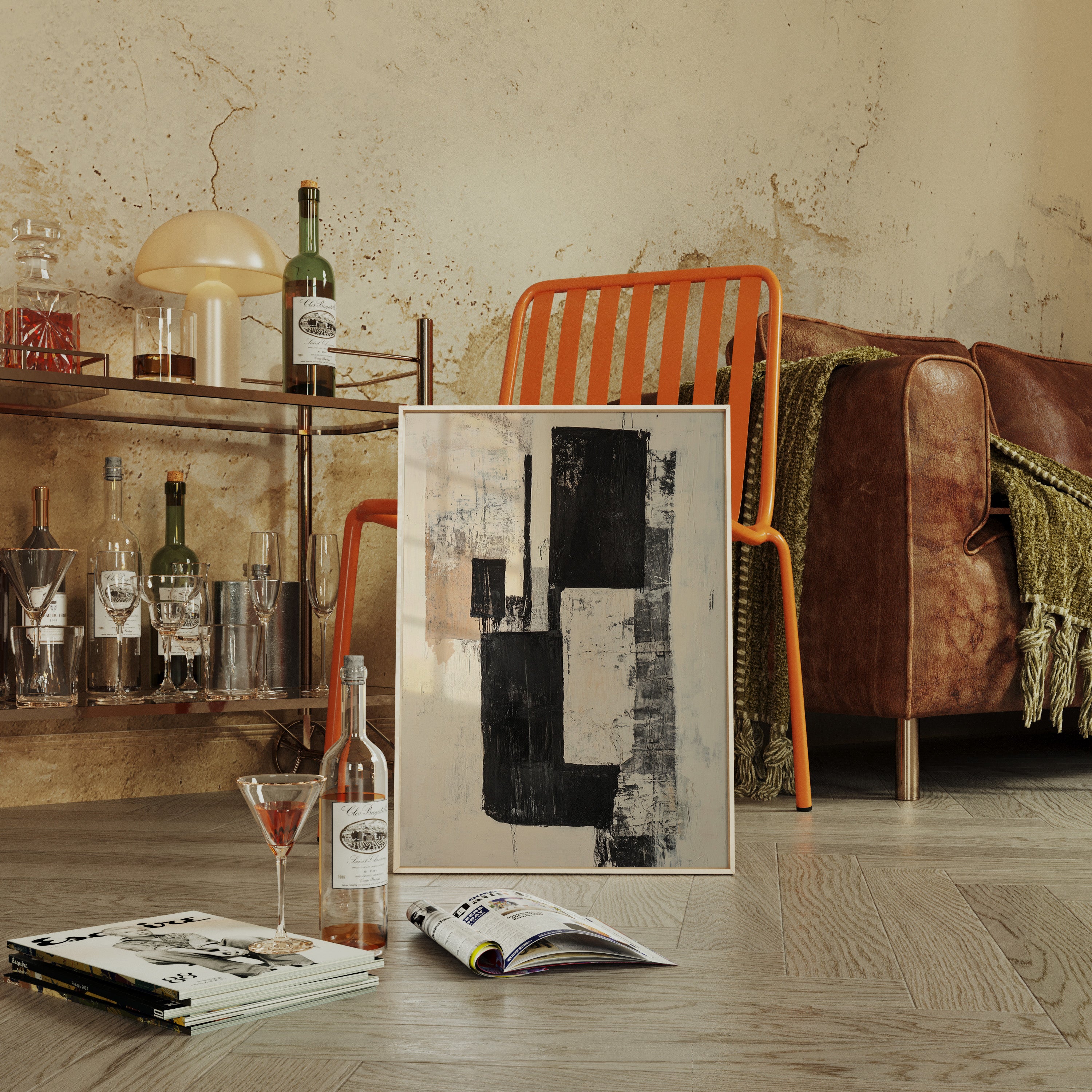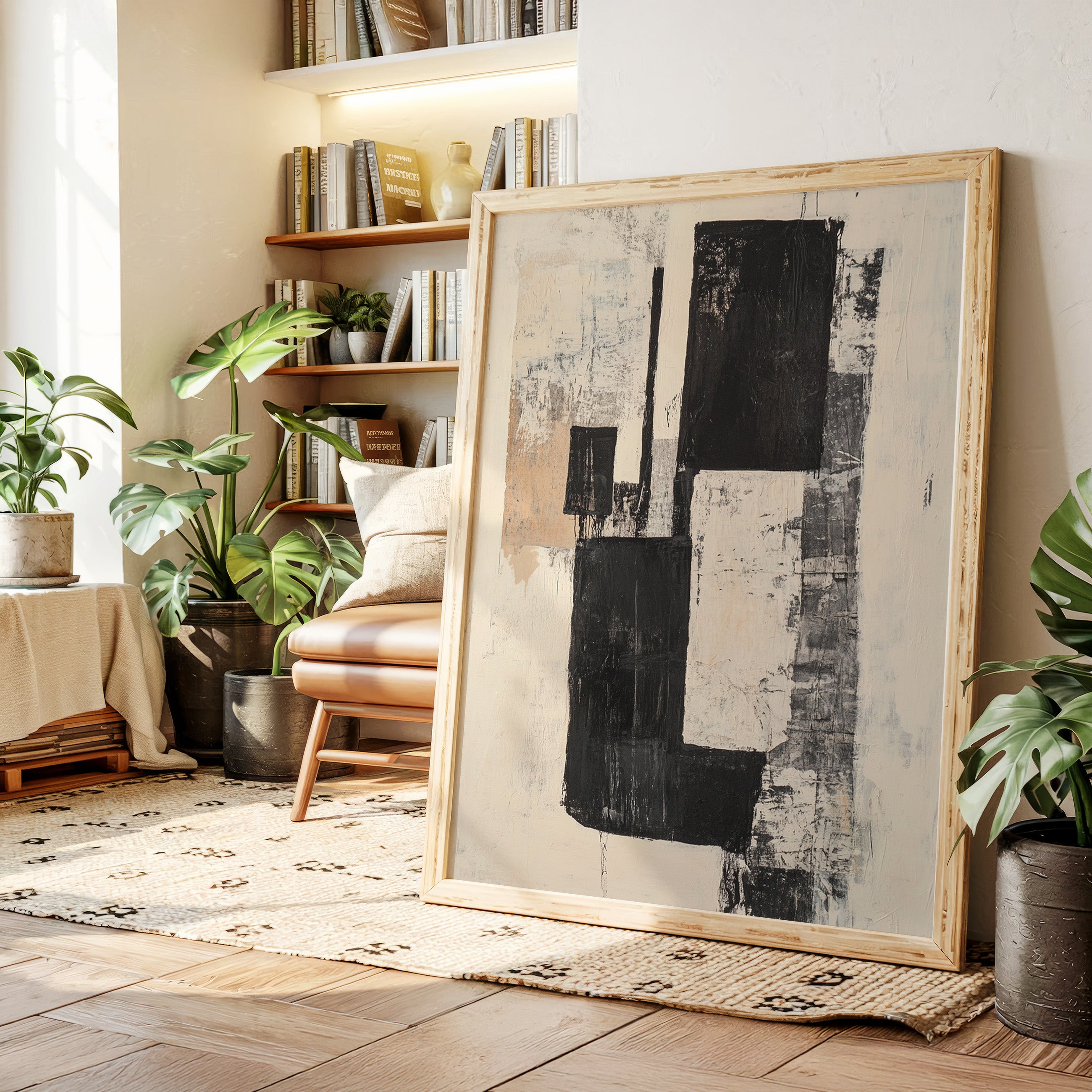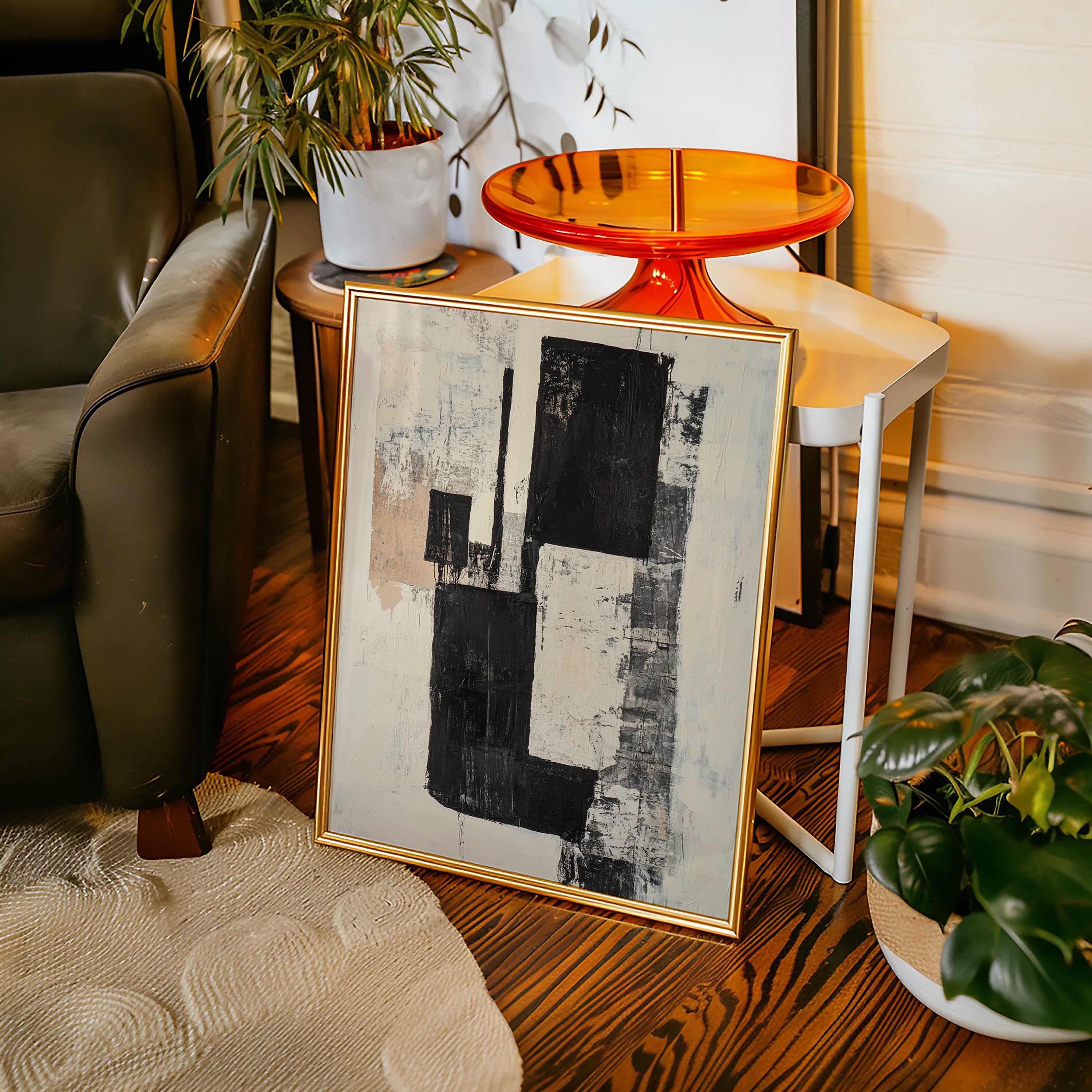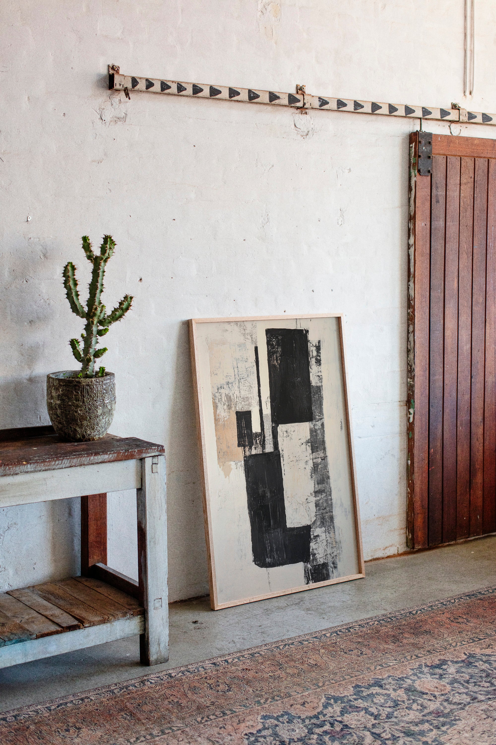 Bold strokes of midnight black cut through creamy white space like urban poetry written in architectural forms. The composition speaks through contrasting geometries, where rough-hewn rectangles stack and overlap with the raw energy of a city in motion. Textured surfaces reveal layers of history, like weathered walls that have witnessed countless stories. This piece captures the essence of modern minimalism while maintaining an organic, lived-in quality through its distressed details and subtle warm undertones.