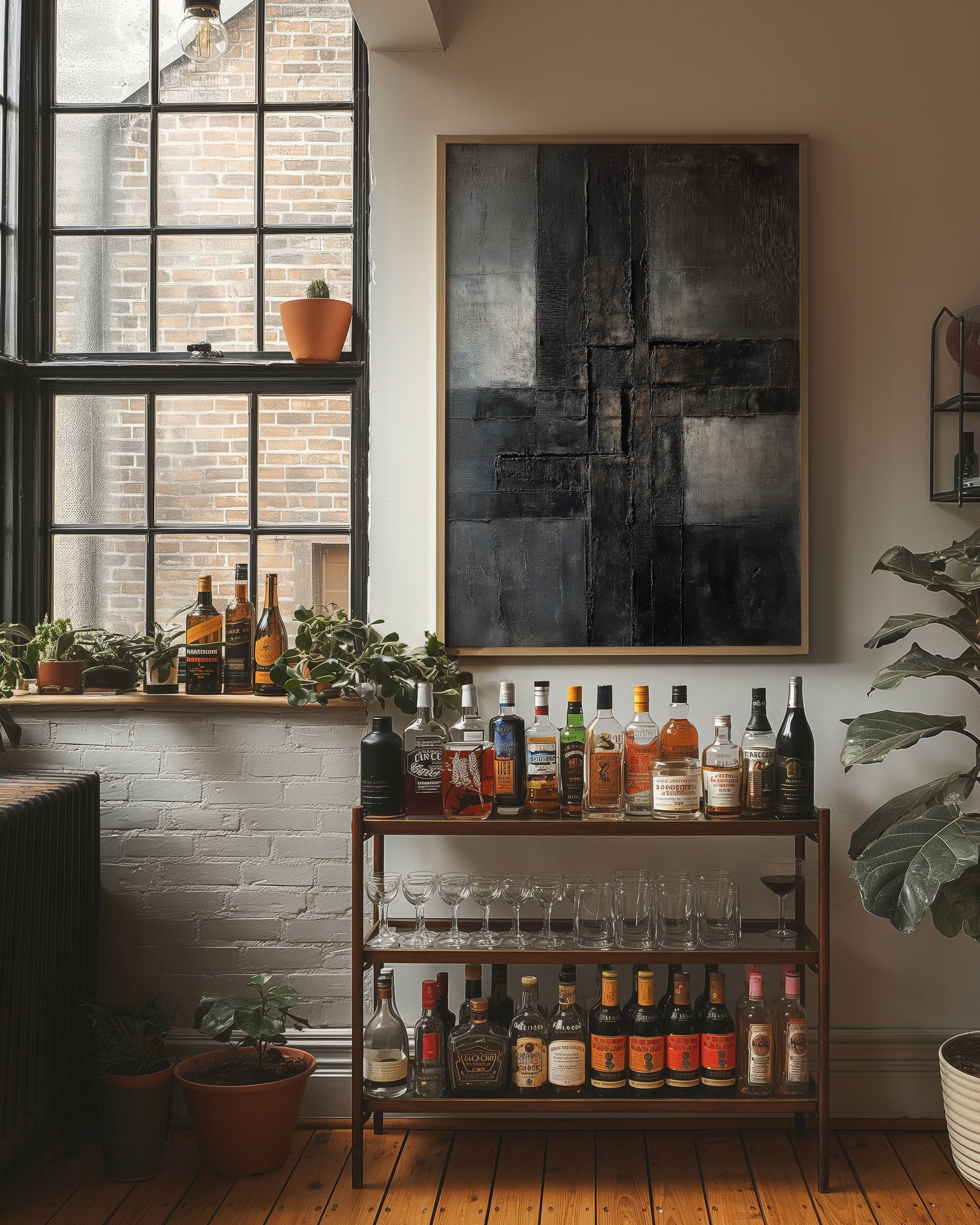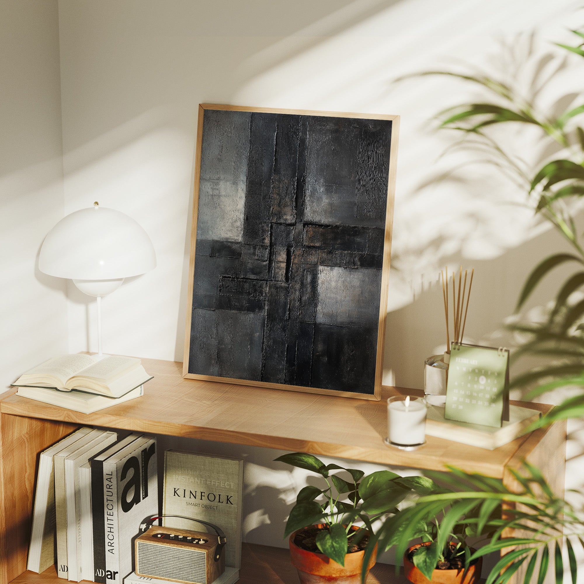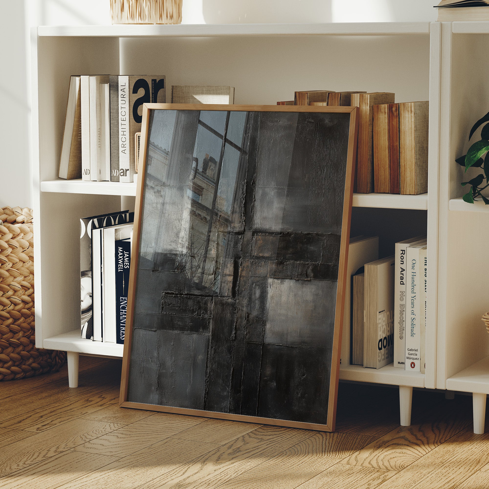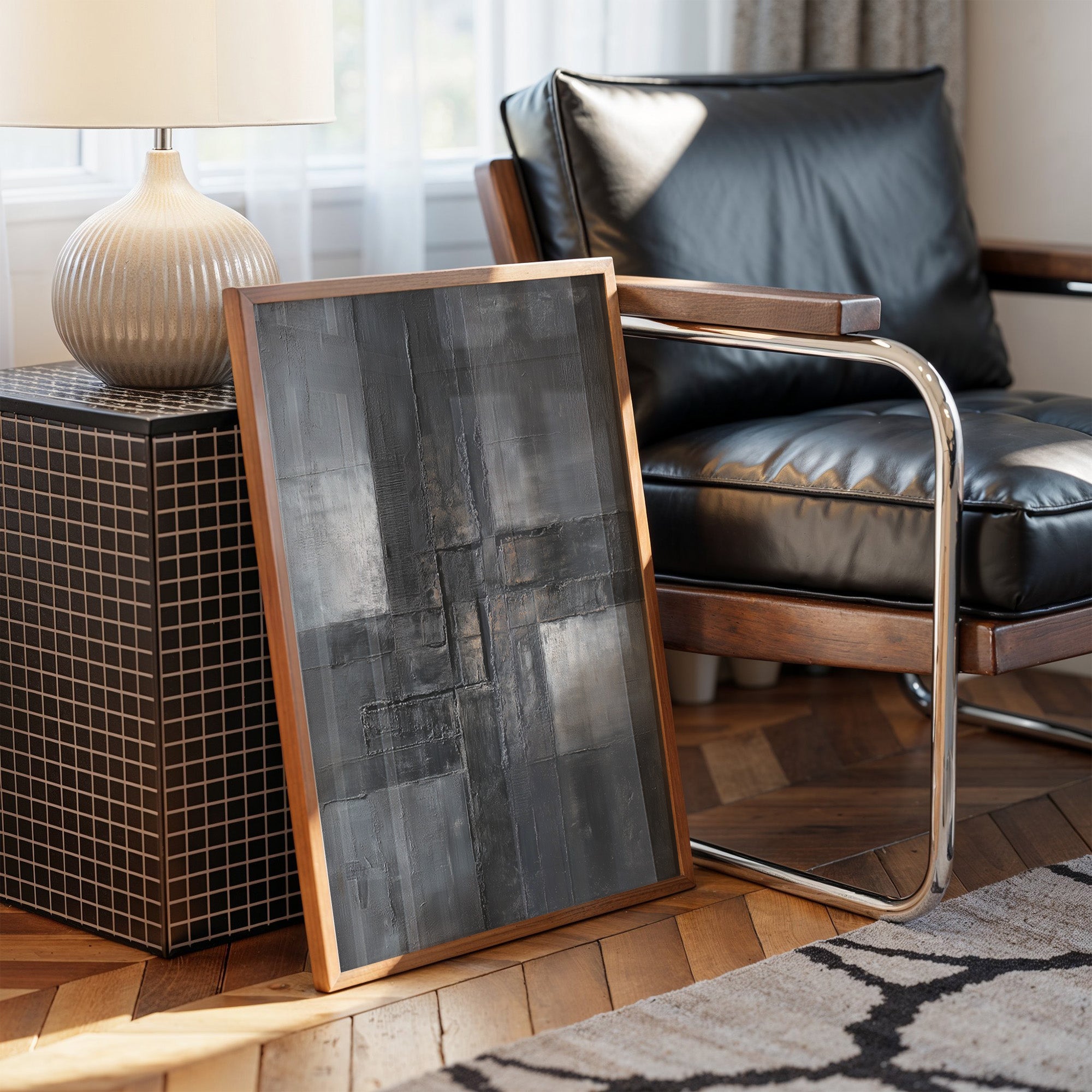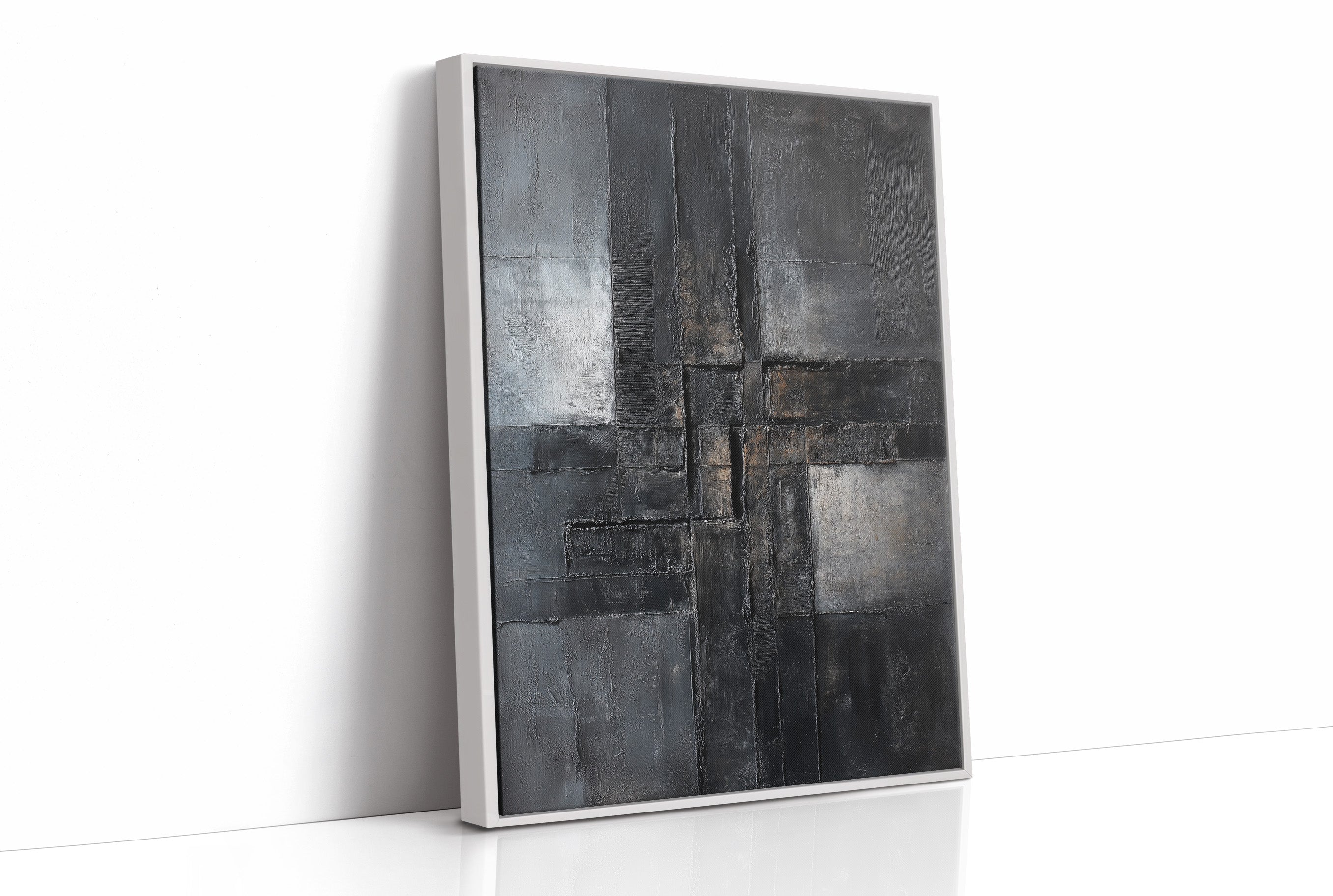 Raw textures dance across a moody canvas, where layers of charcoal and slate intermingle like urban poetry. Deep brushstrokes carve through the composition, creating a sophisticated interplay of light and shadow that speaks to both structure and decay. The piece commands attention with its bold geometric forms while maintaining an air of contemplative mystery, rendered in a palette of stormy grays and industrial blacks. This striking abstract piece would make a powerful statement in a modern loft space or minimal contemporary home office, where its architectural qualities can dialogue with clean lines and industrial elements.