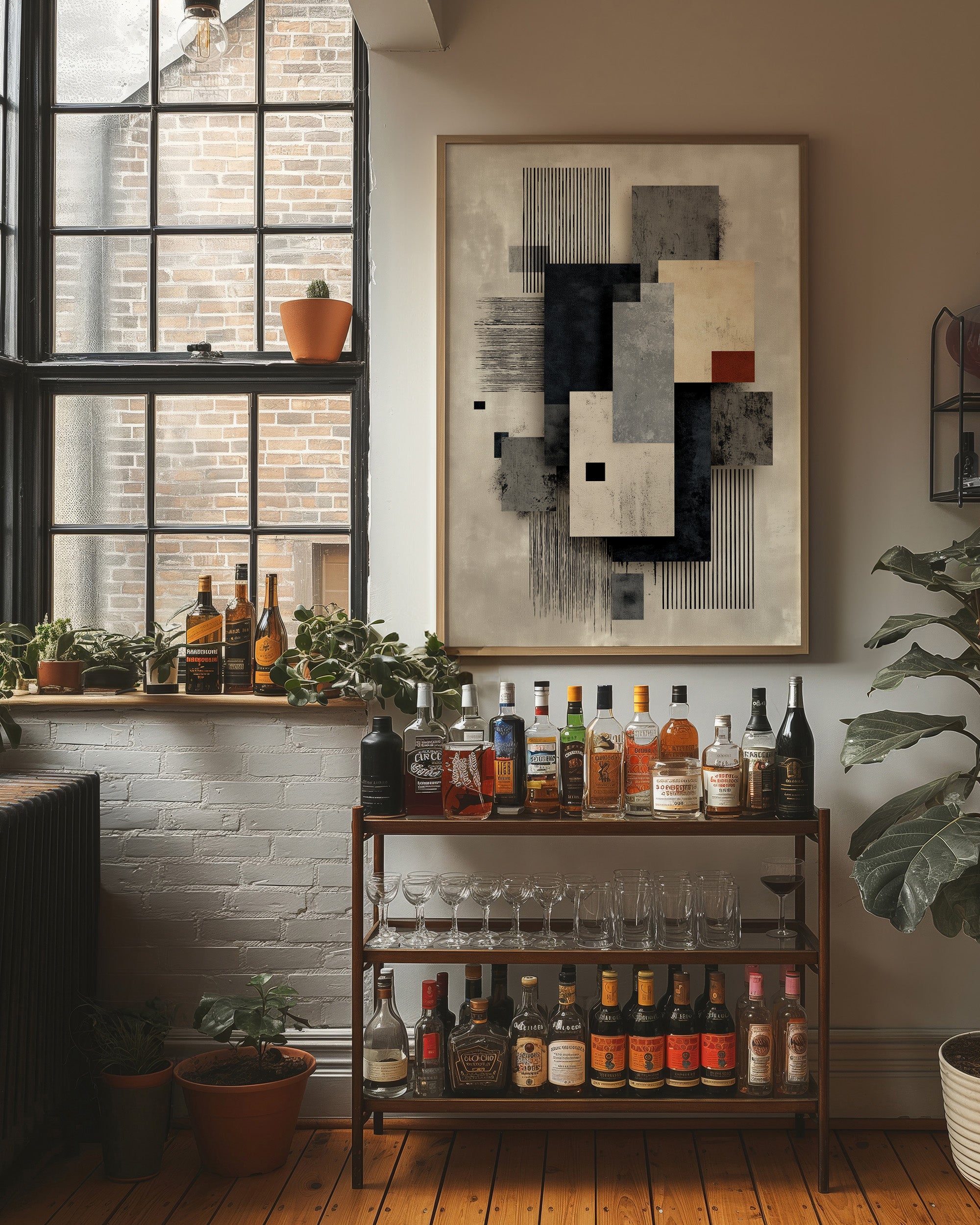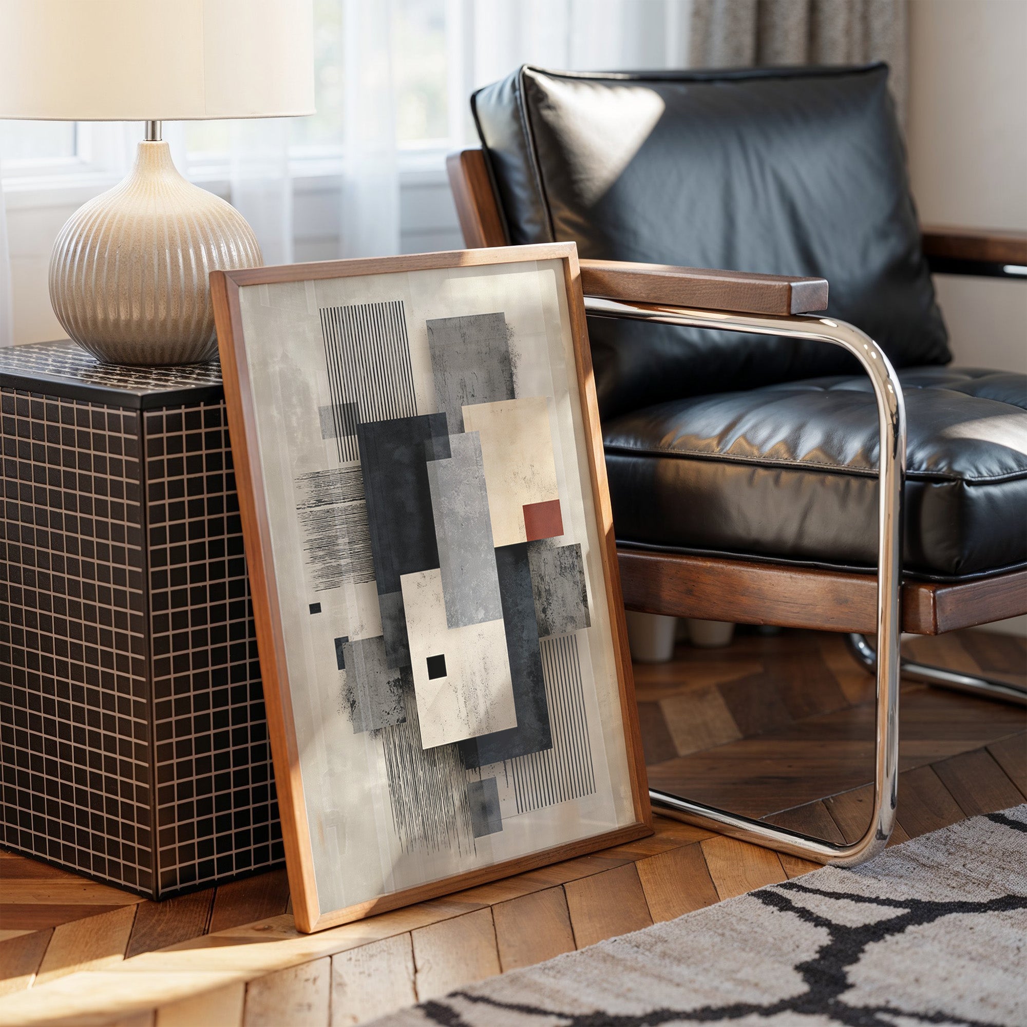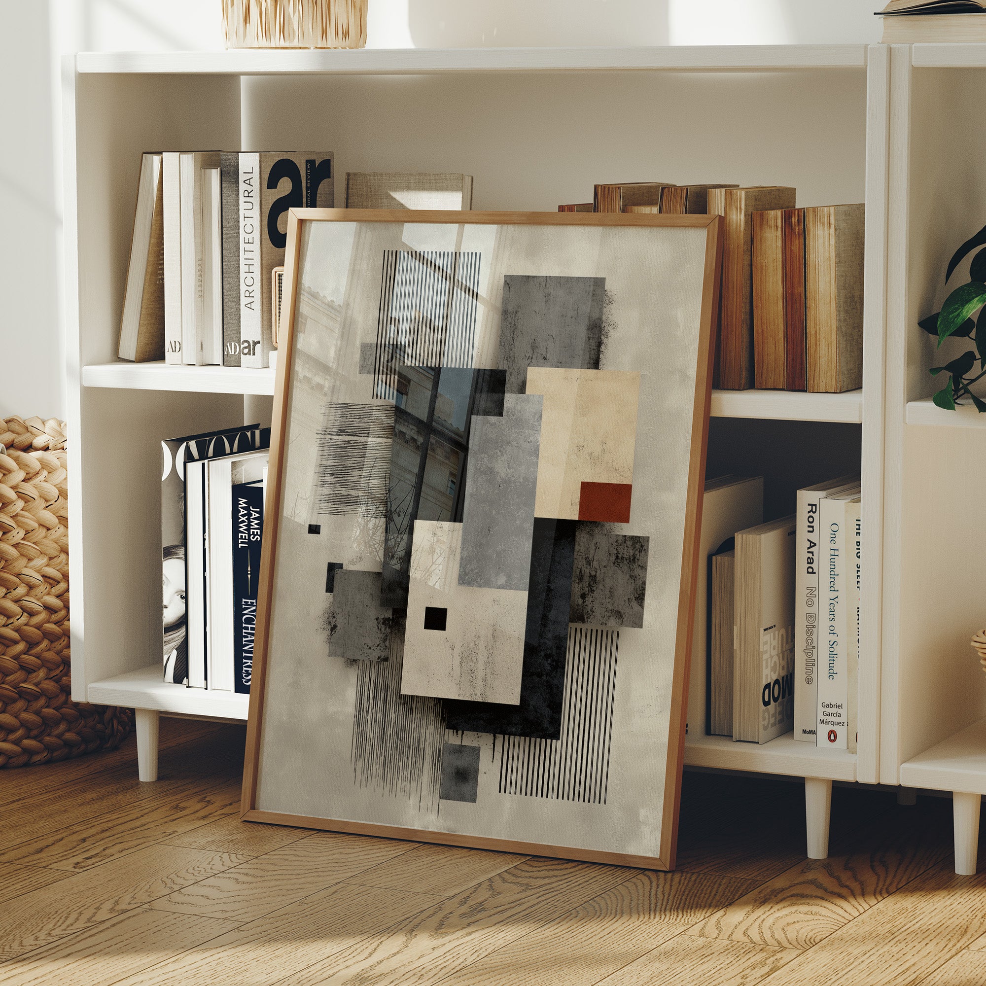 Sunlight streams across a minimalist composition where shapes dance in structured harmony. Bold blocks of charcoal, cream, and slate grey create a sophisticated urban rhythm, punctuated by a single confident stroke of rust red. The textured surfaces and precise linear elements evoke the raw beauty of architectural sketches while maintaining a delicate balance between order and artistic freedom. This striking piece would transform a modern home office or reading nook into a contemplative sanctuary, where clean lines and thoughtful design inspire creative thinking.