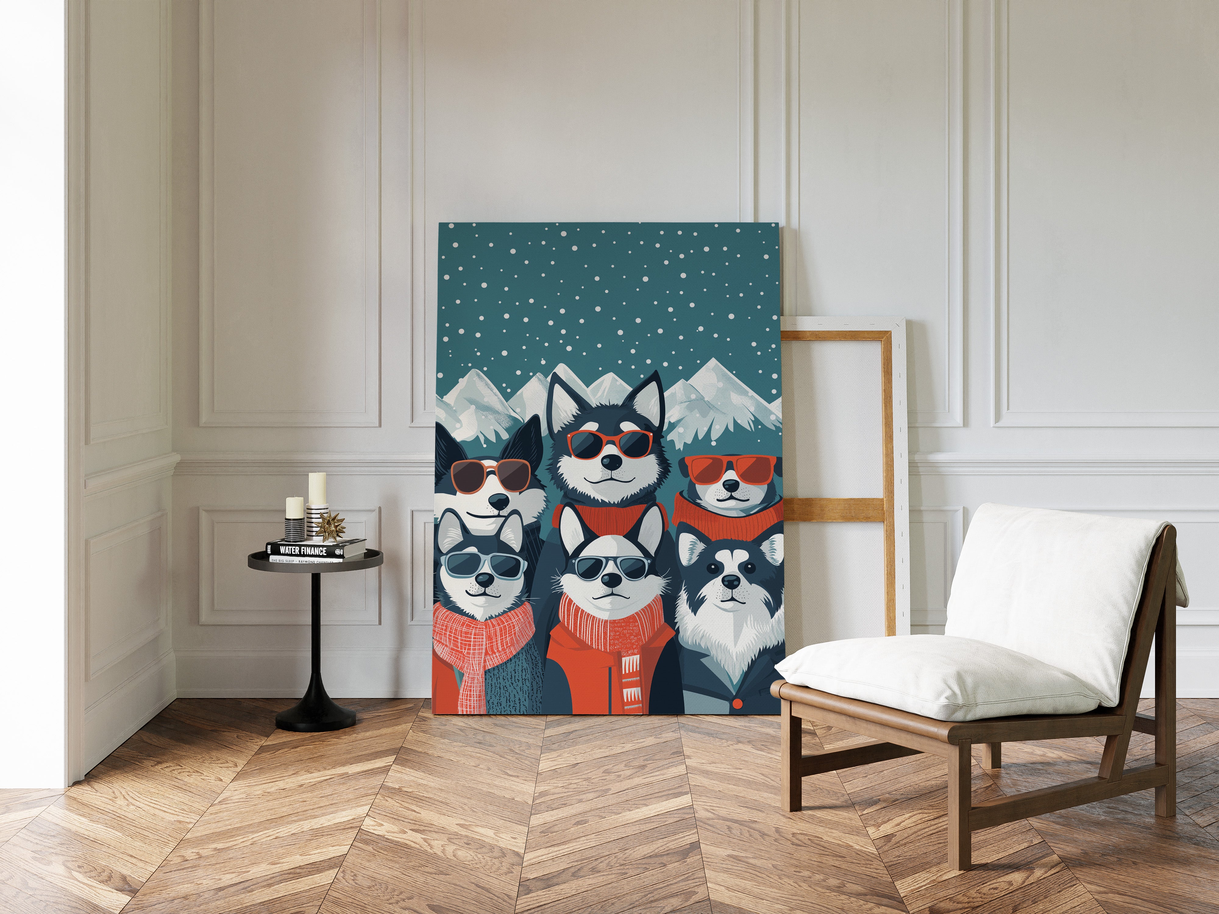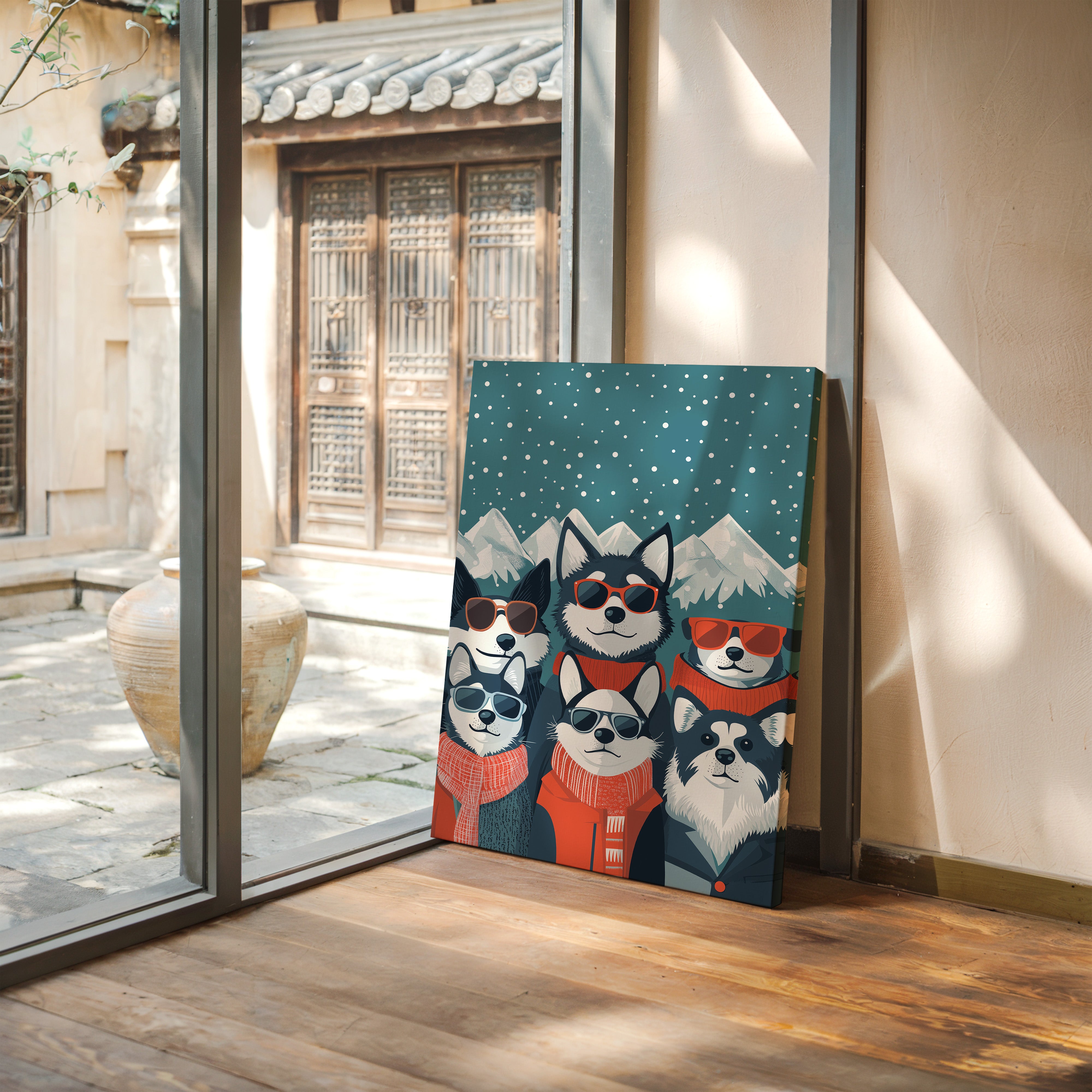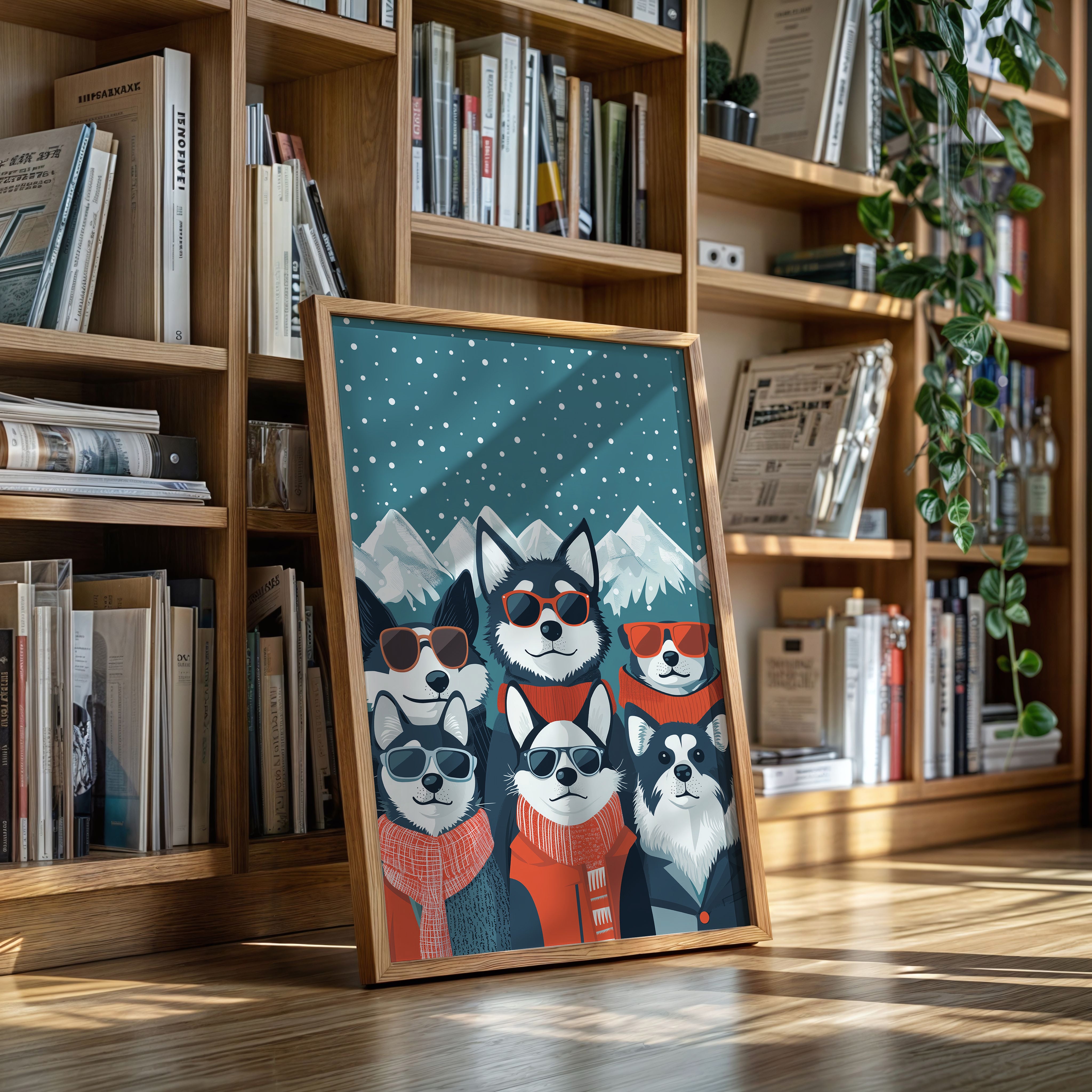 Beneath a starlit winter sky, six stylish huskies rock their shades and scarves with unmistakable charm and attitude. This playful piece from our Contemporary collection brings whimsical personality to modern pet portraiture. Against snow-capped mountains and a deep teal night sky dotted with falling snow, each pup shows off their unique character through perfectly paired accessories - from cozy orange scarves to trendy sunglasses. The perfect blend of humor and sophistication makes this piece an instant conversation starter in a home office, children's room, or any space needing a dash of fun. Let these cool canines bring their infectious joy to your everyday moments.