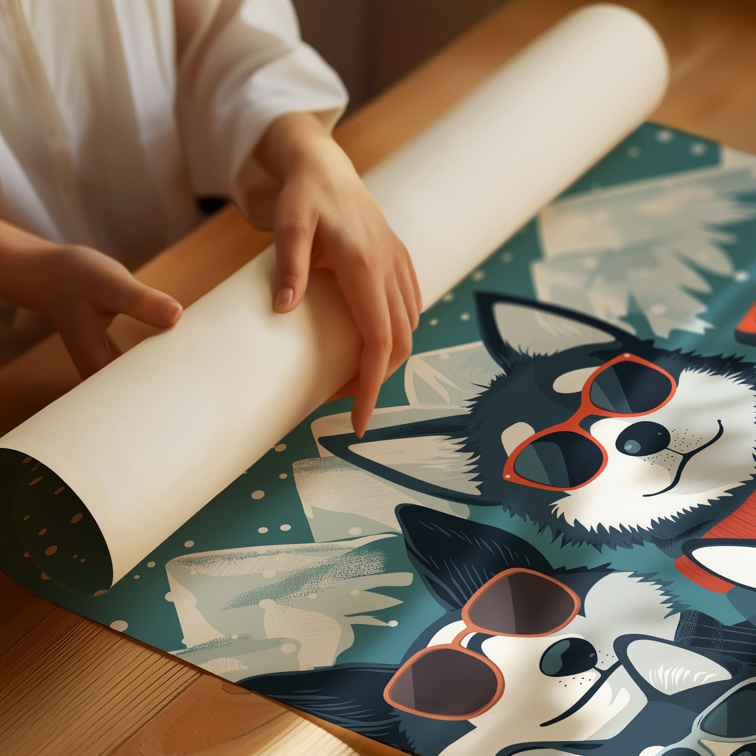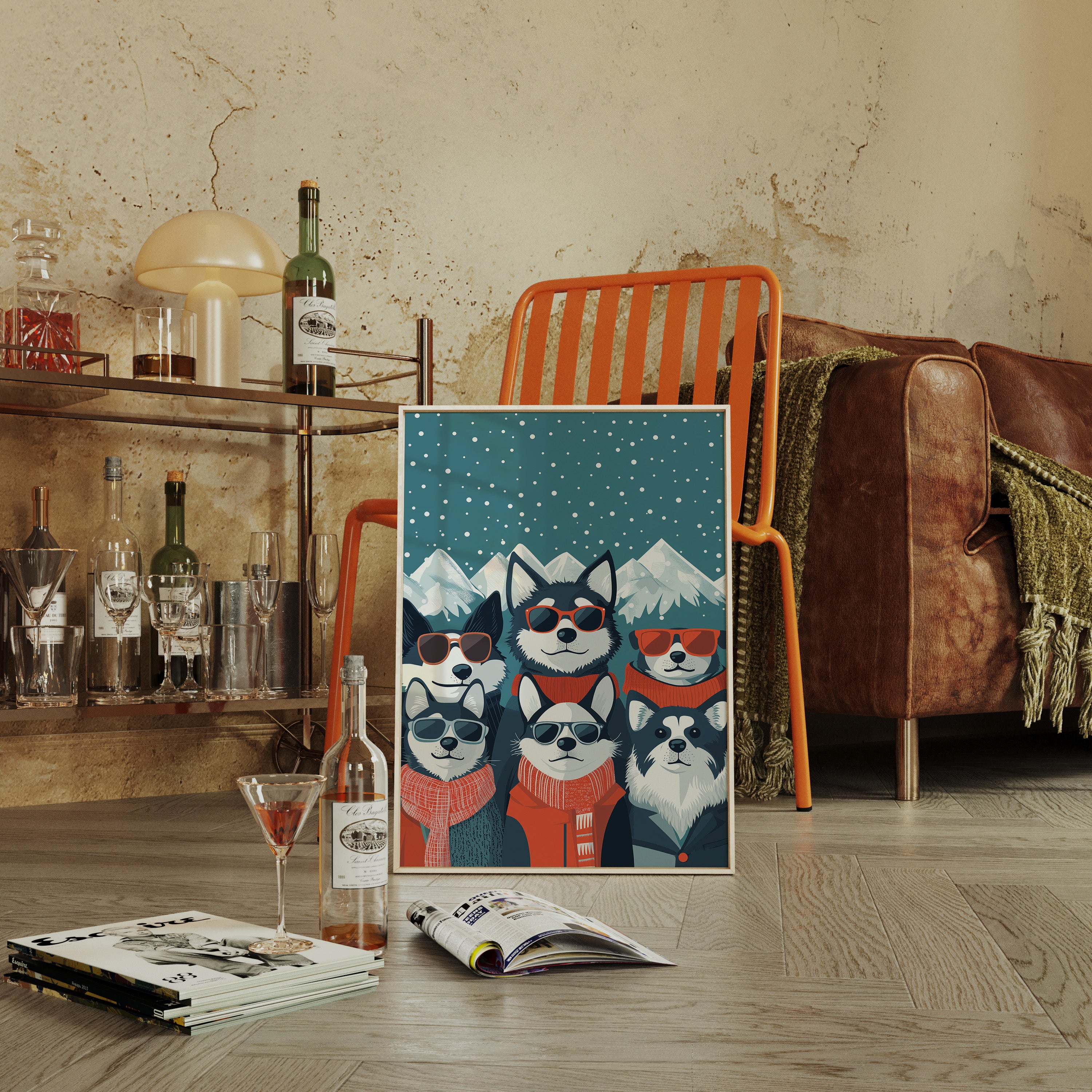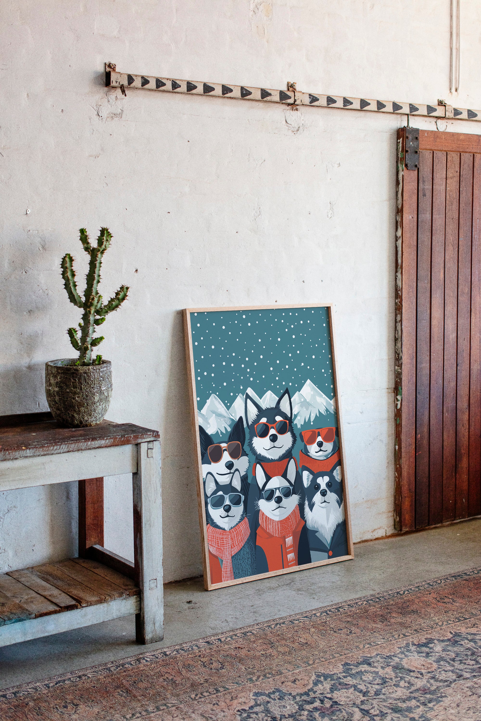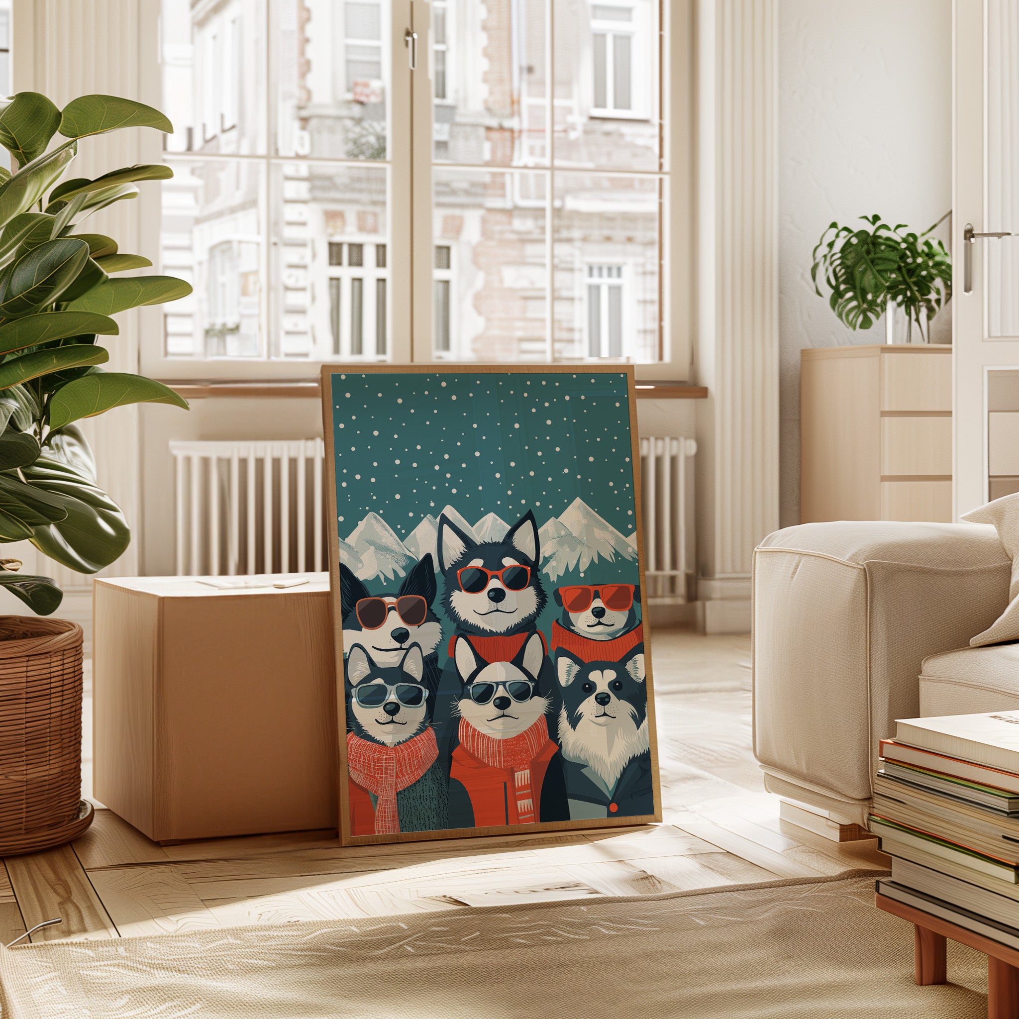 Beneath a starlit winter sky, six stylish huskies rock their shades and scarves with unmistakable charm and attitude. This playful piece from our Contemporary collection brings whimsical personality to modern pet portraiture. Against snow-capped mountains and a deep teal night sky dotted with falling snow, each pup shows off their unique character through perfectly paired accessories - from cozy orange scarves to trendy sunglasses. The perfect blend of humor and sophistication makes this piece an instant conversation starter in a home office, children's room, or any space needing a dash of fun. Let these cool canines bring their infectious joy to your everyday moments.