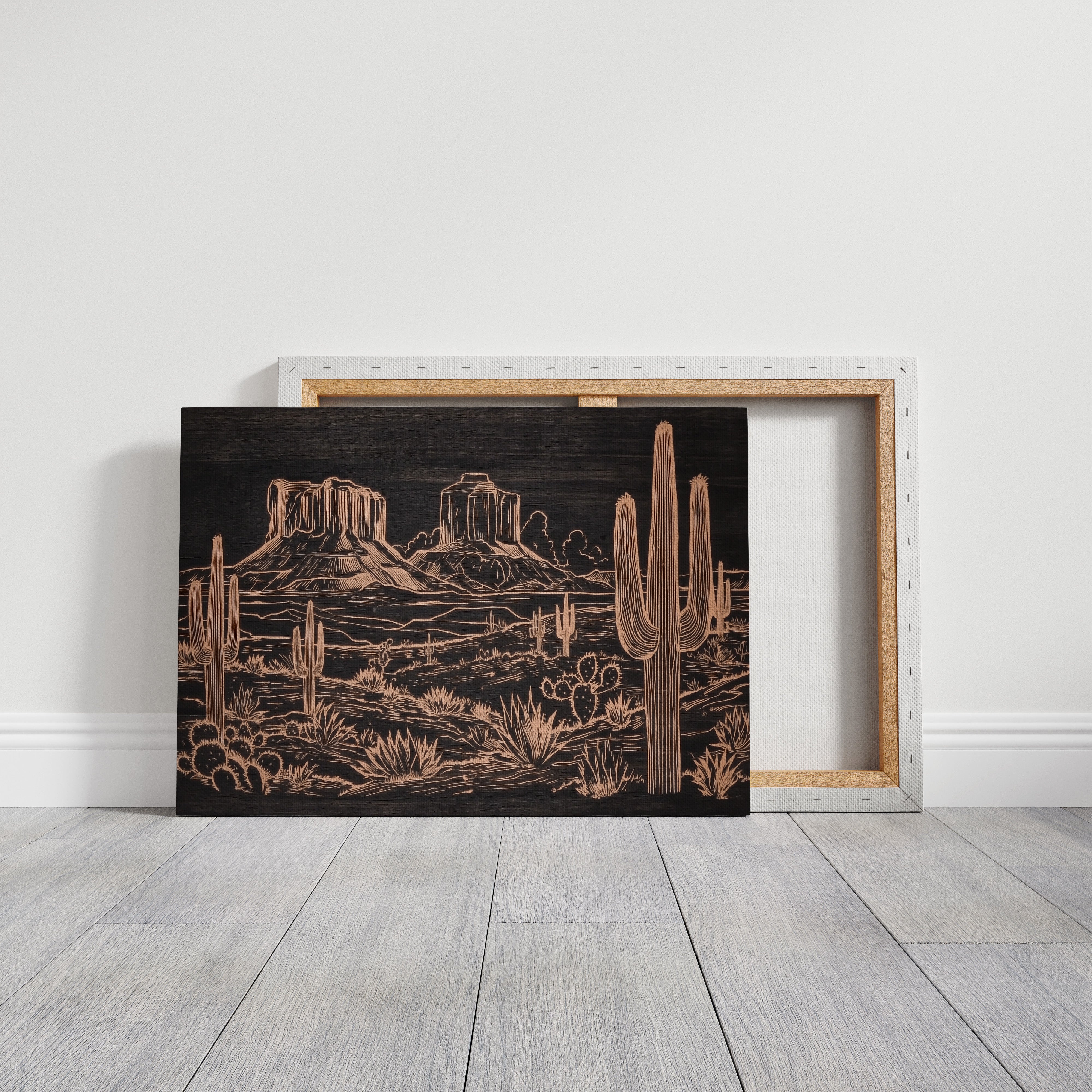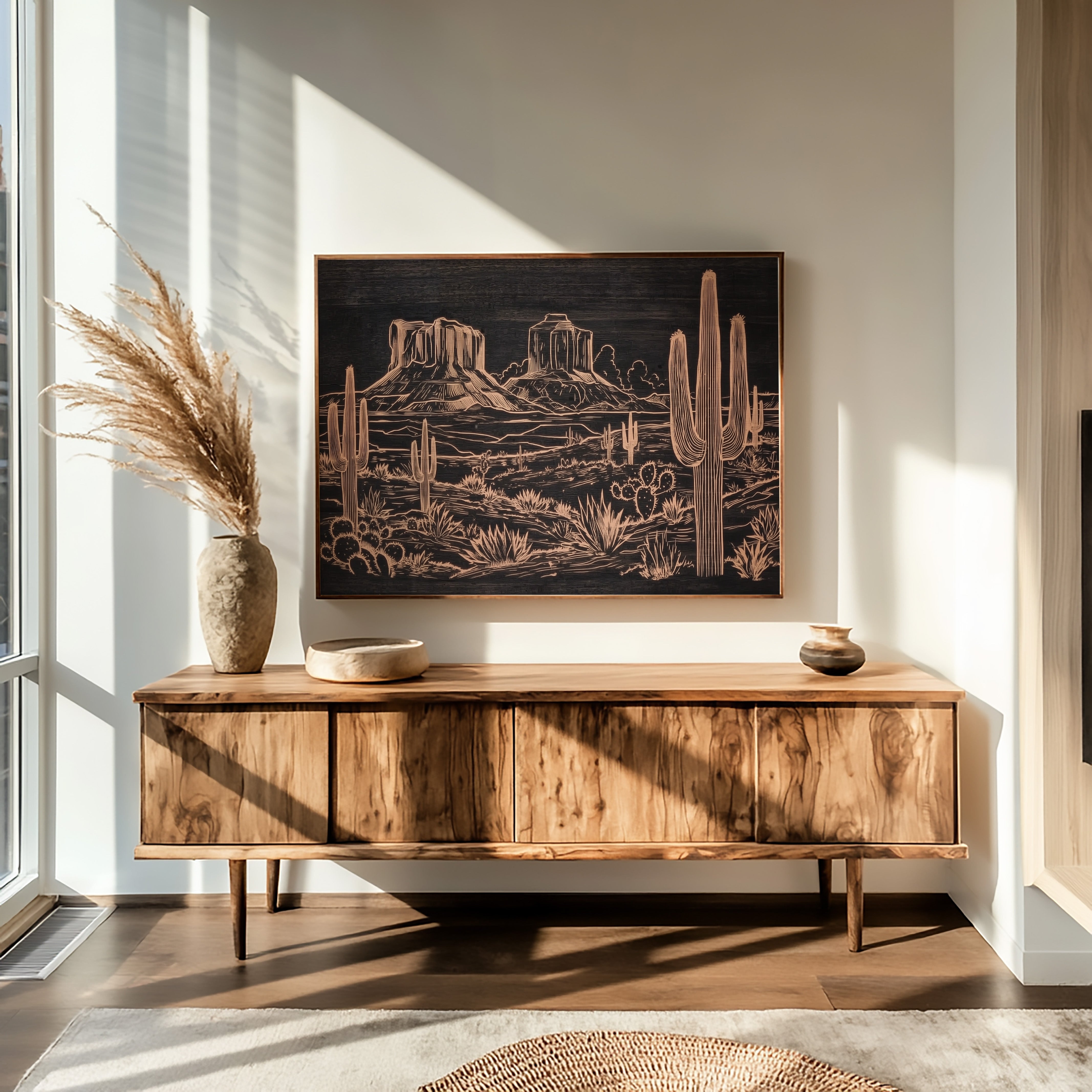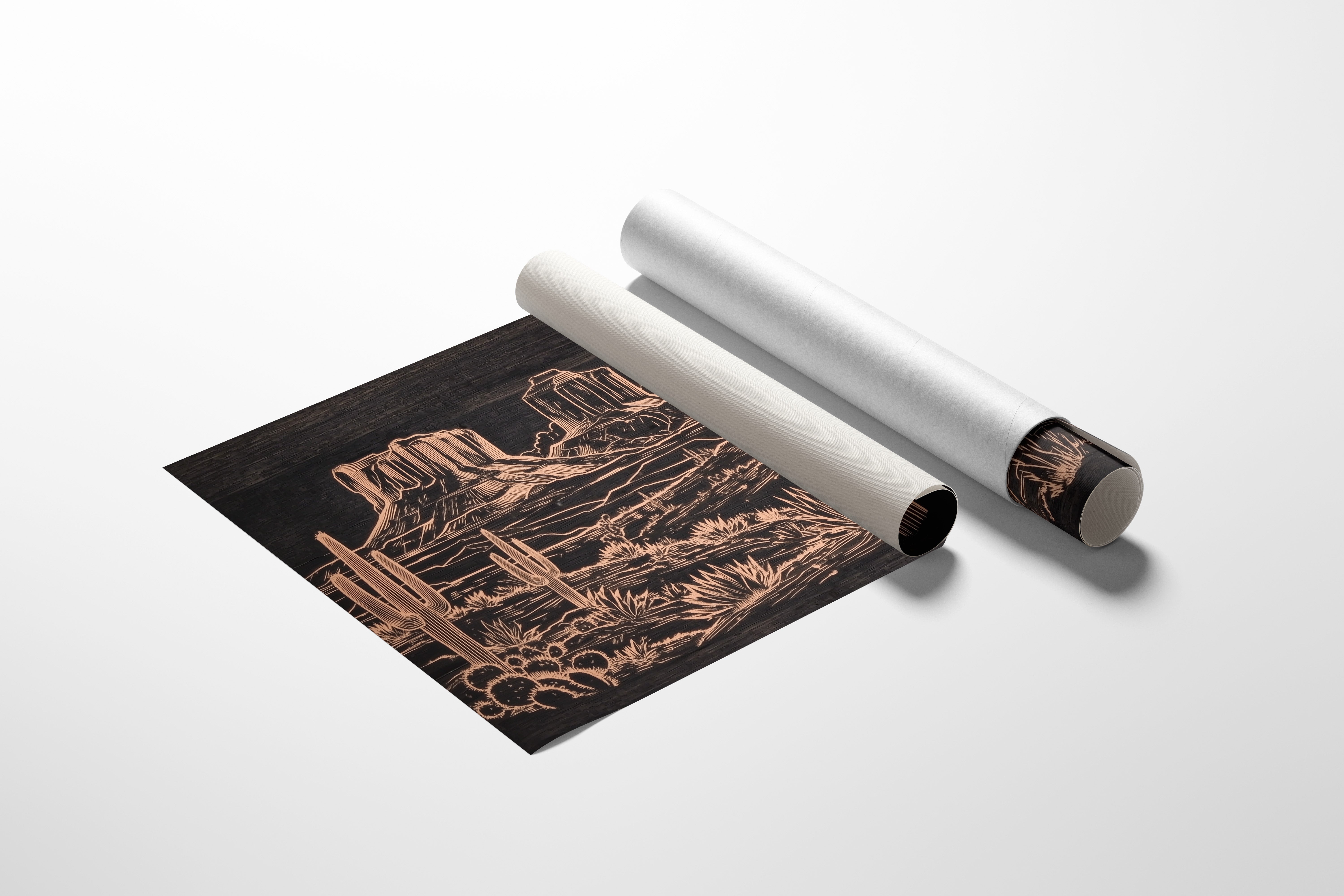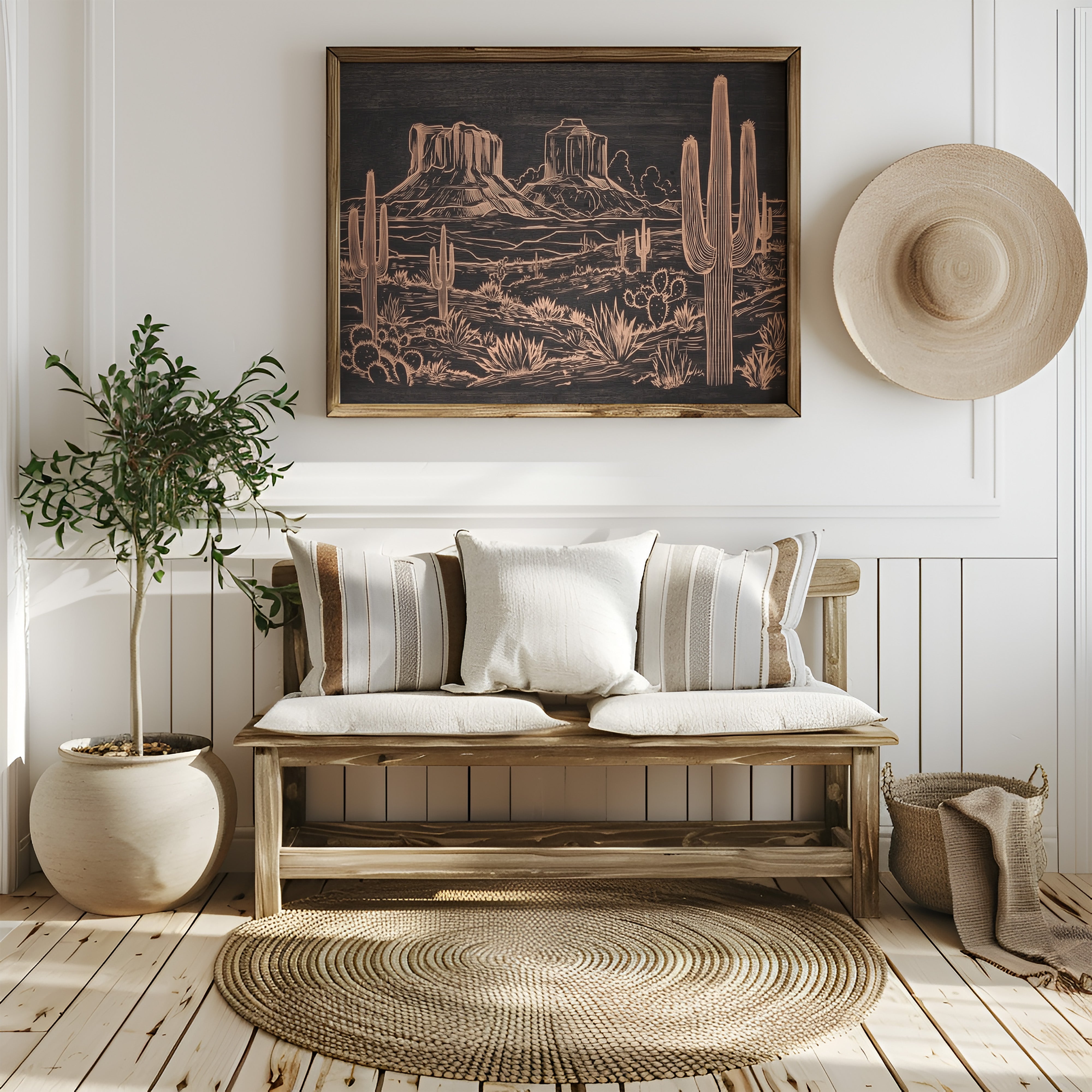Metallic lines trace a timeless desert narrative, where saguaros stand sentinel against weathered buttes. This striking piece from our Contemporary collection reimagines the Southwest through modern minimalist design. Copper tones dance across a deep charcoal background, capturing the raw beauty of desert flora - from towering cacti to hardy agave plants - while distant mesas anchor the horizon with their stoic presence. The intricate linework creates a sophisticated interplay of texture and depth, perfect for adding warmth and artistic intrigue to a modern living space. This piece brings the soul of the desert home, creating a focal point that sparks conversation while maintaining elegant simplicity.