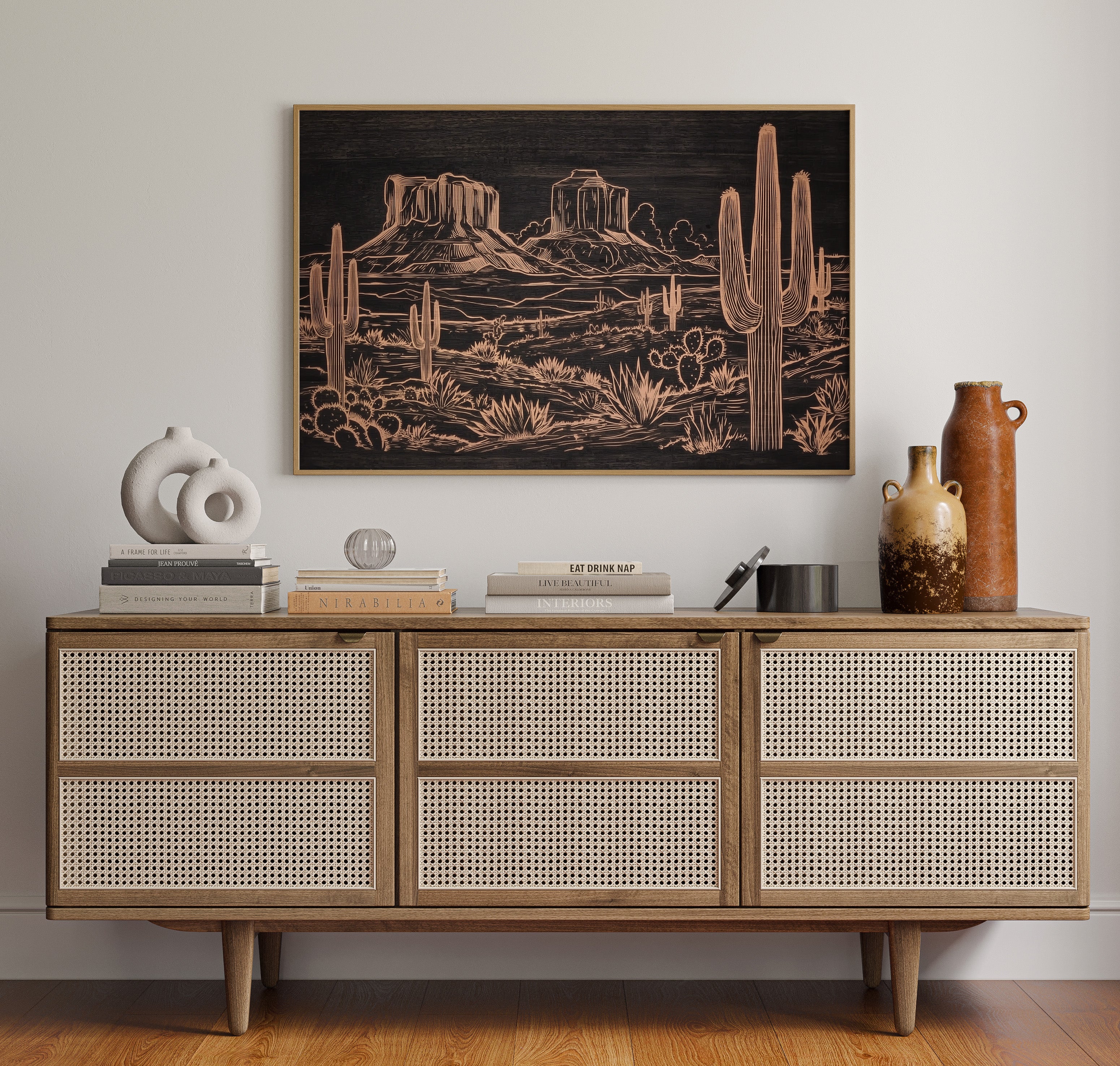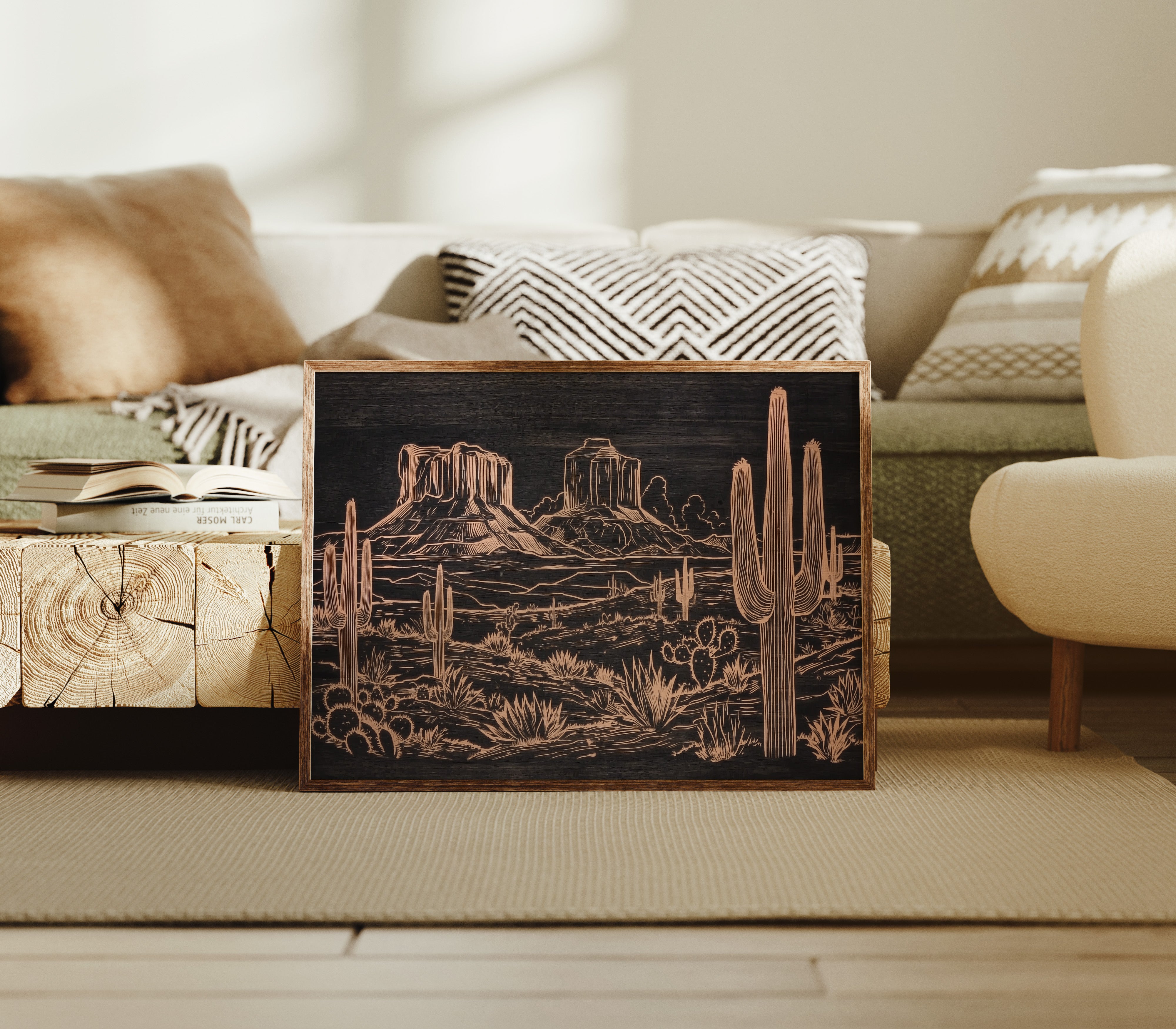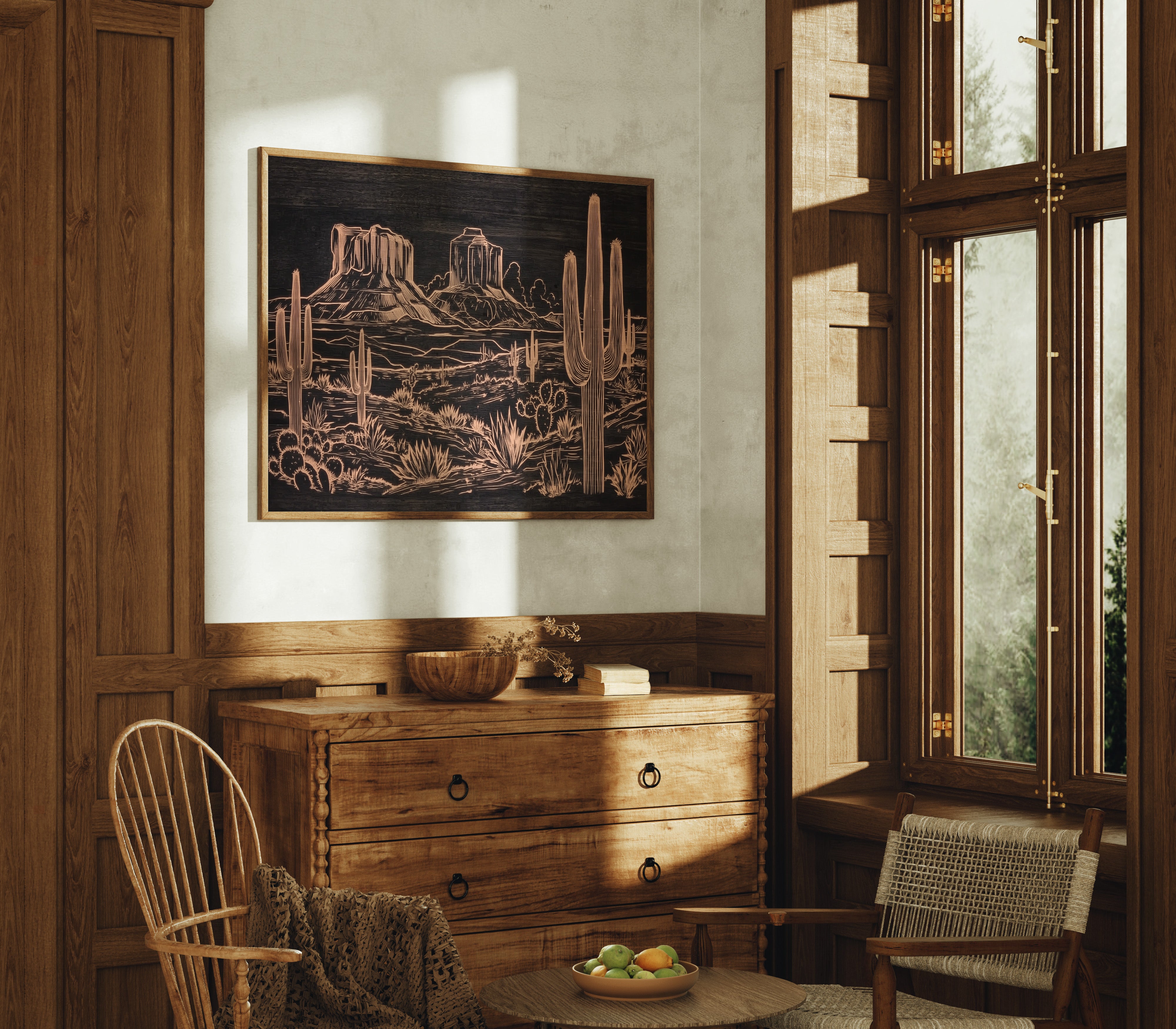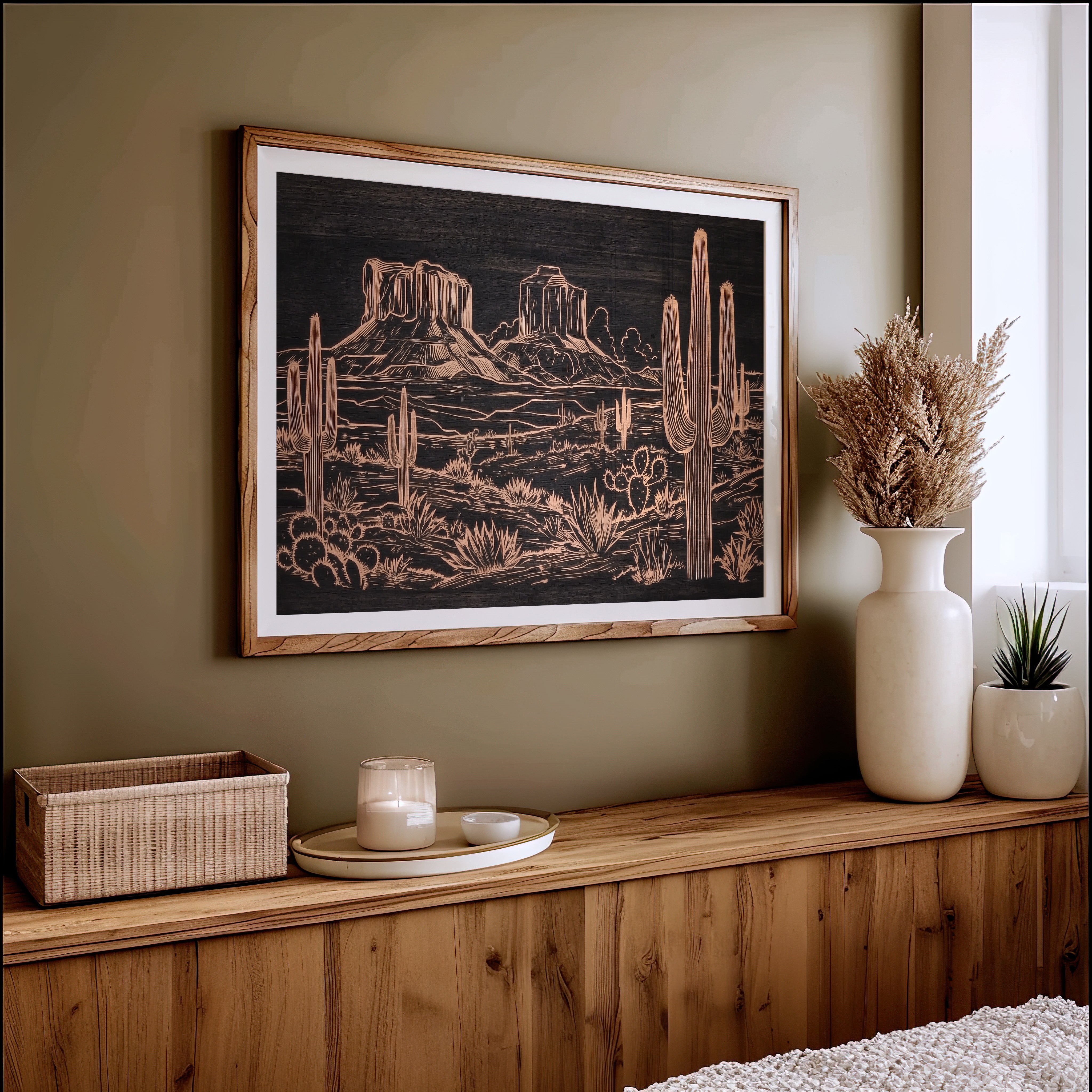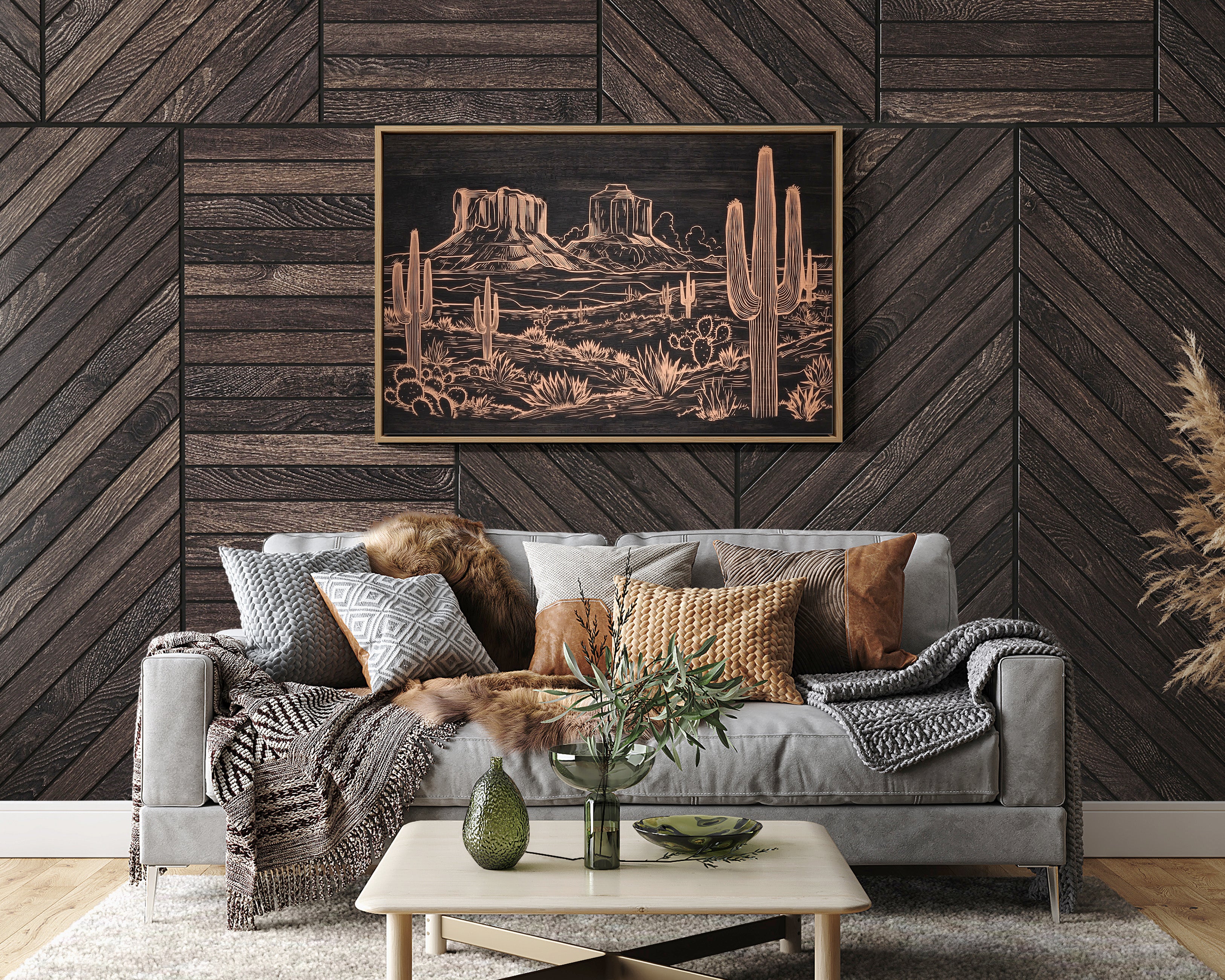 Metallic lines trace a timeless desert narrative, where saguaros stand sentinel against weathered buttes. This striking piece from our Contemporary collection reimagines the Southwest through modern minimalist design. Copper tones dance across a deep charcoal background, capturing the raw beauty of desert flora - from towering cacti to hardy agave plants - while distant mesas anchor the horizon with their stoic presence. The intricate linework creates a sophisticated interplay of texture and depth, perfect for adding warmth and artistic intrigue to a modern living space. This piece brings the soul of the desert home, creating a focal point that sparks conversation while maintaining elegant simplicity.
