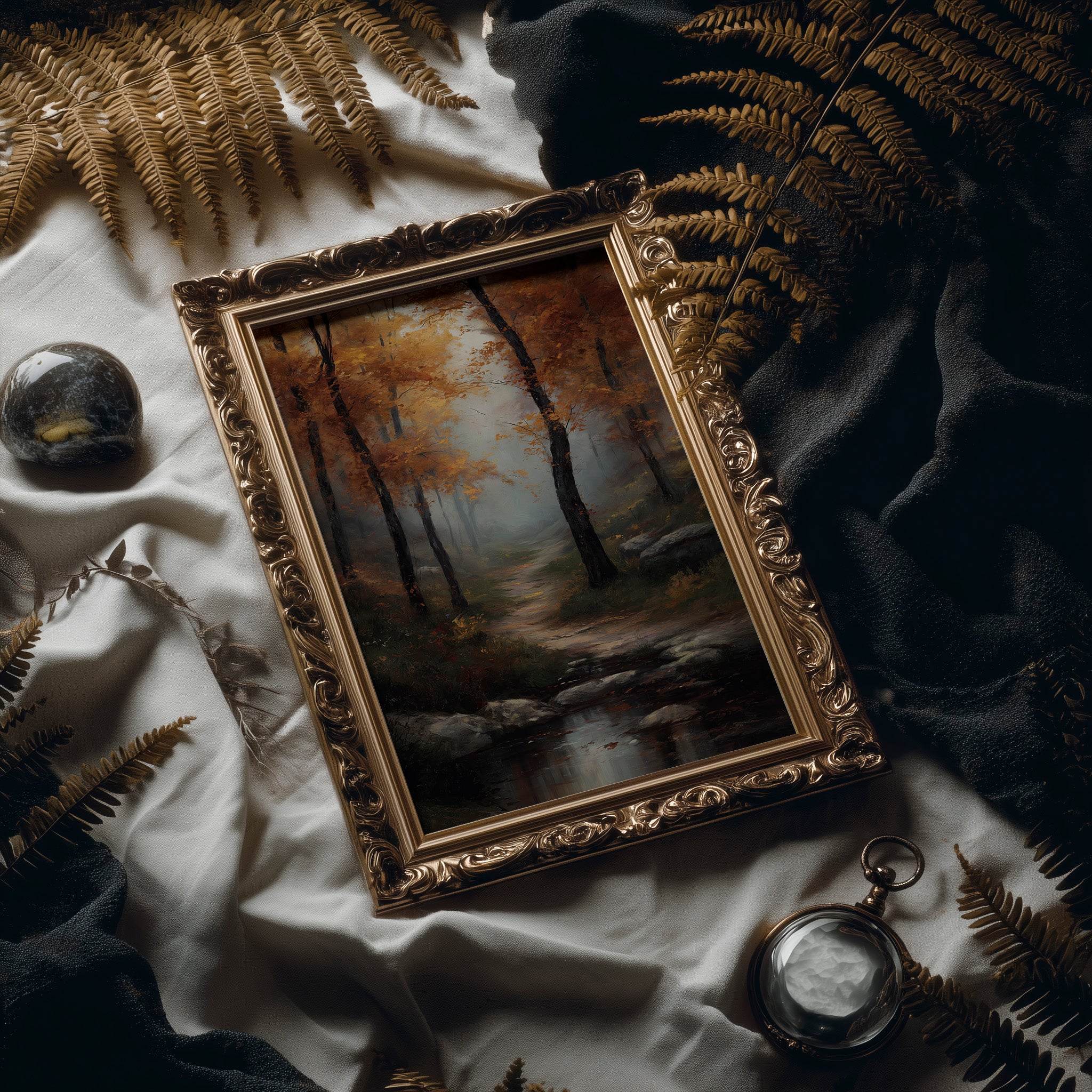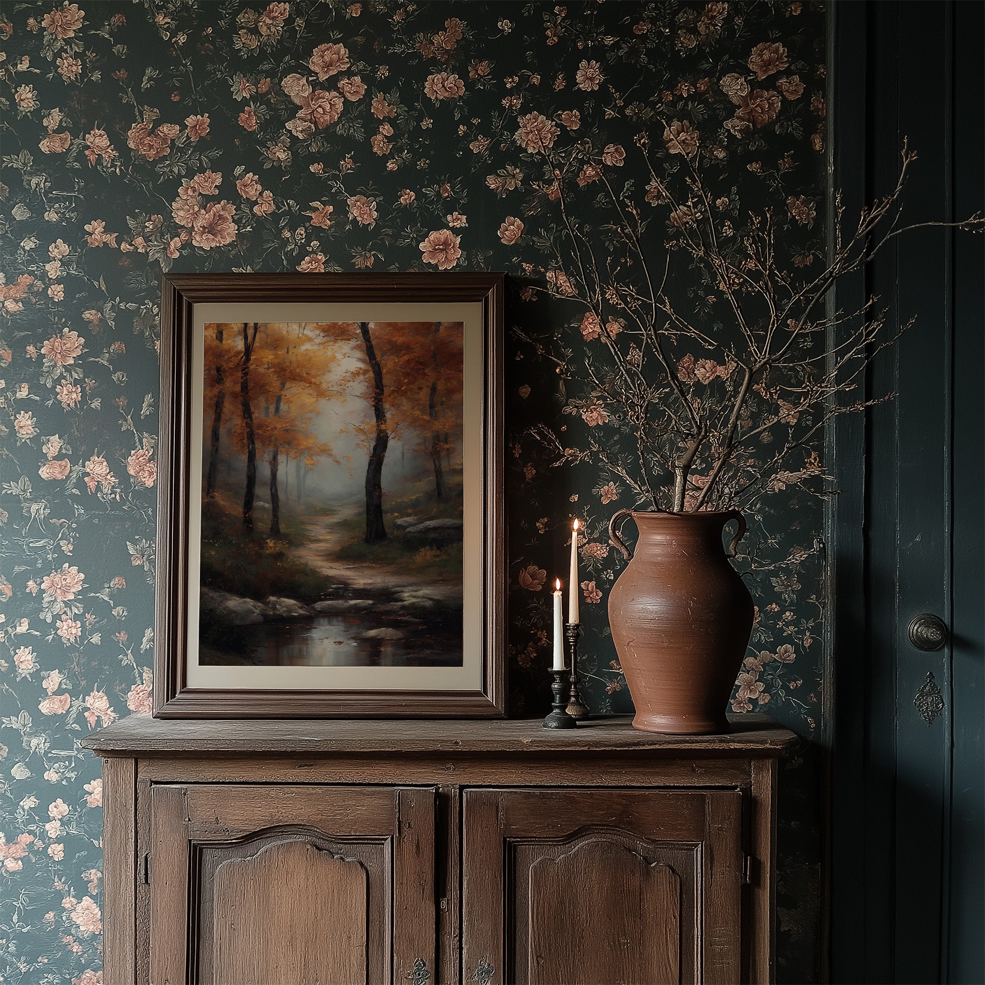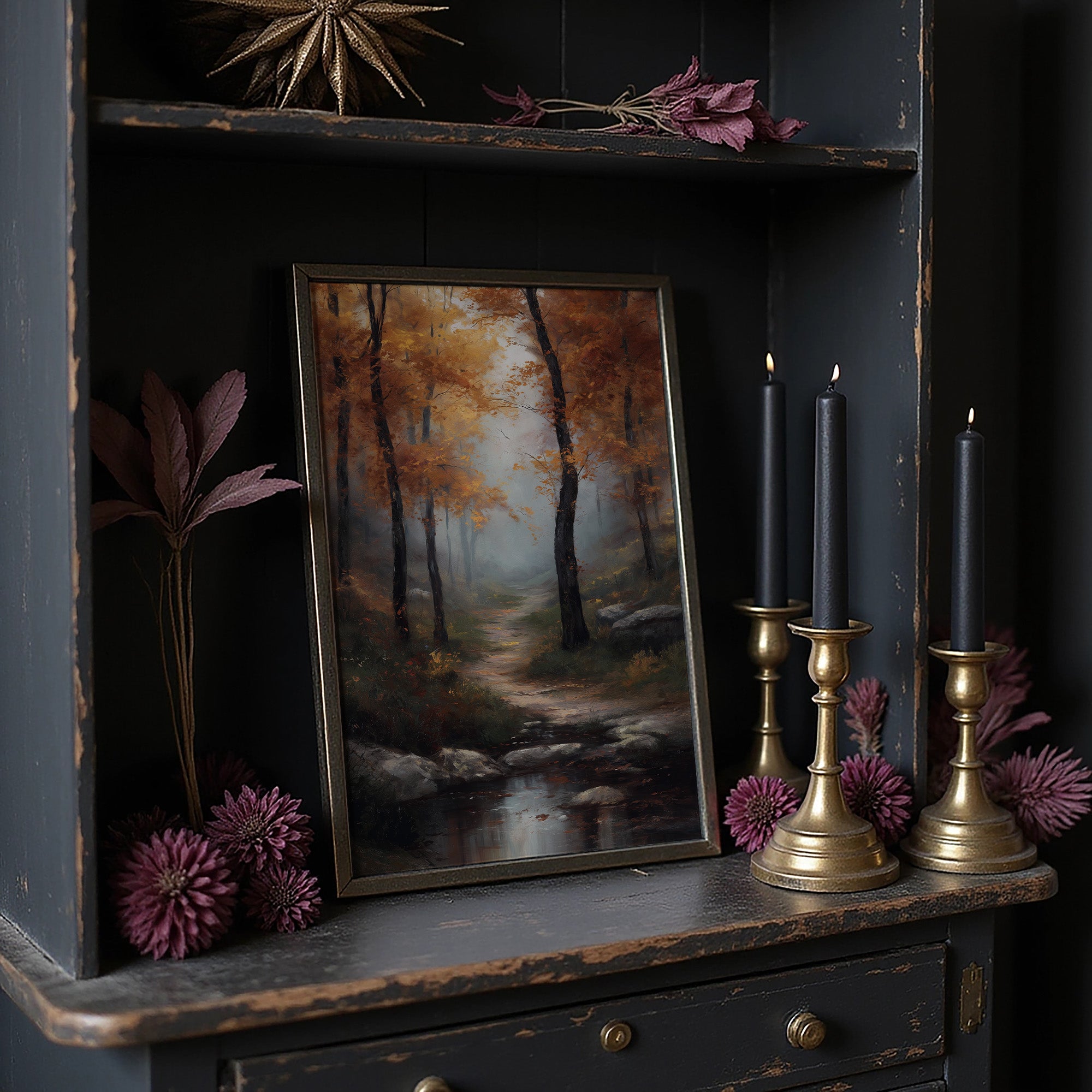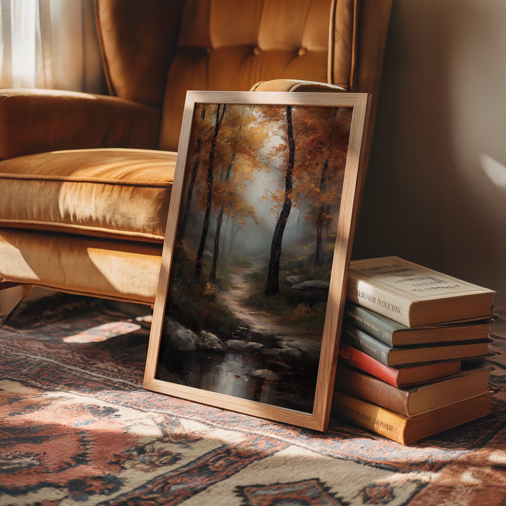 Morning fog weaves between amber-crowned trees, creating a dreamlike pathway into the unknown. The rich copper and russet leaves frame a mysterious trail that disappears into a soft haze, while gentle reflections shimmer in the still water at the forest floor. This atmospheric scene captures that fleeting moment when autumn's splendor meets dawn's gentle mystery.