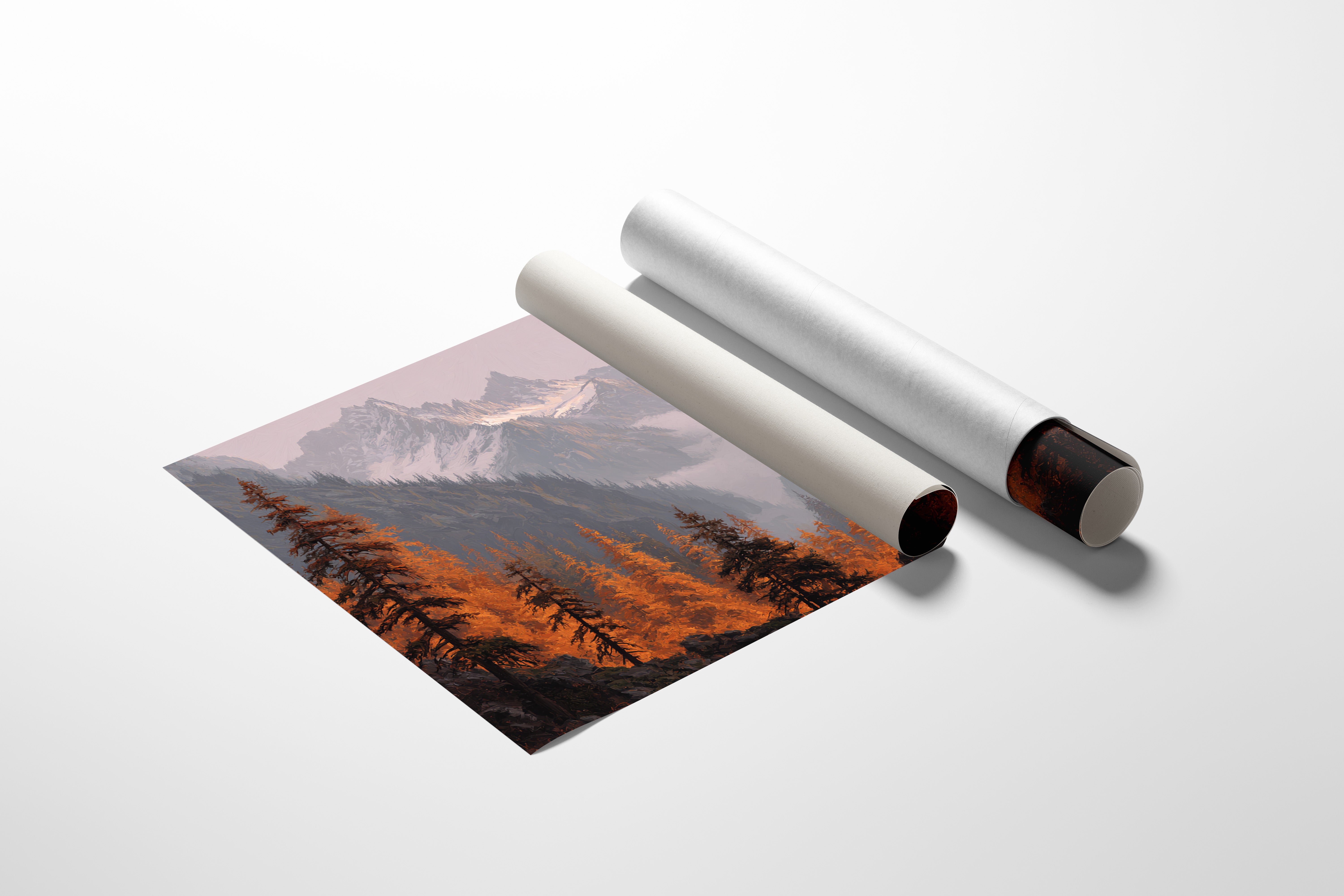 Morning light ignites a forest of evergreens in brilliant copper tones, creating a fiery contrast against the cool, misty mountains beyond. Majestic peaks pierce through layers of ethereal fog, their jagged silhouettes etched against a soft rose sky. The ancient pines stand like sentinels along the rocky slopes, their branches catching the golden dawn light while mysterious valleys remain shrouded in purple shadows below. This scene captures the raw grandeur of wilderness where mountain meets sky, where every sunrise transforms the landscape into a canvas of natural wonder. Perfect for spaces seeking to evoke a sense of adventure and tranquility - ideal as a focal point in a mountain lodge, luxury cabin, or any room where nature's drama can inspire daily life.