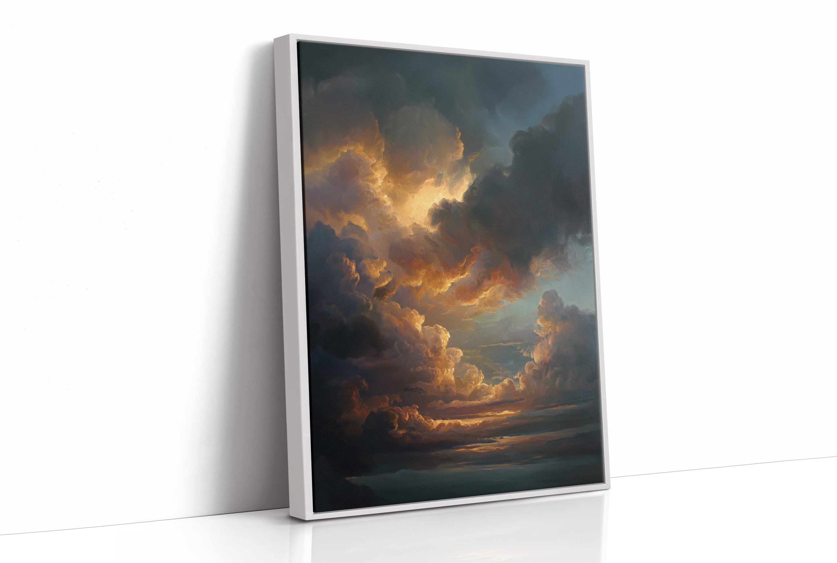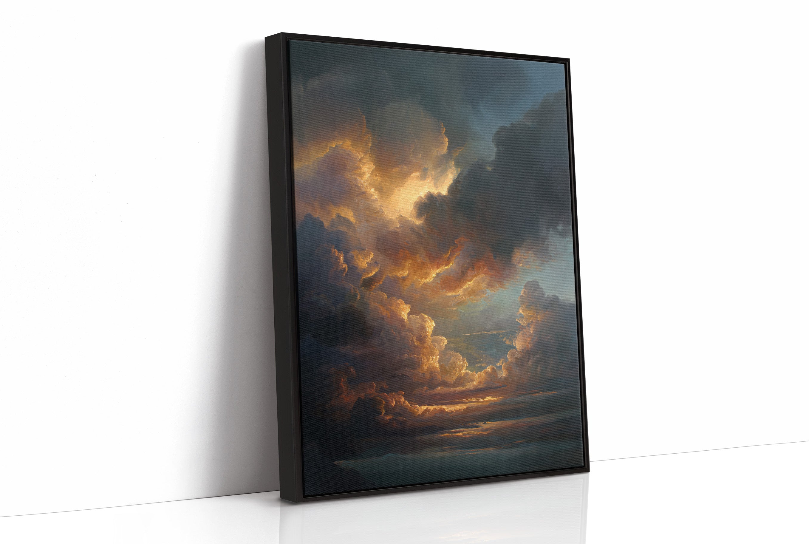 Tumultuous clouds catch the dying sun, their edges illuminated in molten gold against stormy blue depths. The atmospheric painting captures that fleeting moment when light breaks through darkness, transforming ordinary vapor into celestial architecture. Rich amber tones cascade through billowing formations, creating a dramatic skyscape that feels both volatile and serene, like nature's own theater of light.