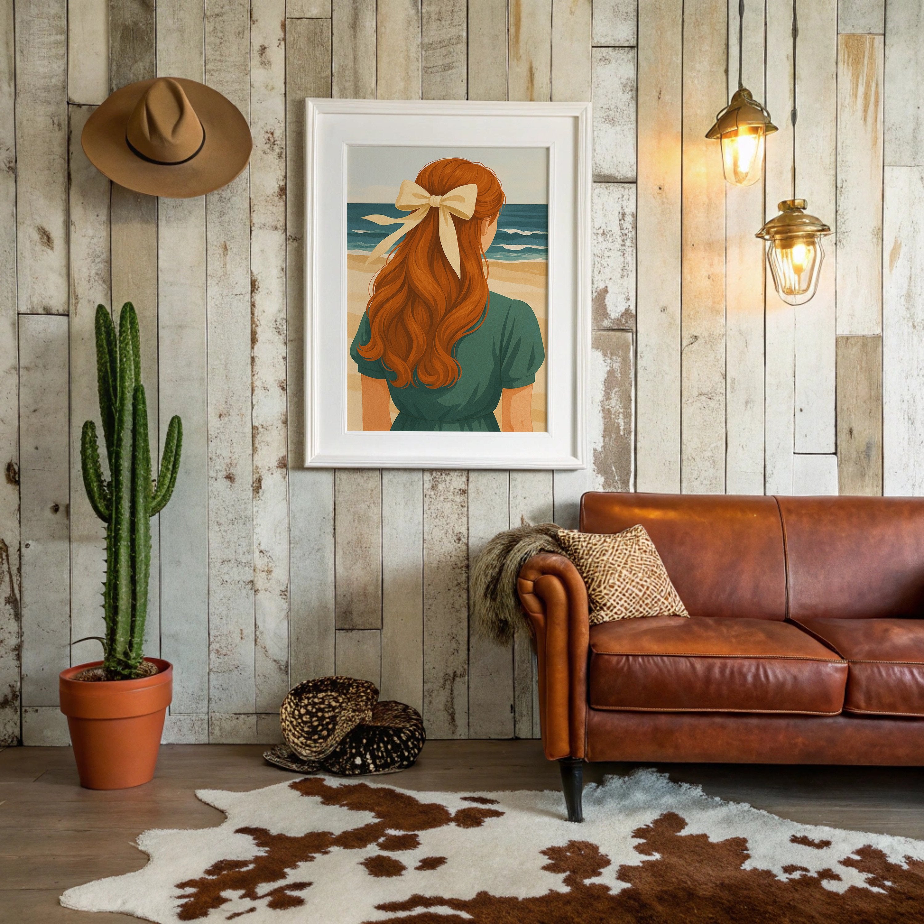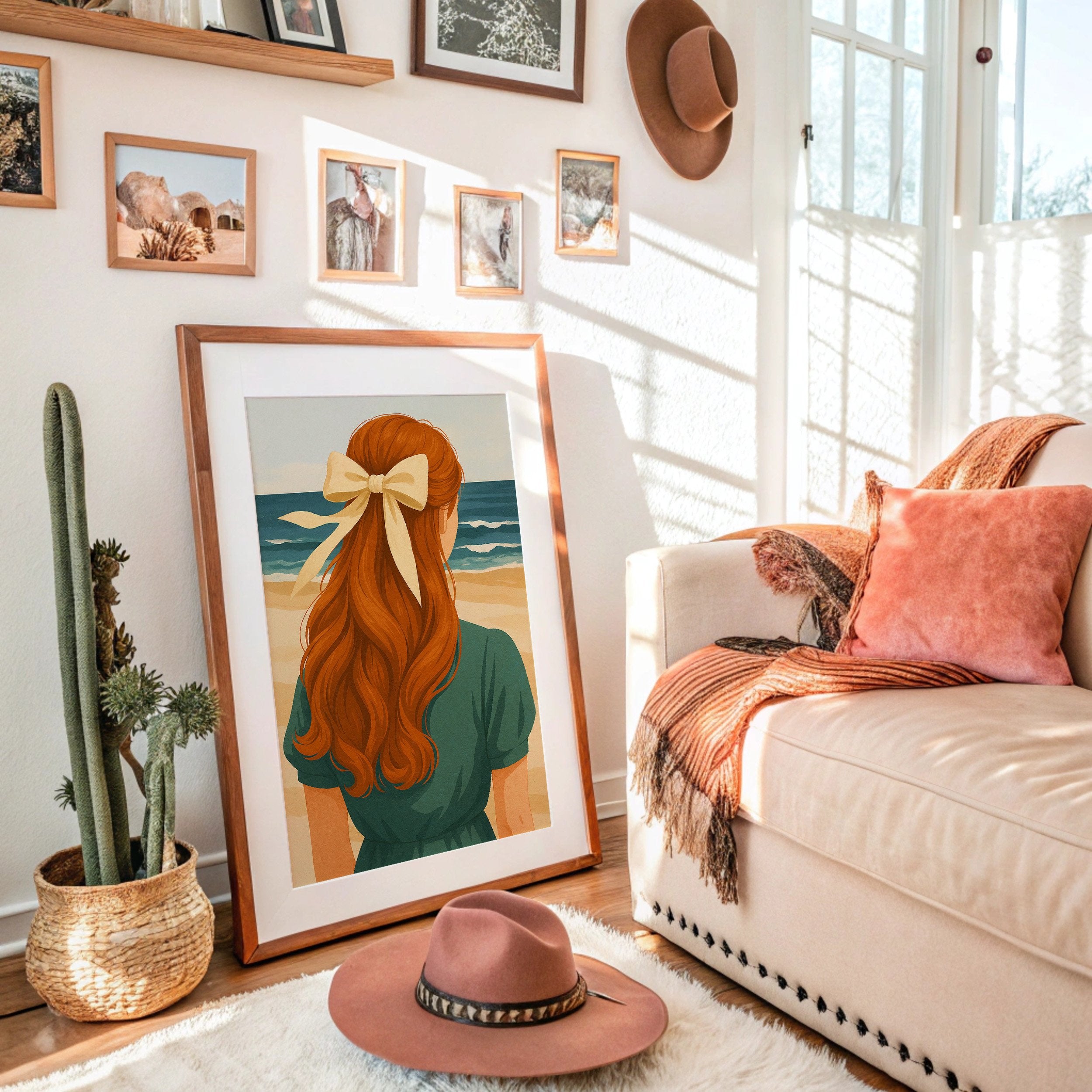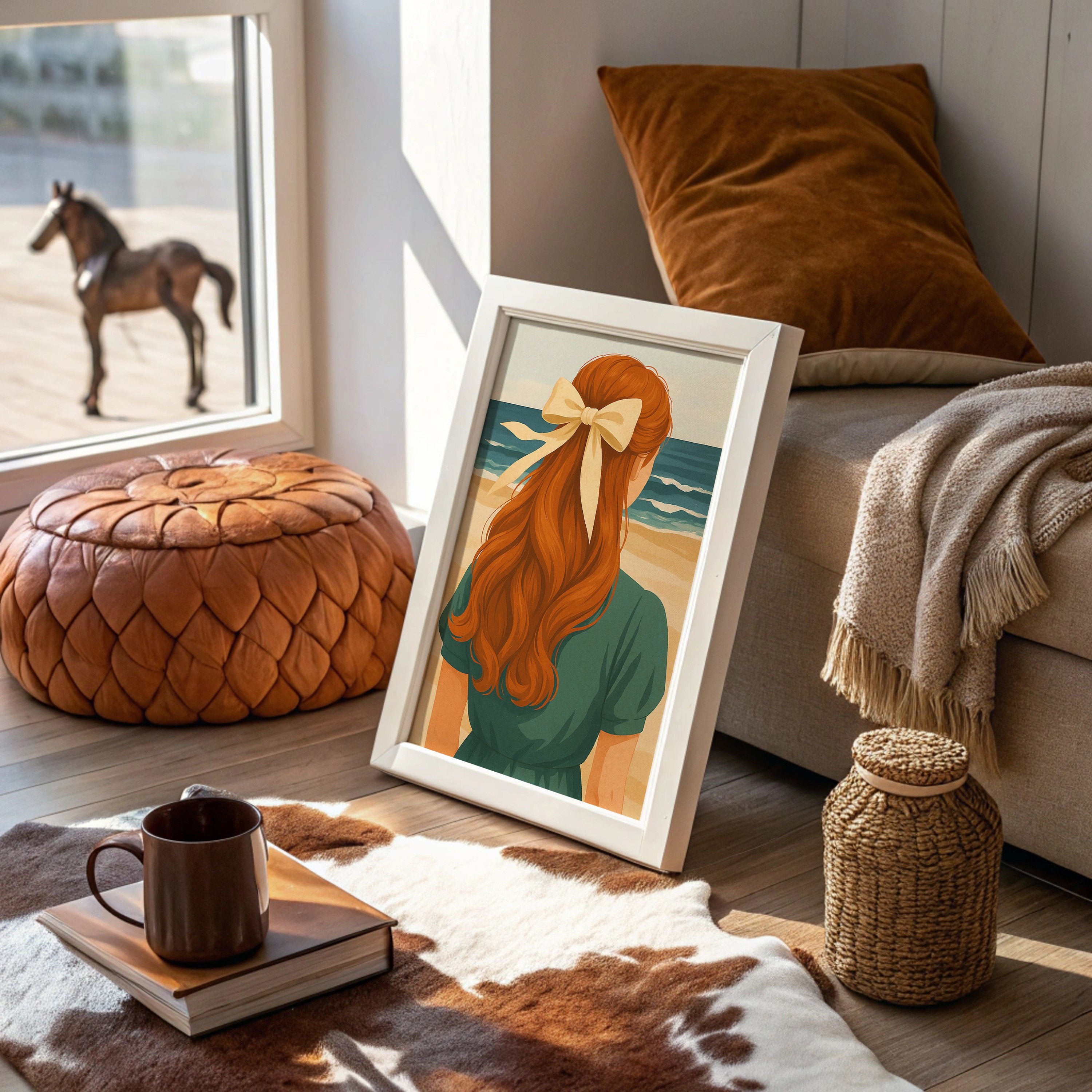 Sun-warmed copper tresses cascade down a teal-clad back, the cream ribbon catching light like seafoam. The painting captures that perfect moment of contemplation where the horizon calls and memories form against azure waves. Rich auburn curls contrast against the serene coastal palette, creating a nostalgic summer narrative that feels both timeless and deeply personal. This piece brings coastal tranquility to living rooms or reading nooks where warm leather and natural textures already create conversation.