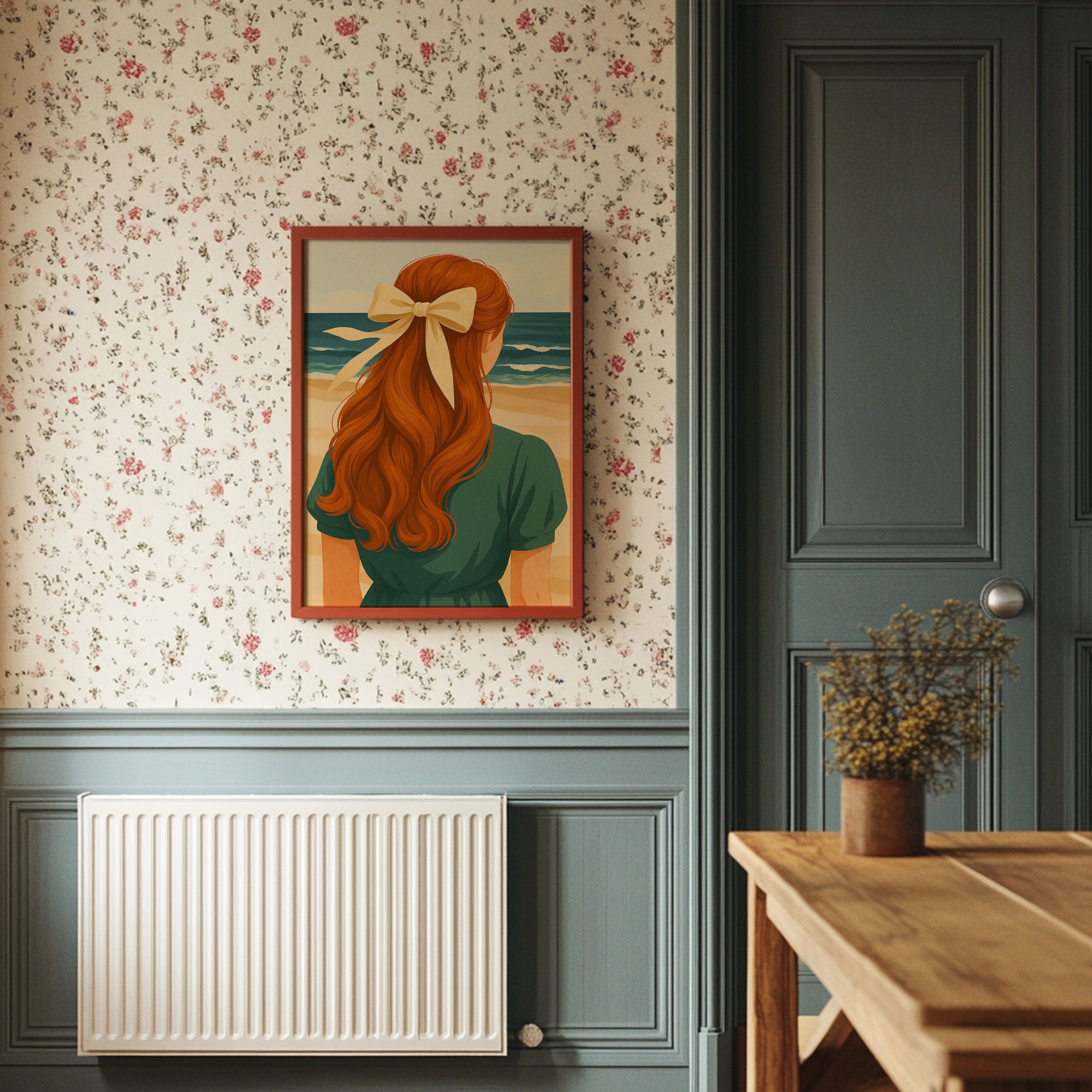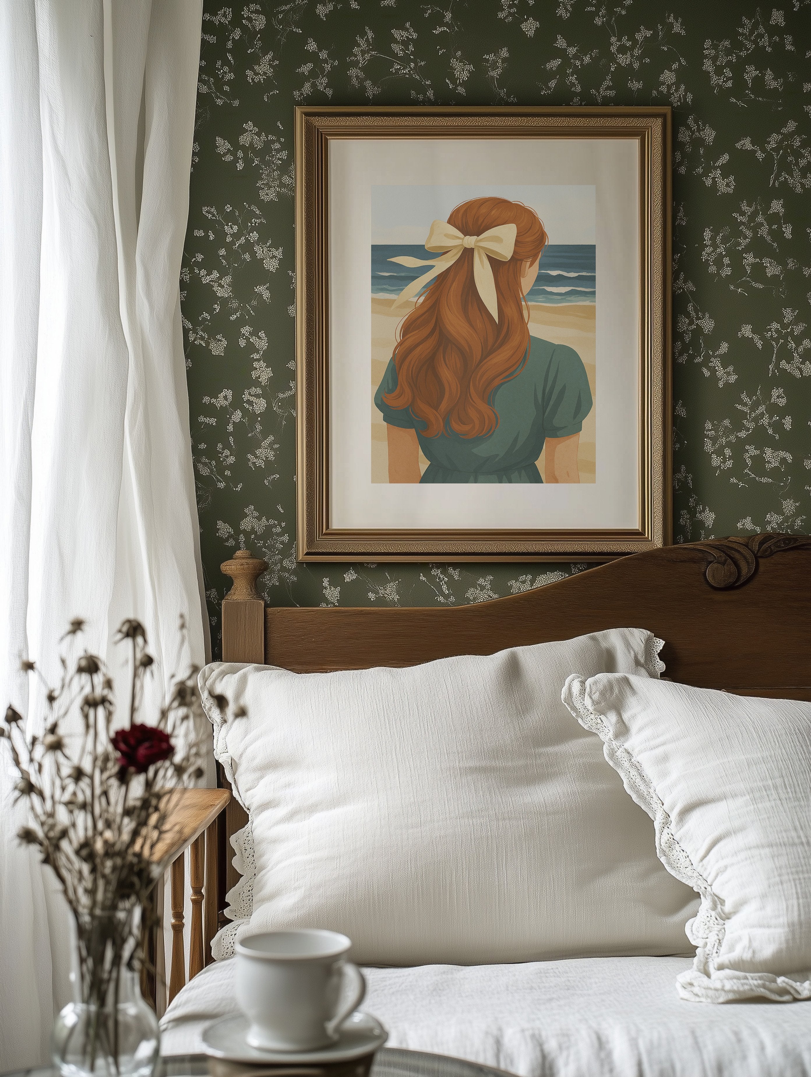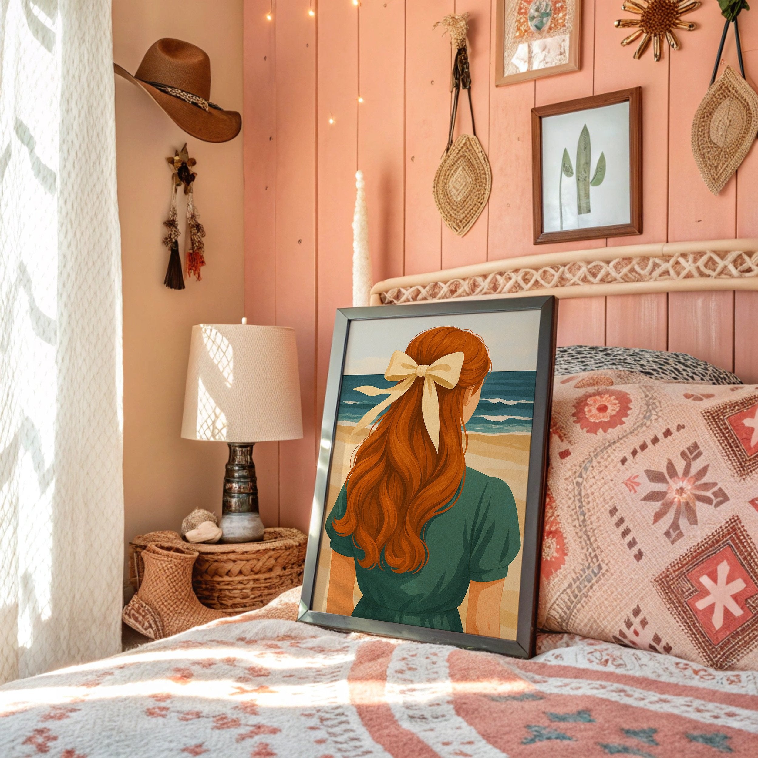 Sun-warmed copper tresses cascade down a teal-clad back, the cream ribbon catching light like seafoam. The painting captures that perfect moment of contemplation where the horizon calls and memories form against azure waves. Rich auburn curls contrast against the serene coastal palette, creating a nostalgic summer narrative that feels both timeless and deeply personal. This piece brings coastal tranquility to living rooms or reading nooks where warm leather and natural textures already create conversation.