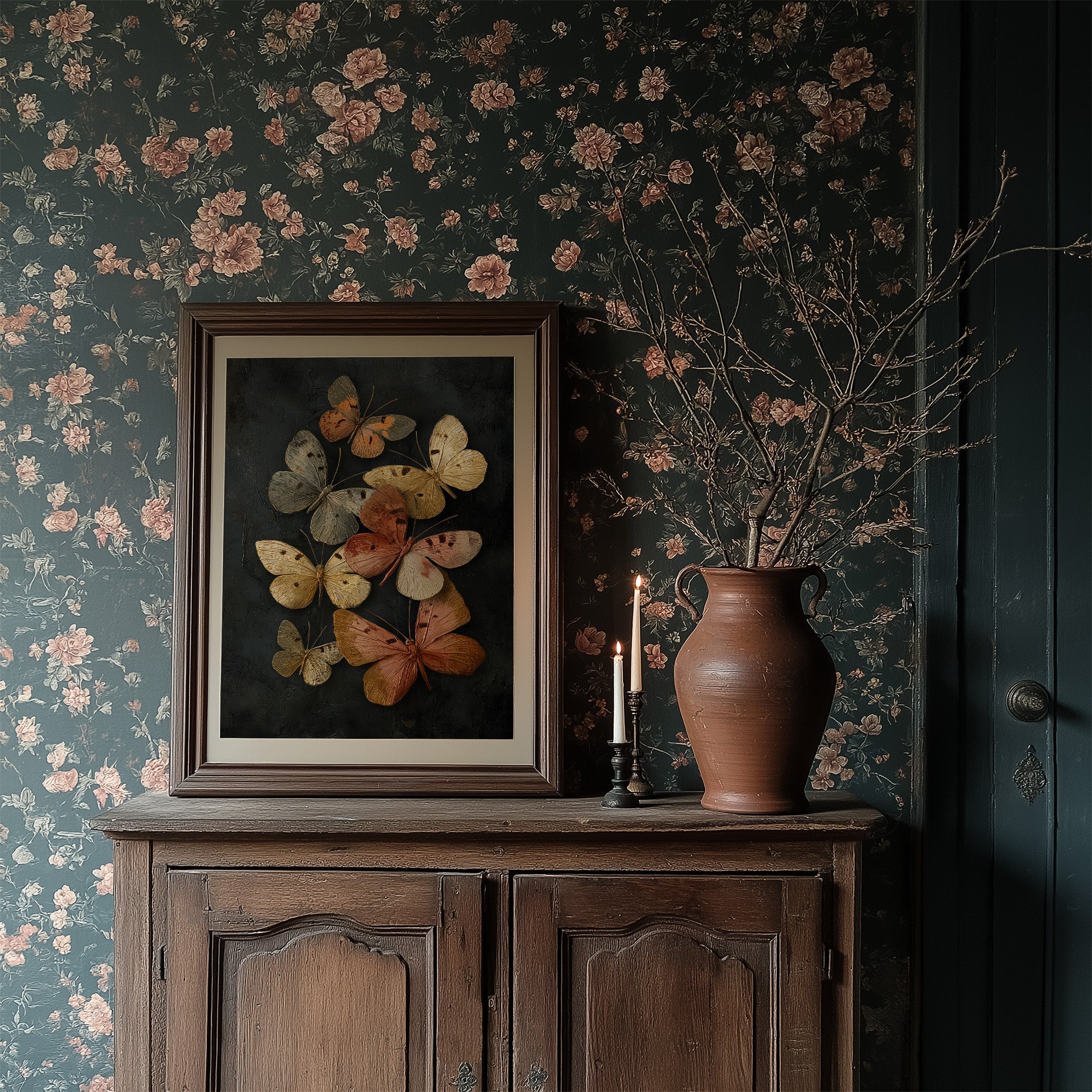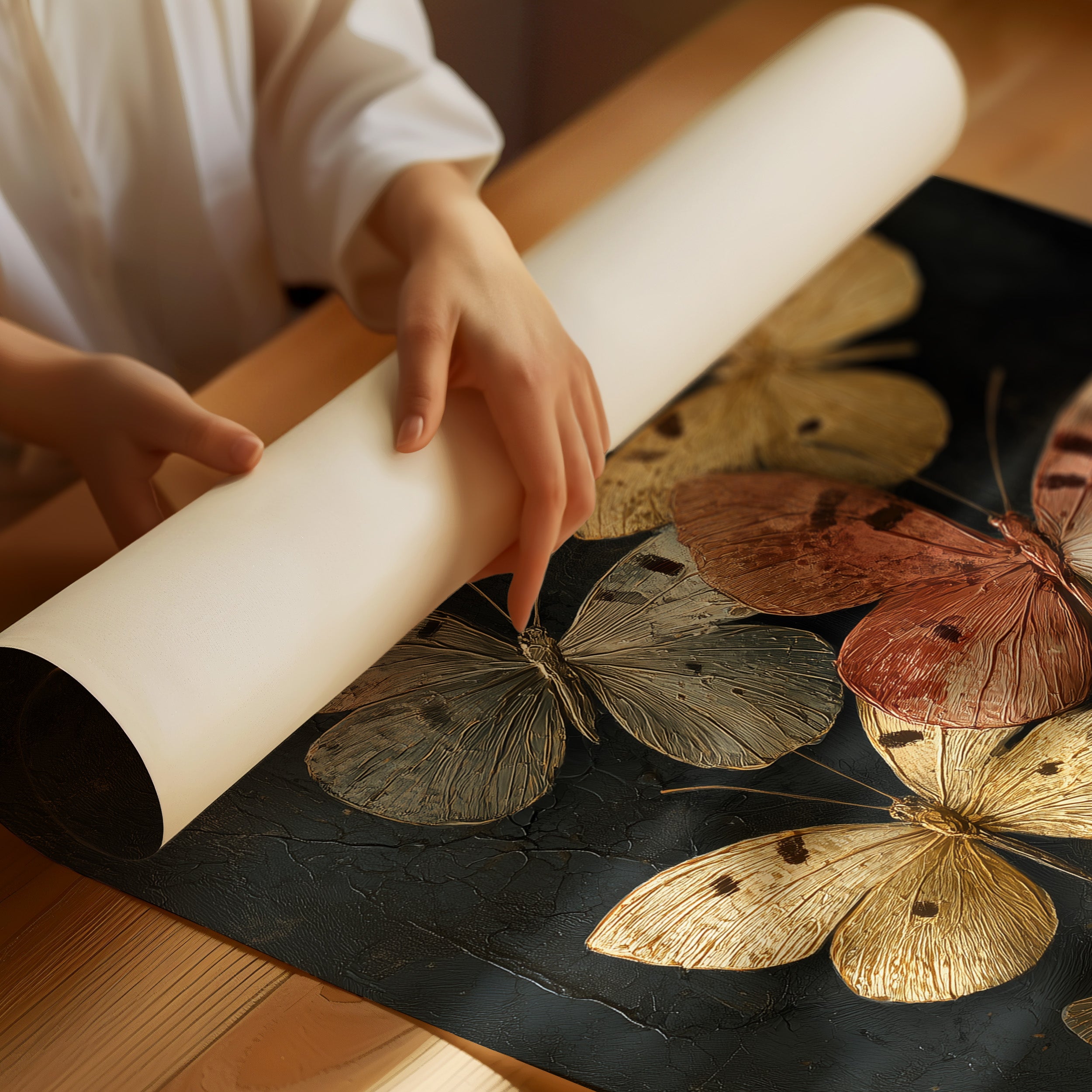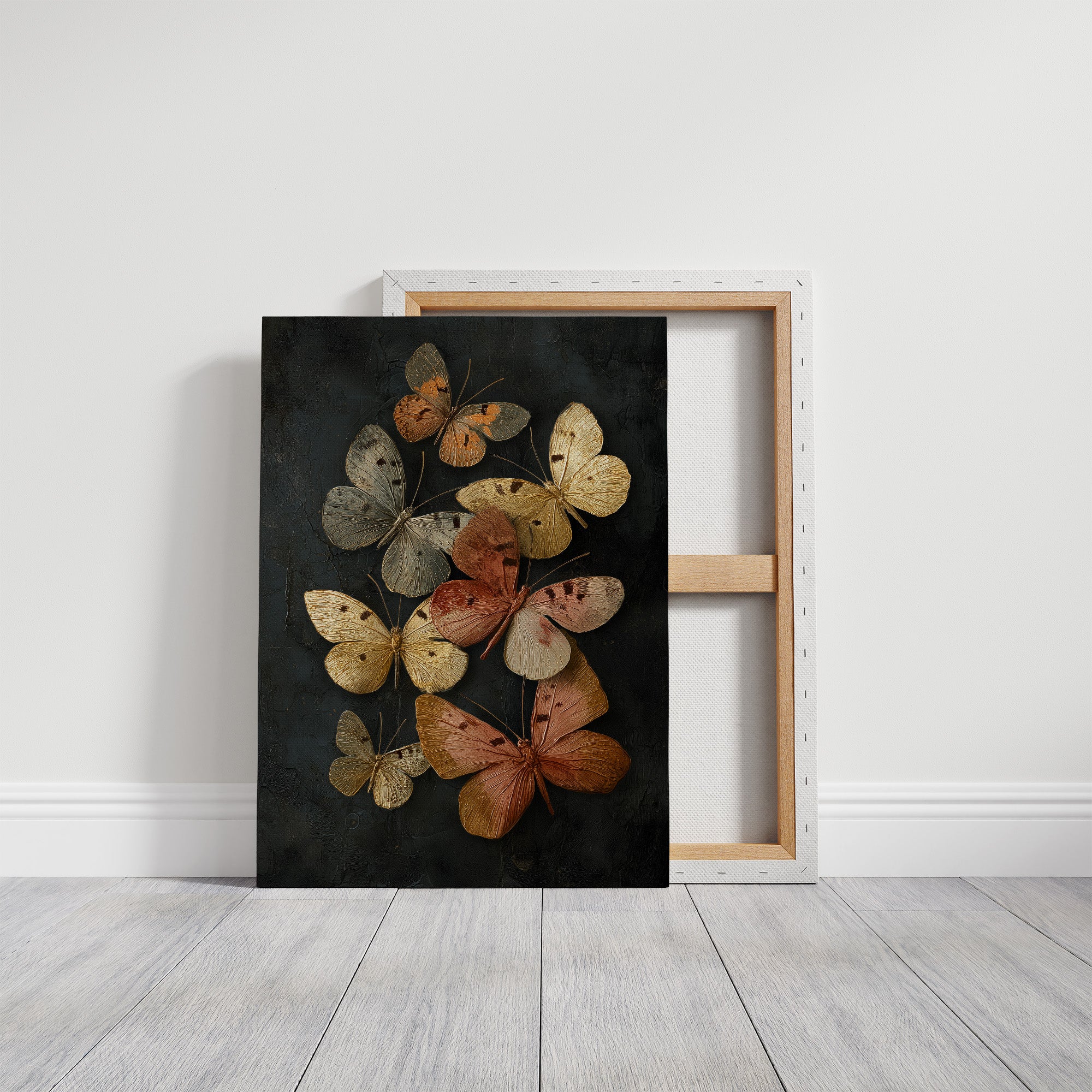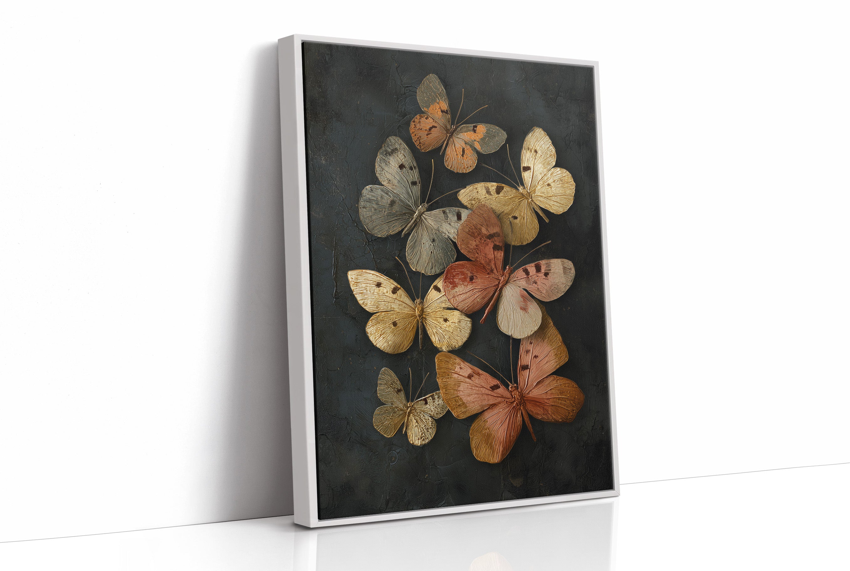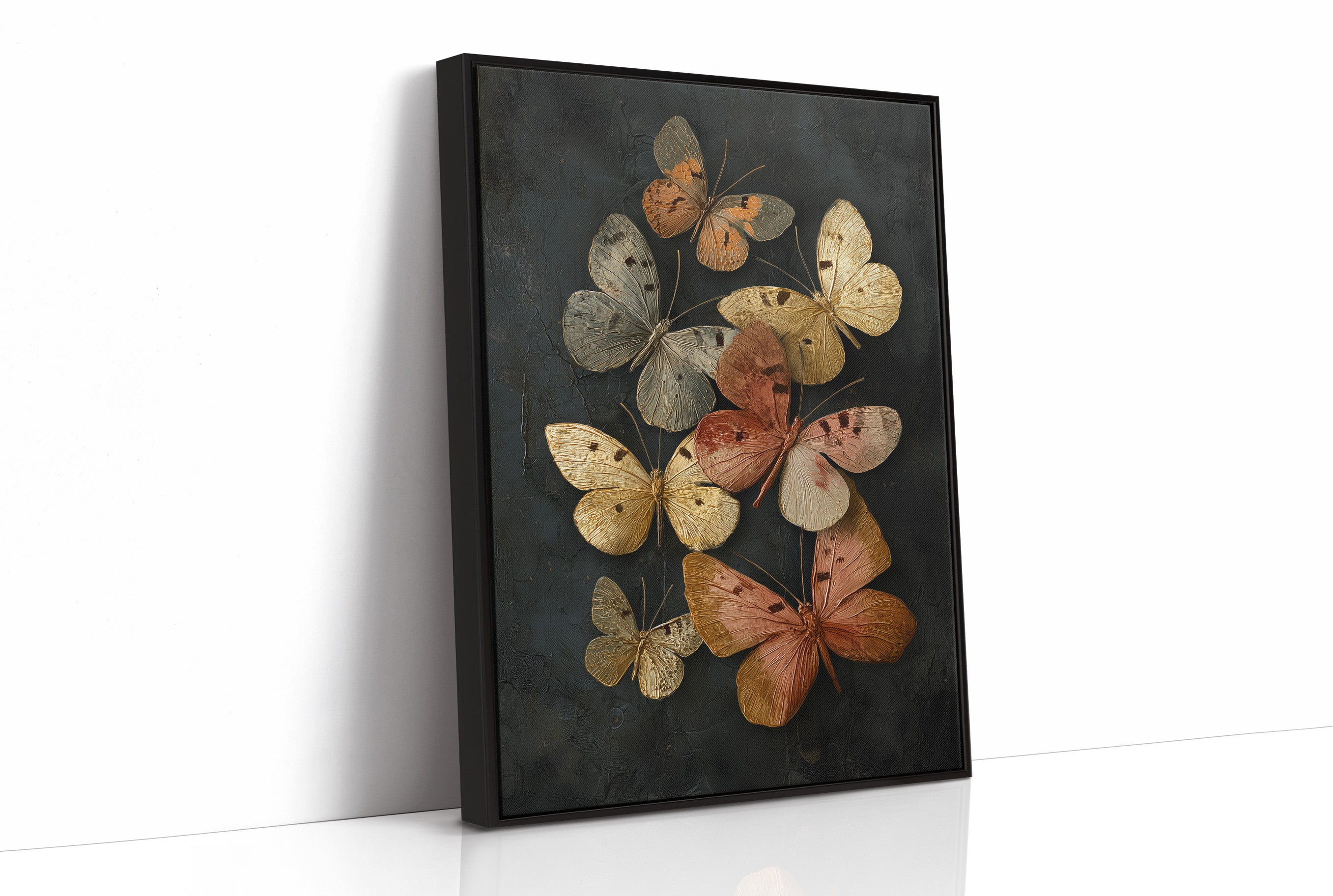 Delicate butterflies hover in suspended animation, their amber and cream wings catching invisible light against darkness. The rich copper tones and weathered textures create a haunting elegance, as if these fragile creatures have been preserved in time like precious memories. Set against a moody charcoal background, the composition balances natural beauty with dramatic contrast. This piece commands attention in spaces that celebrate quiet luxury a statement in a minimalist dining room or as a focal point in a study where contemplative beauty is appreciated.