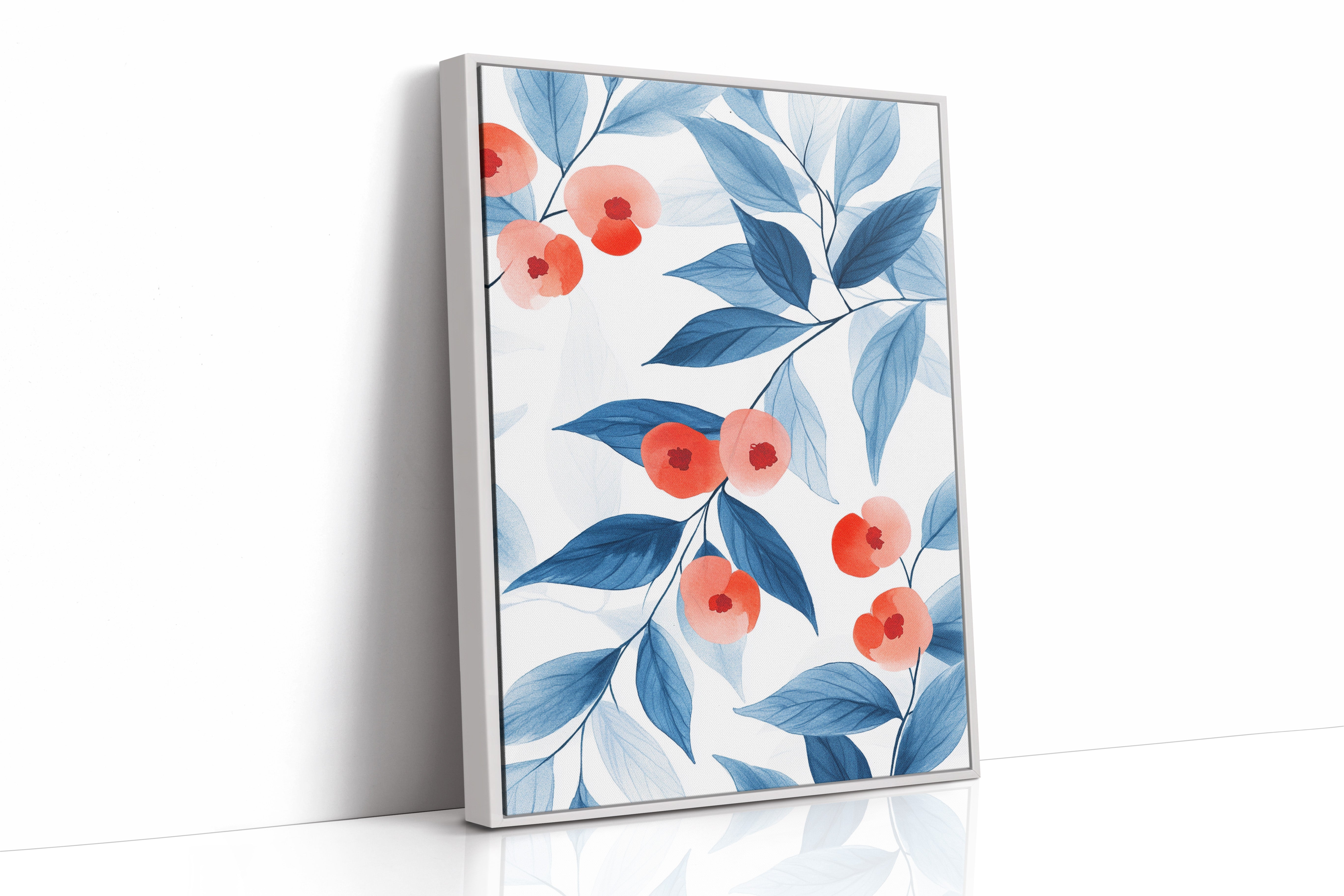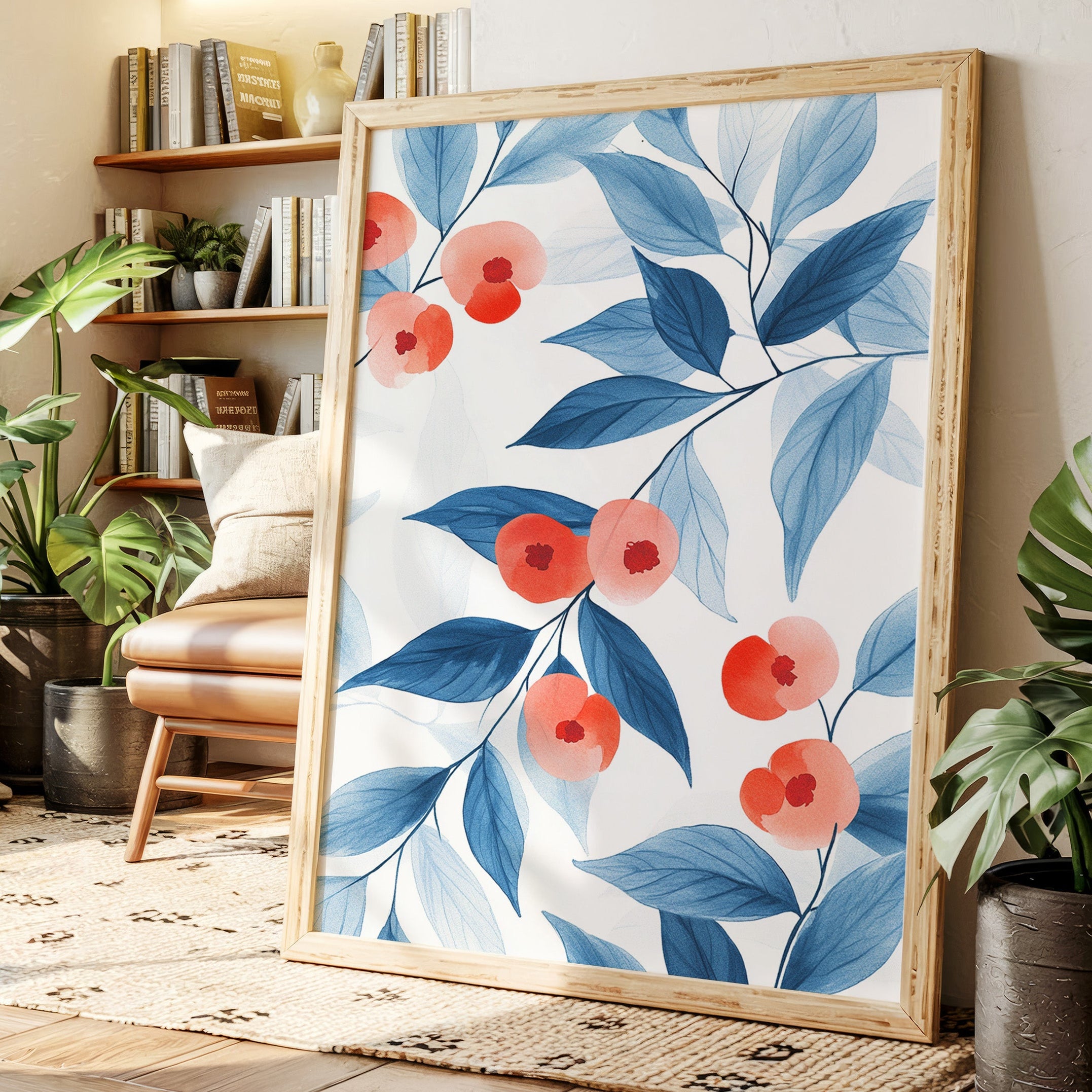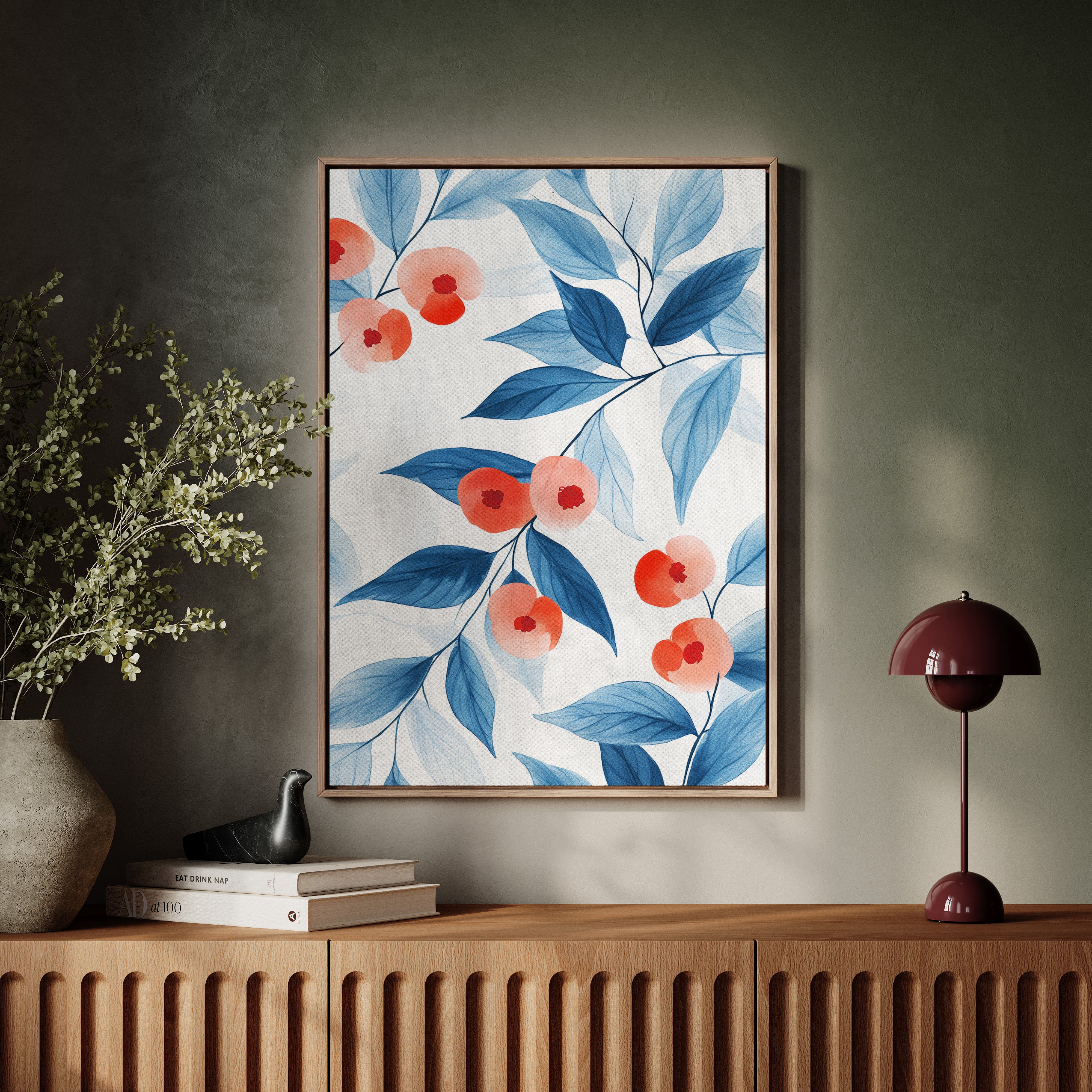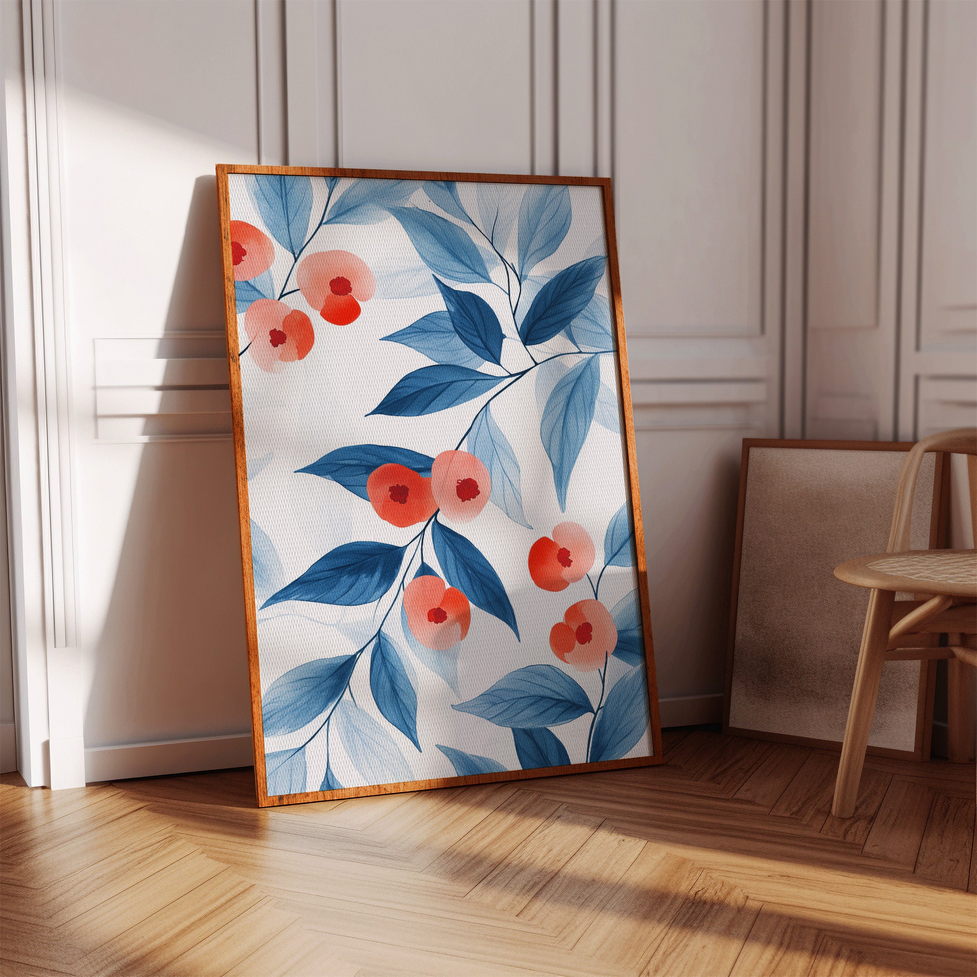 Delicate coral berries float like paper lanterns against a pristine white backdrop, their translucent forms catching imaginary light. Indigo and powder blue leaves dance across the composition, creating a mesmerizing rhythm of cool and warm tones. The watercolor technique brings an ethereal quality to each element, with colors bleeding softly into one another like morning dew dispersing across petals. This piece would bring a sophisticated yet playful energy to a modern dining room or create a serene focal point in a contemporary home office.