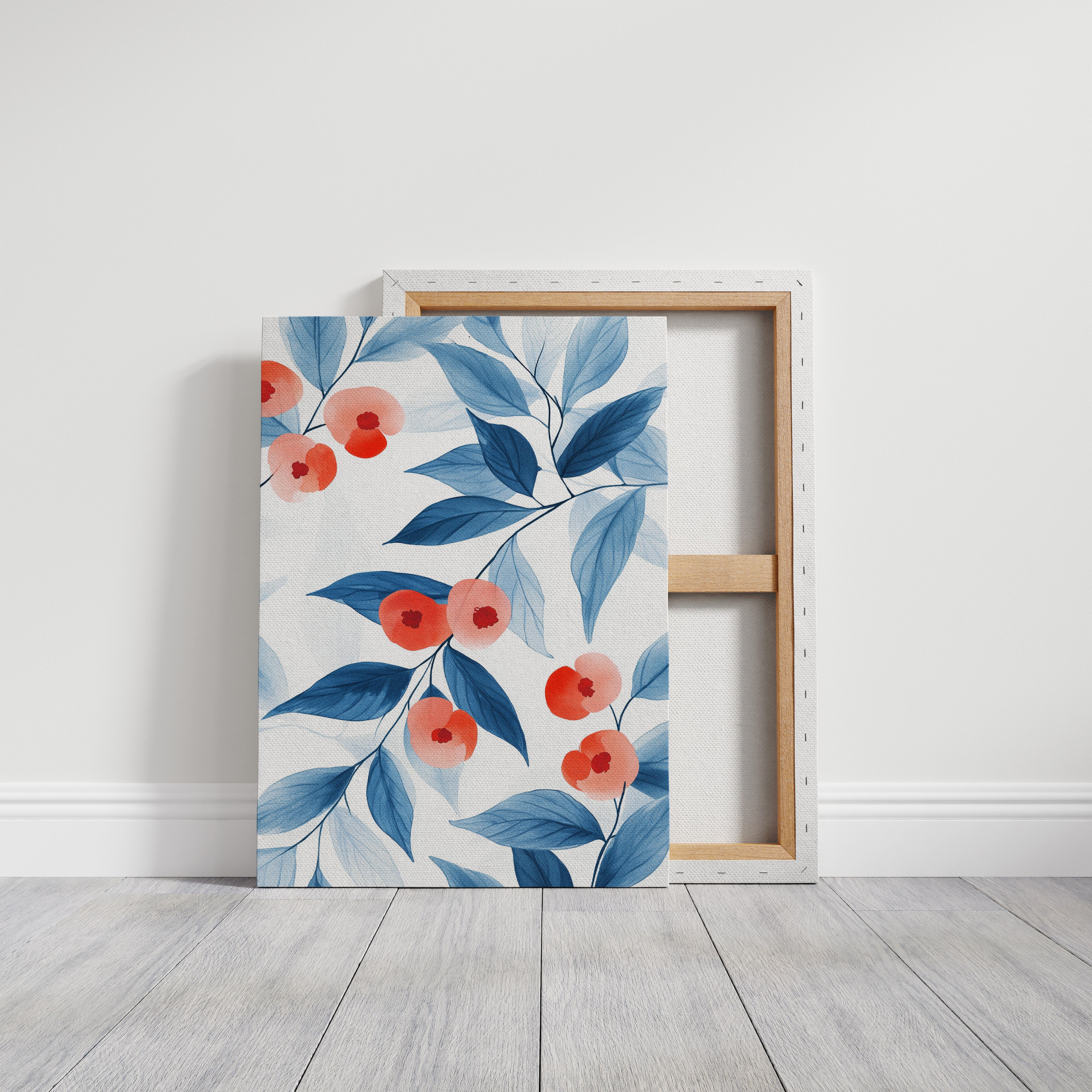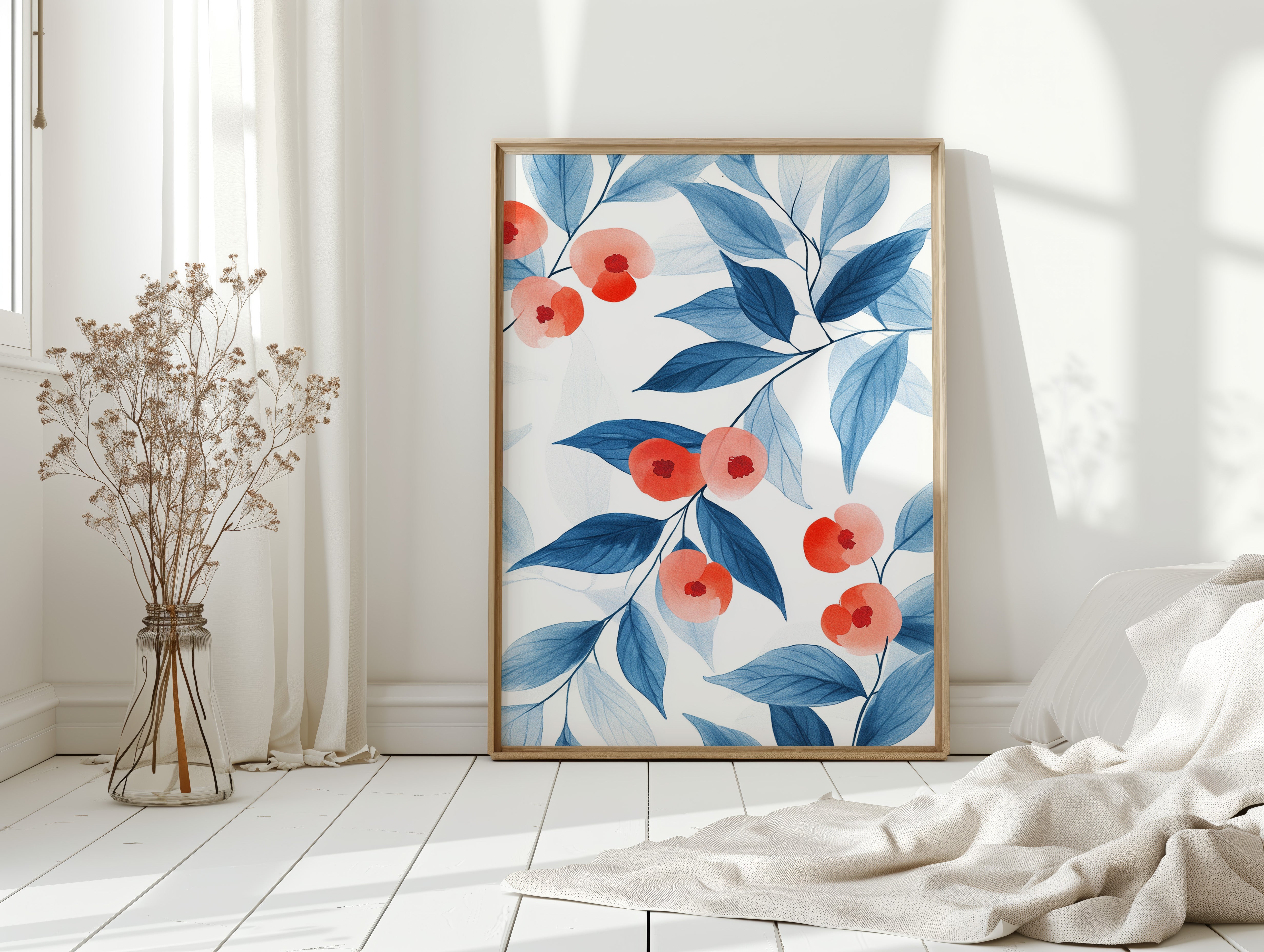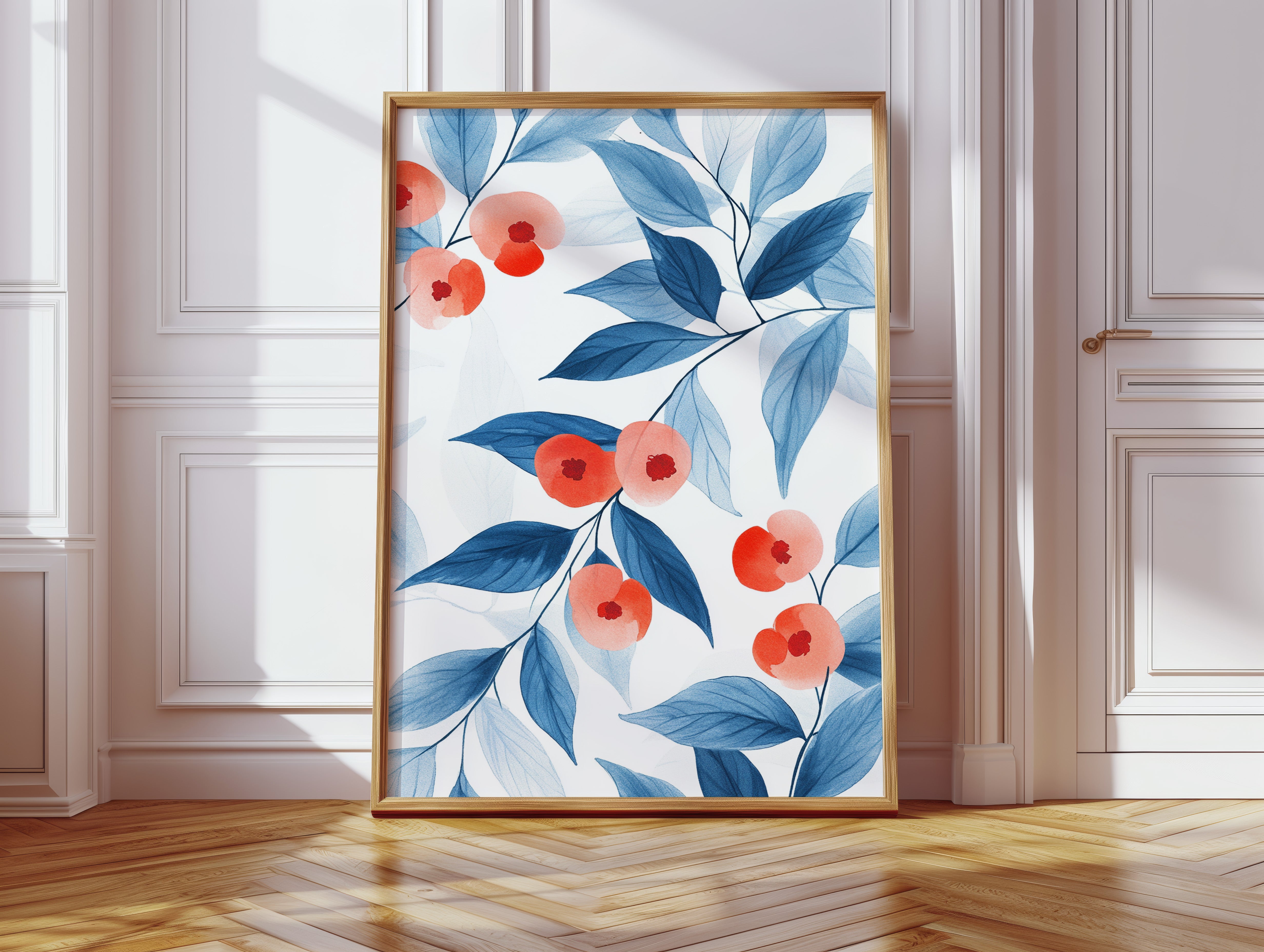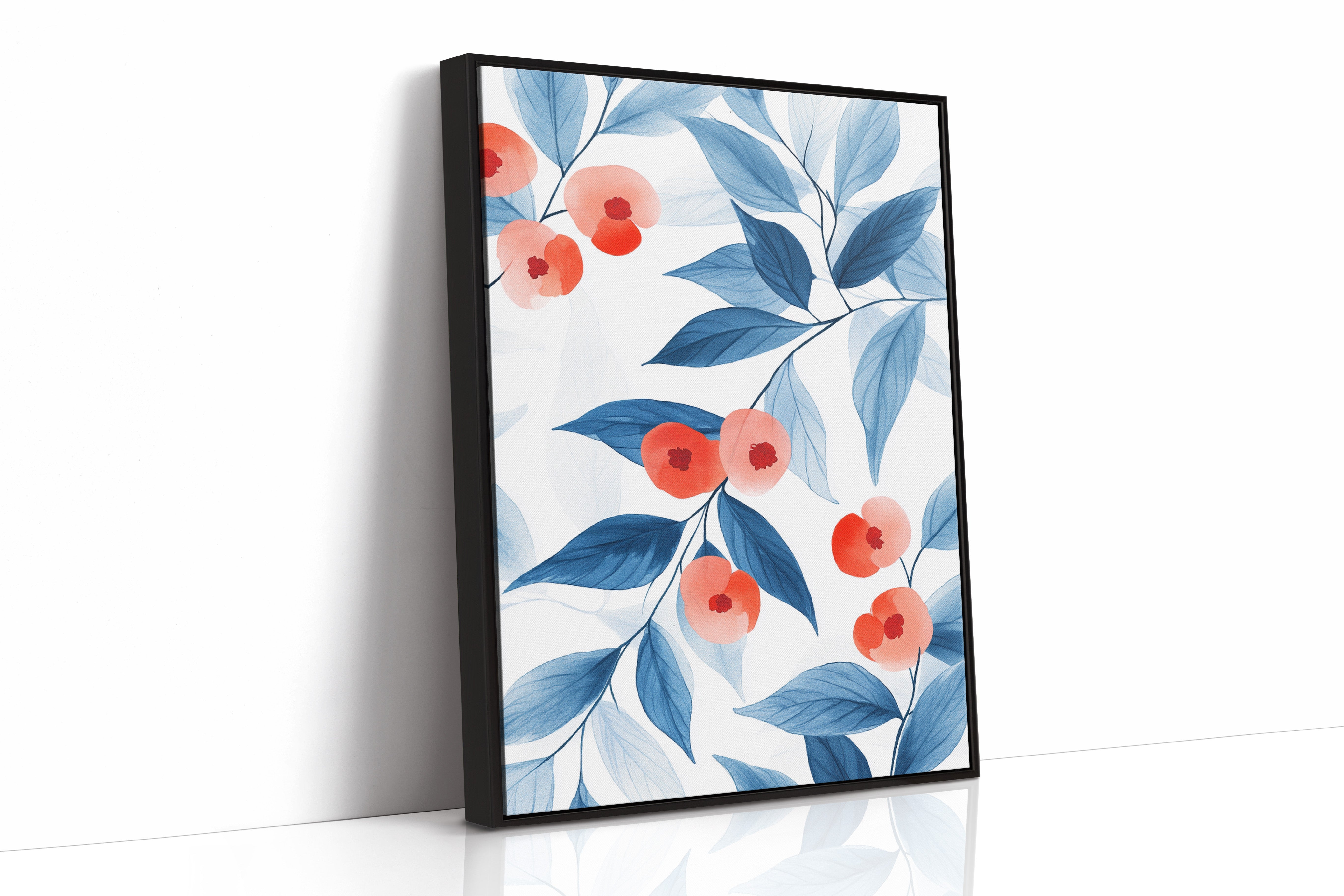 Delicate coral berries float like paper lanterns against a pristine white backdrop, their translucent forms catching imaginary light. Indigo and powder blue leaves dance across the composition, creating a mesmerizing rhythm of cool and warm tones. The watercolor technique brings an ethereal quality to each element, with colors bleeding softly into one another like morning dew dispersing across petals. This piece would bring a sophisticated yet playful energy to a modern dining room or create a serene focal point in a contemporary home office.