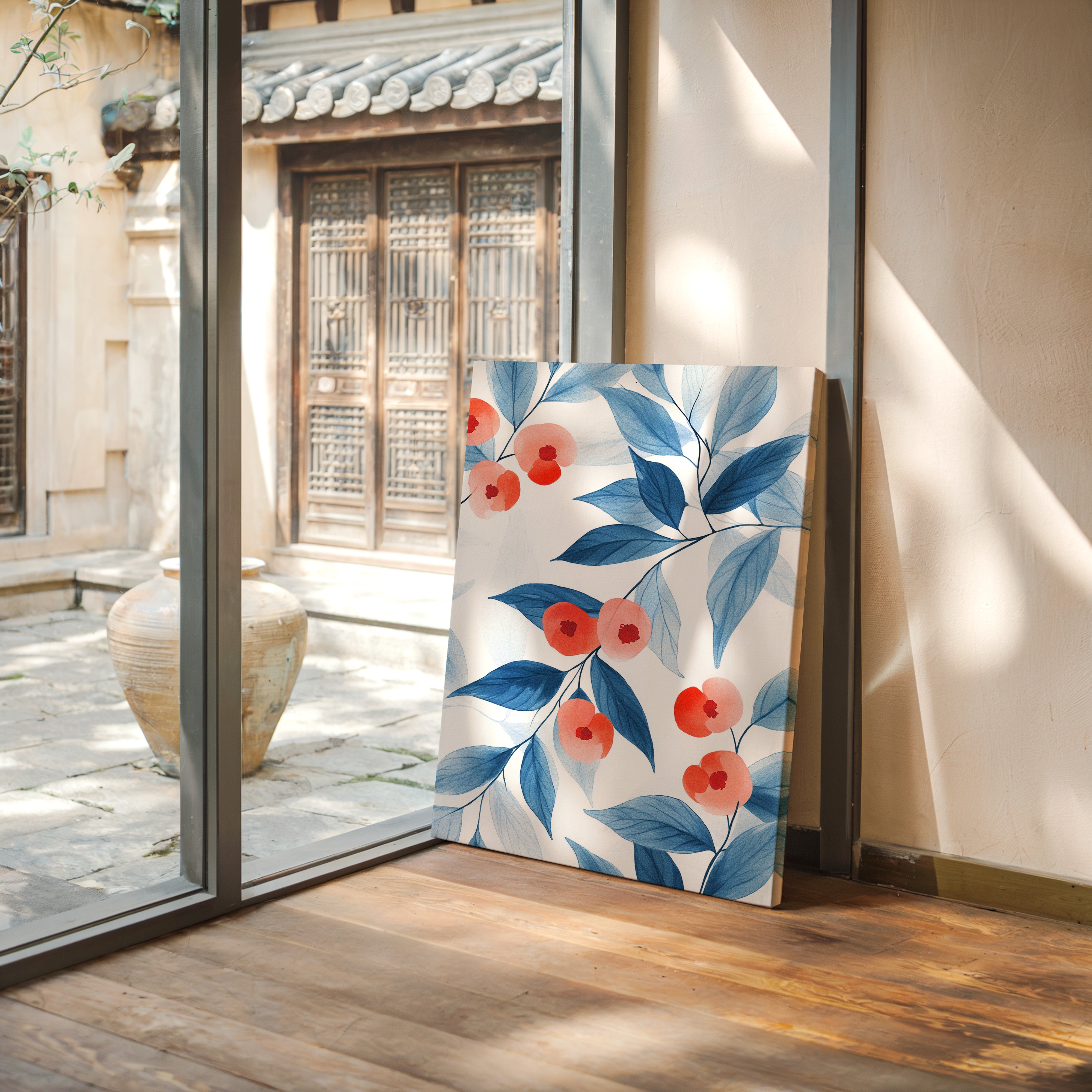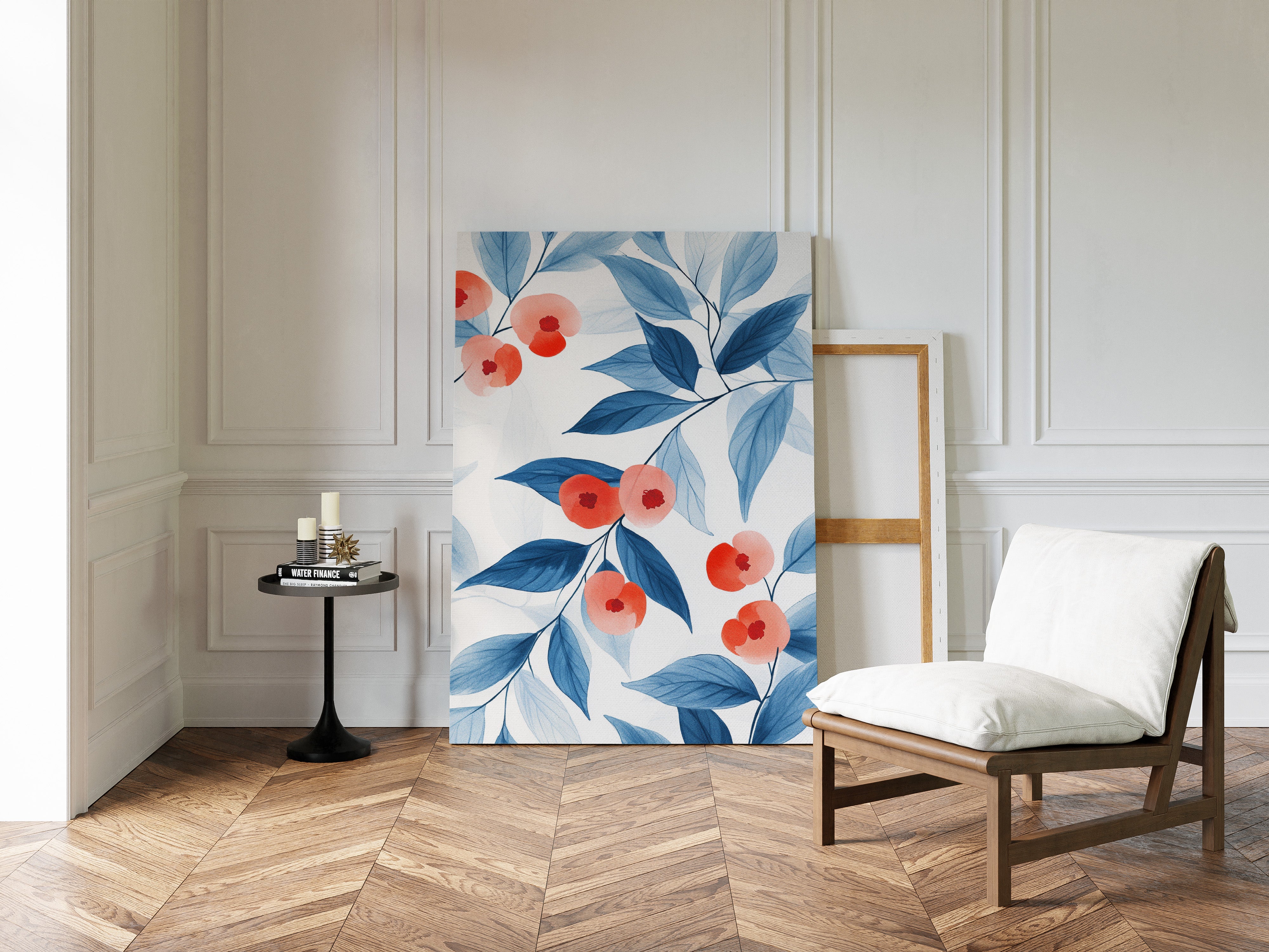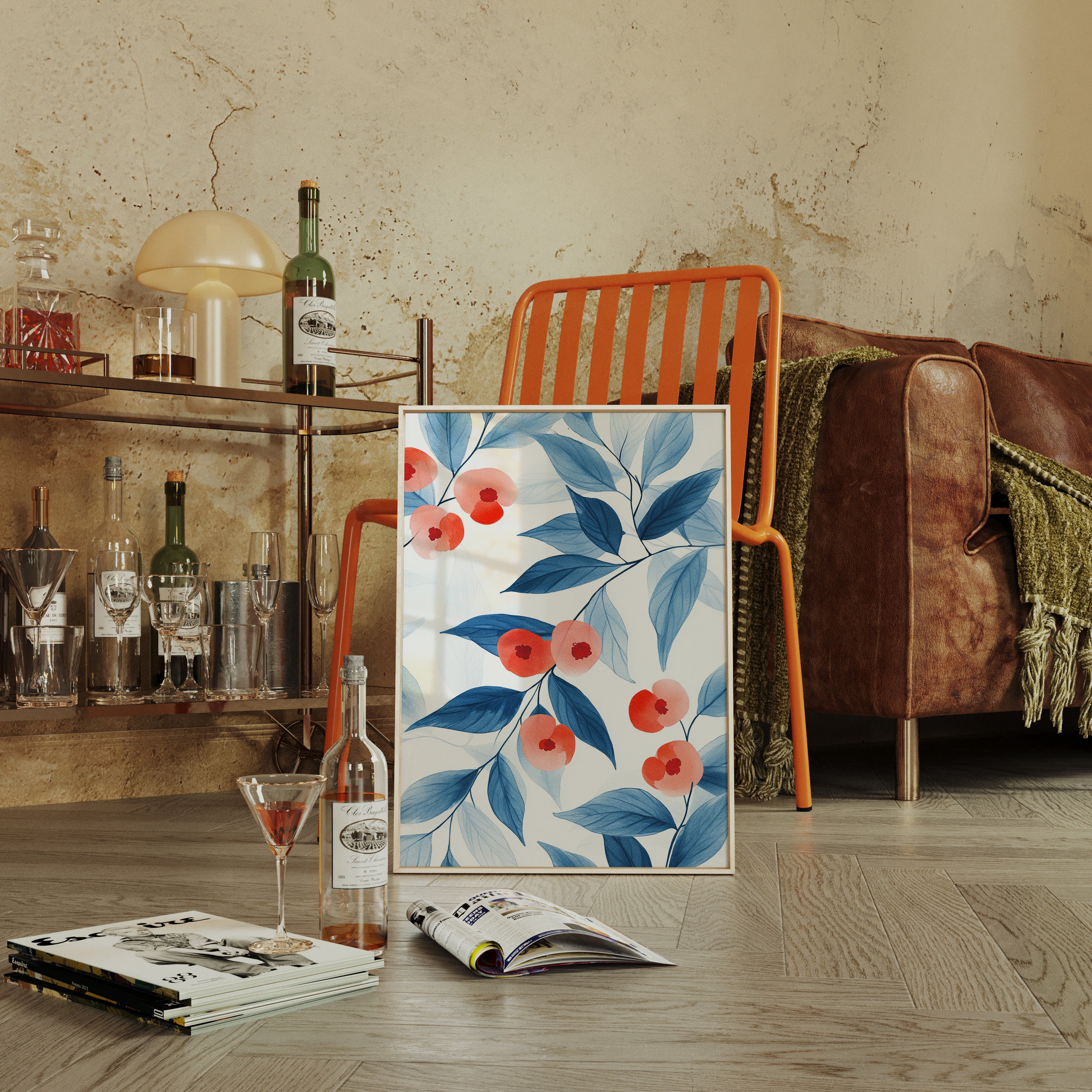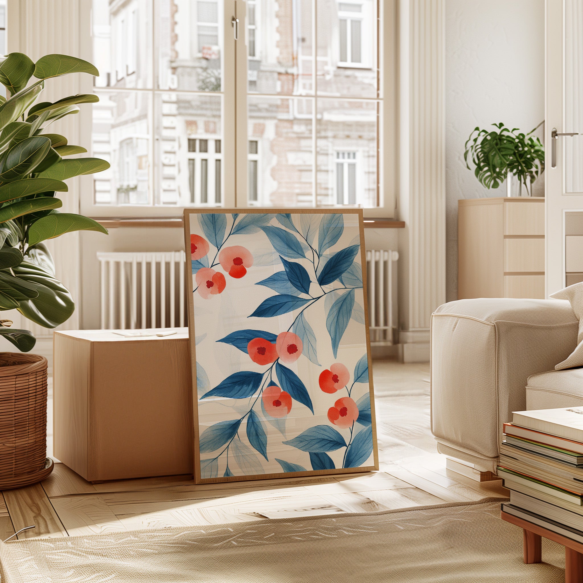 Delicate coral berries float like paper lanterns against a pristine white backdrop, their translucent forms catching imaginary light. Indigo and powder blue leaves dance across the composition, creating a mesmerizing rhythm of cool and warm tones. The watercolor technique brings an ethereal quality to each element, with colors bleeding softly into one another like morning dew dispersing across petals. This piece would bring a sophisticated yet playful energy to a modern dining room or create a serene focal point in a contemporary home office.
