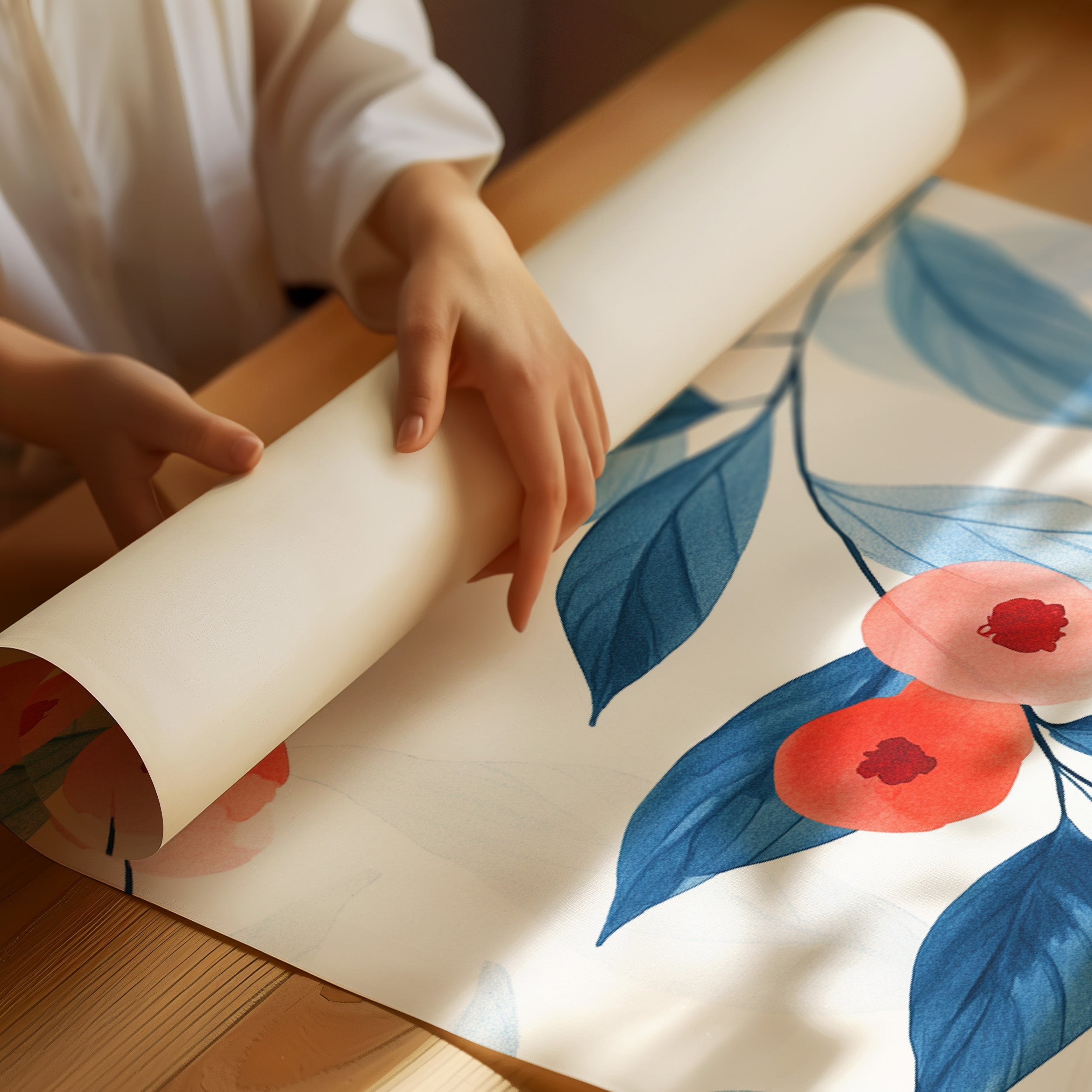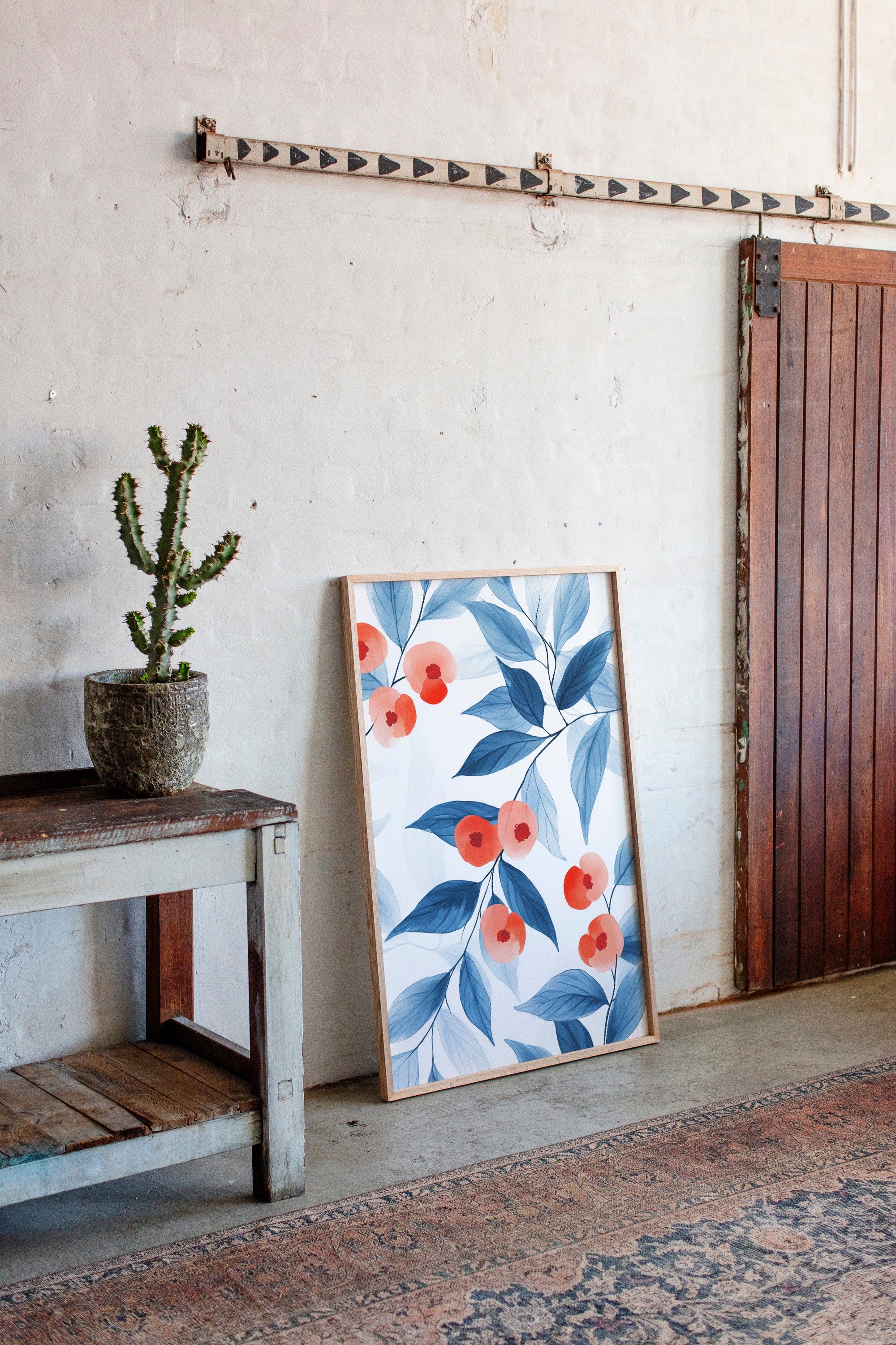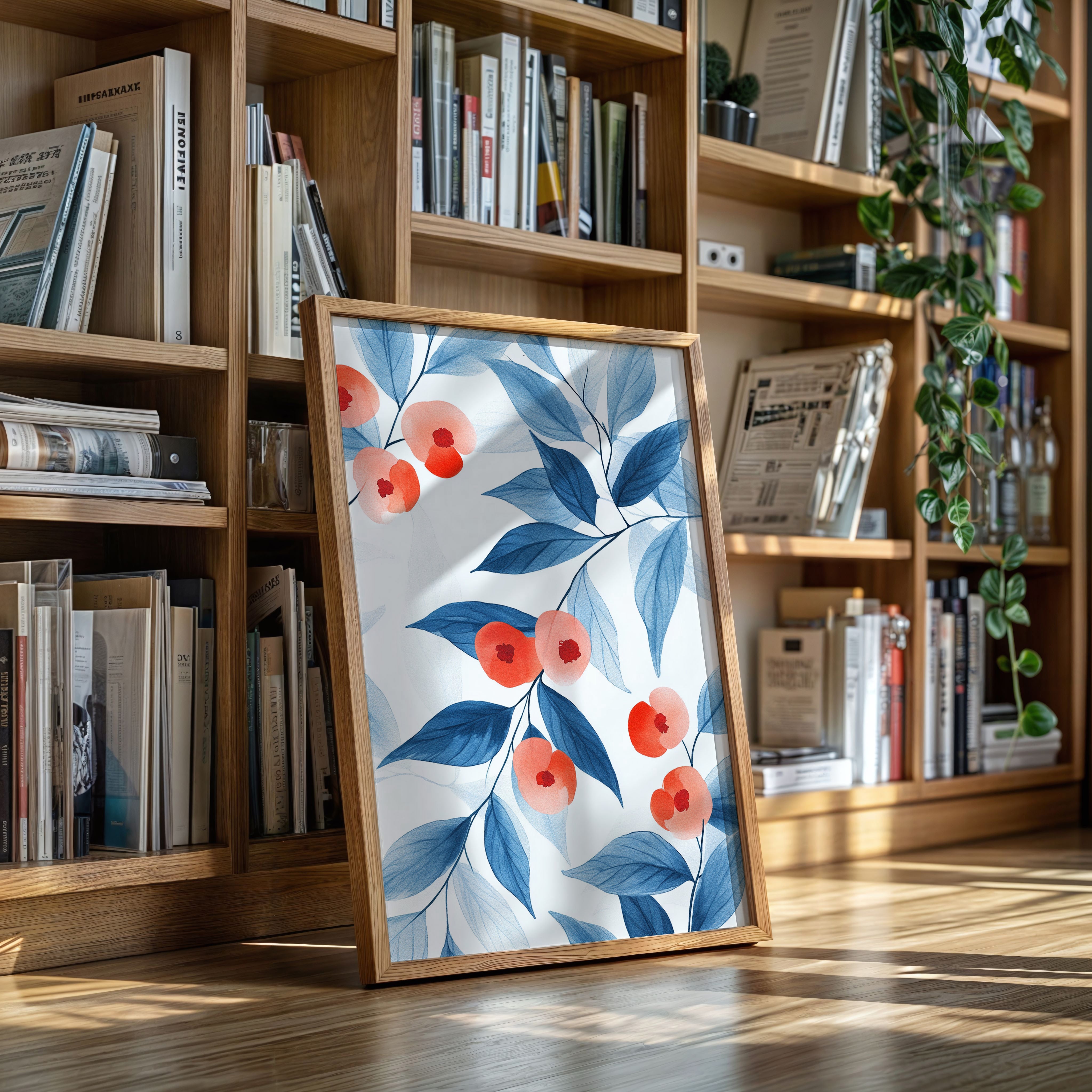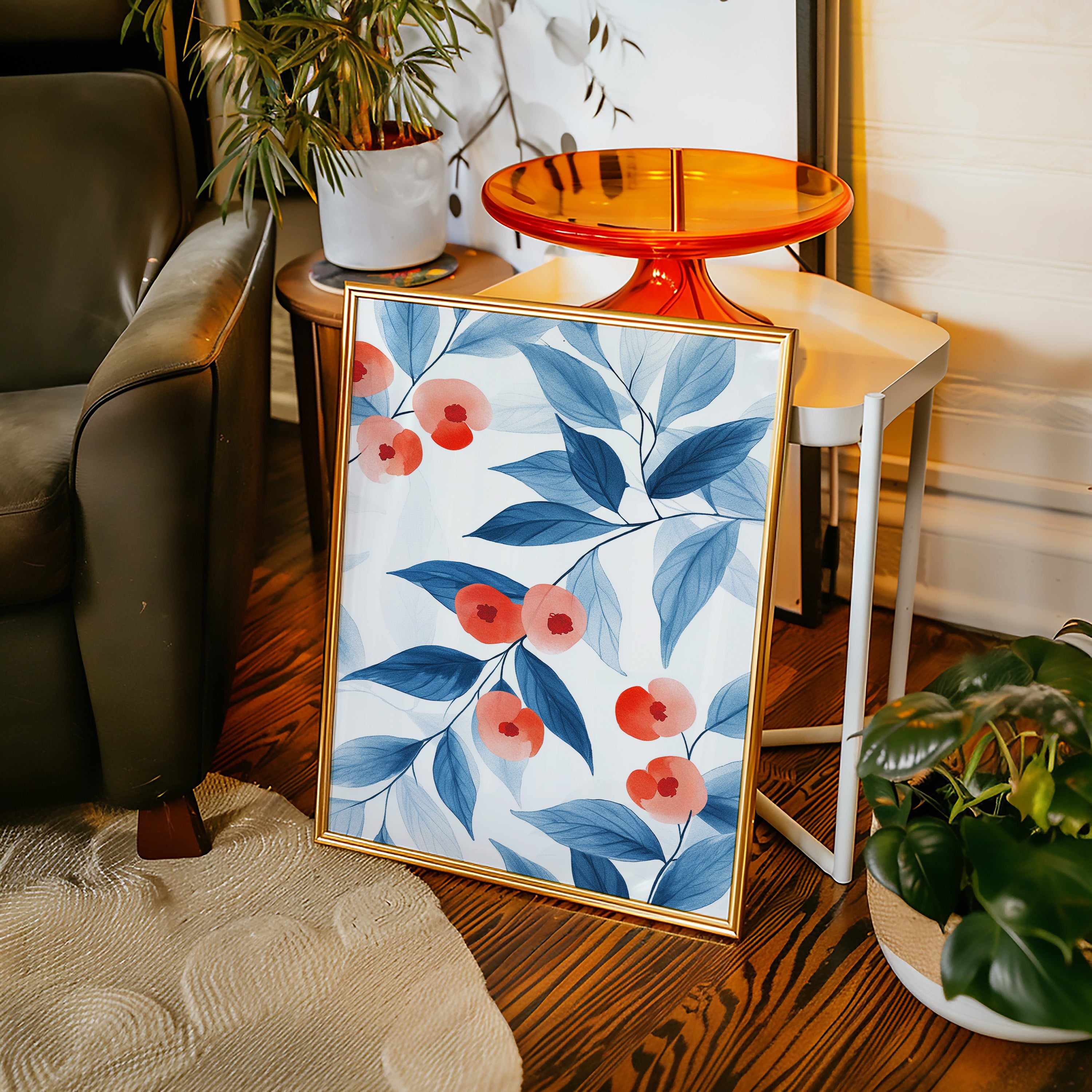 Delicate coral berries float like paper lanterns against a pristine white backdrop, their translucent forms catching imaginary light. Indigo and powder blue leaves dance across the composition, creating a mesmerizing rhythm of cool and warm tones. The watercolor technique brings an ethereal quality to each element, with colors bleeding softly into one another like morning dew dispersing across petals. This piece would bring a sophisticated yet playful energy to a modern dining room or create a serene focal point in a contemporary home office.