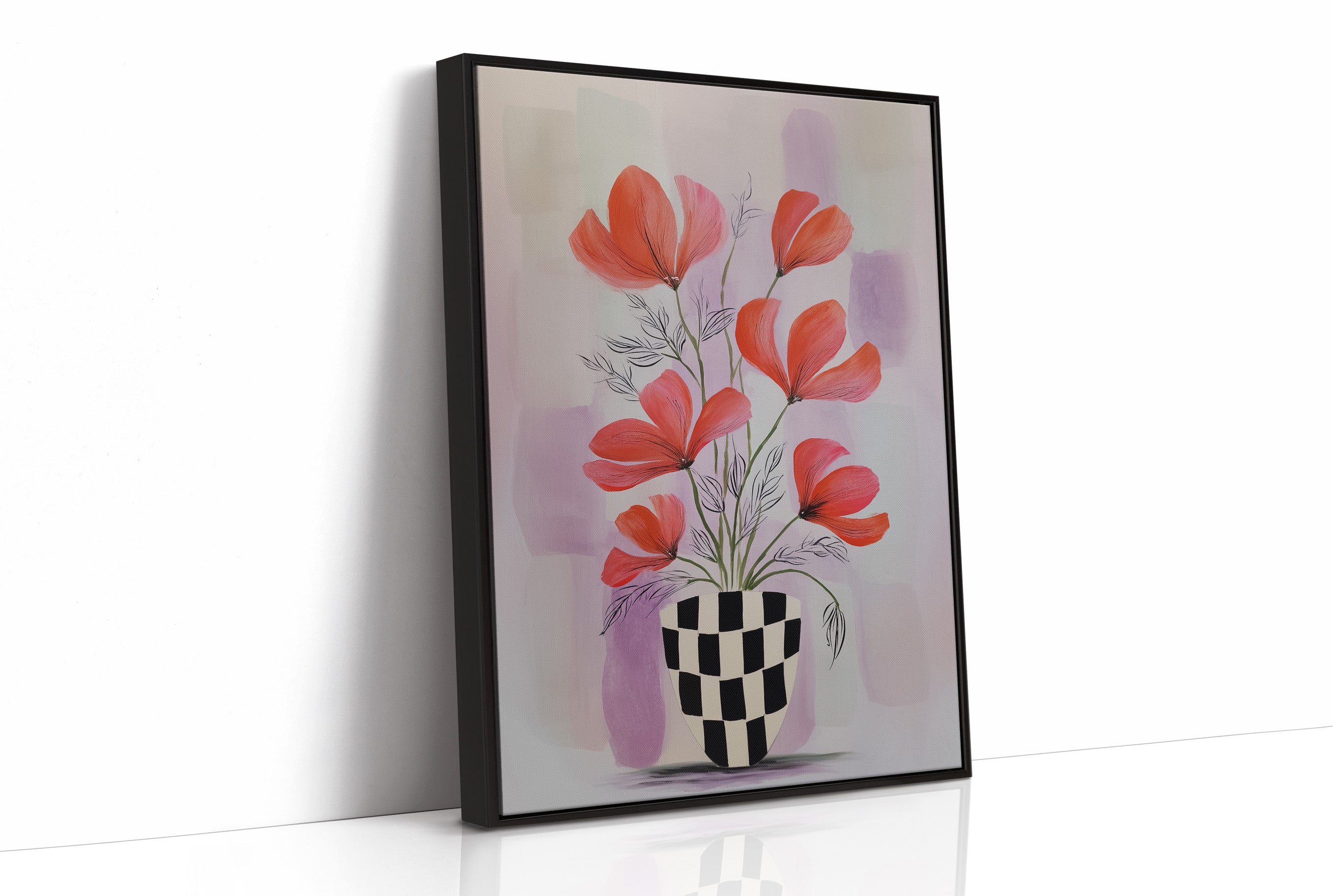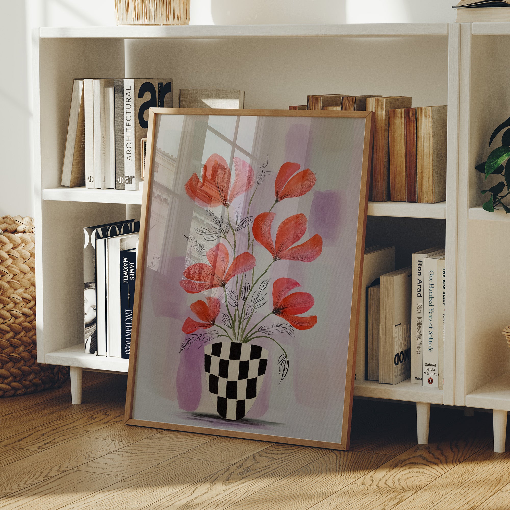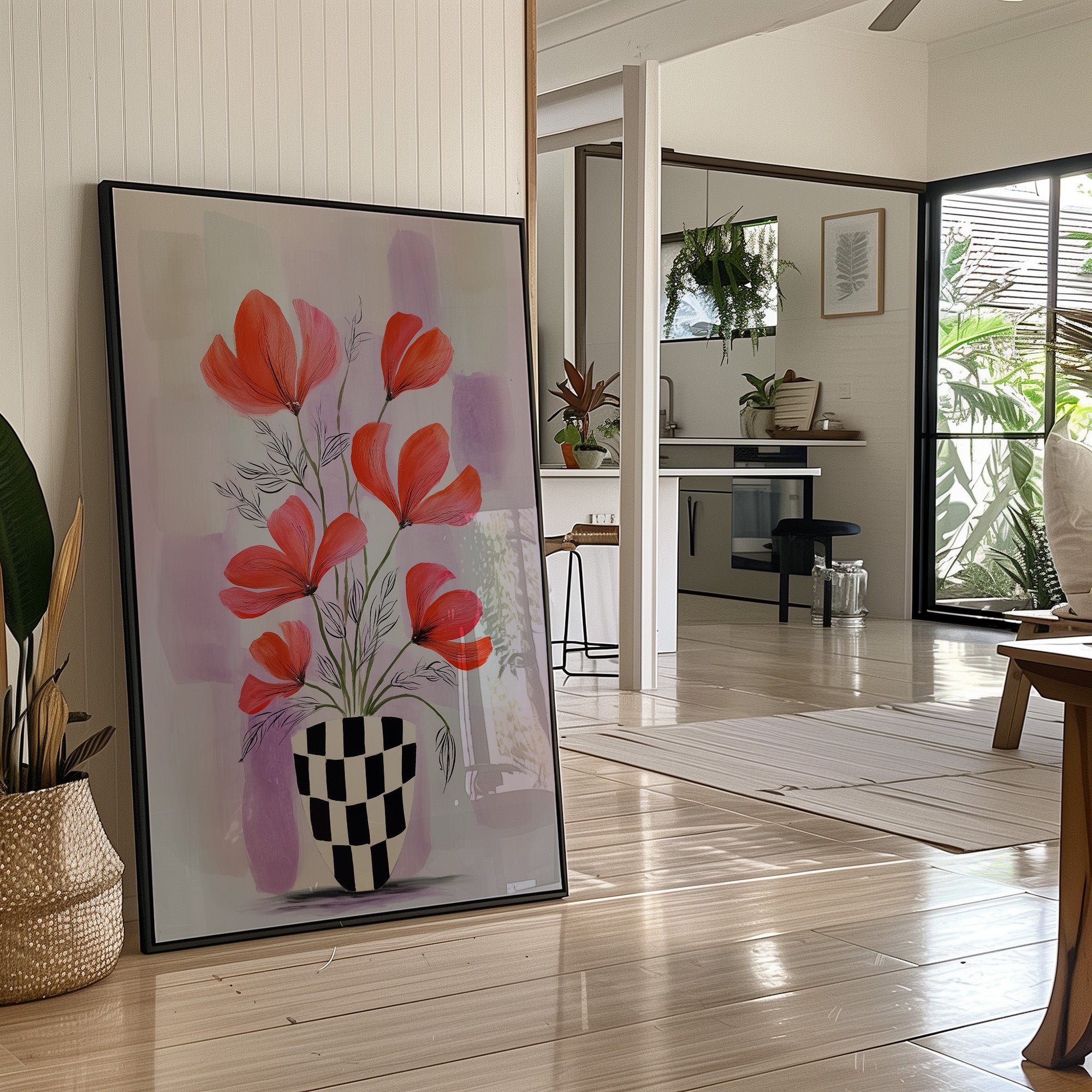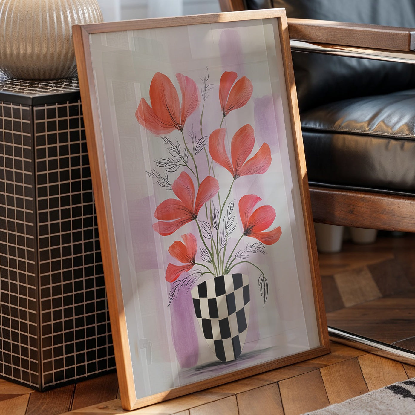 Sunlight streams through industrial windows, casting warm shadows across a sophisticated home bar setup. A striking modern botanical print commands attention, featuring vibrant coral-colored flowers dancing above a bold checkered vase against soft lavender hues. The composition creates an elegant dialogue between the curated collection of spirits below and the artistic expression above, perfectly balancing urban refinement with natural beauty. This thoughtfully arranged corner marries industrial elements with organic touches - from the exposed brick and black-framed windows to the carefully placed houseplants and statement art piece. The rich wooden floors and metal bar cart add warmth and structure to the space. This piece would elevate a dining room, home bar, or sophisticated living space where contemporary style meets classic hospitality.