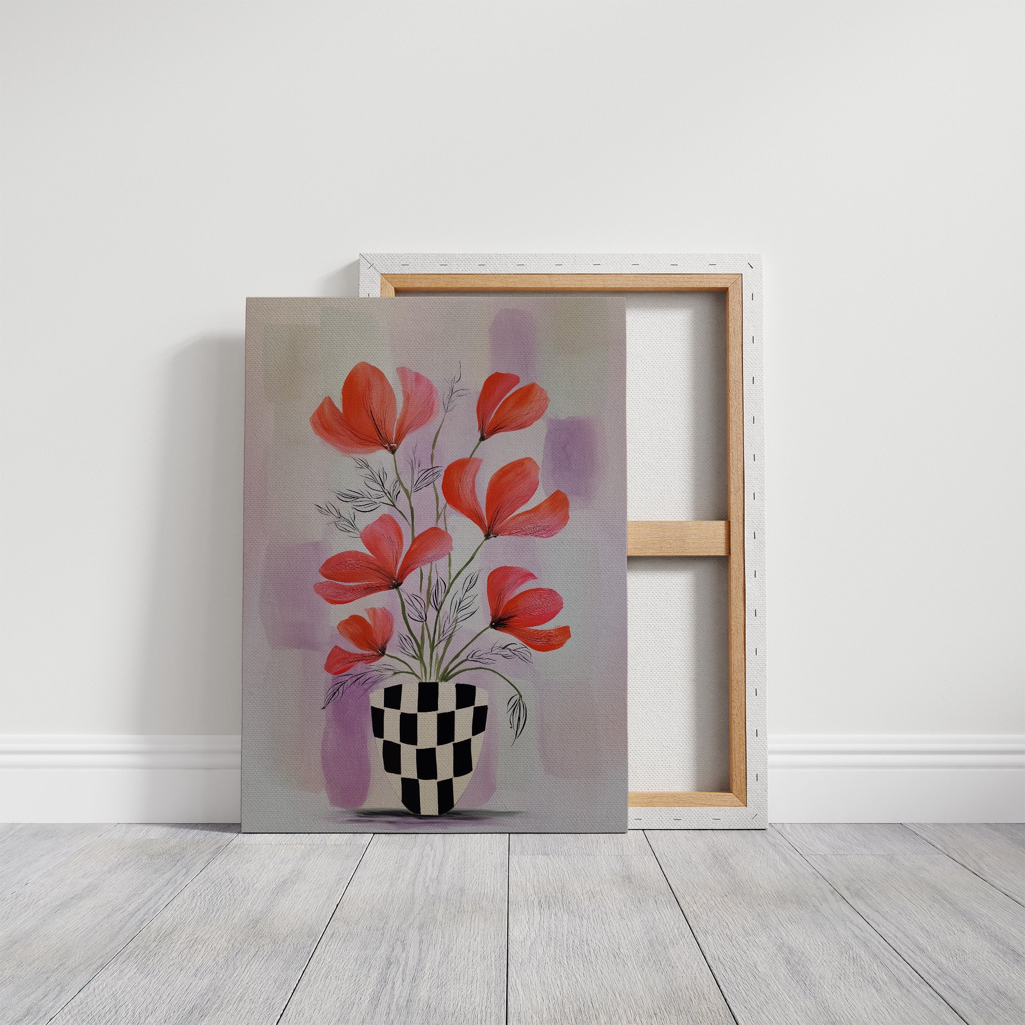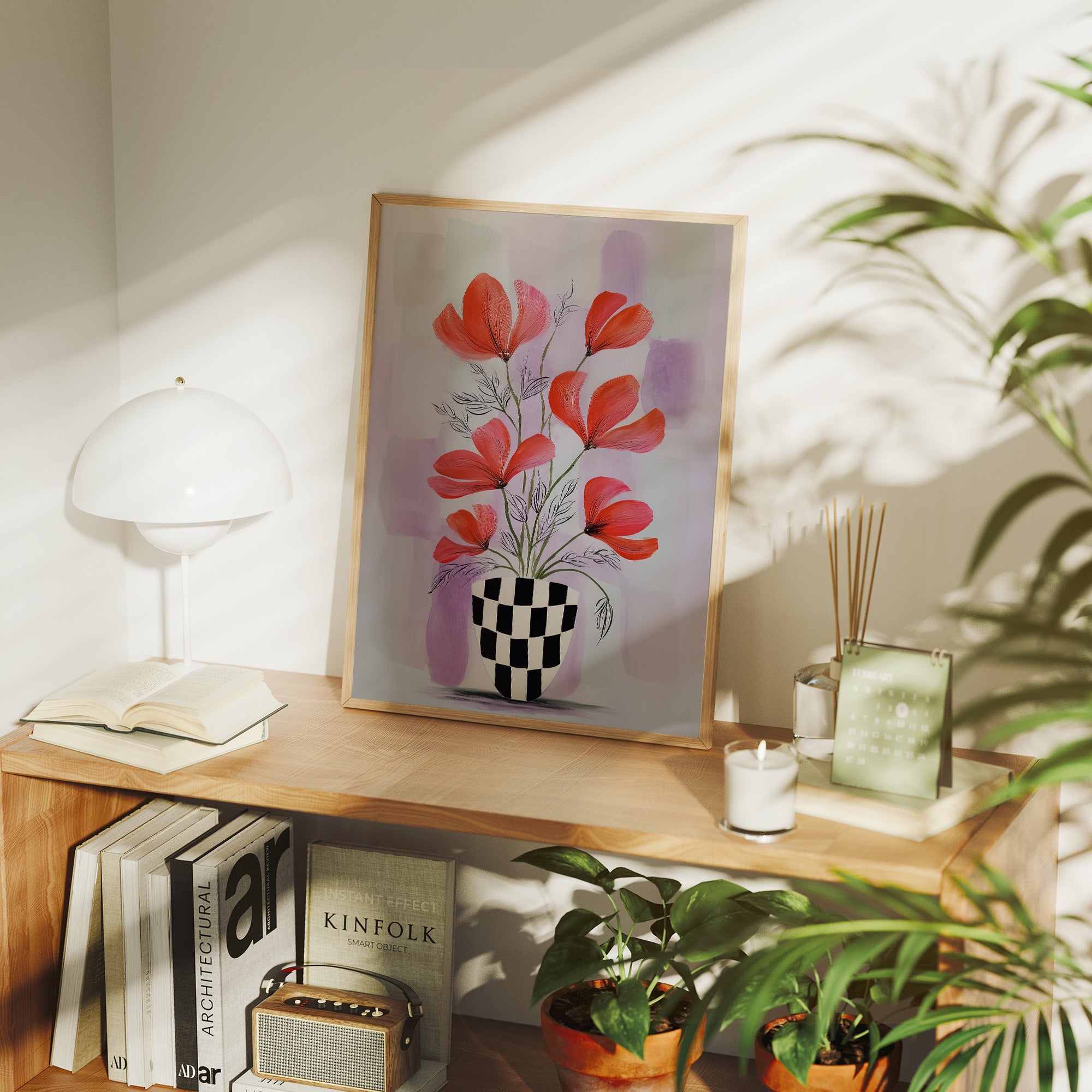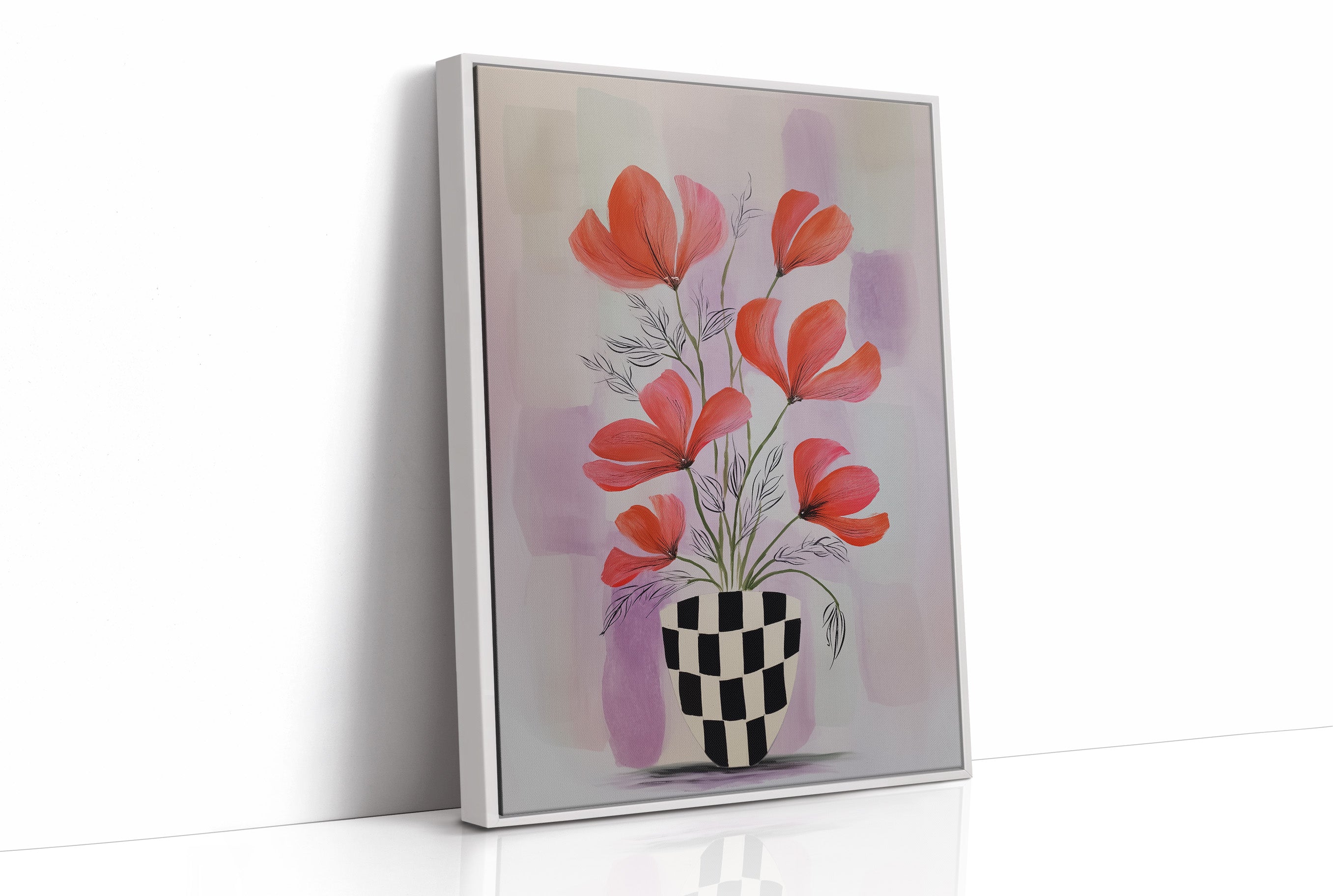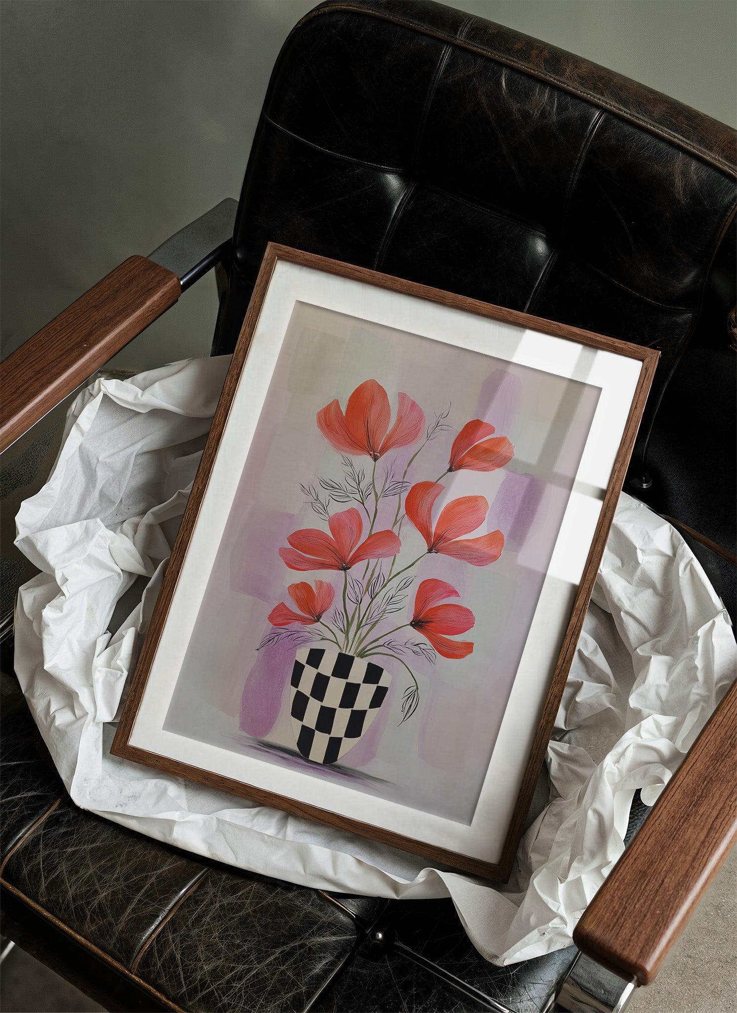 Sunlight streams through industrial windows, casting warm shadows across a sophisticated home bar setup. A striking modern botanical print commands attention, featuring vibrant coral-colored flowers dancing above a bold checkered vase against soft lavender hues. The composition creates an elegant dialogue between the curated collection of spirits below and the artistic expression above, perfectly balancing urban refinement with natural beauty. This thoughtfully arranged corner marries industrial elements with organic touches - from the exposed brick and black-framed windows to the carefully placed houseplants and statement art piece. The rich wooden floors and metal bar cart add warmth and structure to the space. This piece would elevate a dining room, home bar, or sophisticated living space where contemporary style meets classic hospitality.