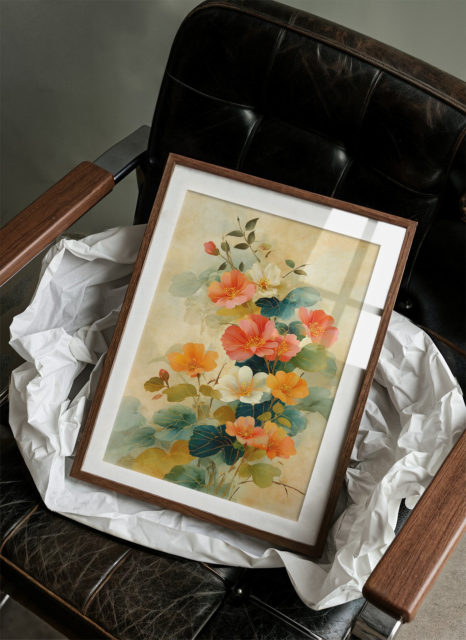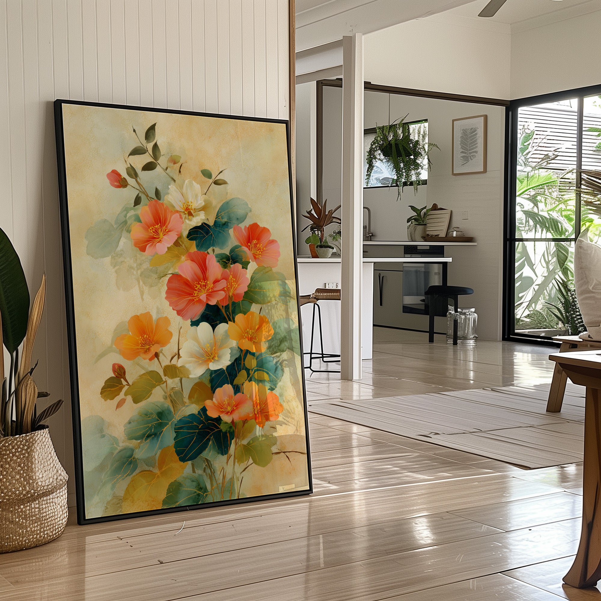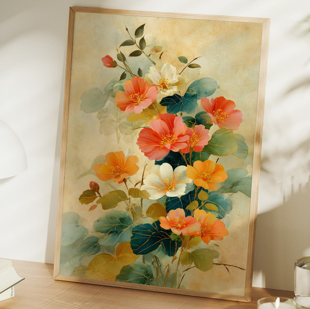 Delicate watercolor petals dance against a warm cream backdrop, their coral and peach tones catching the gentle light. The composition flows with an elegant spontaneity, jade-green leaves providing a cool counterpoint to the vibrant tropical blooms. This vintage-inspired botanical piece brings together the classical and contemporary, where traditional florals meet modern artistic interpretation. Perfect for creating a sophisticated focal point in a reading nook, home office, or anywhere you want to add a touch of refined natural beauty.