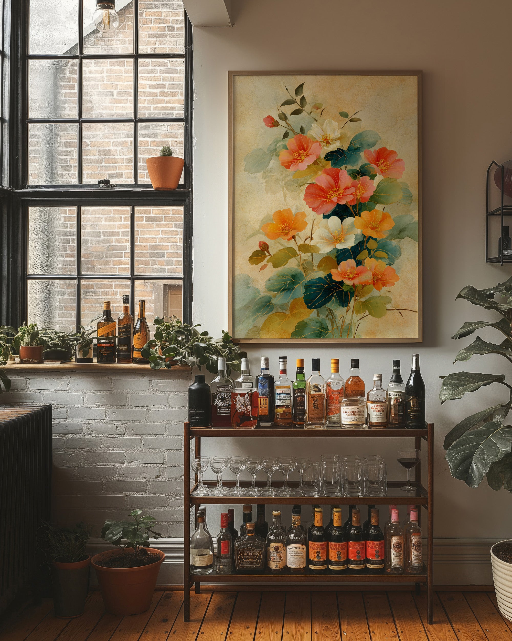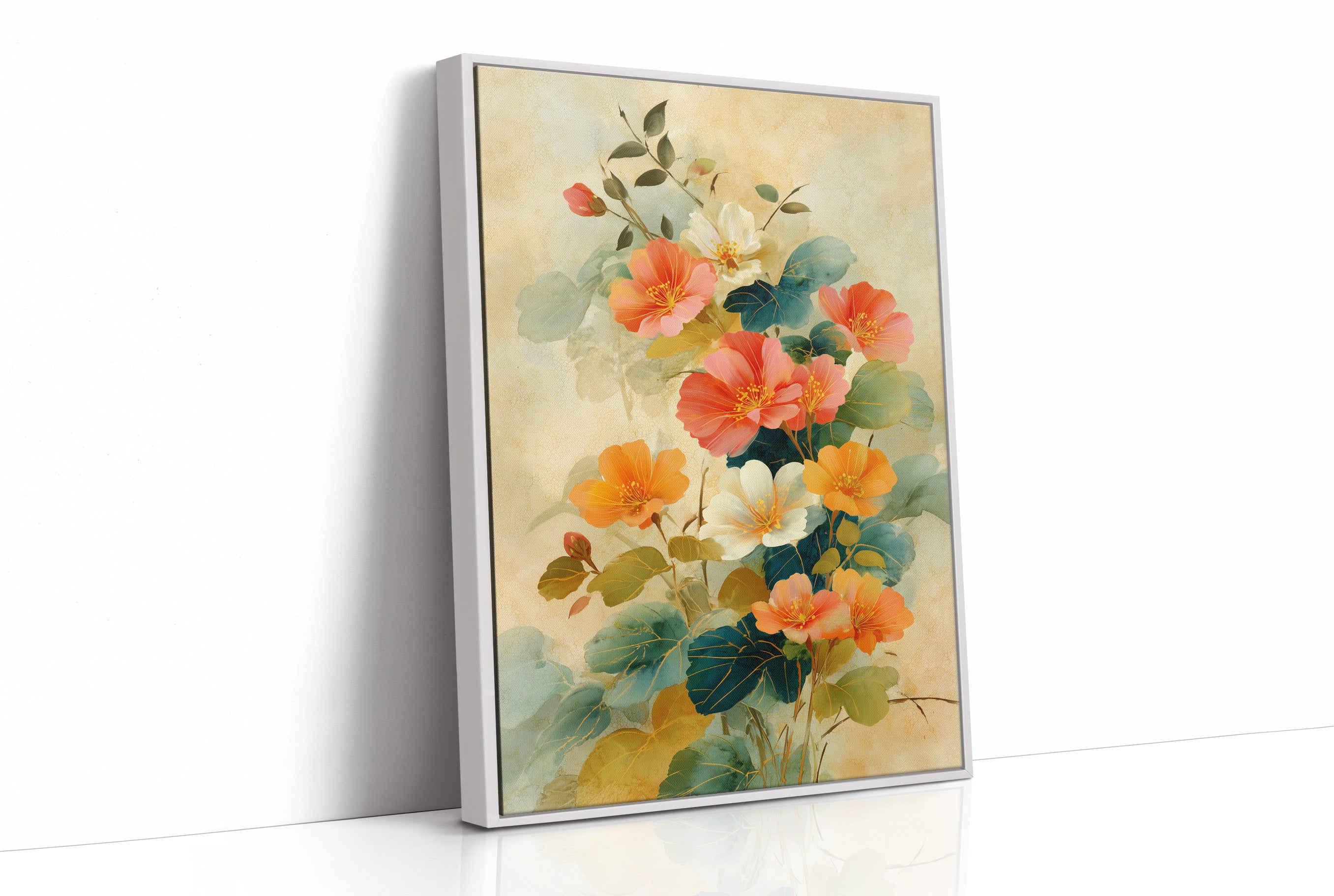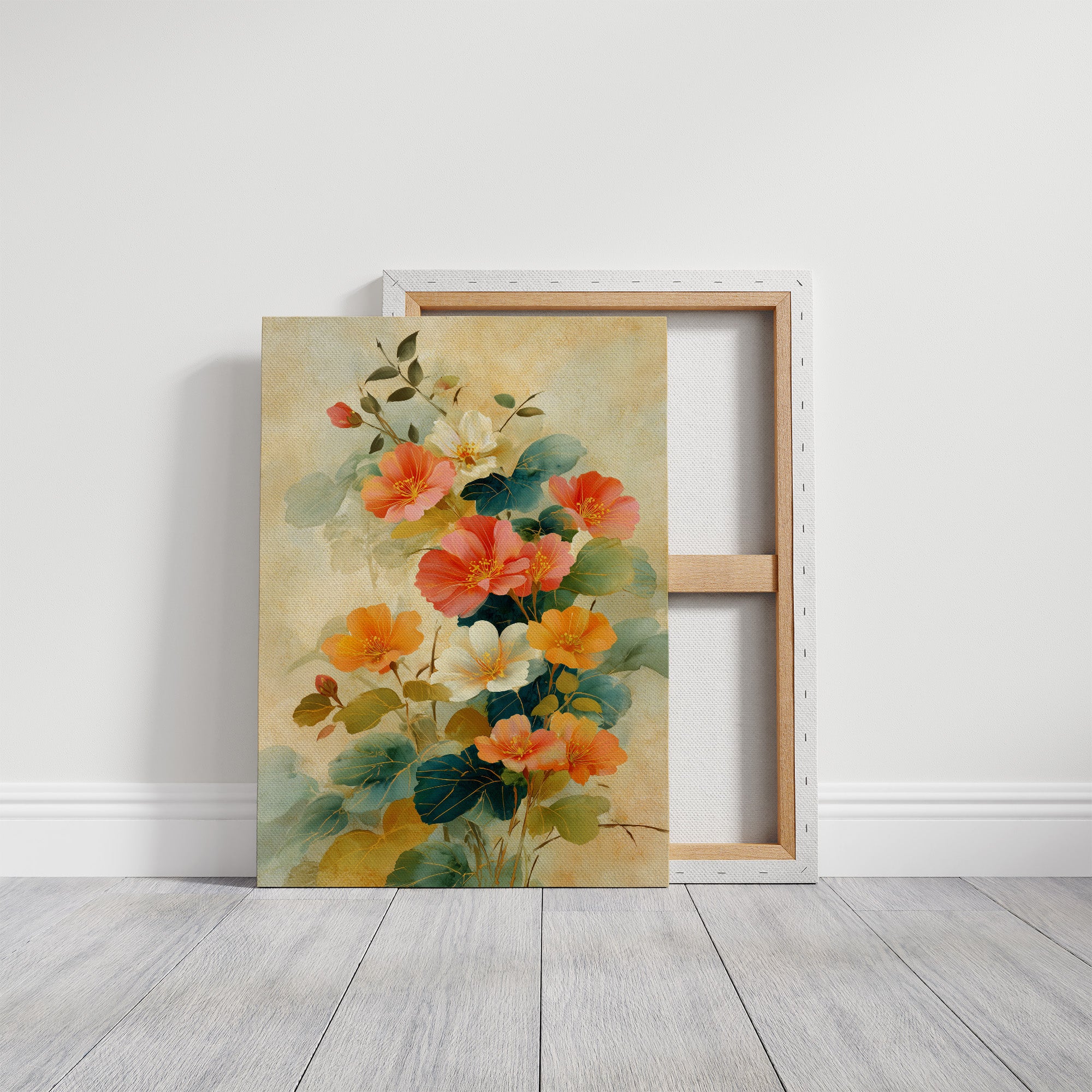 Delicate watercolor petals dance against a warm cream backdrop, their coral and peach tones catching the gentle light. The composition flows with an elegant spontaneity, jade-green leaves providing a cool counterpoint to the vibrant tropical blooms. This vintage-inspired botanical piece brings together the classical and contemporary, where traditional florals meet modern artistic interpretation. Perfect for creating a sophisticated focal point in a reading nook, home office, or anywhere you want to add a touch of refined natural beauty.