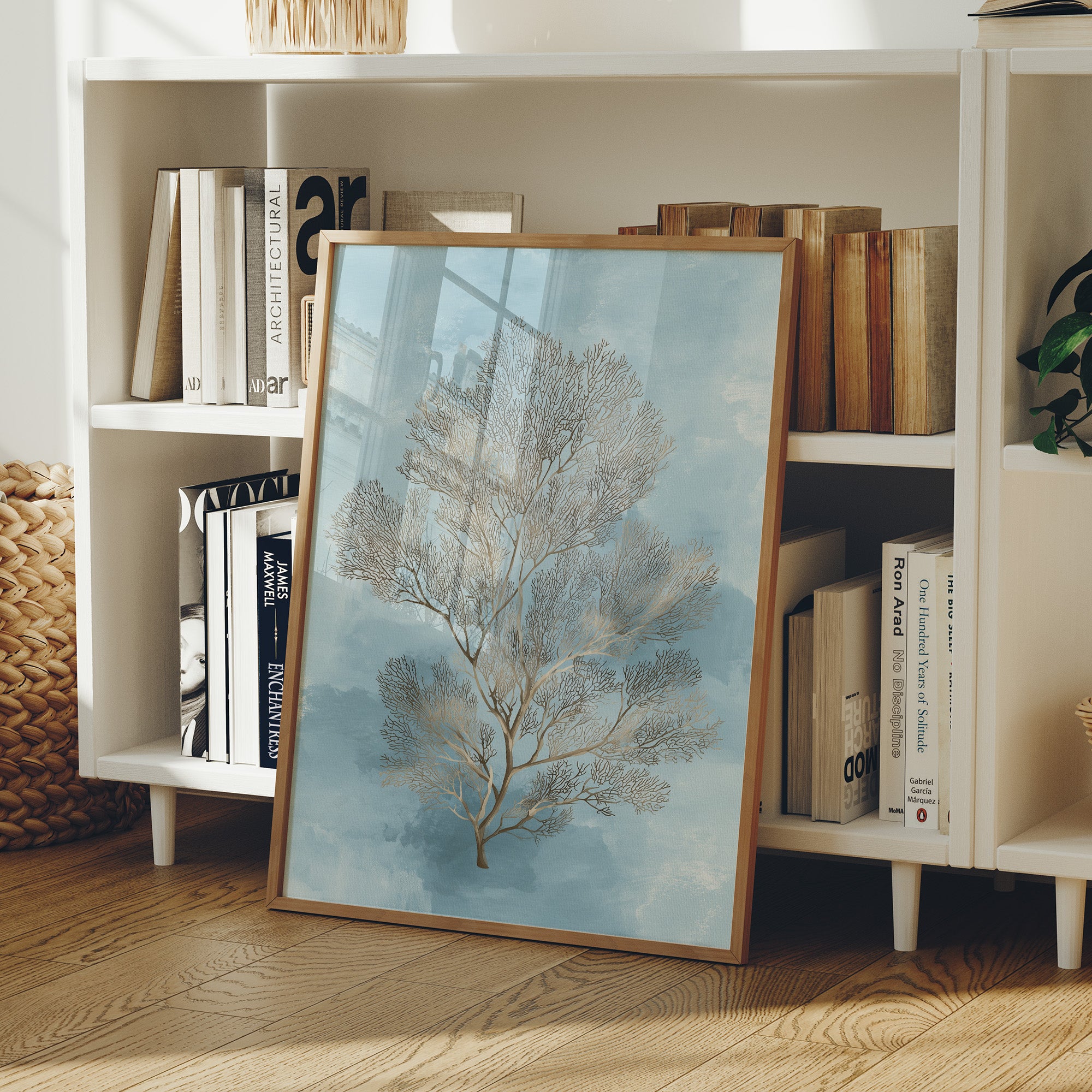 Morning light catches the delicate silhouette of sea fan coral, preserved in time against a serene azure backdrop. The intricate branching patterns create a natural geometry that speaks of ocean depths and distant shores, its golden-beige tendrils floating effortlessly against the soft blue wash. This elegant piece brings a subtle coastal narrative to a sophisticated living space, perfect for adding refined texture to a modern home office or creating a moment of calm in a reading nook.
