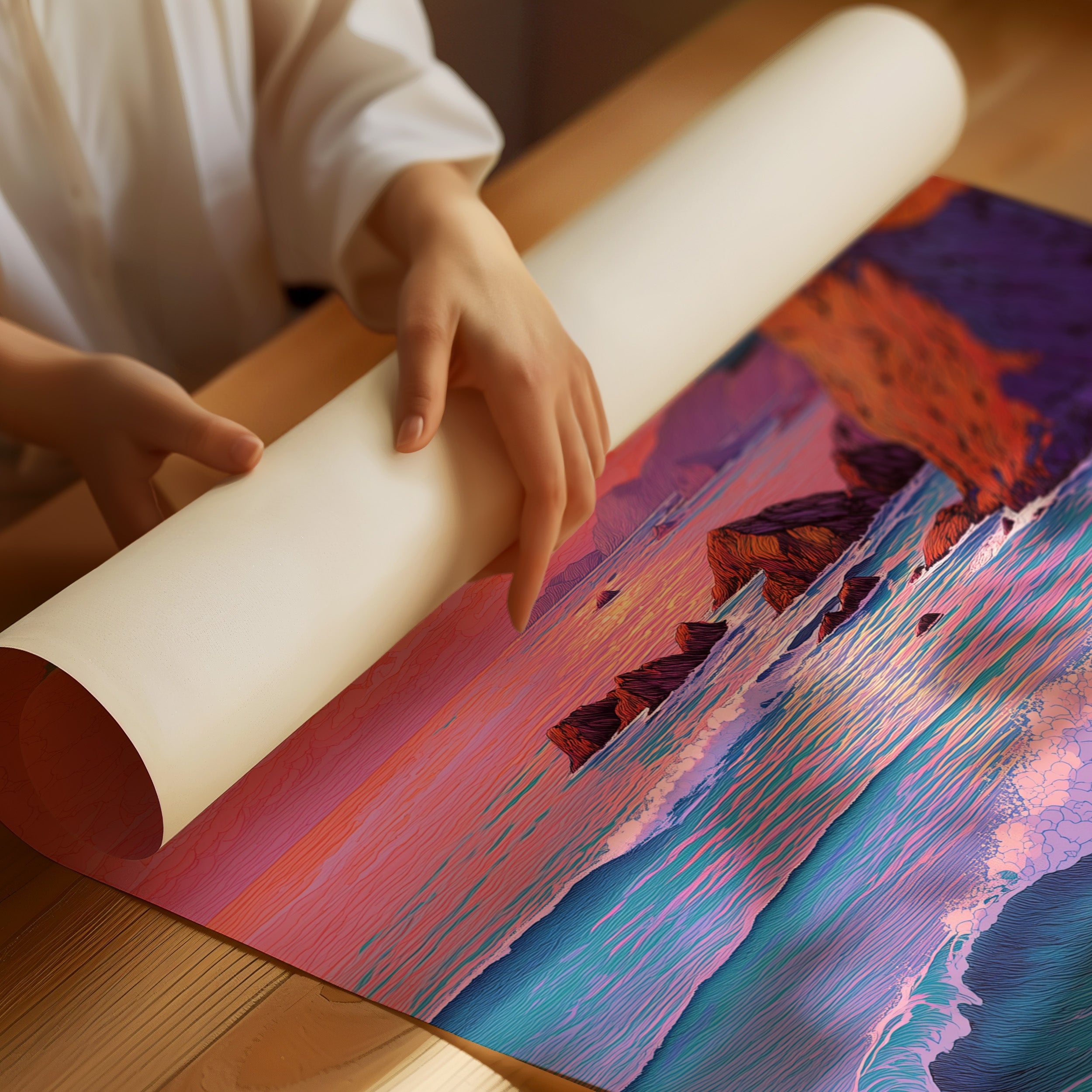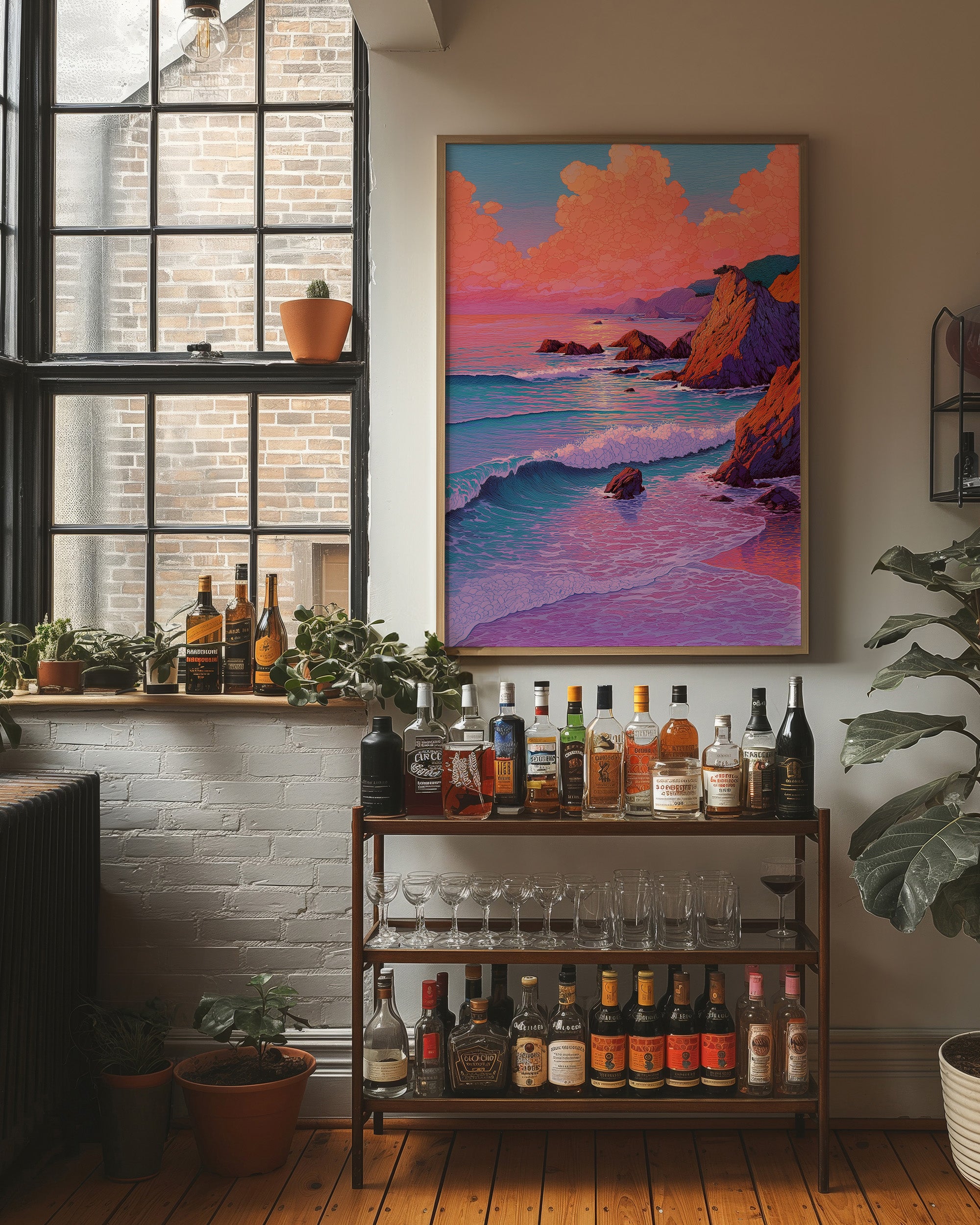 Sunlit waves crash against dramatic coastal cliffs, painting the scene in a mesmerizing palette of coral and violet hues. The rugged coastline stands proud against a sky ablaze with warm sunset colors, while turquoise waters dance below in perpetual motion. The interplay of light creates a dreamlike quality where the ocean seems to glow with an inner radiance, reflecting the day's final moments. This piece would make a stunning focal point in a modern coastal home, bringing a sense of serenity and natural drama to a living room or master bedroom.