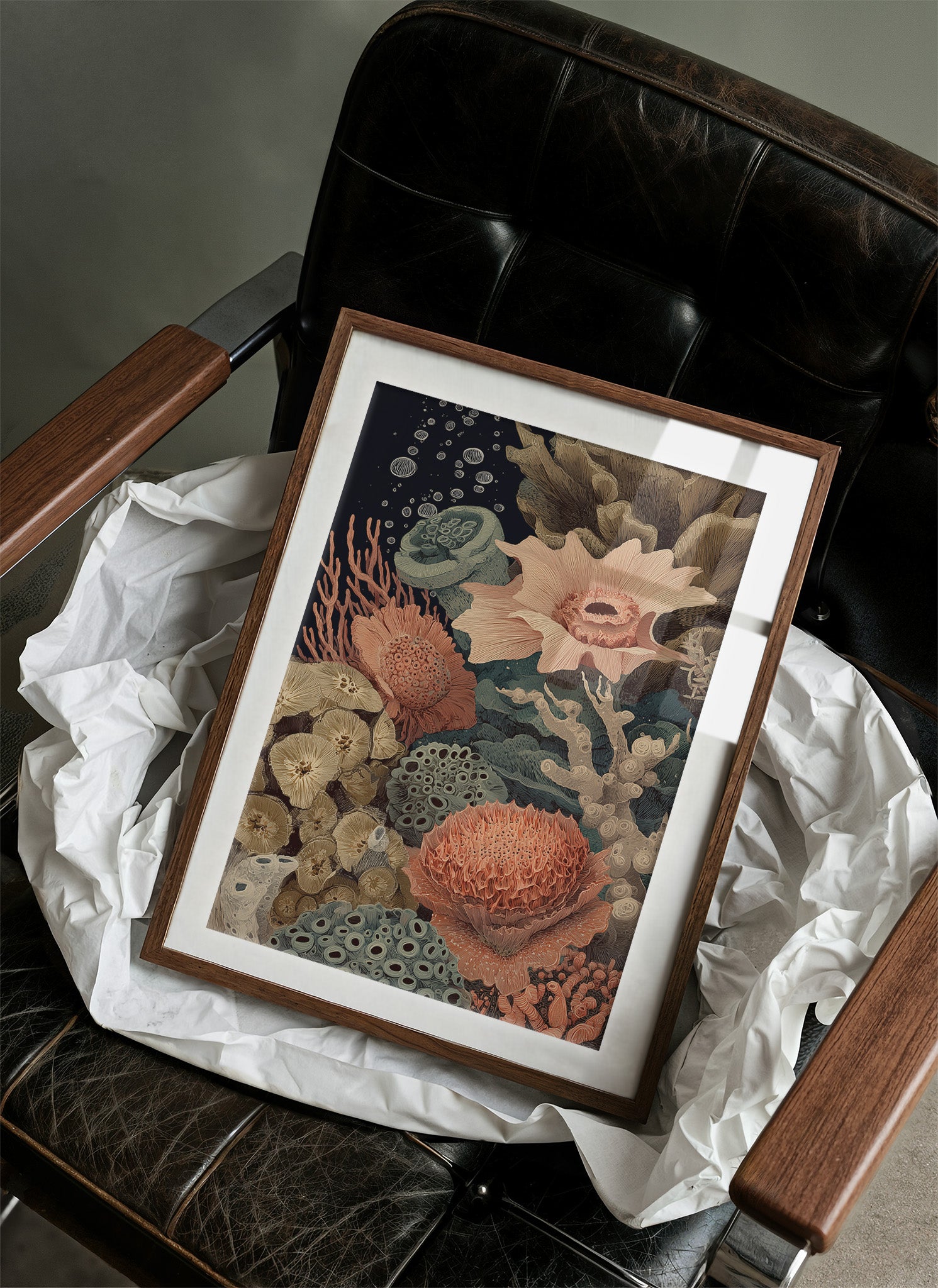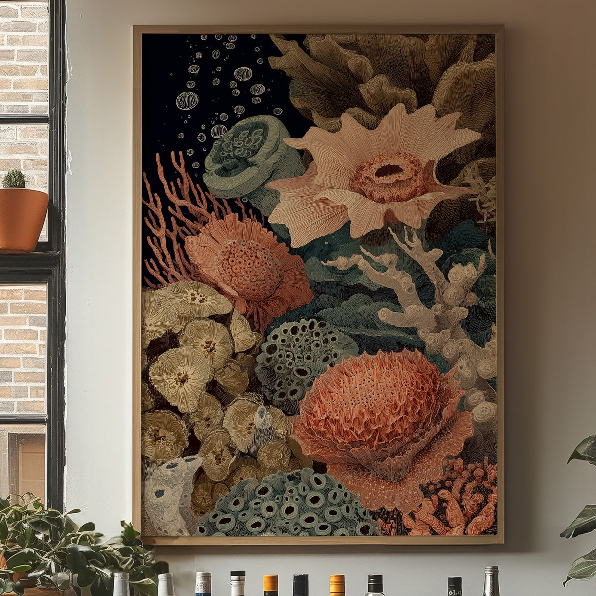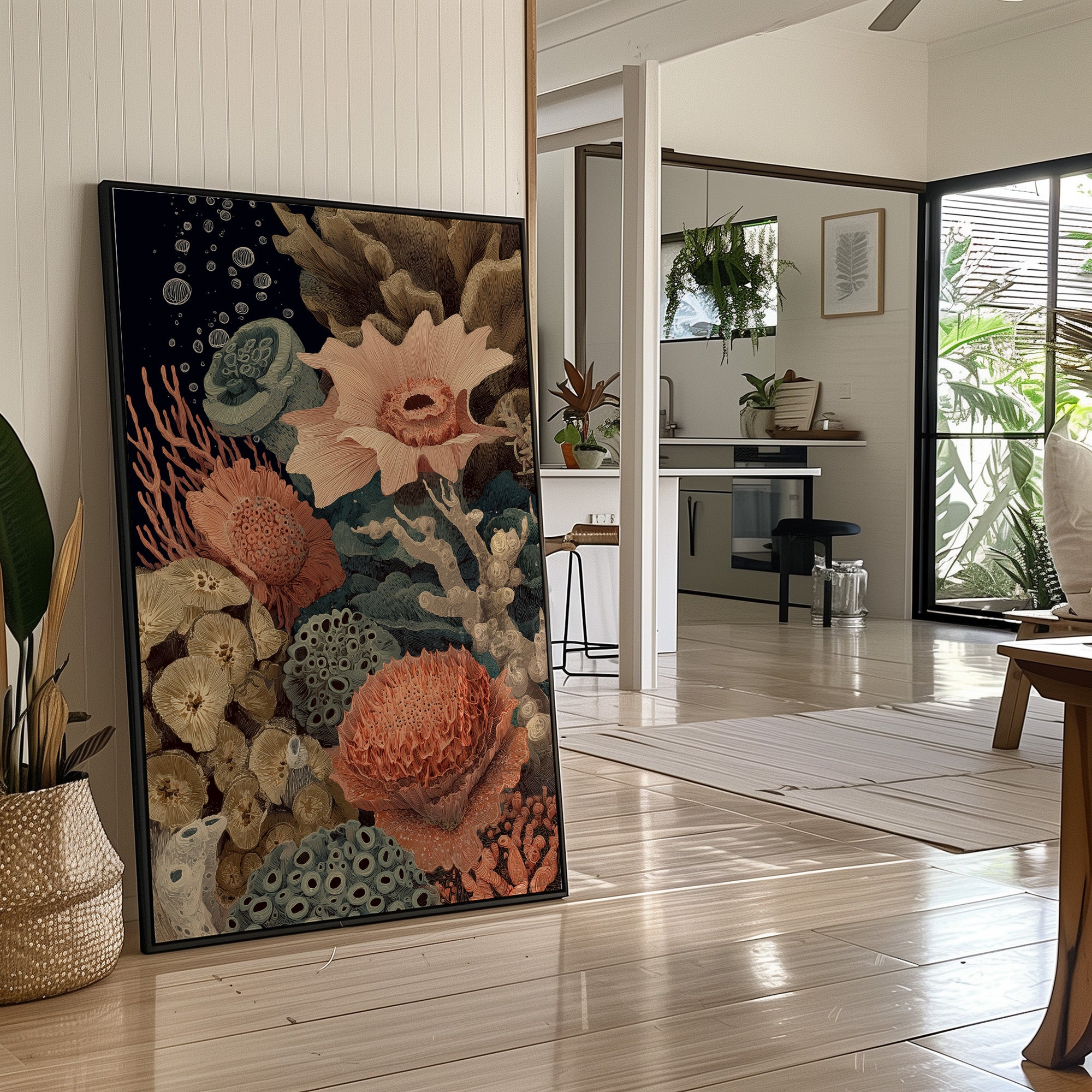 Delicate coral formations in salmon pink bloom alongside teal-blue marine plants and beige fungi-like structures. The vintage-inspired botanical illustration style gives the piece a timeless quality.