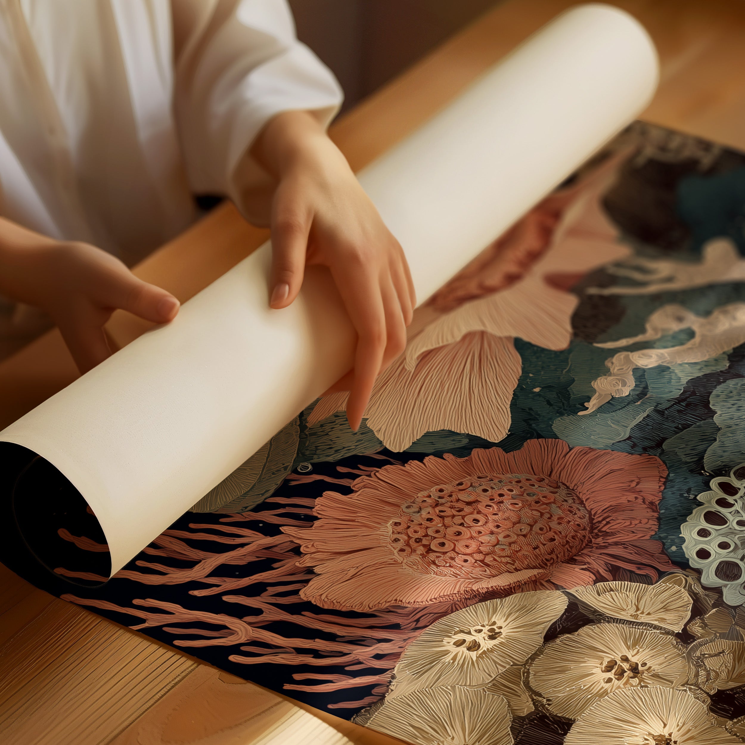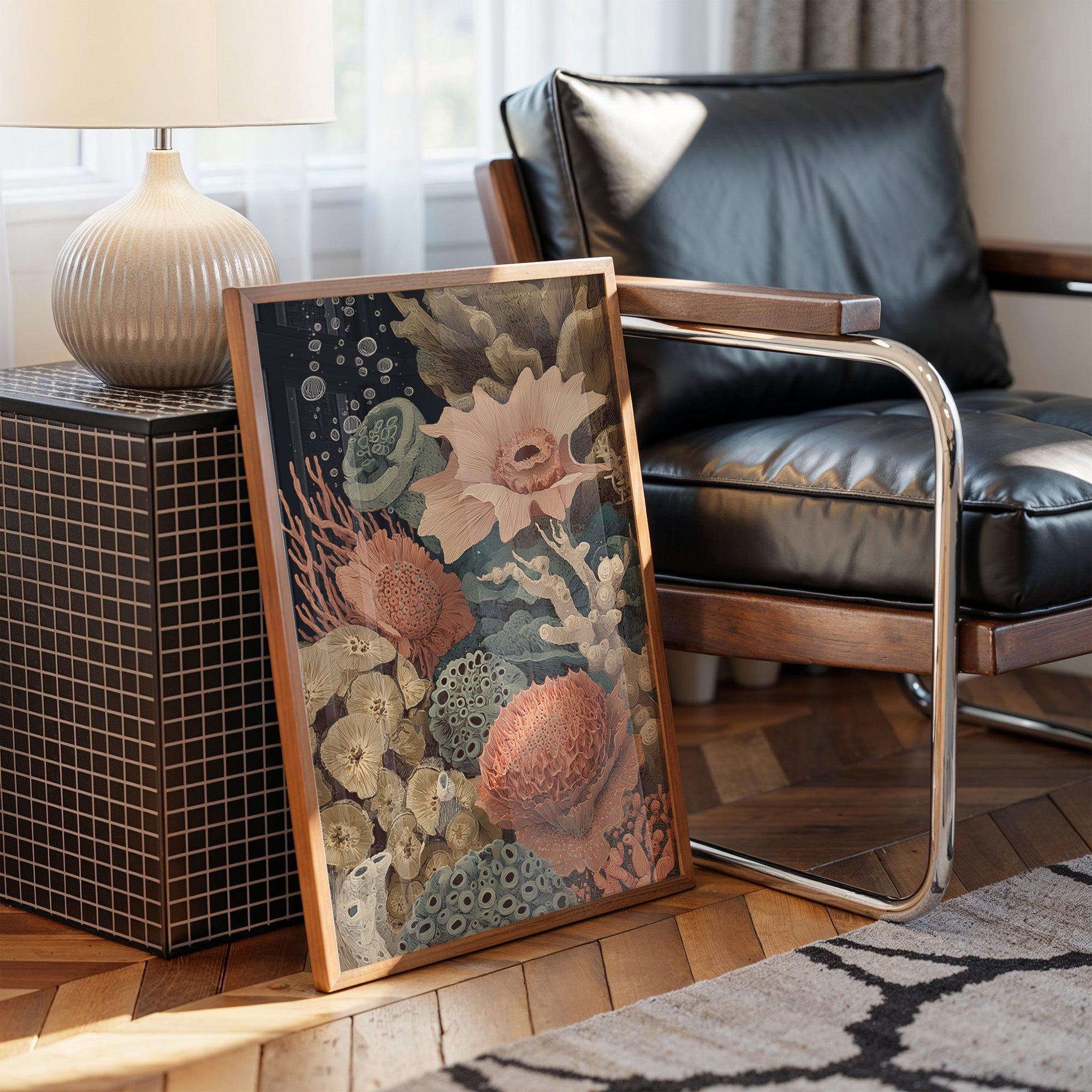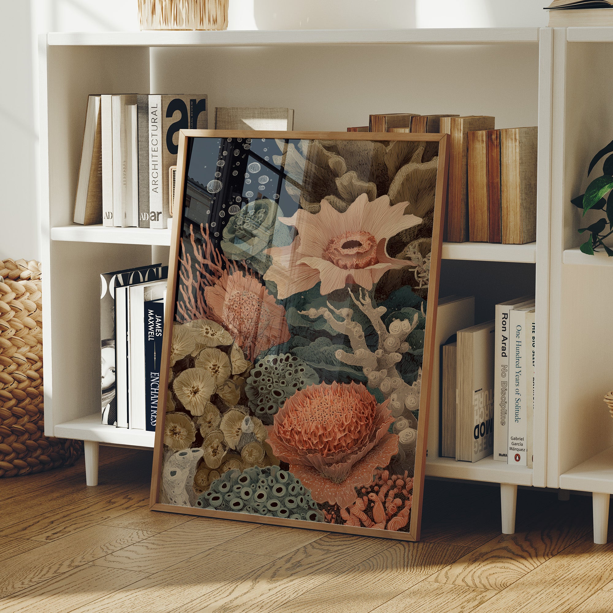 Delicate coral formations in salmon pink bloom alongside teal-blue marine plants and beige fungi-like structures. The vintage-inspired botanical illustration style gives the piece a timeless quality.