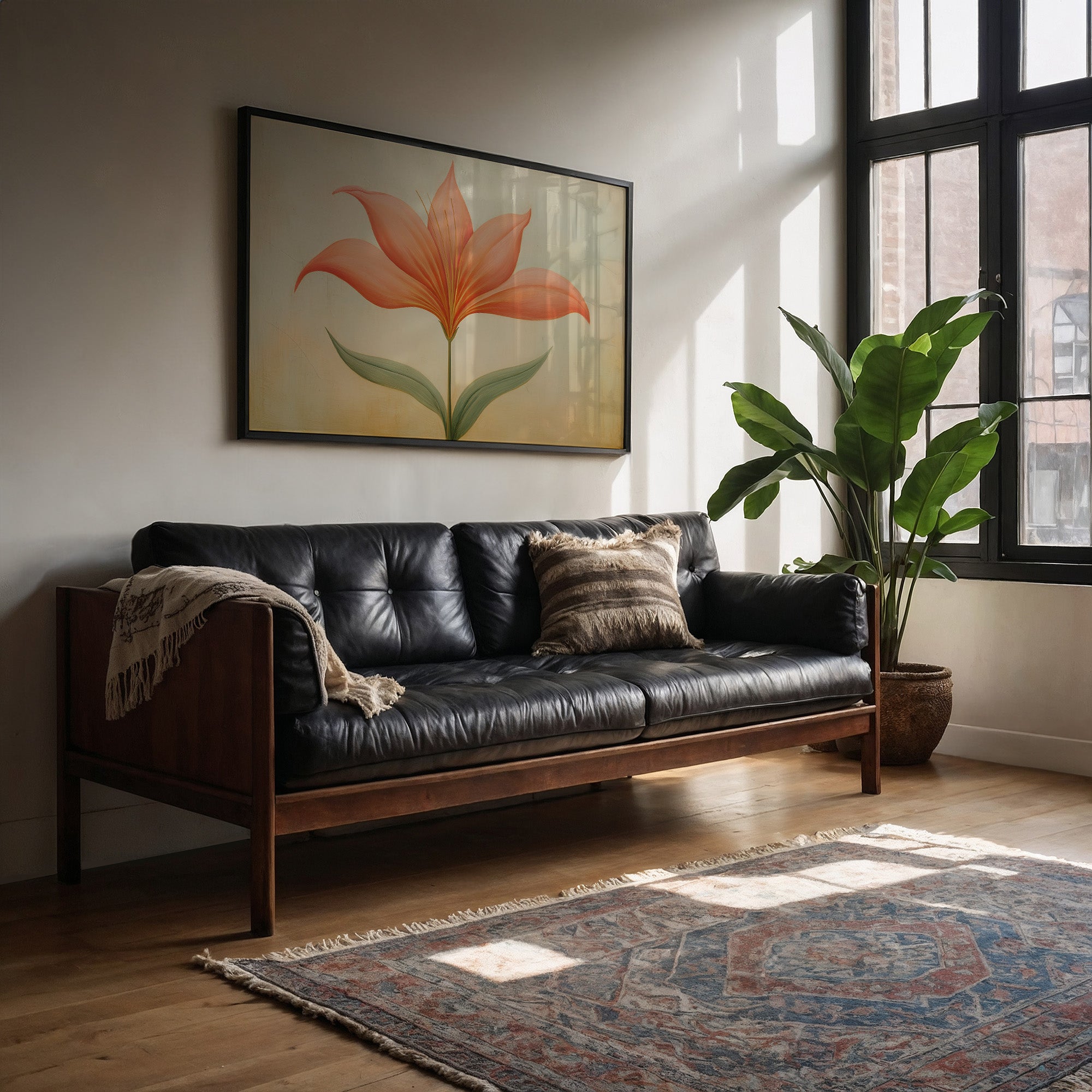 Afternoon sunlight streams through windows, casting dancing shadows of houseplants while illuminating a simple yet striking botanical illustration. The coral-hued lily blooms with delicate grace against a soft neutral background, its petals unfurling with architectural precision and artistic restraint. The scene is completed by rich corduroy upholstery in warm cognac tones, creating a cozy sanctuary where vintage charm meets modern simplicity. This piece would elevate a reading nook, home office, or any intimate space seeking to balance sophistication with organic warmth.