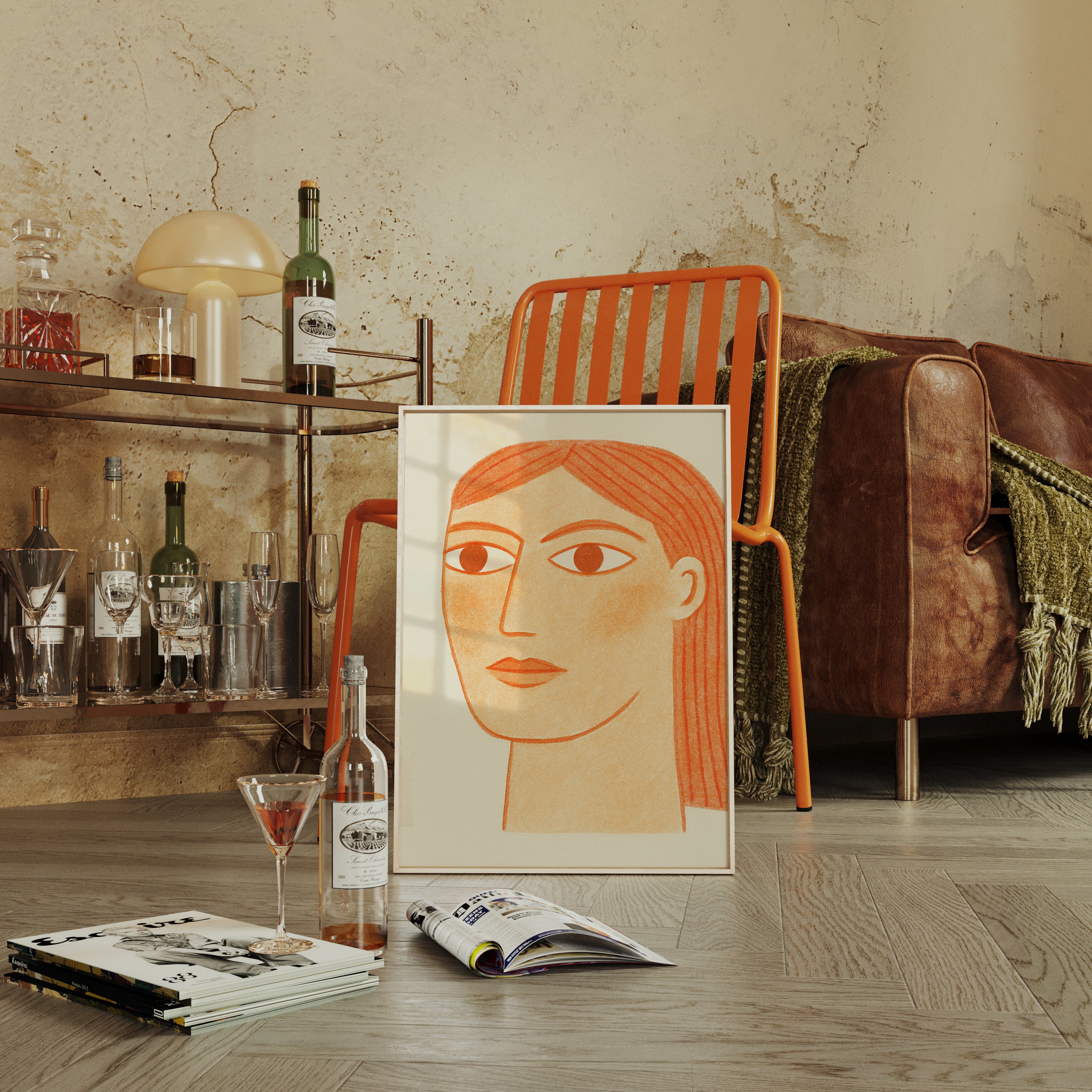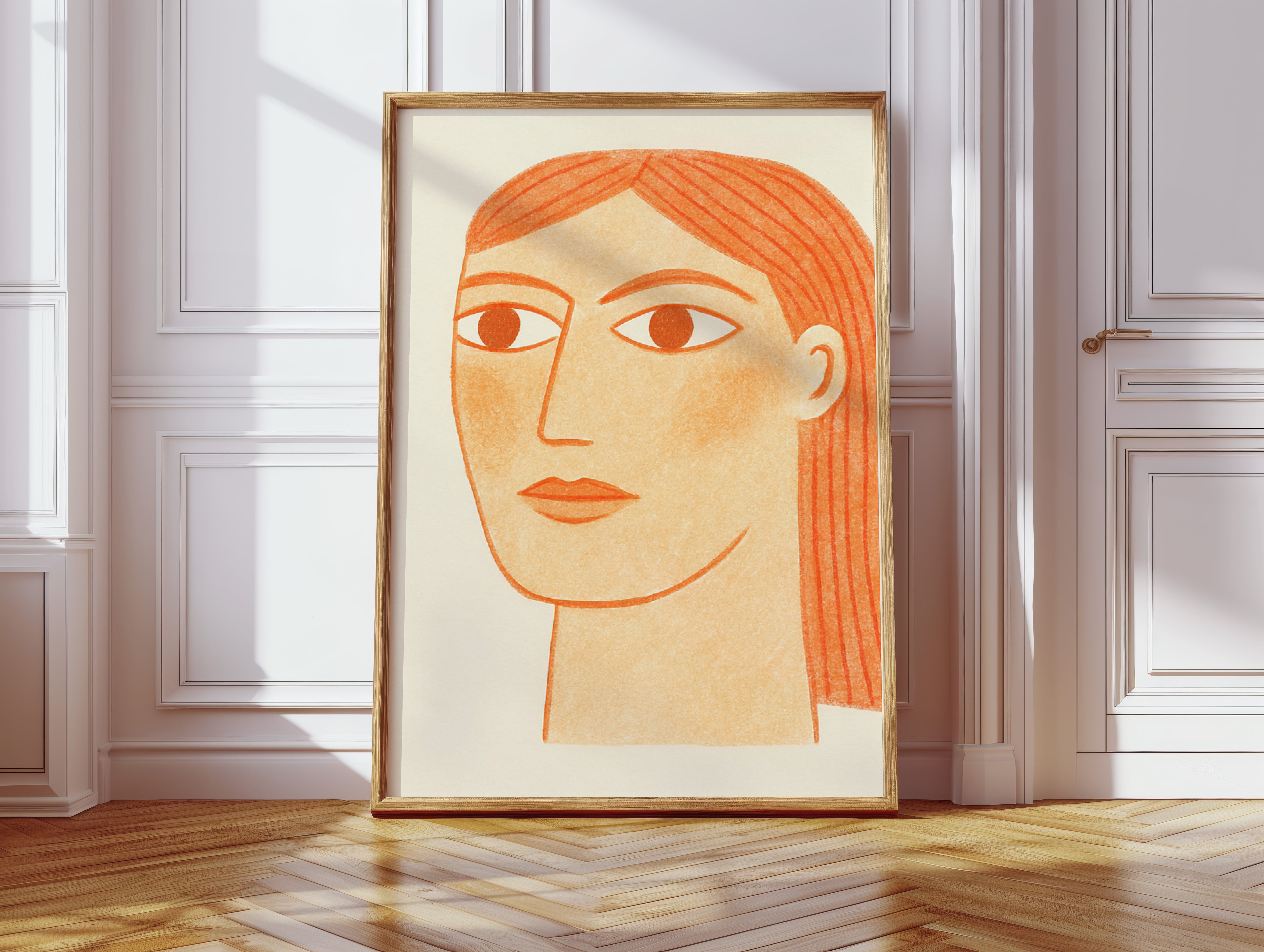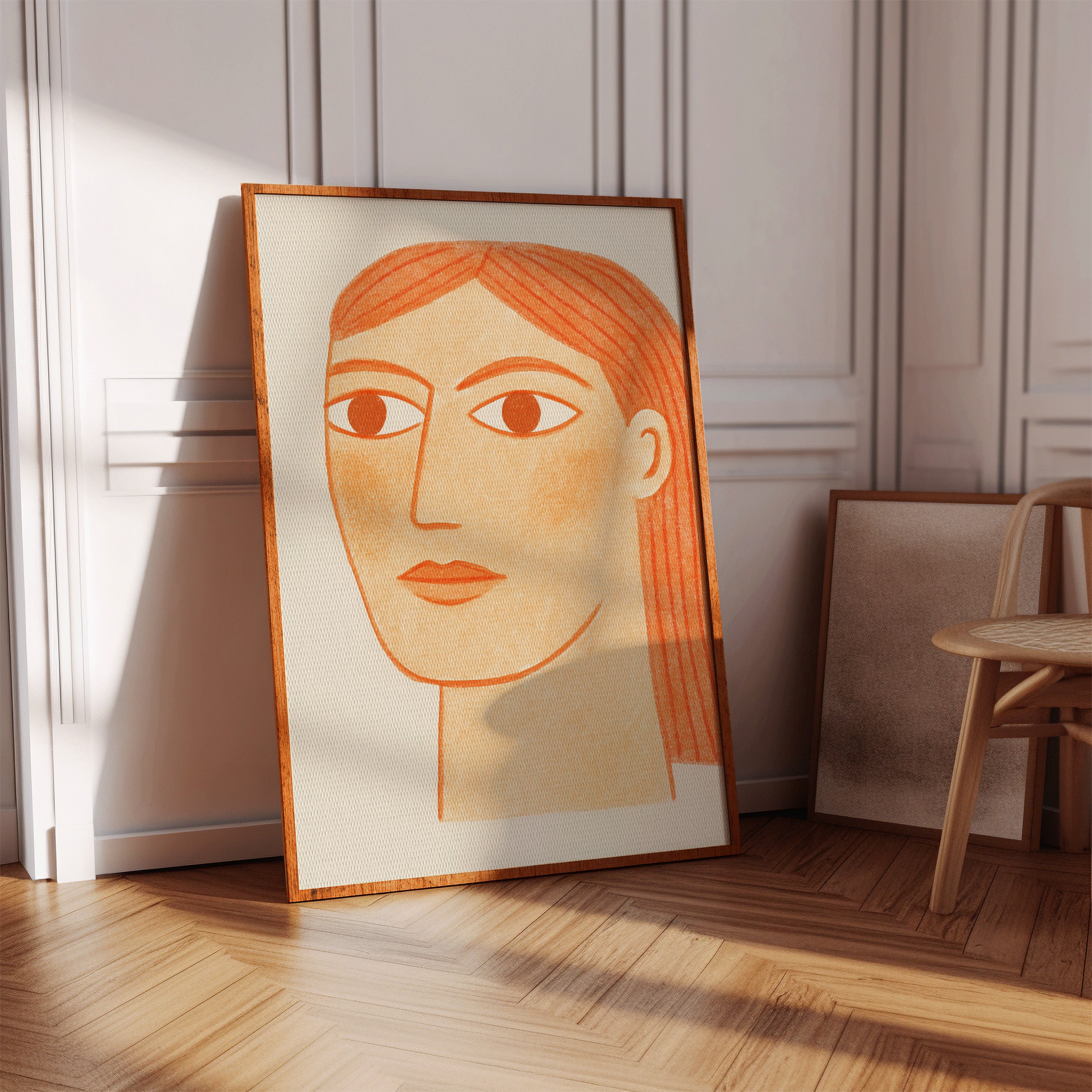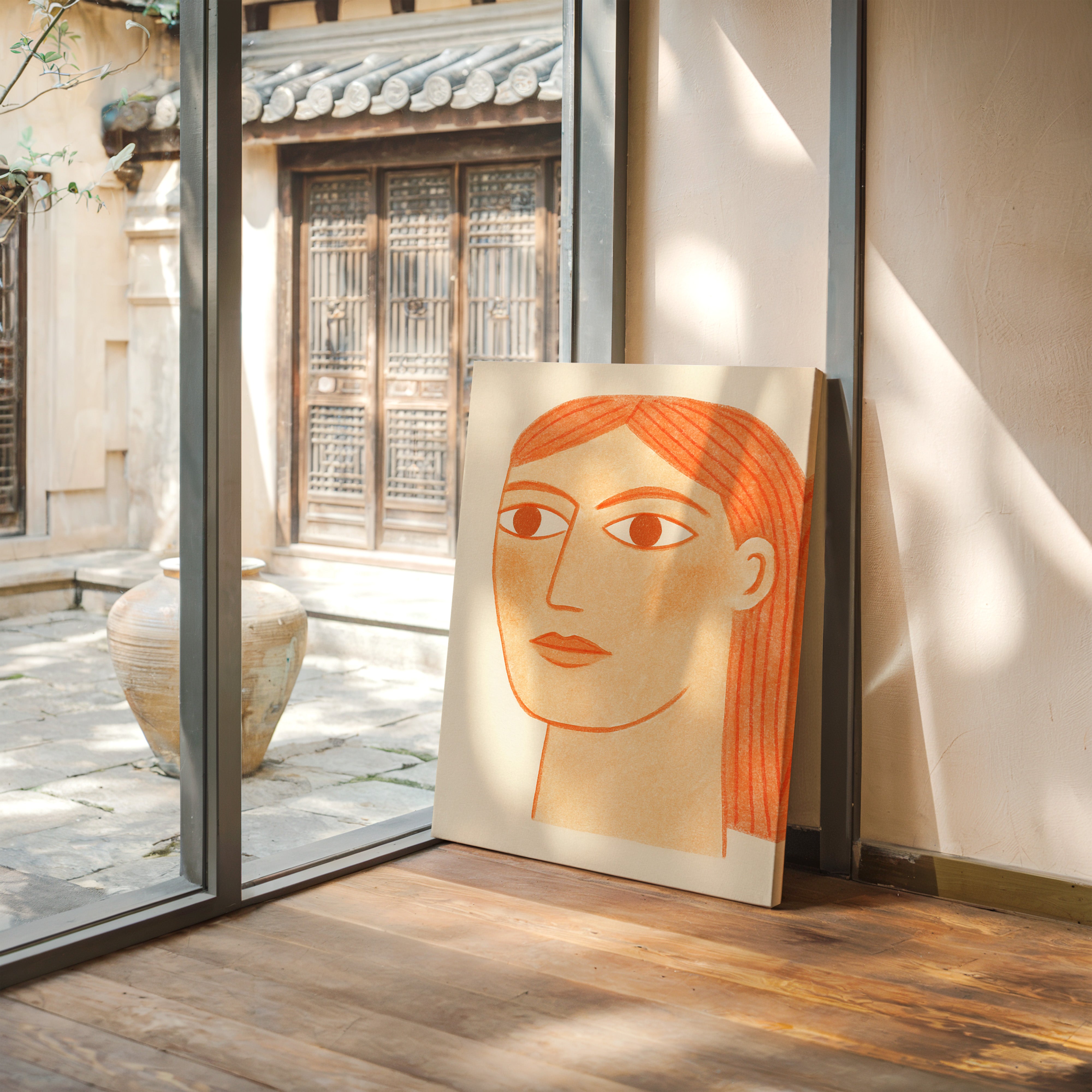 A gentle warmth radiates from this minimalist portrait, rendered in soft coral tones against cream-colored paper. The bold, simplified lines create an elegant study of form and expression, where geometric precision meets organic curves. The composition achieves a delicate balance between modernist abstraction and classical portraiture, with straight hair lines providing rhythm against the subtle curves of facial features. This piece would bring sophisticated charm to a contemporary living space, particularly effective in a reading nook or creative studio where its contemplative presence can inspire.