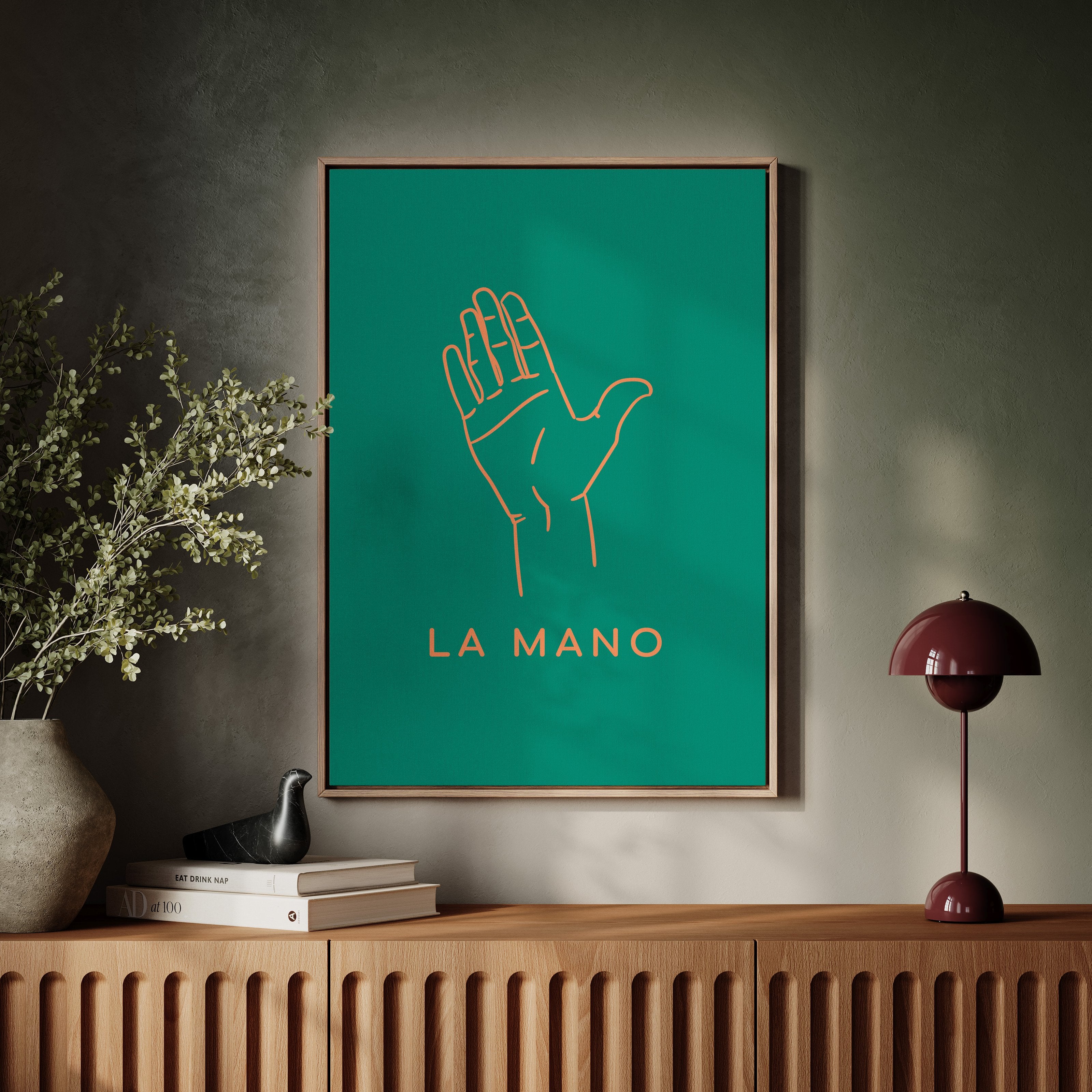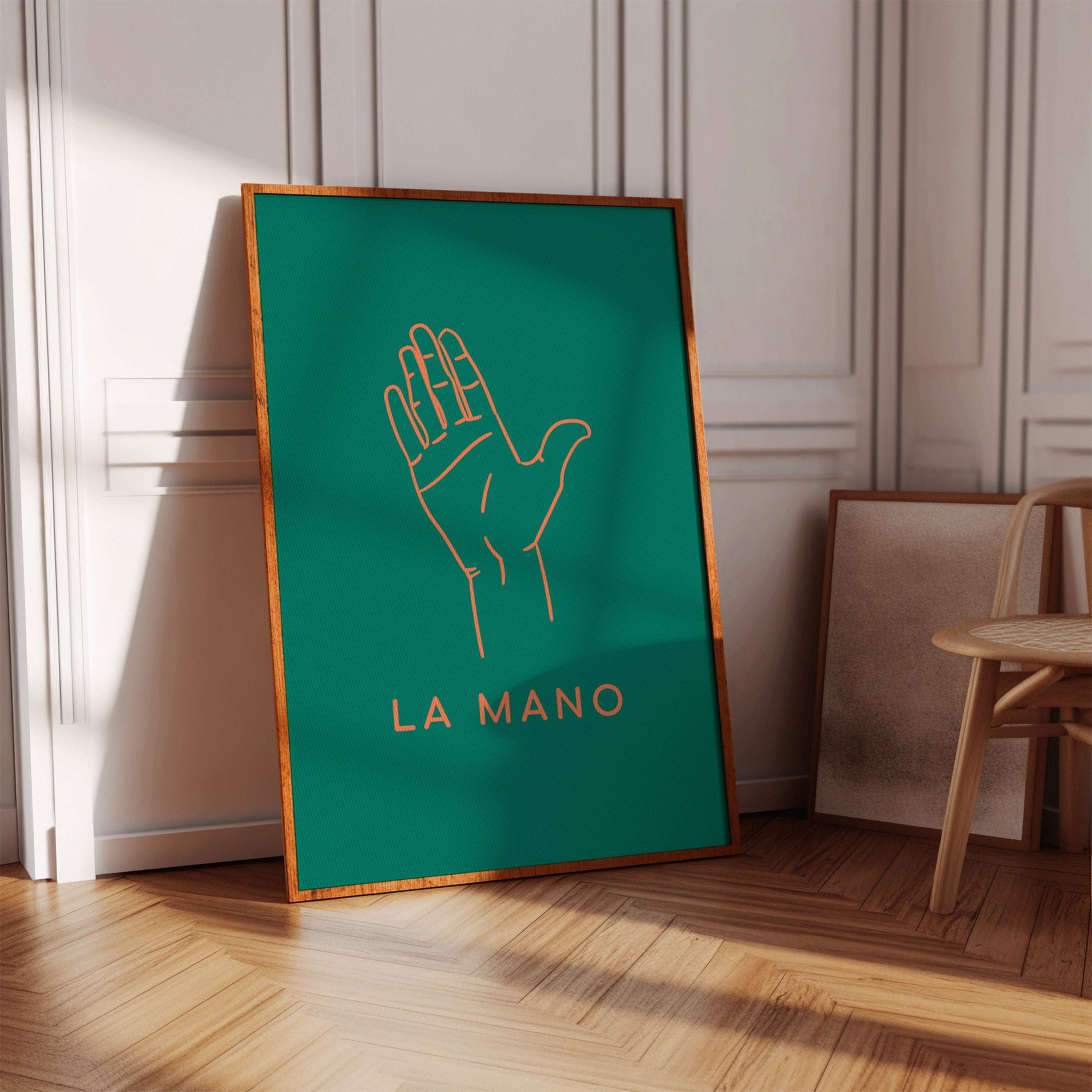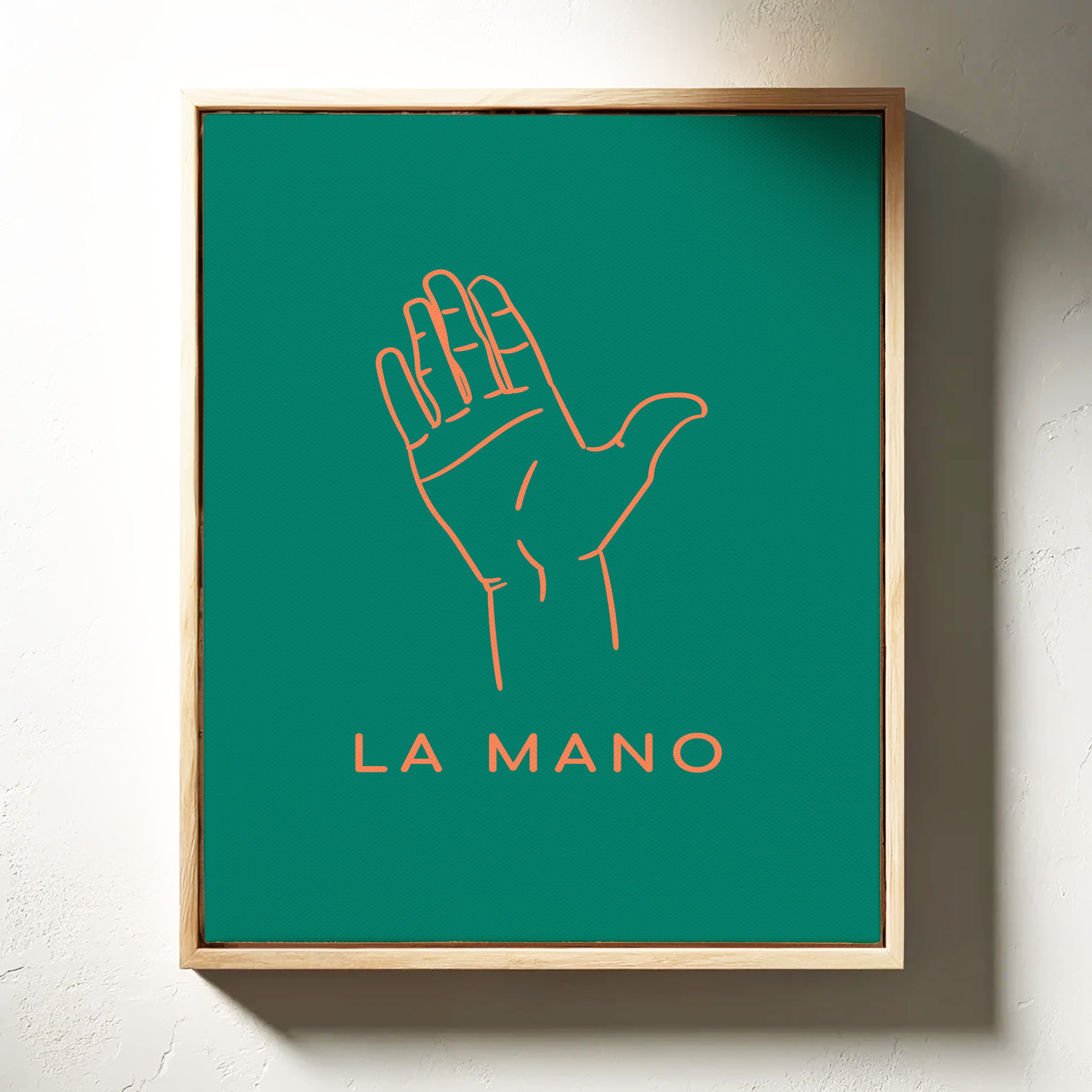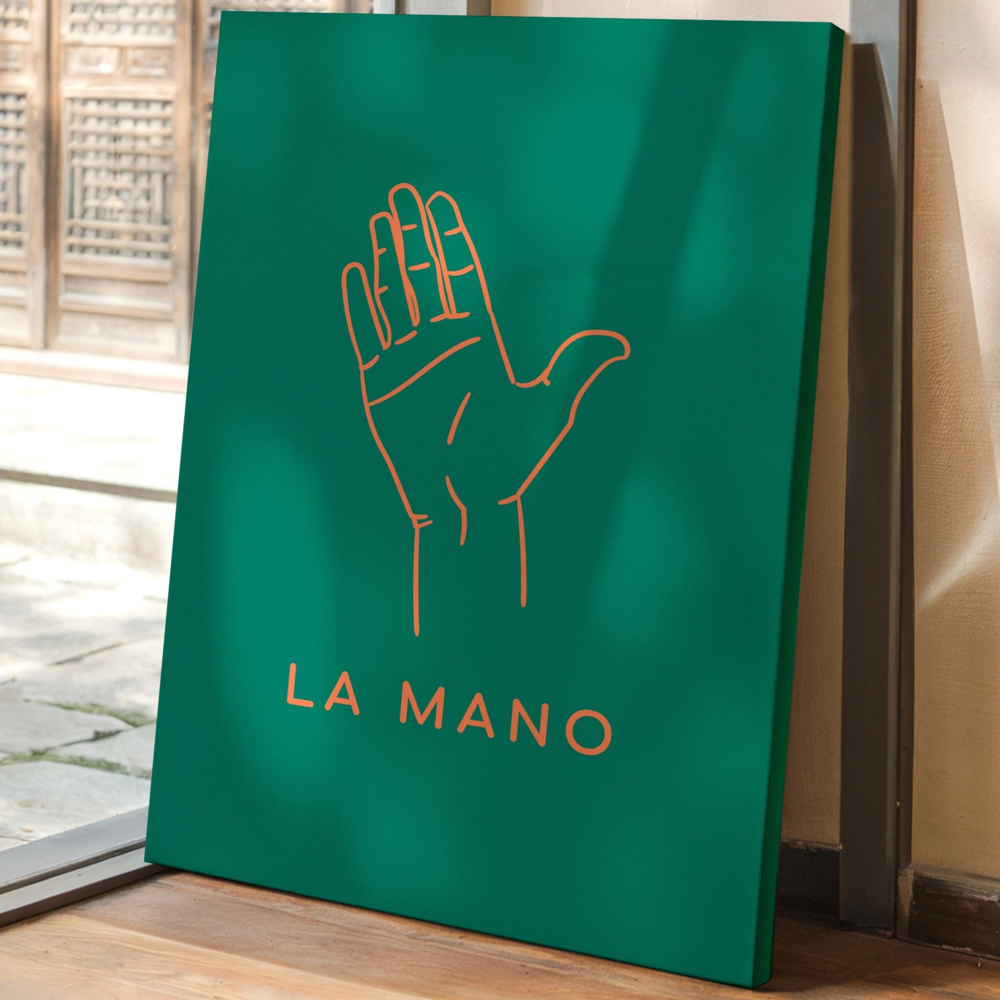 A single upraised hand emerges in delicate coral lines against deep emerald, speaking a universal language of connection and presence. This piece from our Contemporary collection marries minimalist design with profound symbolic resonance. The simple yet powerful linework creates a striking silhouette, while the contrasting warm and cool tones dance in perfect harmony. The Spanish text 'LA MANO' anchors the composition with cultural depth and meaning. This statement piece commands attention in modern living spaces, especially in studies, meditation rooms, or creative workspaces where its message of human connection can inspire daily reflection.