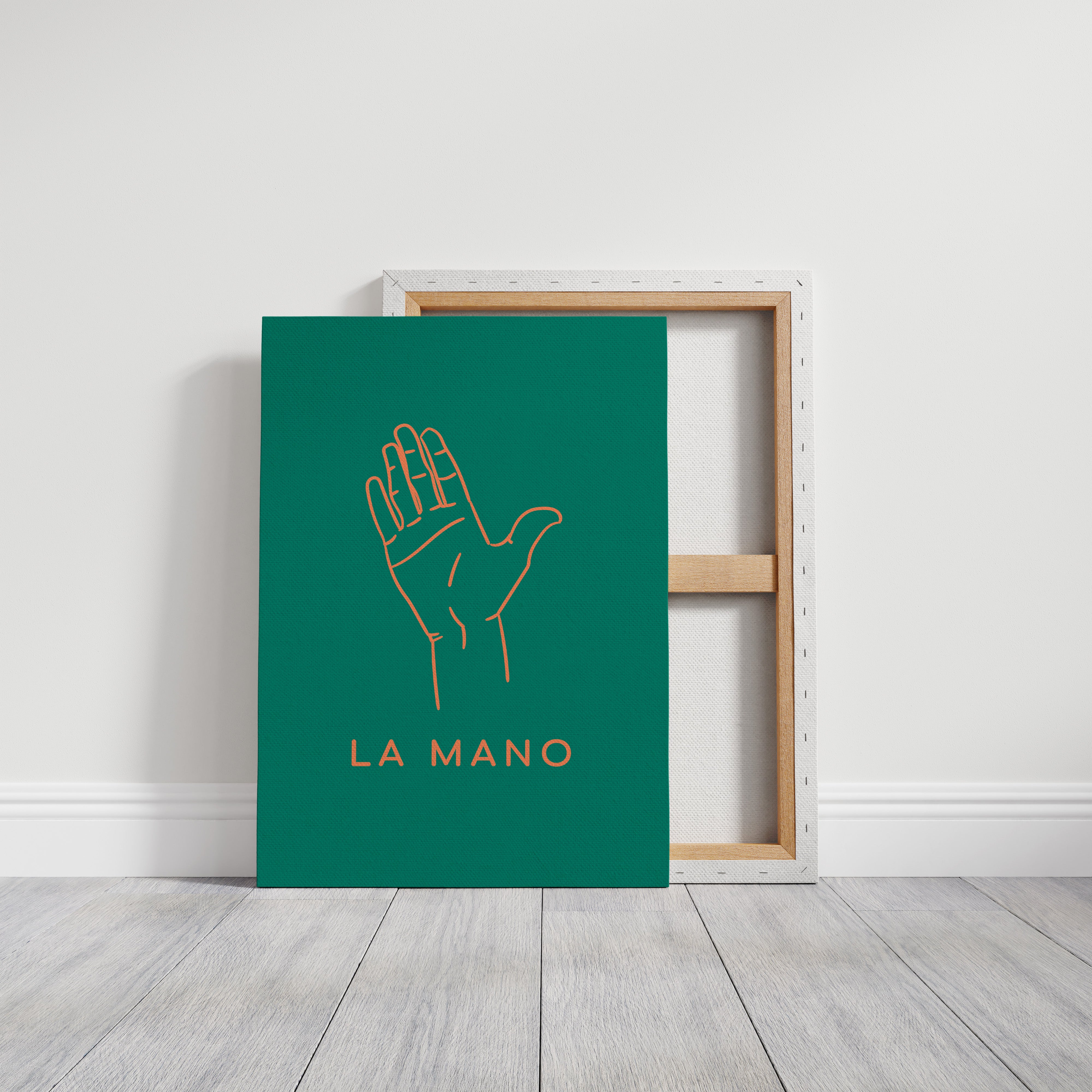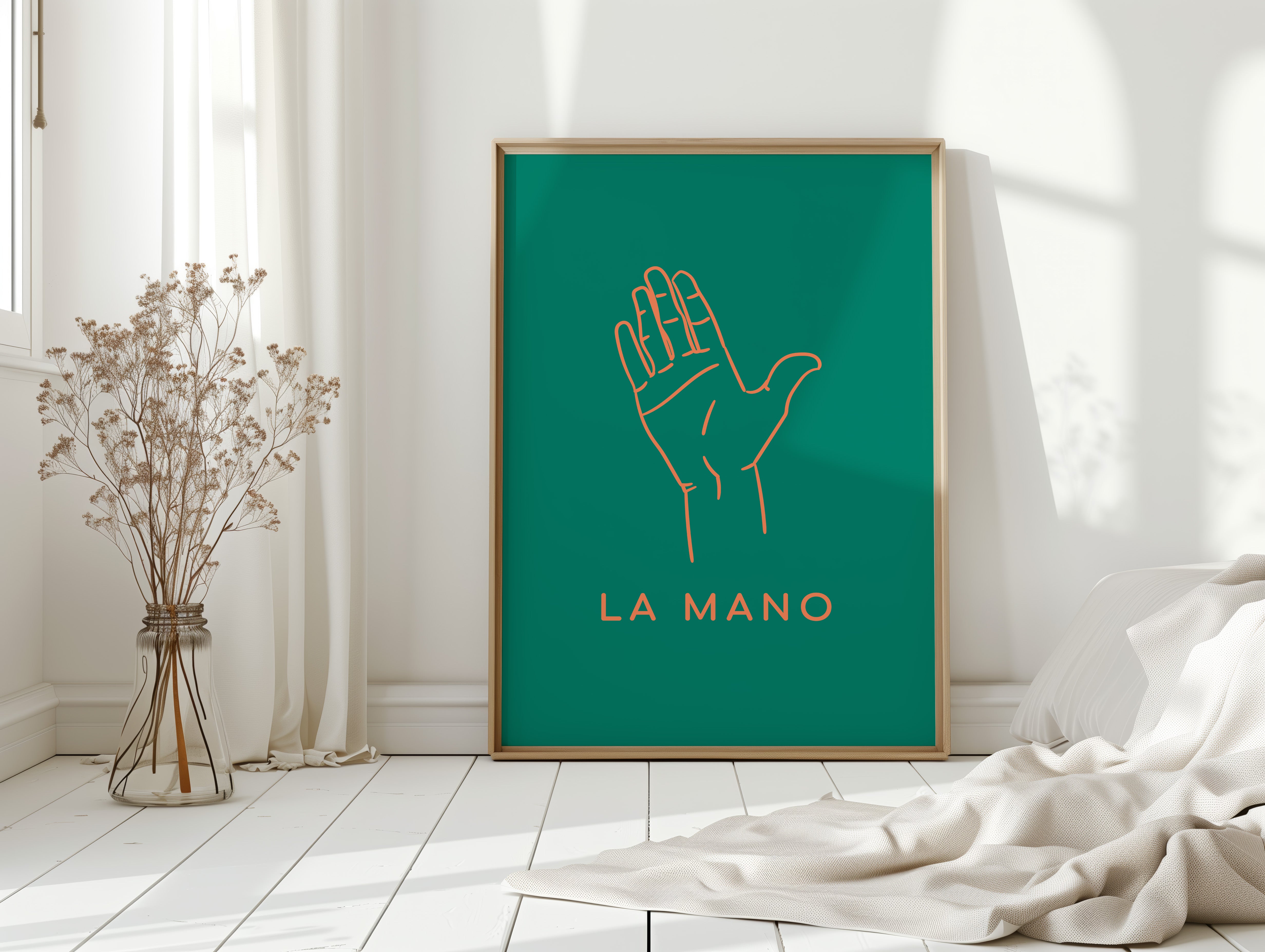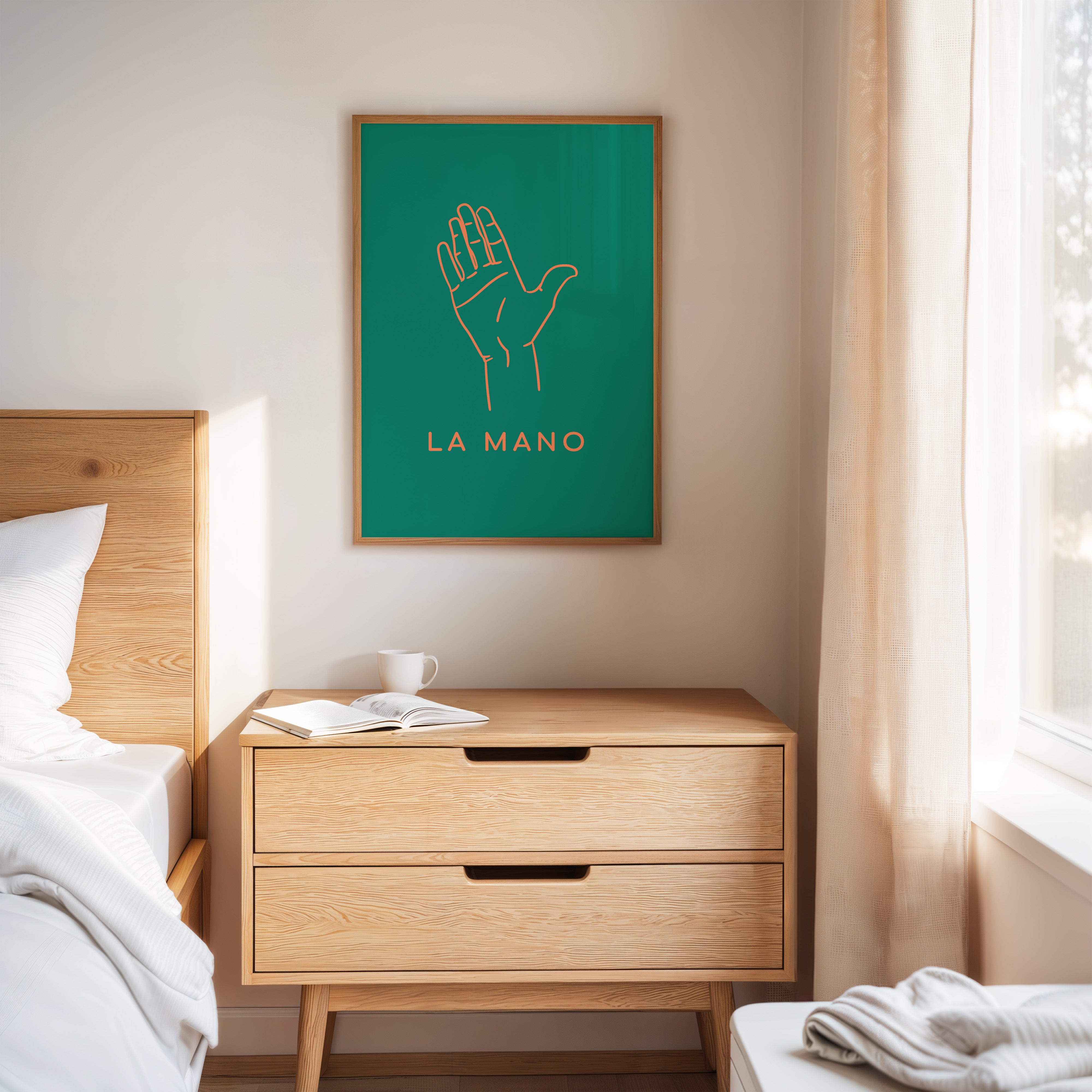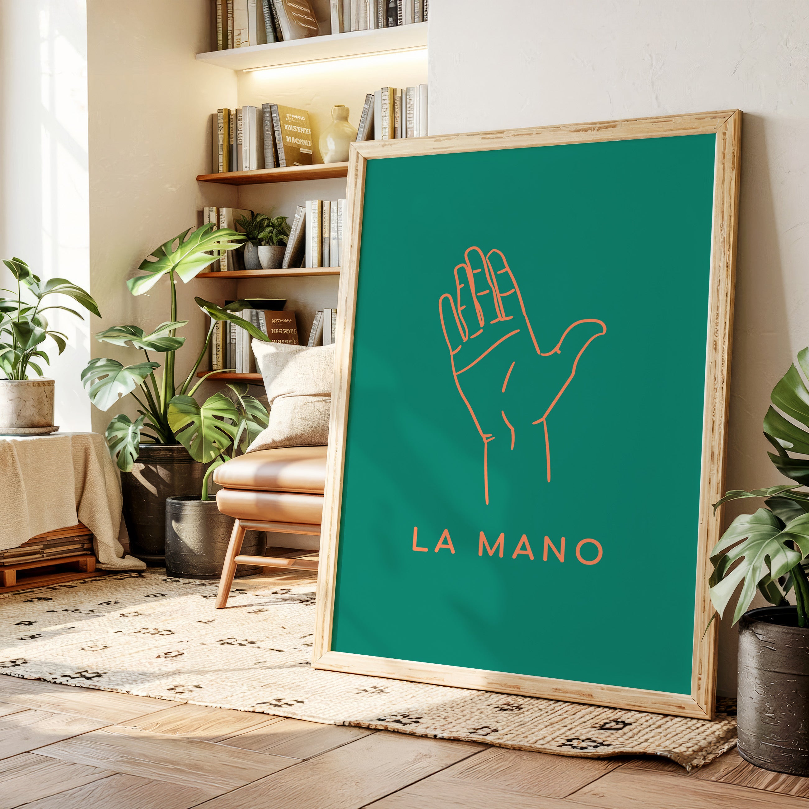 A single upraised hand emerges in delicate coral lines against deep emerald, speaking a universal language of connection and presence. This piece from our Contemporary collection marries minimalist design with profound symbolic resonance. The simple yet powerful linework creates a striking silhouette, while the contrasting warm and cool tones dance in perfect harmony. The Spanish text 'LA MANO' anchors the composition with cultural depth and meaning. This statement piece commands attention in modern living spaces, especially in studies, meditation rooms, or creative workspaces where its message of human connection can inspire daily reflection.