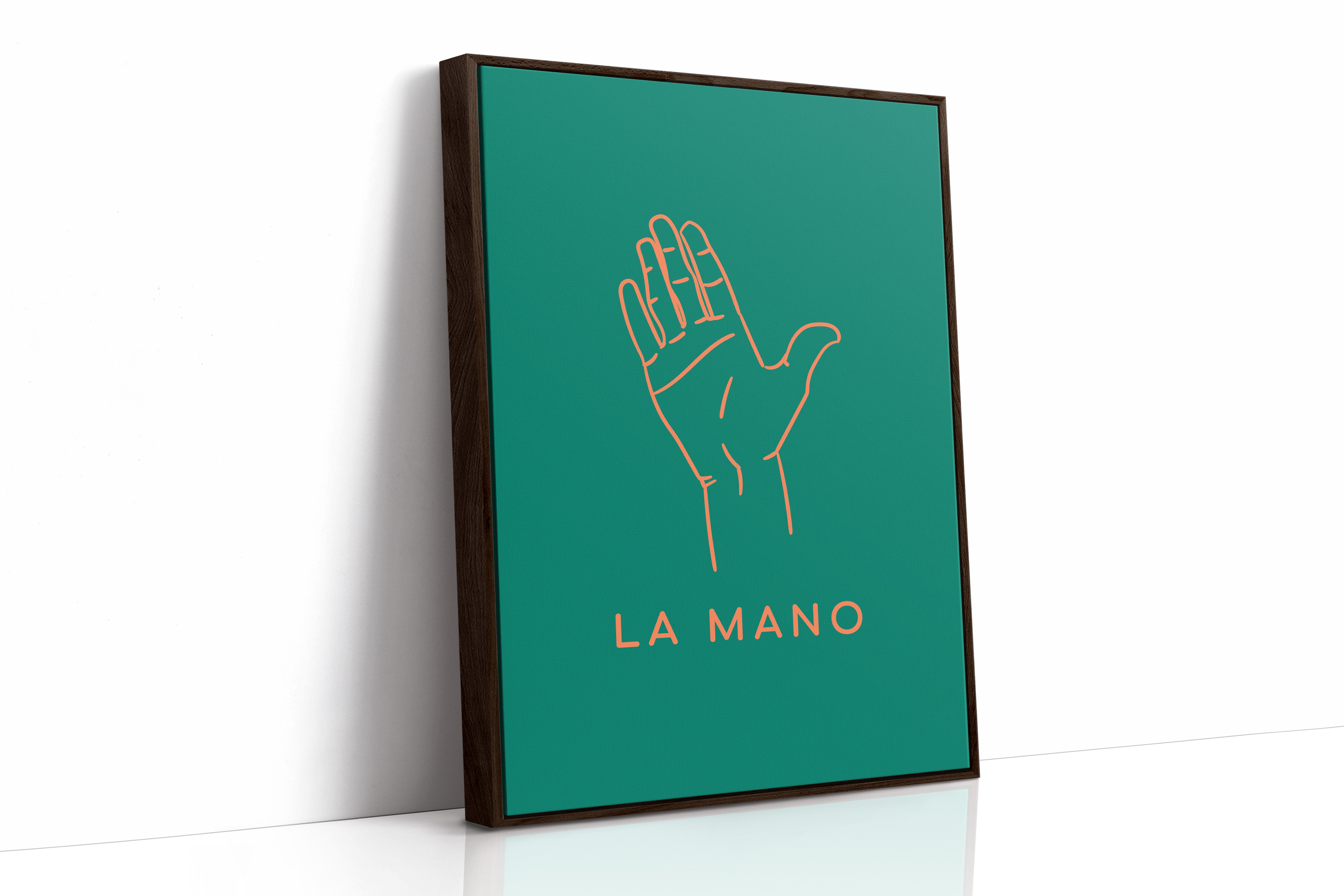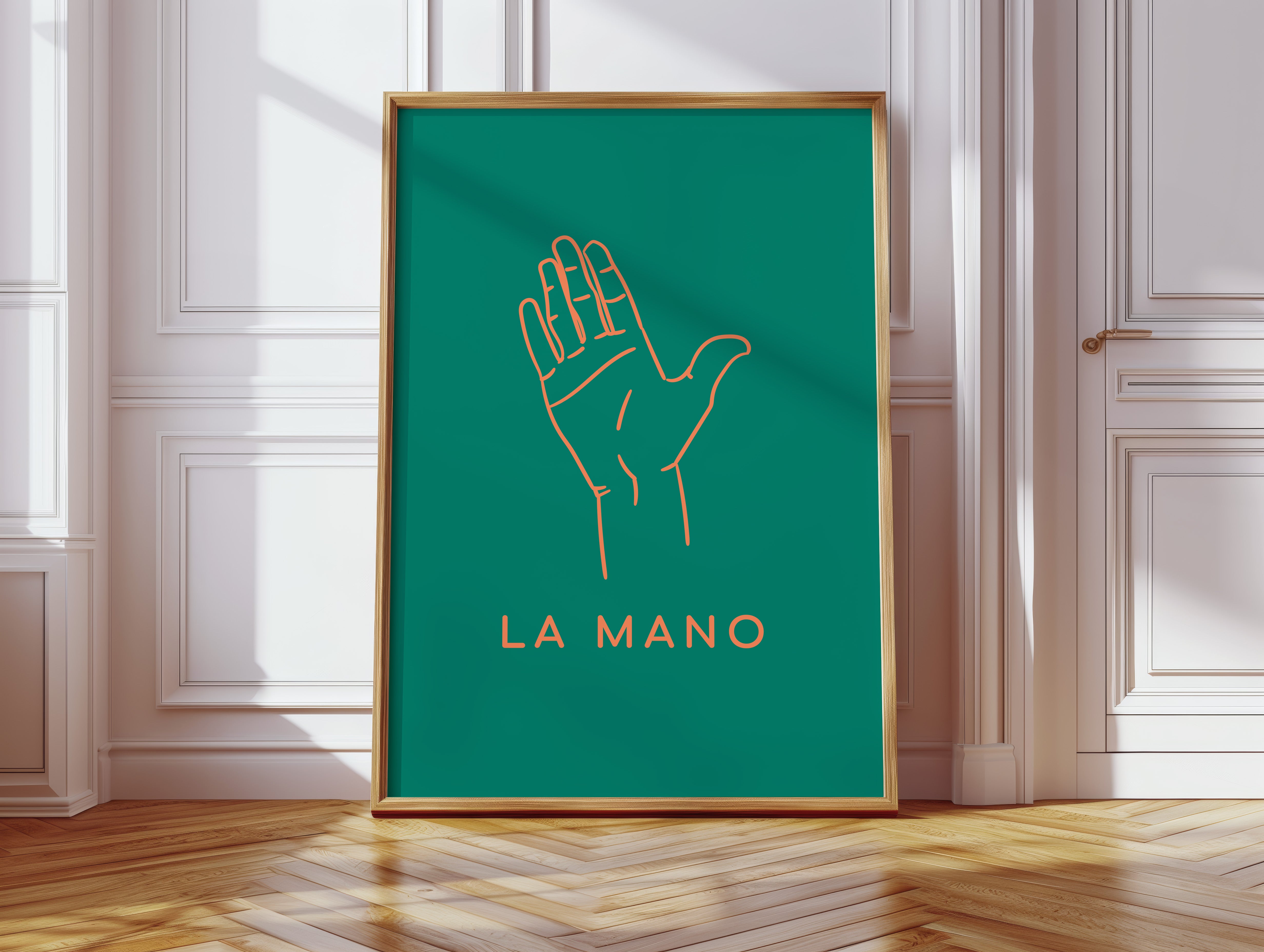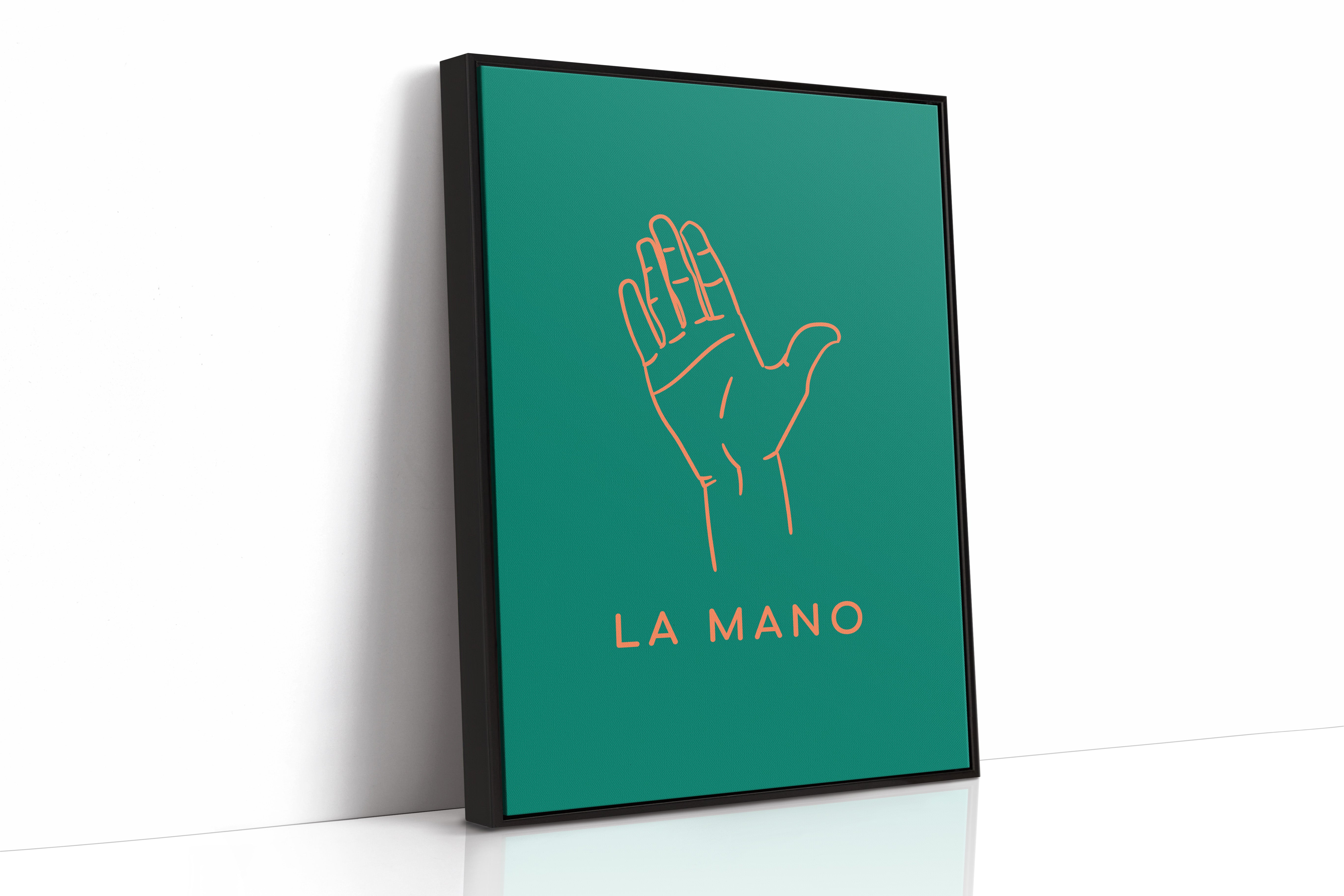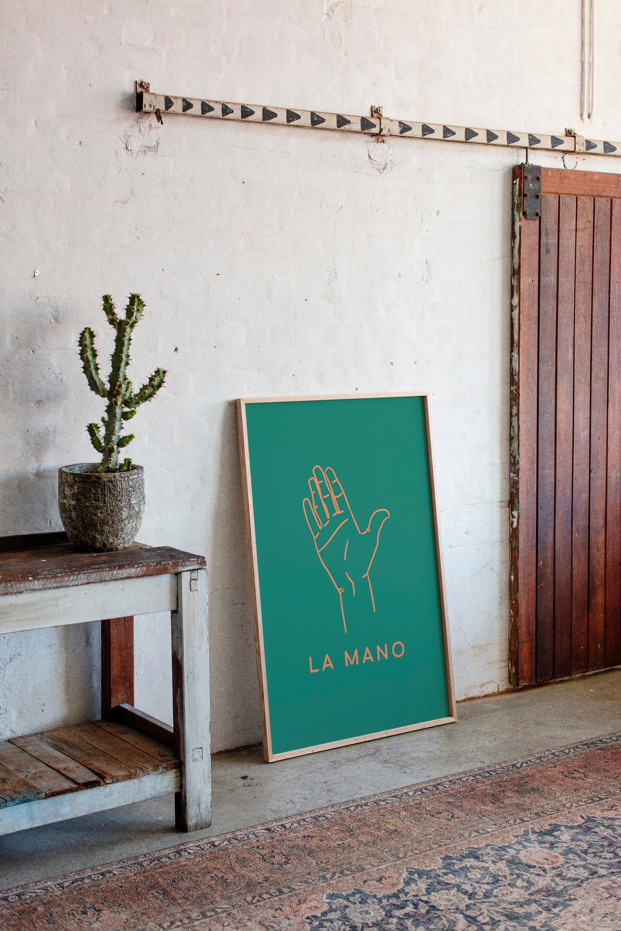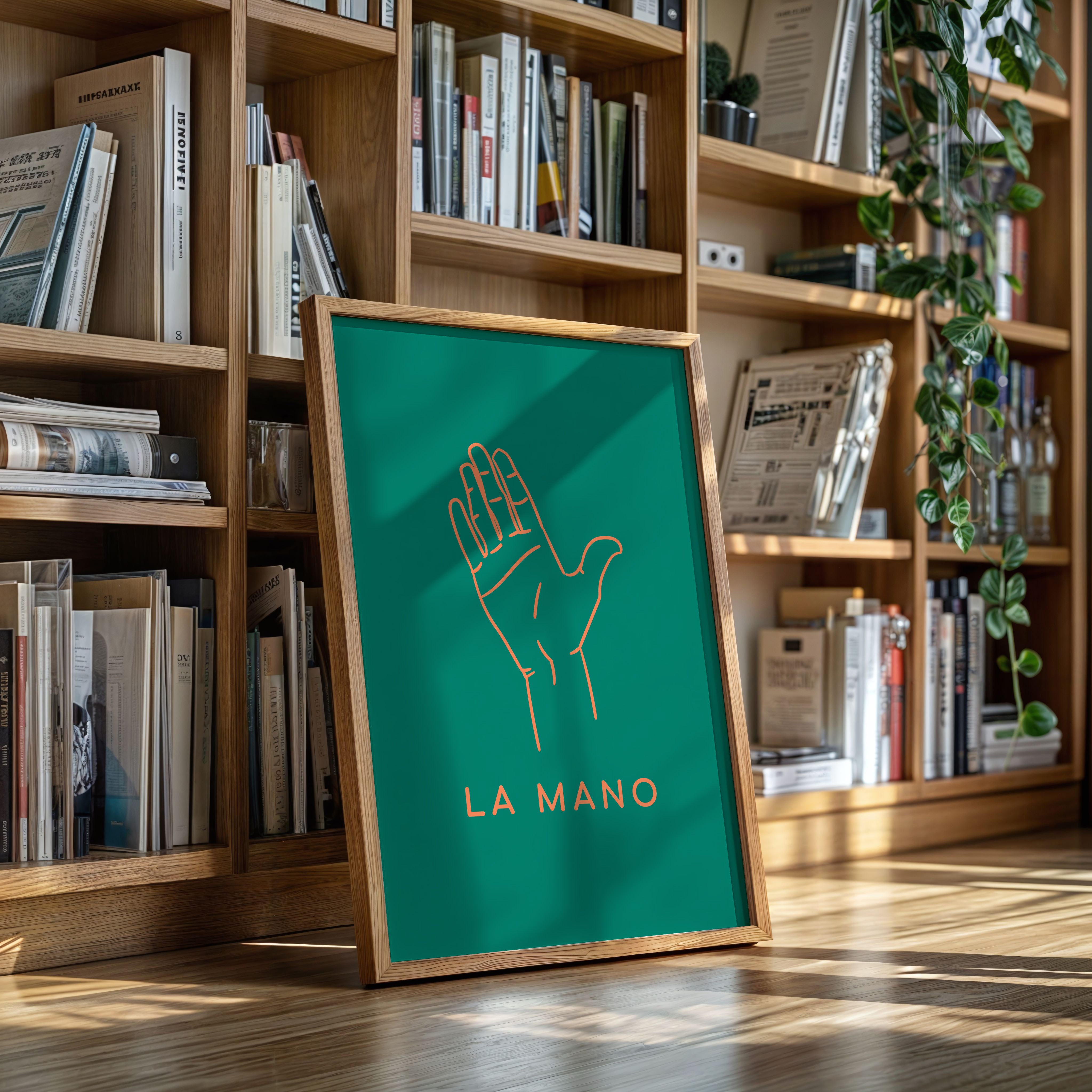 A single upraised hand emerges in delicate coral lines against deep emerald, speaking a universal language of connection and presence. This piece from our Contemporary collection marries minimalist design with profound symbolic resonance. The simple yet powerful linework creates a striking silhouette, while the contrasting warm and cool tones dance in perfect harmony. The Spanish text 'LA MANO' anchors the composition with cultural depth and meaning. This statement piece commands attention in modern living spaces, especially in studies, meditation rooms, or creative workspaces where its message of human connection can inspire daily reflection.