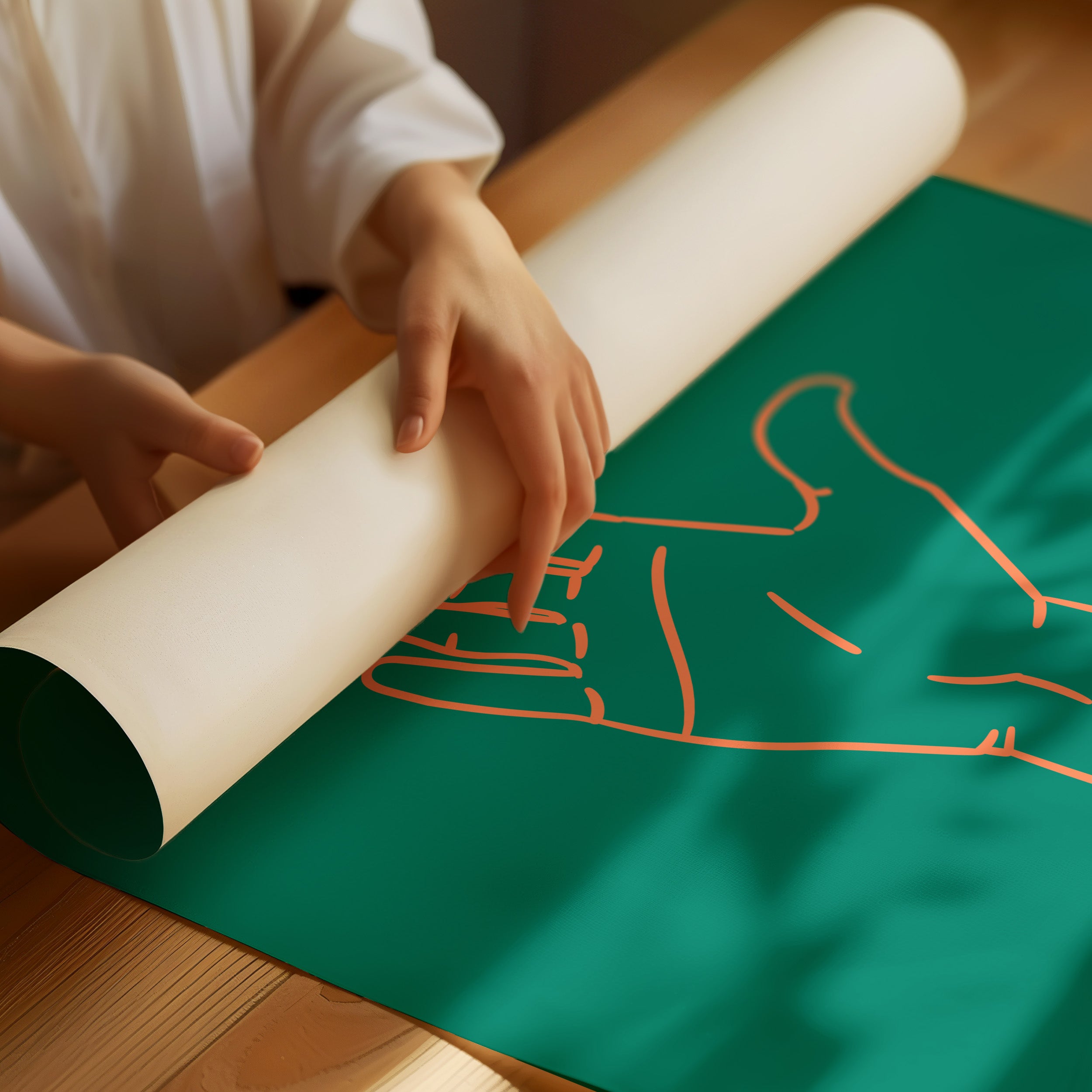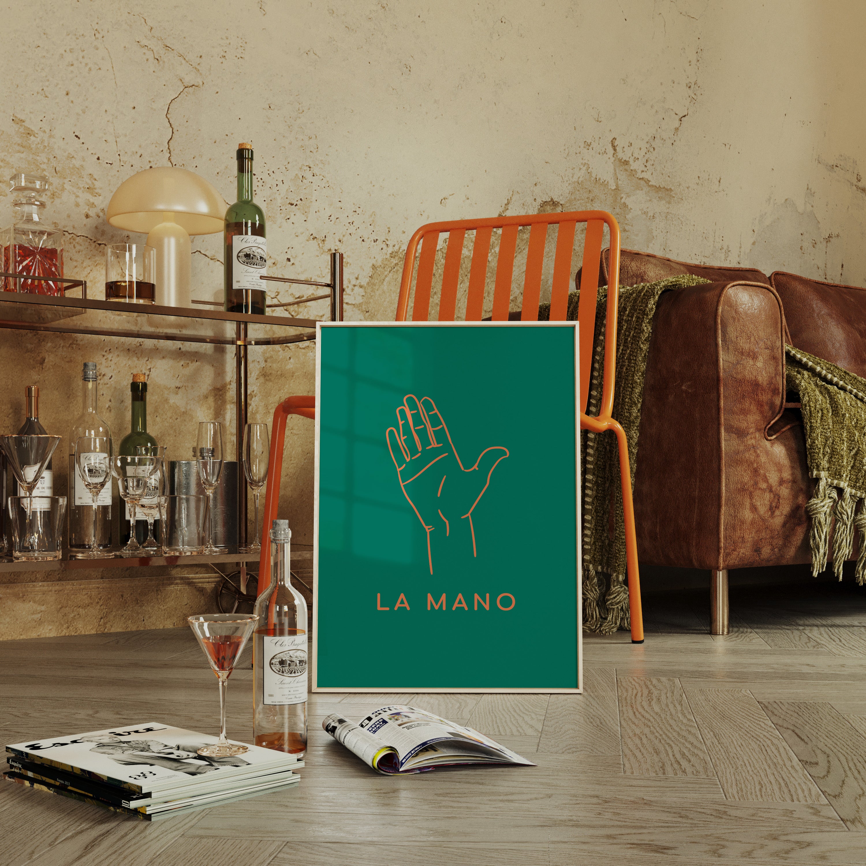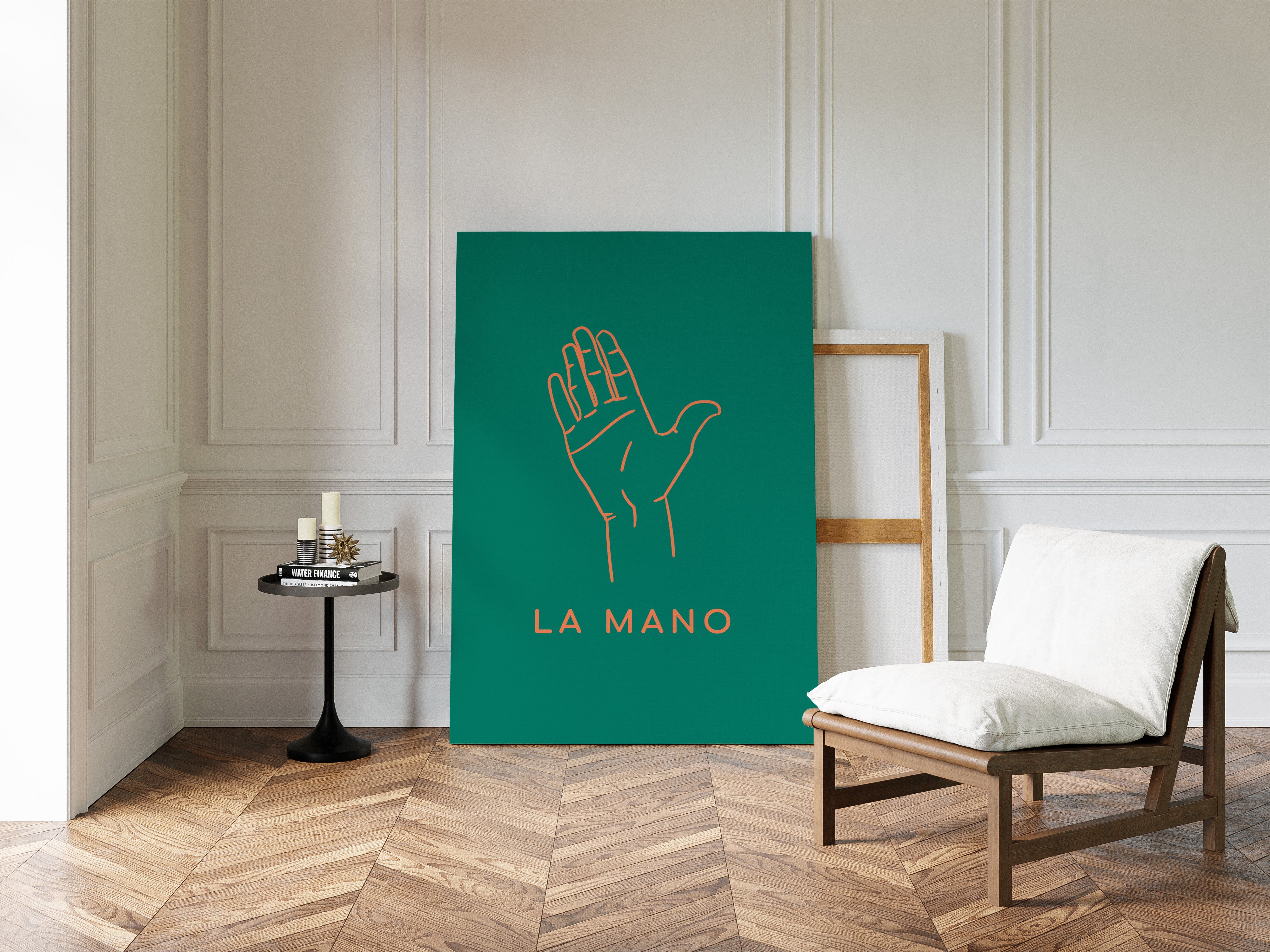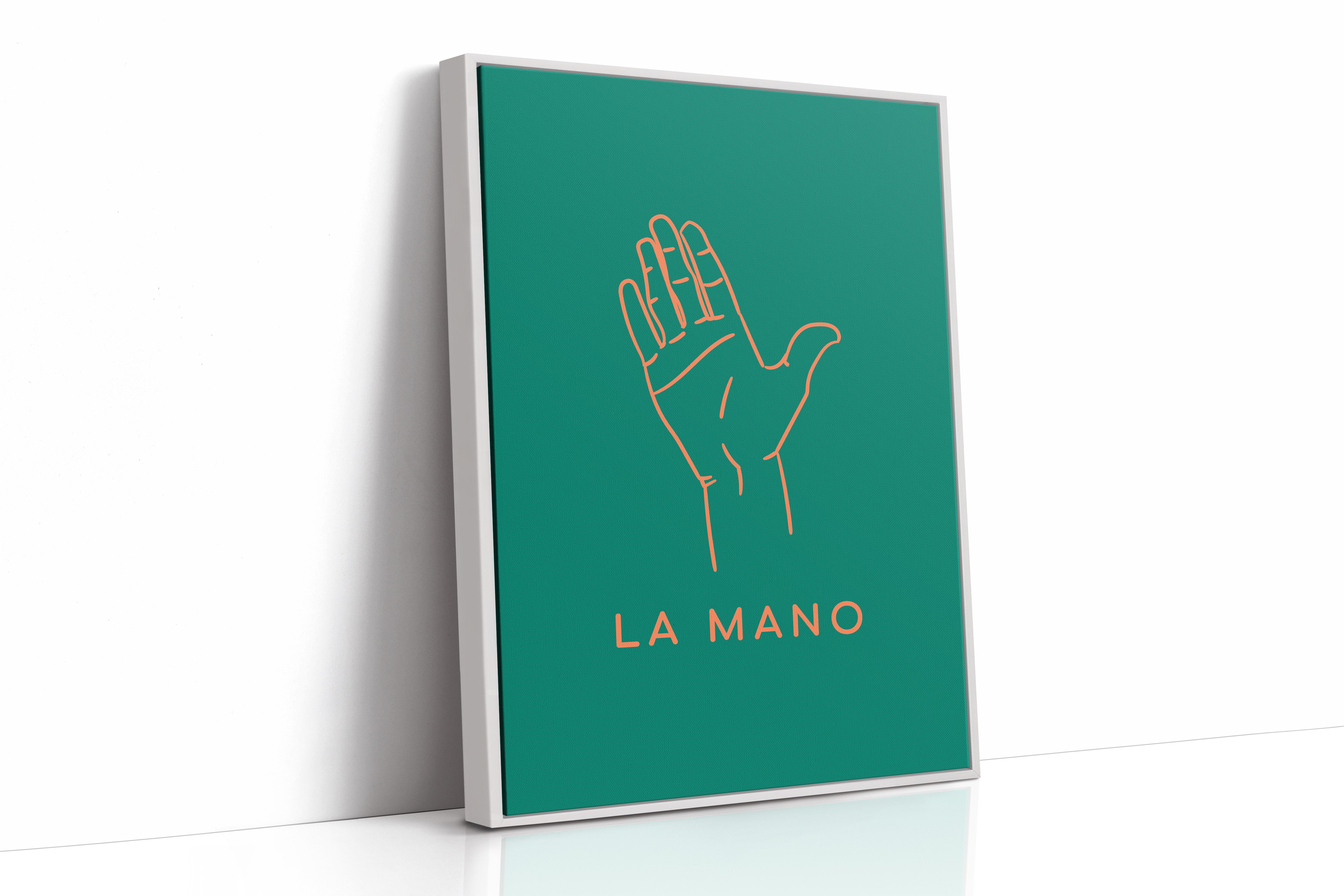 A single upraised hand emerges in delicate coral lines against deep emerald, speaking a universal language of connection and presence. This piece from our Contemporary collection marries minimalist design with profound symbolic resonance. The simple yet powerful linework creates a striking silhouette, while the contrasting warm and cool tones dance in perfect harmony. The Spanish text 'LA MANO' anchors the composition with cultural depth and meaning. This statement piece commands attention in modern living spaces, especially in studies, meditation rooms, or creative workspaces where its message of human connection can inspire daily reflection.