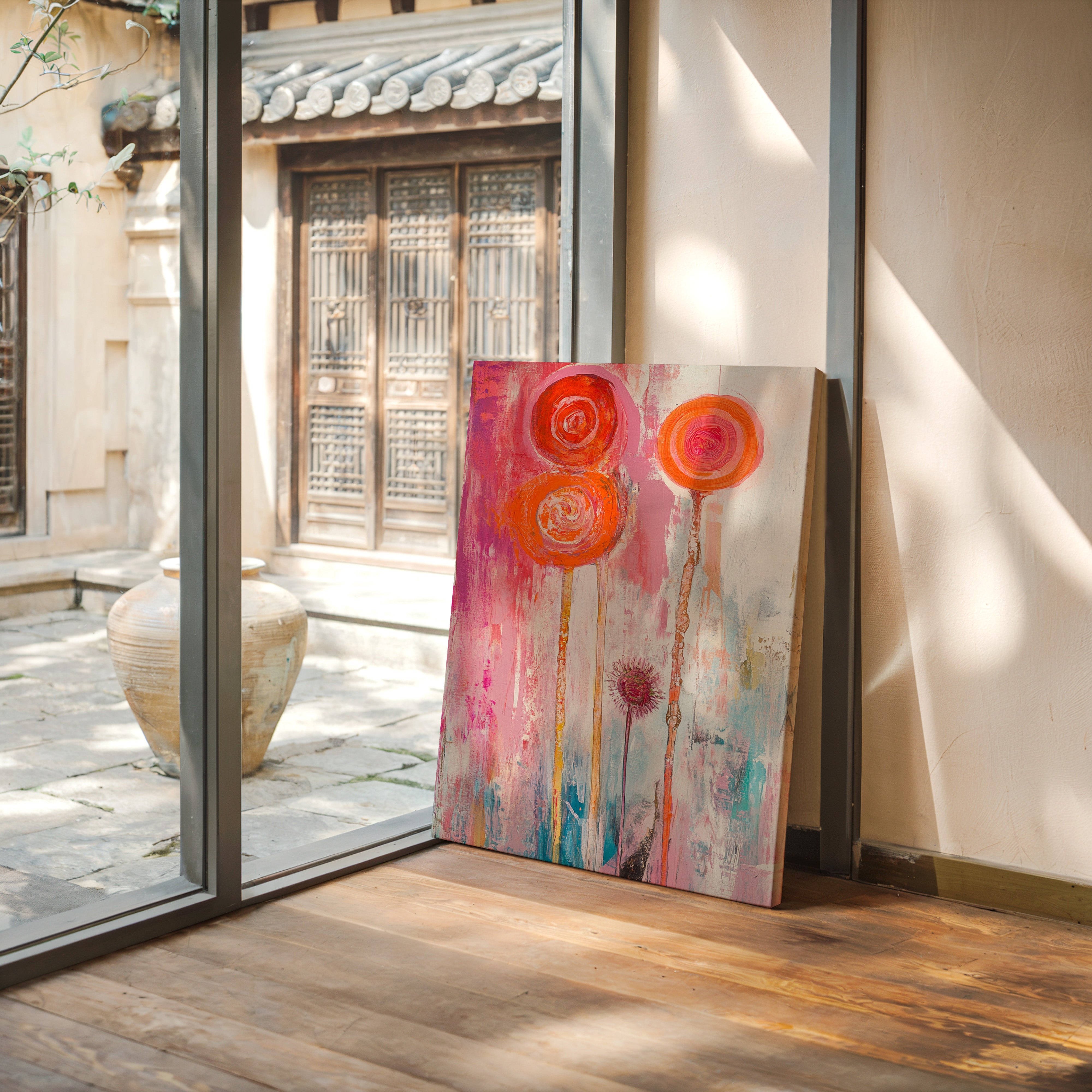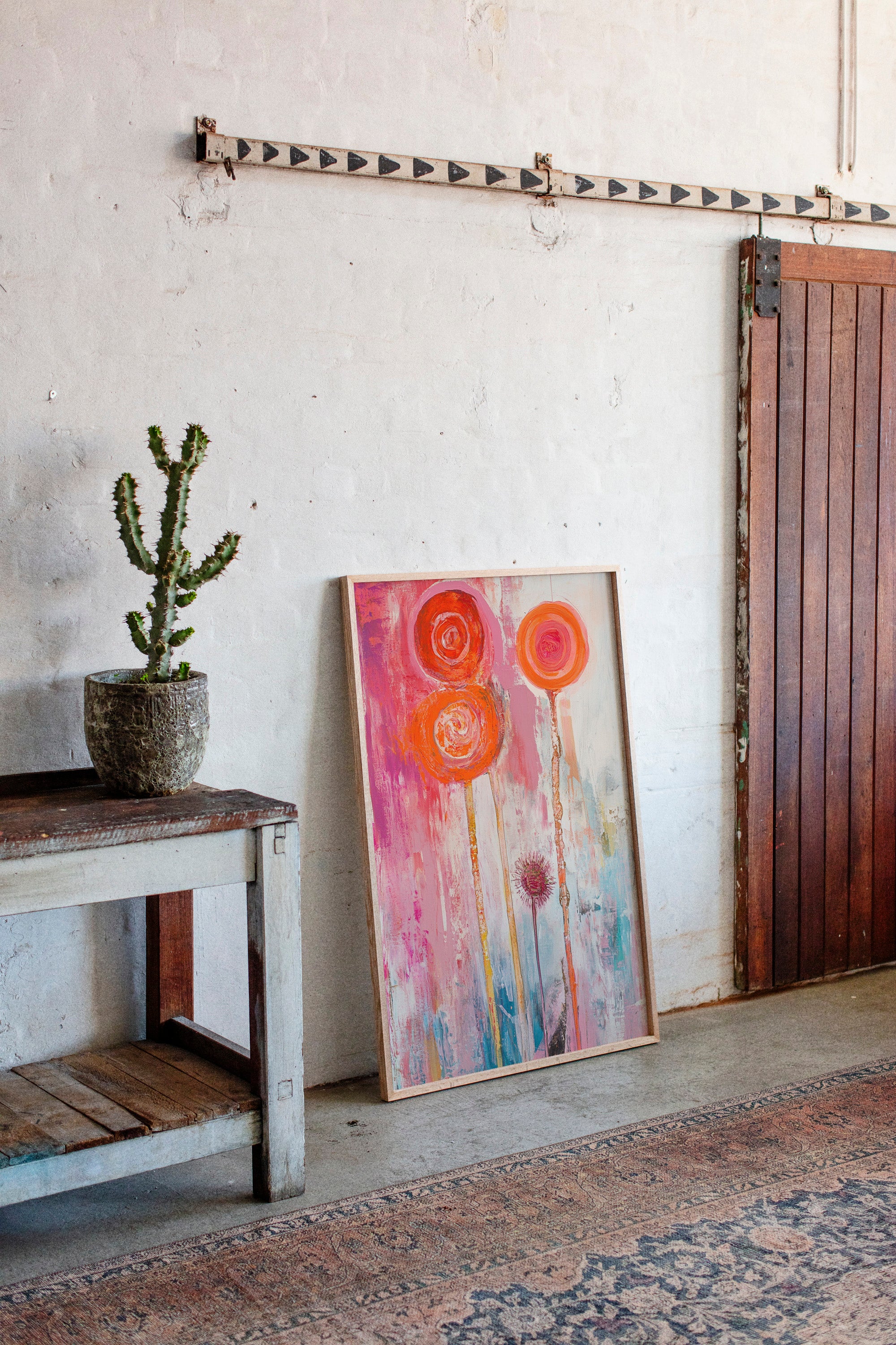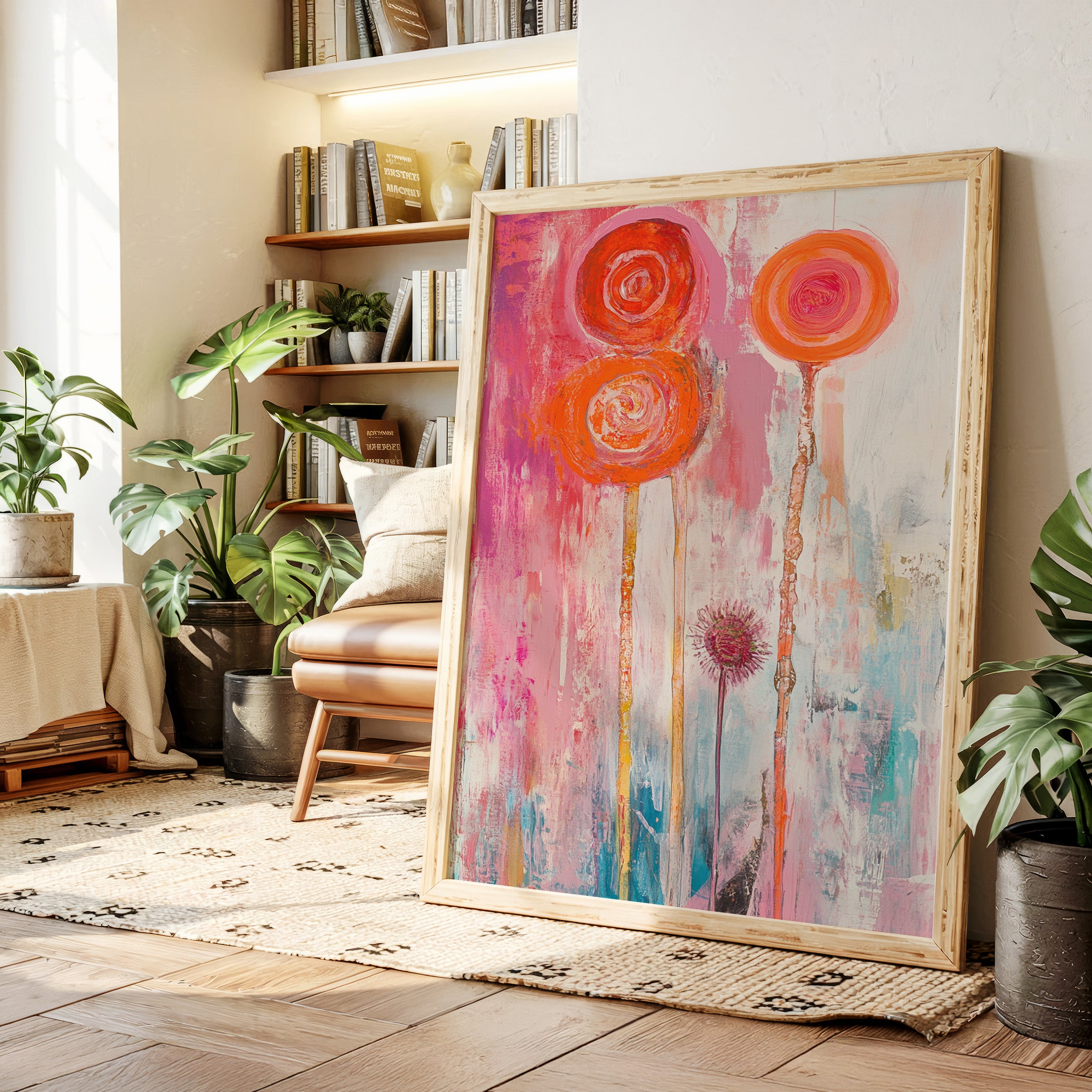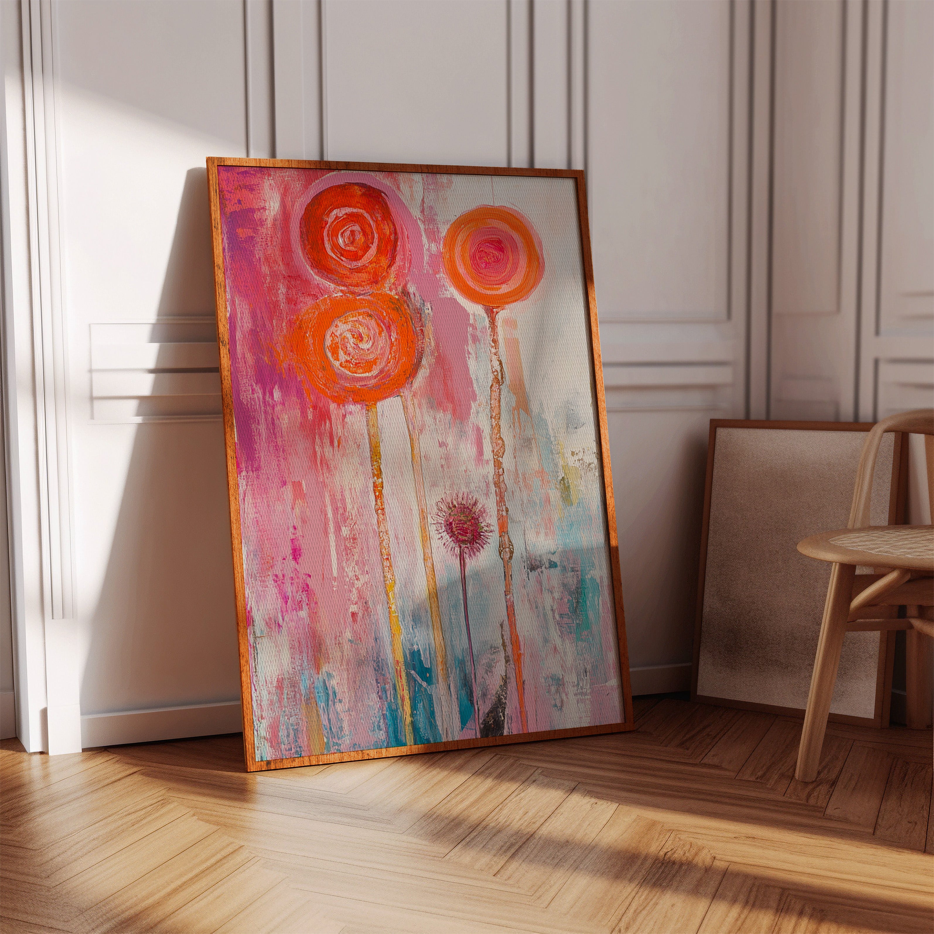 Whimsical circular blooms burst with vibrant coral and orange energy against a dreamy, watercolor sky. The textured strokes create a sense of movement, as if these abstract flowers are swaying to their own rhythm. A delicate purple thistle adds an unexpected touch of wildness to the composition, while the background shifts from soft pink to misty turquoise like a summer storm clearing. This piece captures the playful spirit of modern abstract botanical art, where reality meets imagination in a dance of color and form. Perfect for bringing a splash of joyful energy to contemporary spaces, especially in dining rooms or creative areas where its uplifting presence can inspire conversation and creativity.