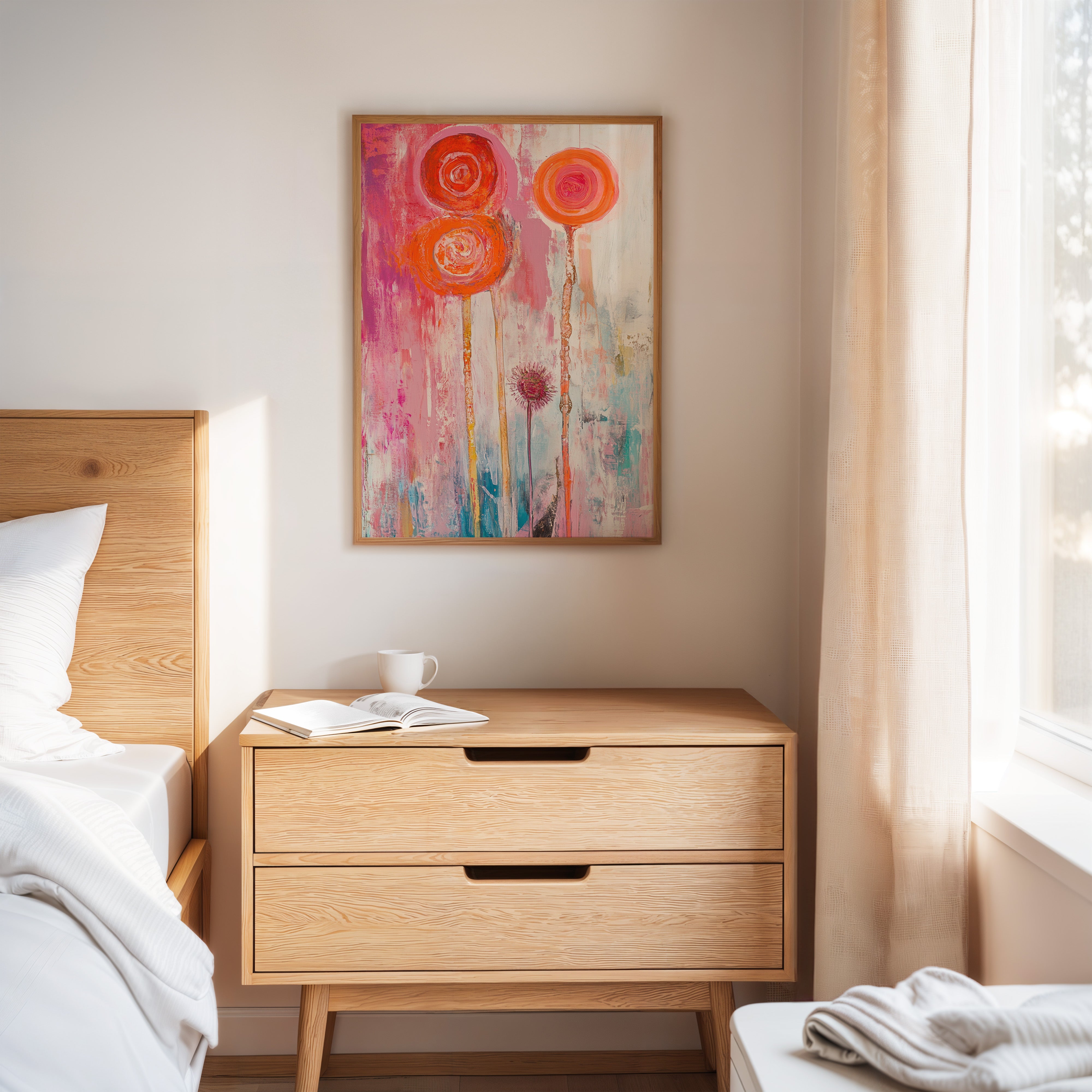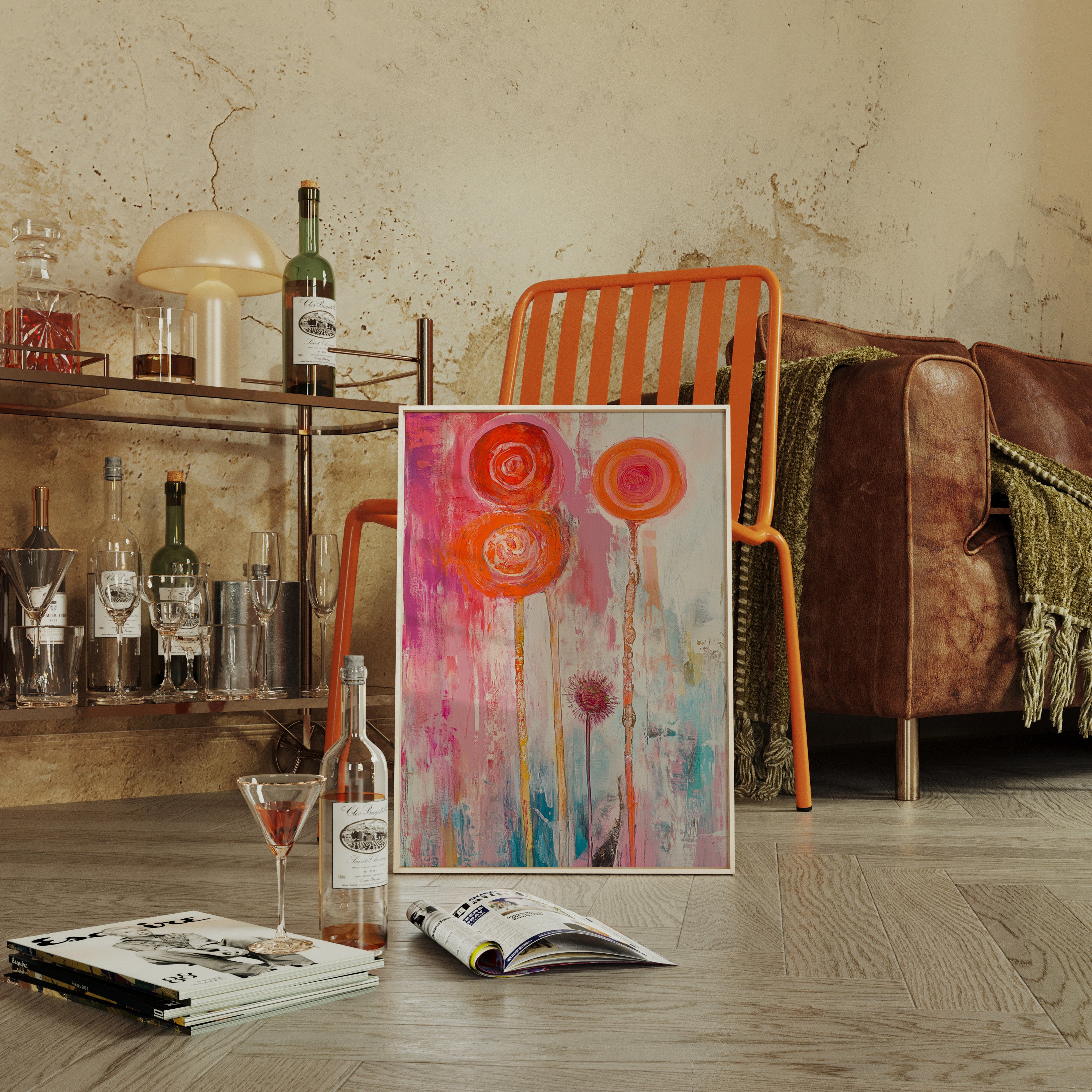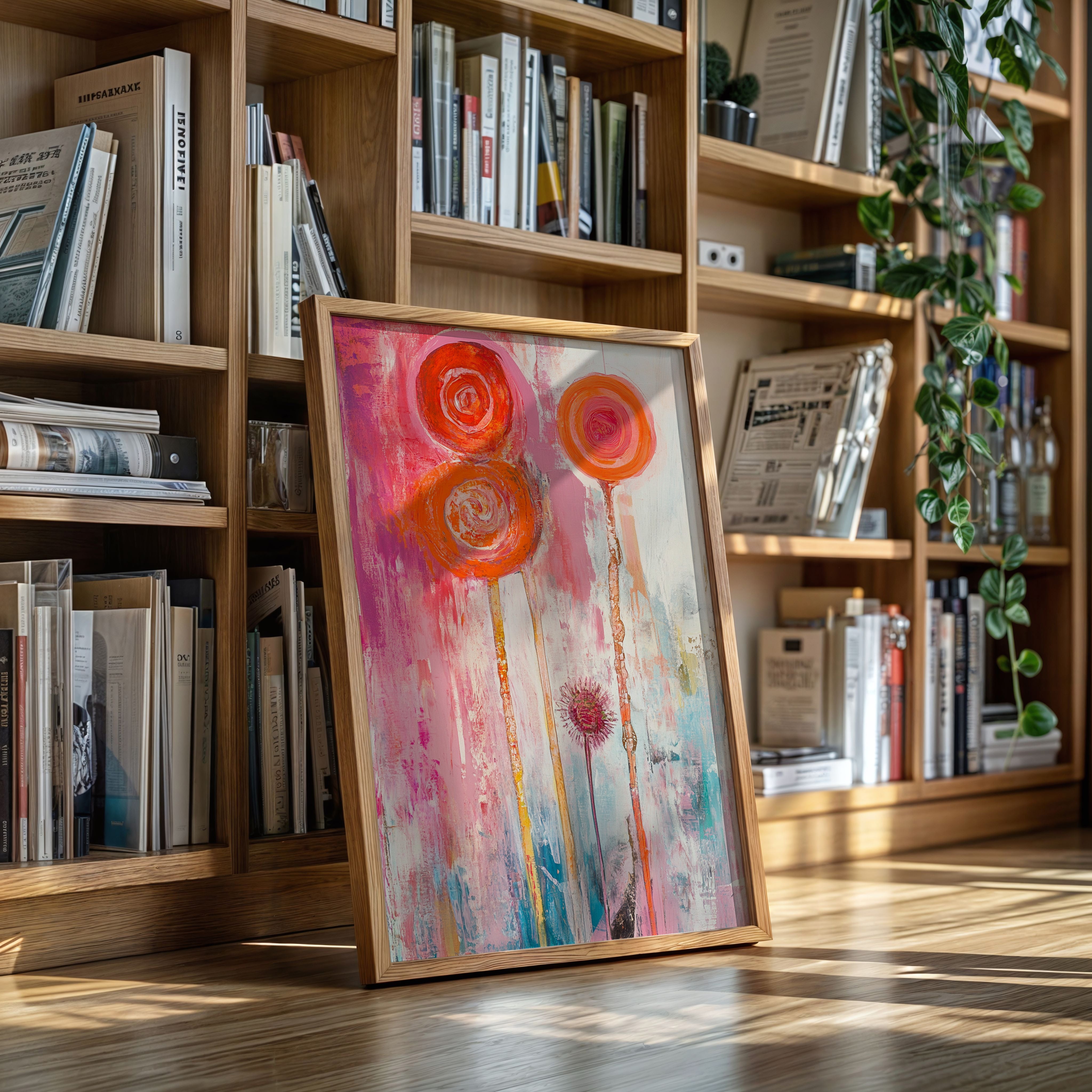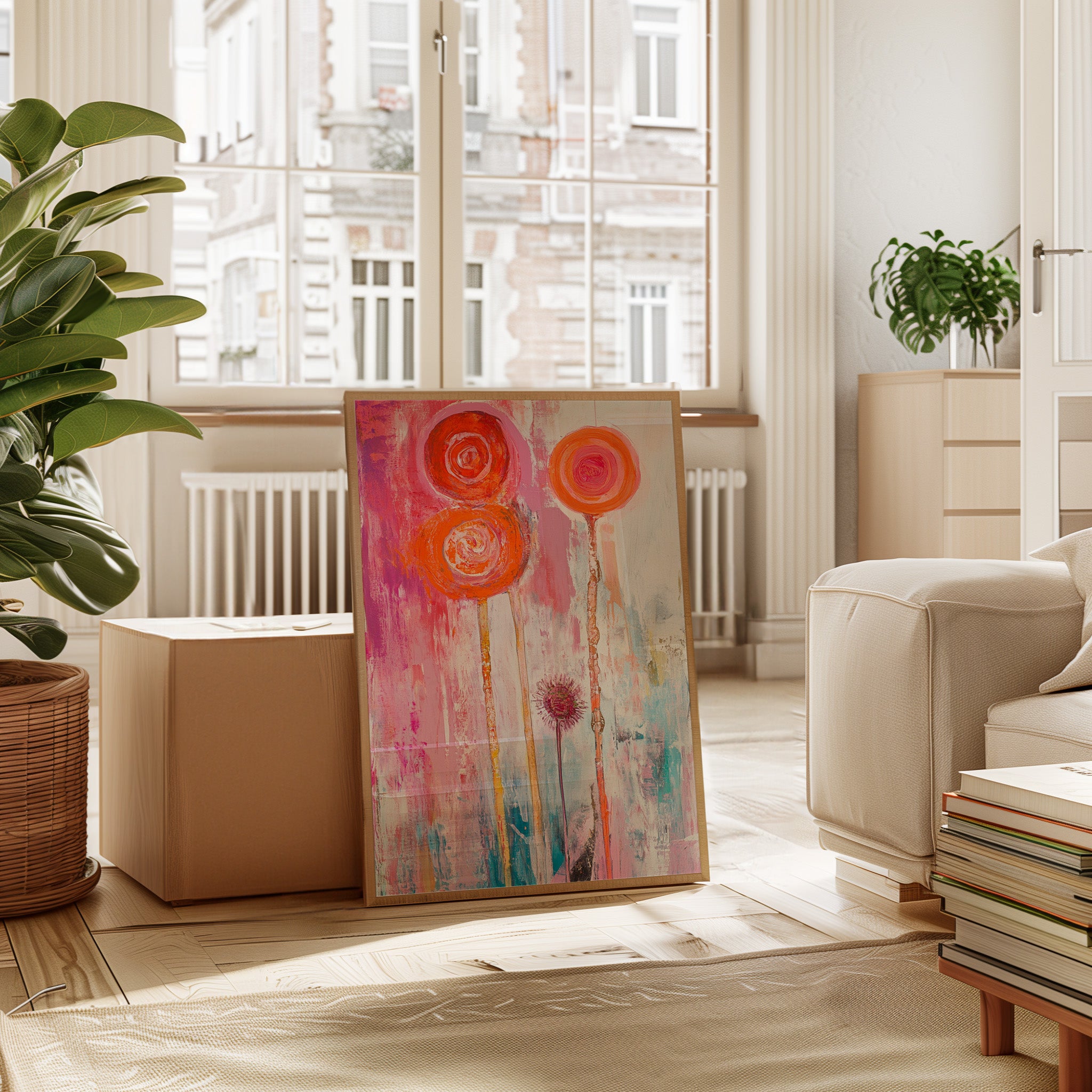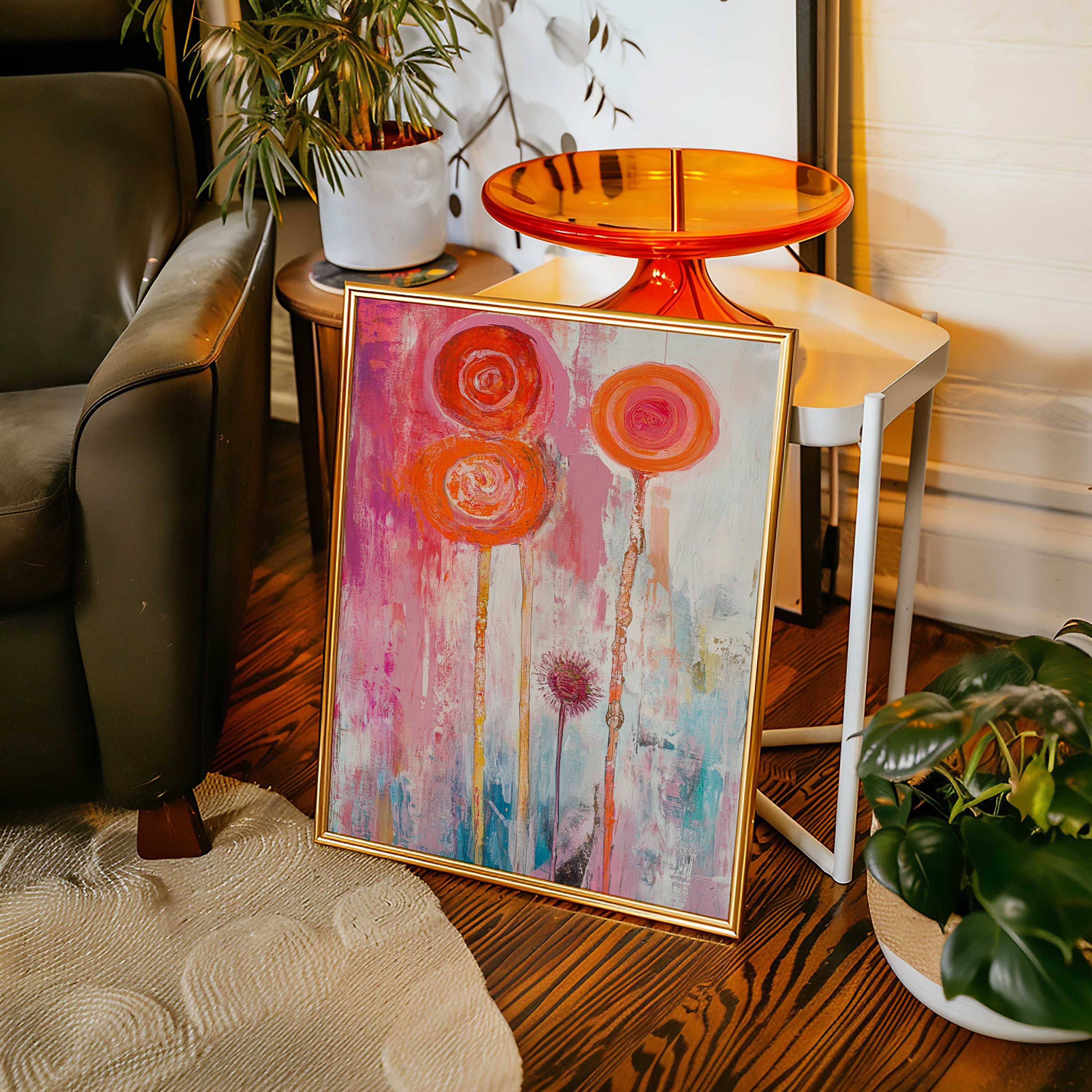 Whimsical circular blooms burst with vibrant coral and orange energy against a dreamy, watercolor sky. The textured strokes create a sense of movement, as if these abstract flowers are swaying to their own rhythm. A delicate purple thistle adds an unexpected touch of wildness to the composition, while the background shifts from soft pink to misty turquoise like a summer storm clearing. This piece captures the playful spirit of modern abstract botanical art, where reality meets imagination in a dance of color and form. Perfect for bringing a splash of joyful energy to contemporary spaces, especially in dining rooms or creative areas where its uplifting presence can inspire conversation and creativity.