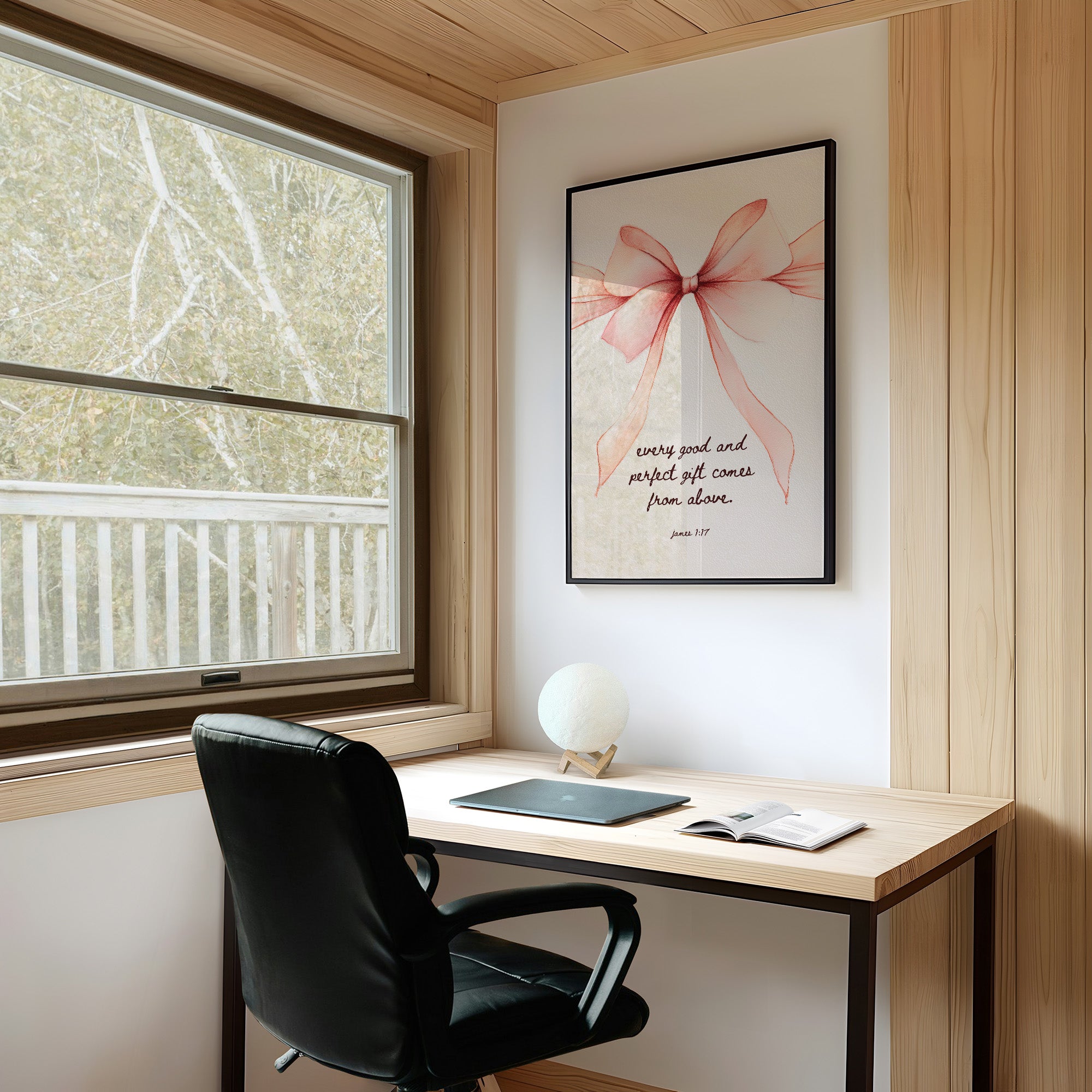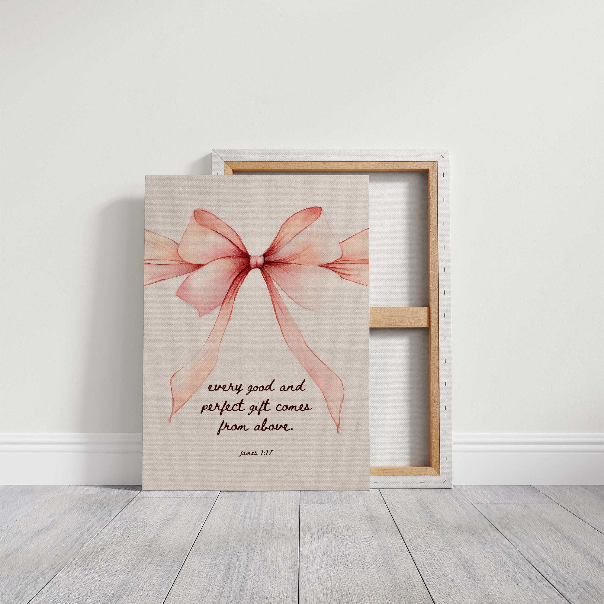 Morning light caresses a delicate watercolor card, its blush-pink ribbon unfurling like a gentle invitation. The translucent coral bow floats above elegant script, anchoring a timeless verse from James 1:17 that speaks of divine gifts and grace. Resting on weathered wooden slats, surrounded by hints of greenery and the rim of a waiting coffee cup, this moment feels both intimate and profound.