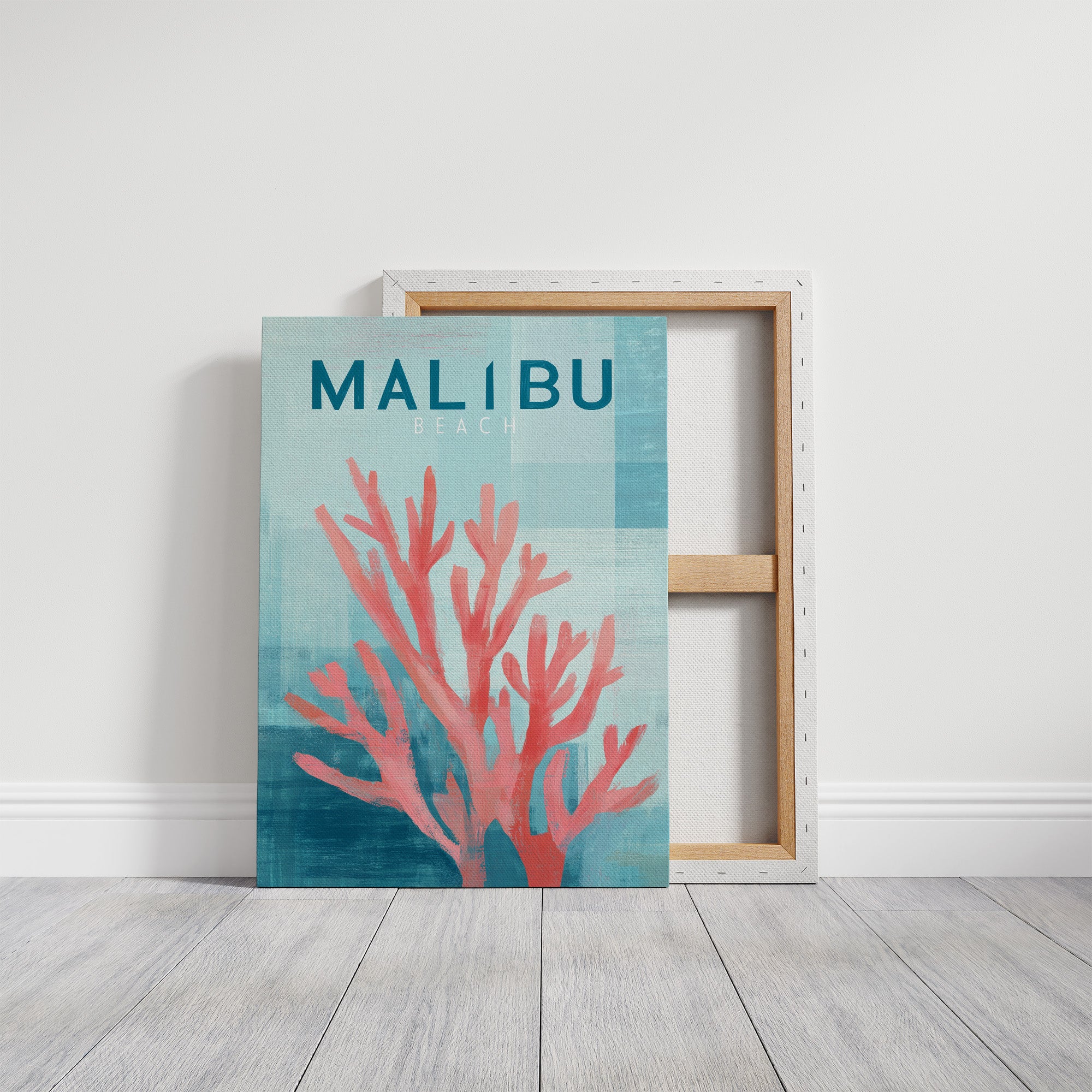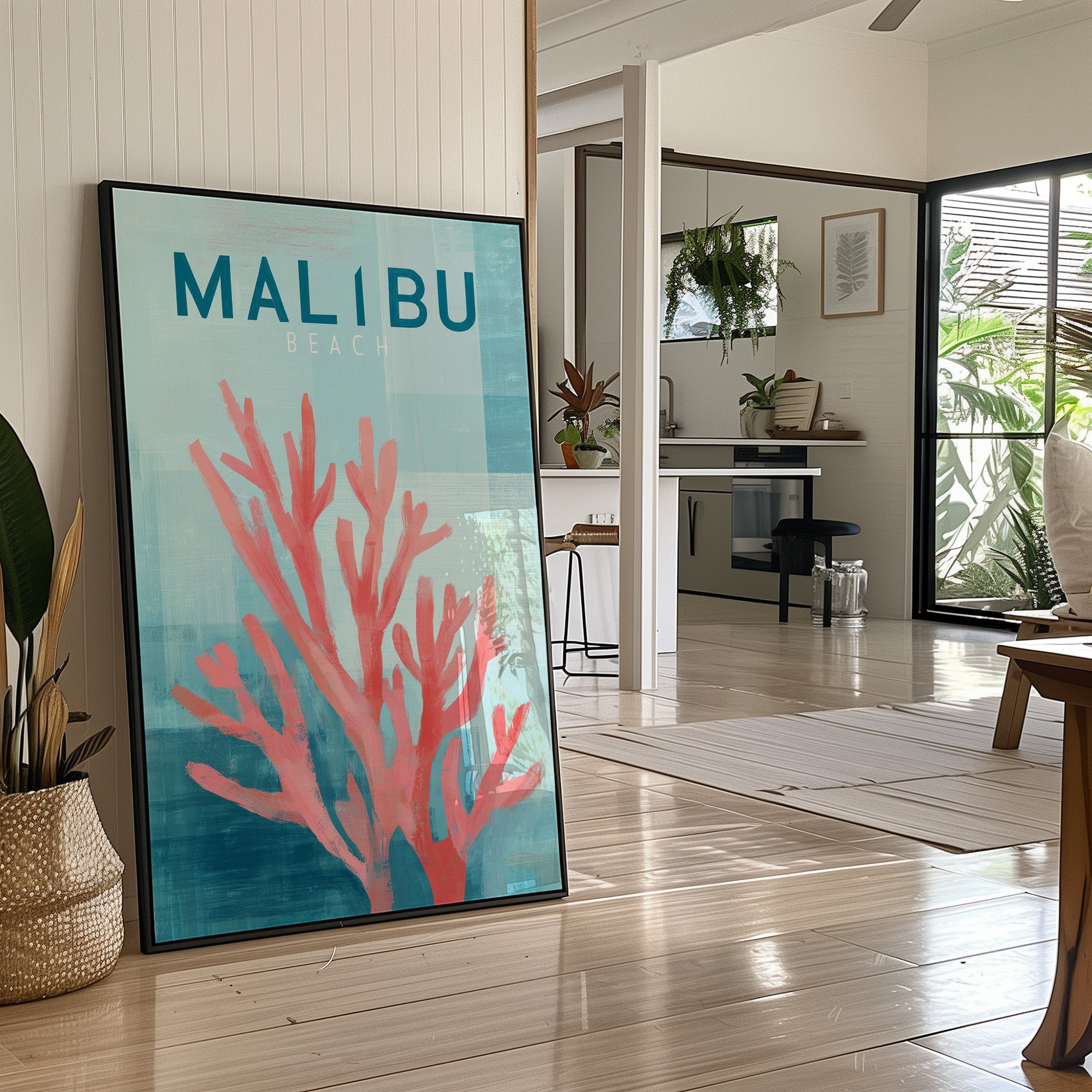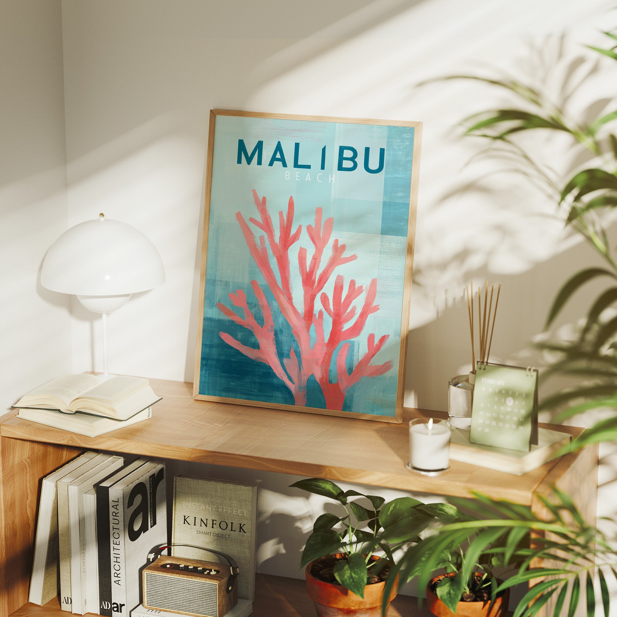 A modern coastal artwork  with a geometric, color-blocked pattern in varying shades of turquoise. "MALIBU BEACH" is prominently displayed at the top in bold teal lettering, creating a contemporary homage to California's iconic coastline. The minimalist composition evokes the tranquil beauty of underwater marine life while capturing the essence of coastal living.