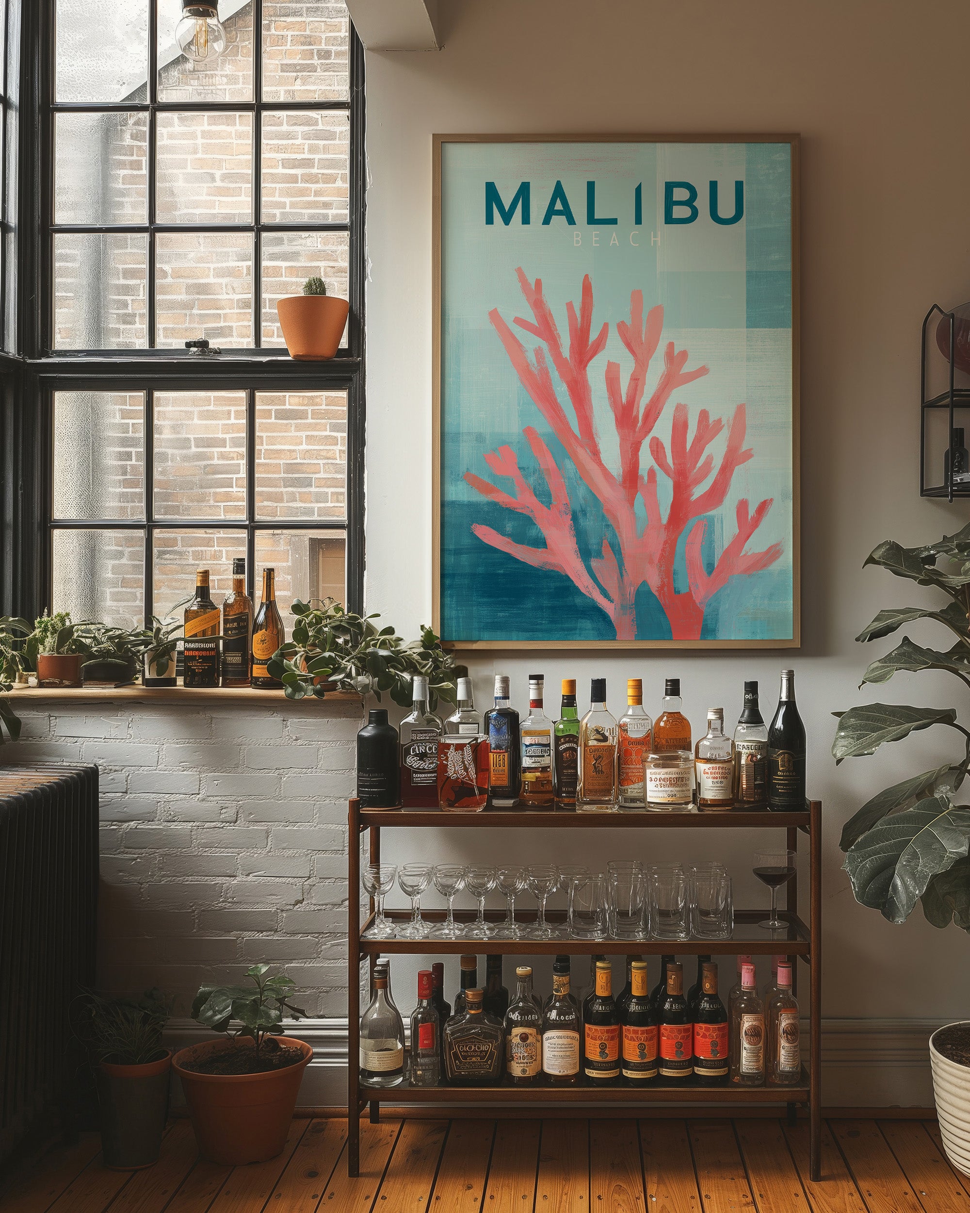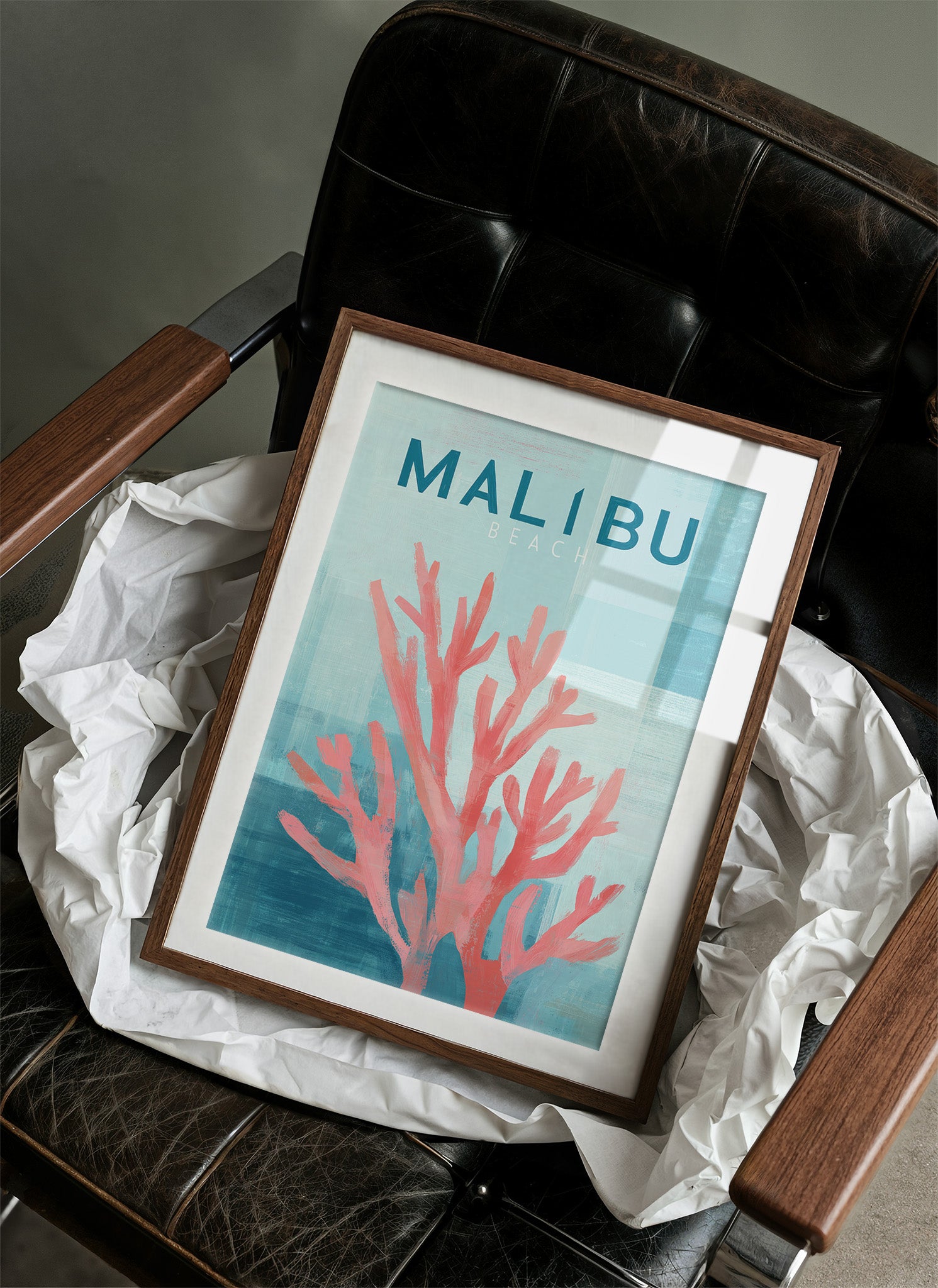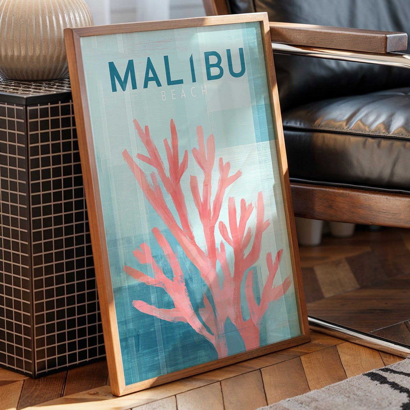 A modern coastal artwork  with a geometric, color-blocked pattern in varying shades of turquoise. "MALIBU BEACH" is prominently displayed at the top in bold teal lettering, creating a contemporary homage to California's iconic coastline. The minimalist composition evokes the tranquil beauty of underwater marine life while capturing the essence of coastal living.