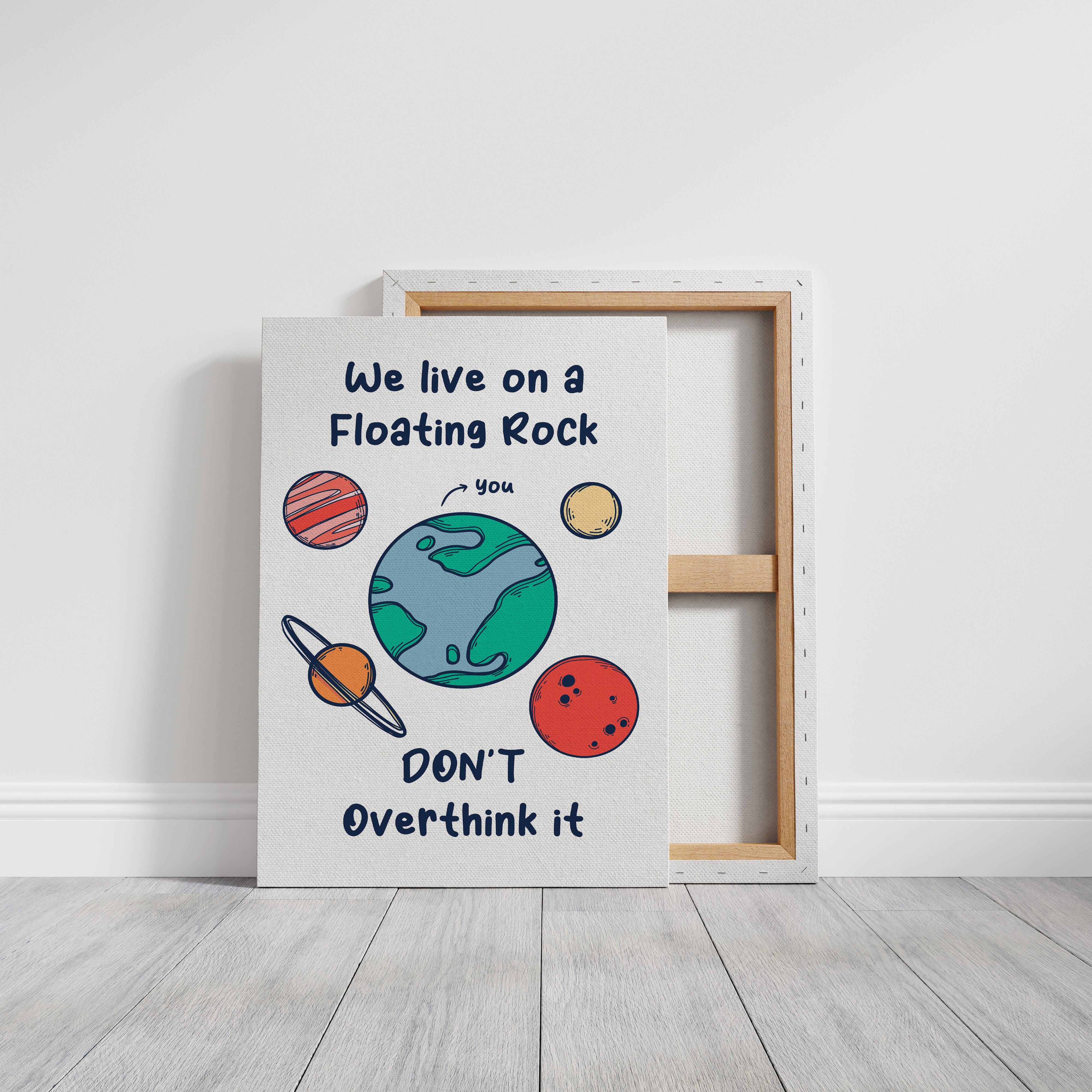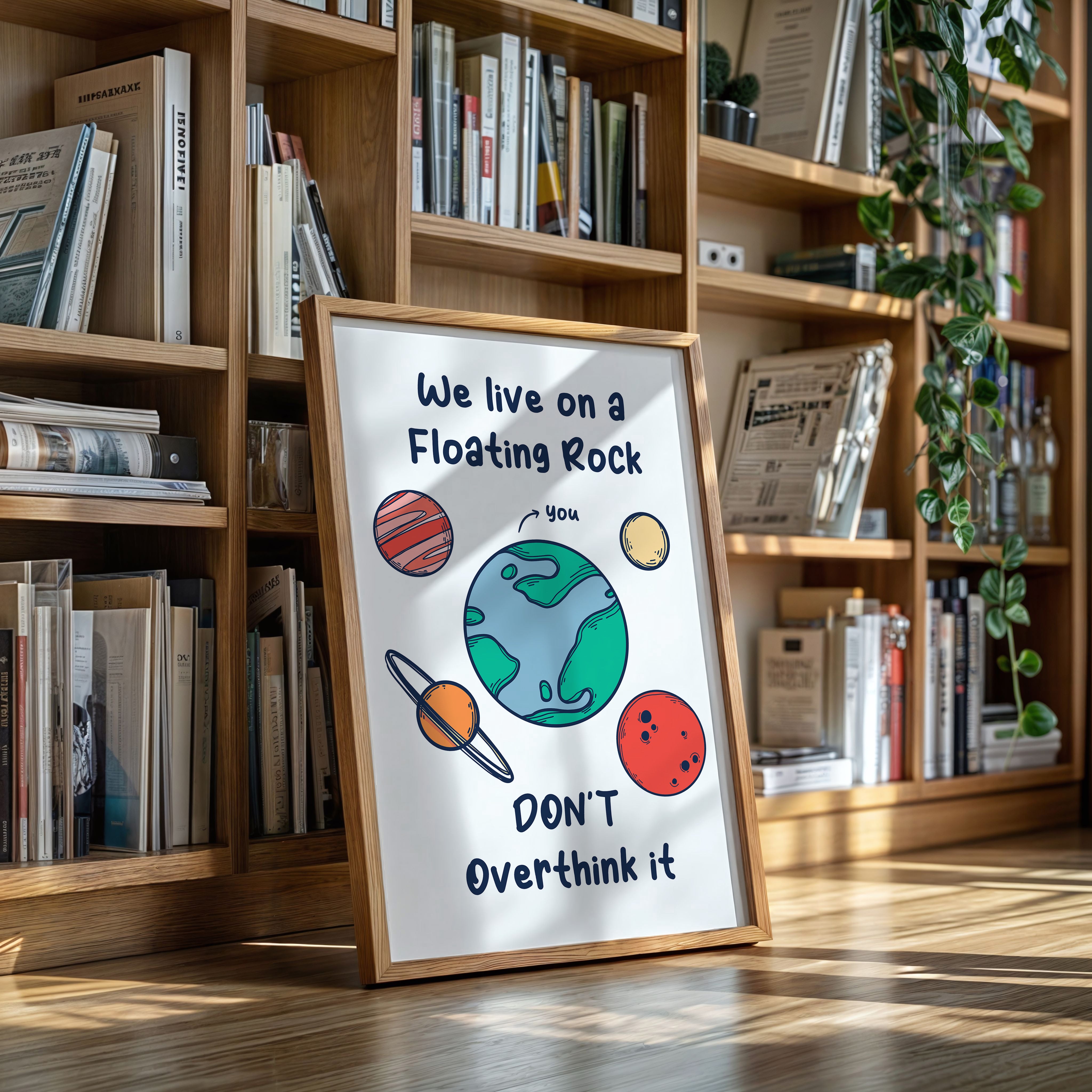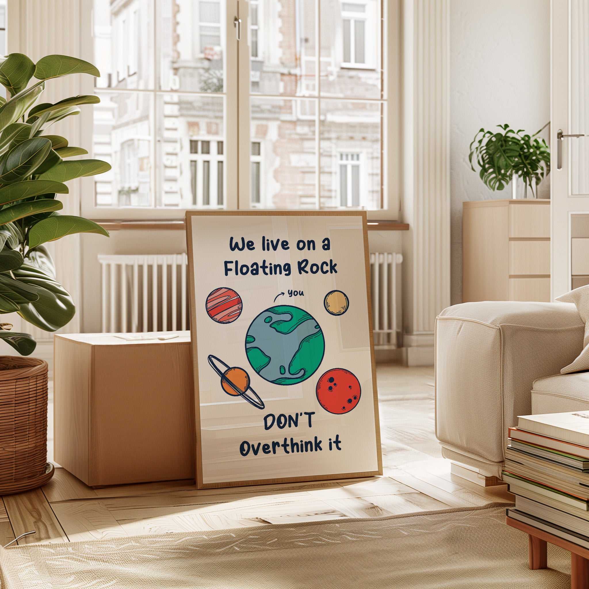 A playful reminder floats among whimsical planets, bringing perspective to our daily thoughts. This piece from our Contemporary collection pairs minimalist illustration with gentle wisdom. Hand-drawn celestial bodies dance around Earth in cheerful coral, turquoise, and navy hues, while clean typography delivers its message with a knowing wink. The composition balances cosmic wonder with down-to-earth humor, creating a delightful tension between the vast and the intimate. Perfect for a home office, reading nook, or any space where you need a gentle reminder to stay grounded while dreaming big. Let this piece be your daily dose of perspective with a smile.