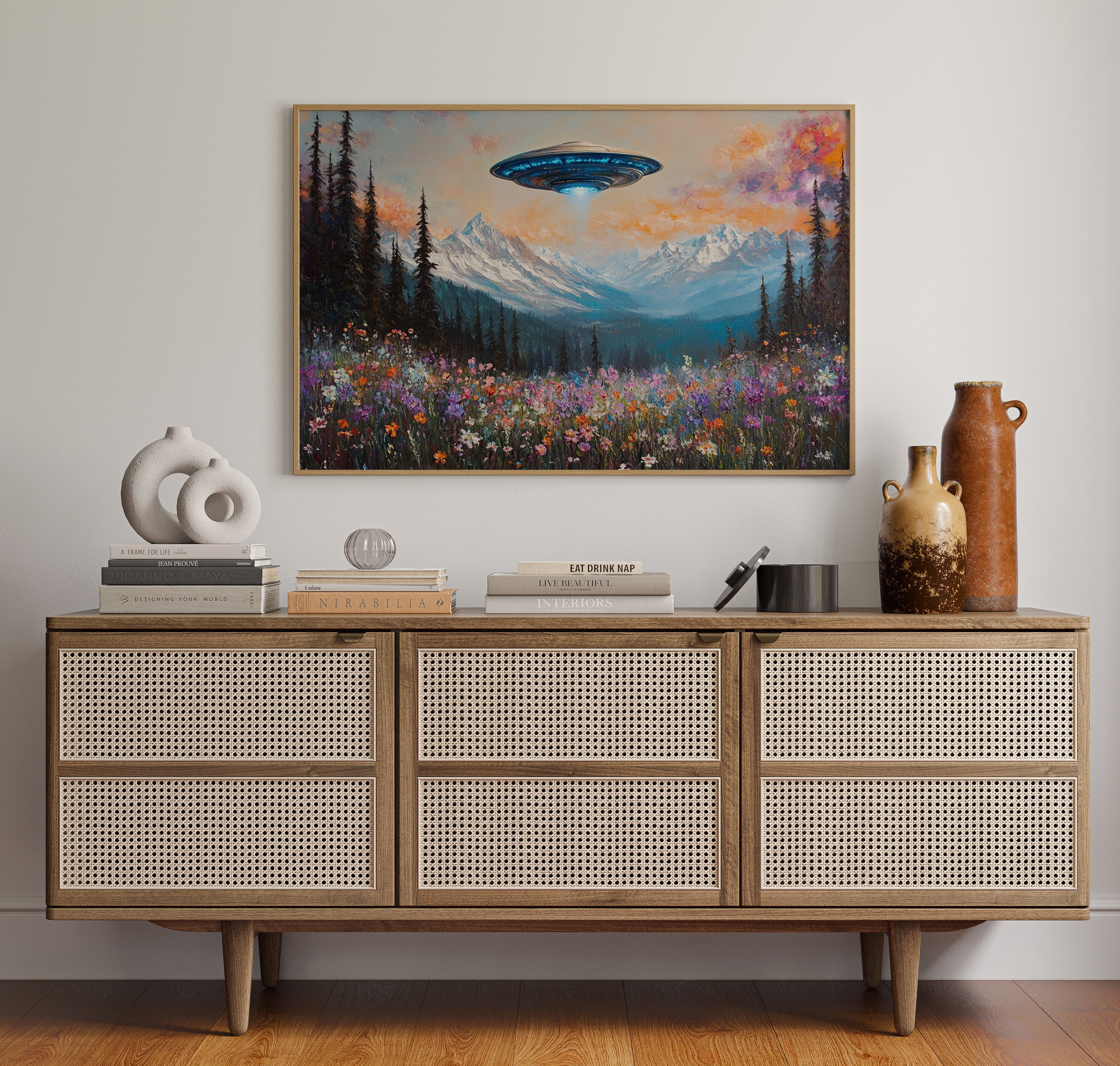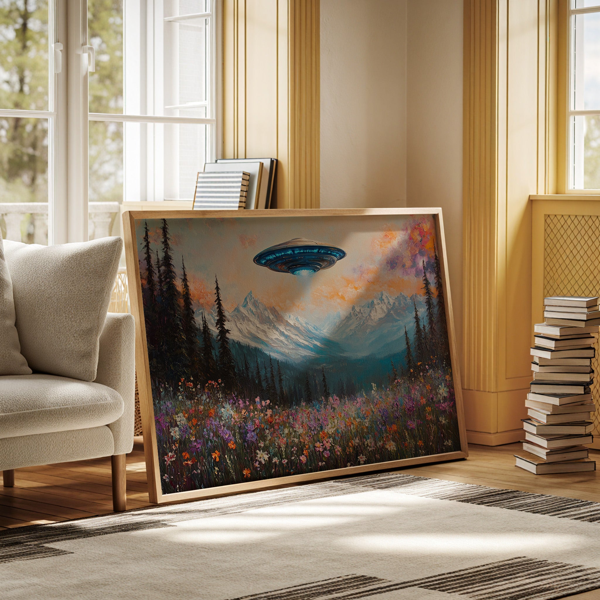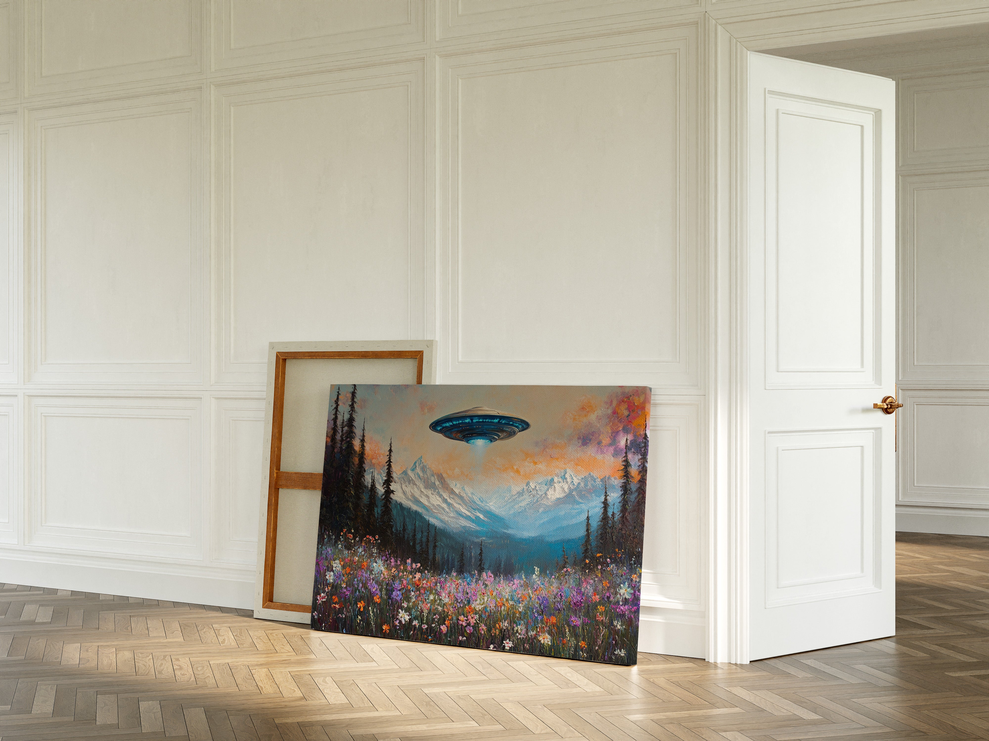 A mysterious metallic disc hovers silently above a pristine mountain landscape, its blue lights reflecting against the dusky orange sky. Below, a vibrant wildflower meadow stretches toward snow-capped peaks, creating a stunning juxtaposition of earthly beauty and otherworldly technology. The scene captures a moment where natural splendor meets science fiction - delicate purple and orange blooms dance in an alpine breeze while the UFO maintains its steady presence above the valley.