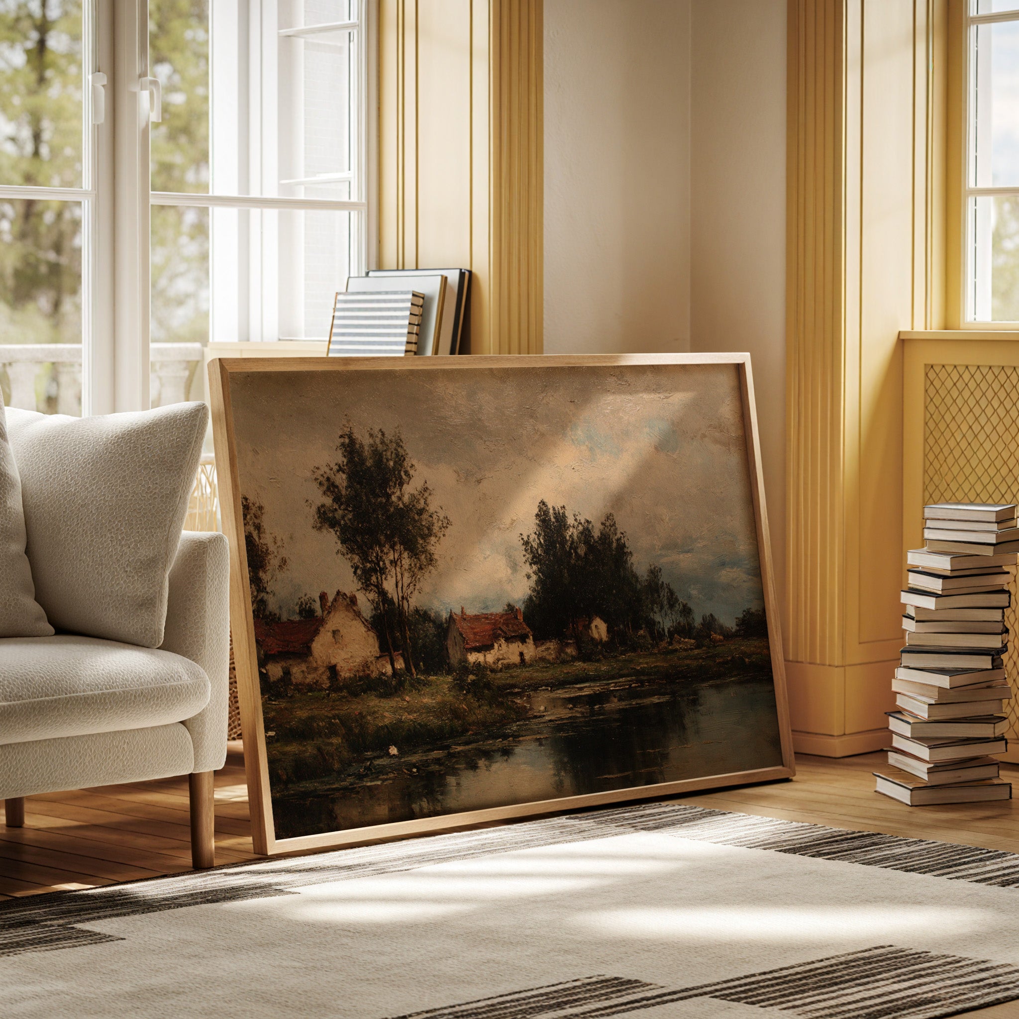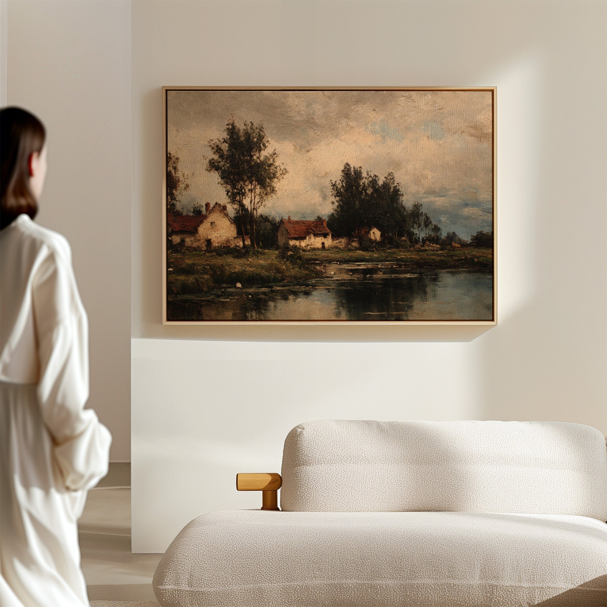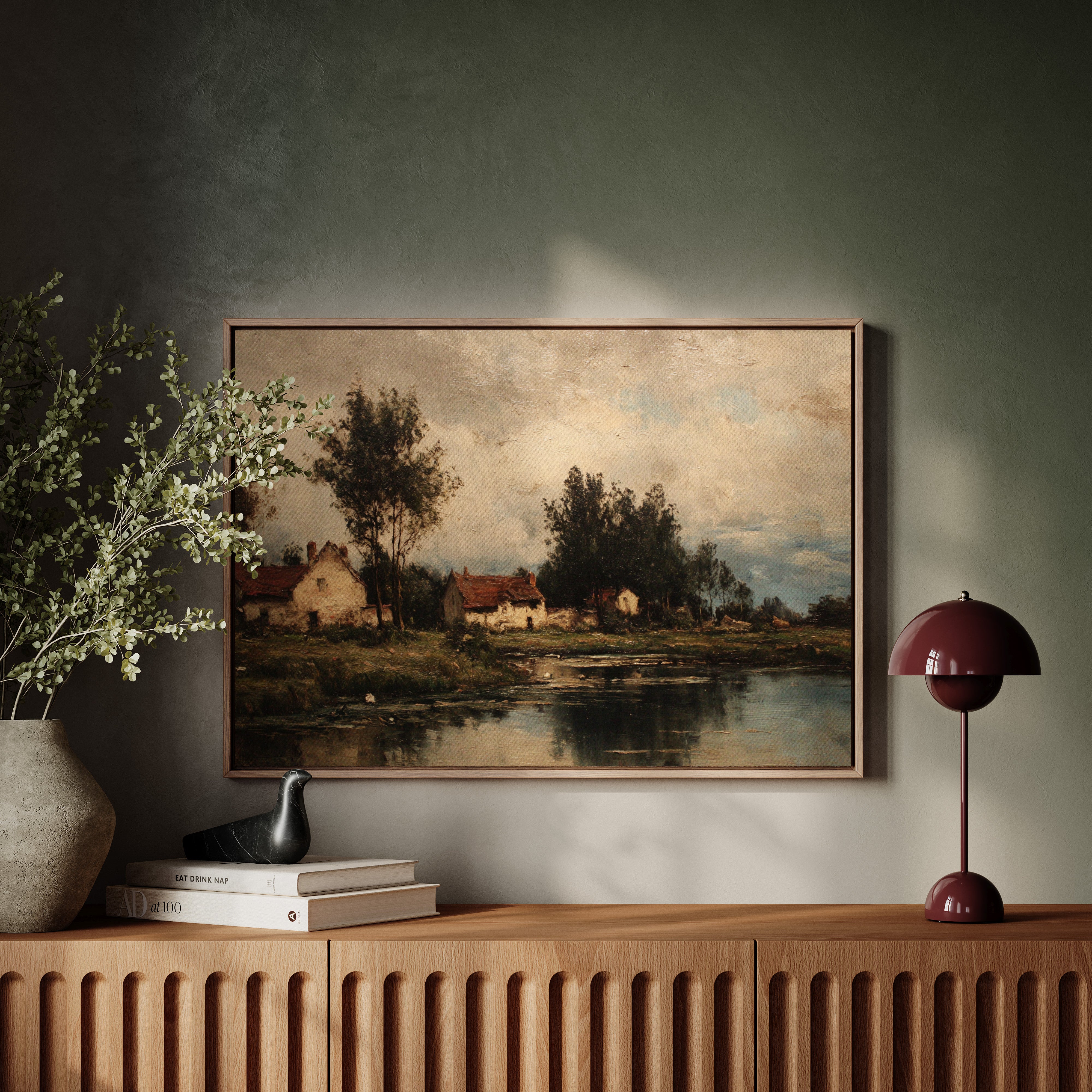 Time stands still along the peaceful riverbank, where weathered cottages with terracotta roofs huddle together like old friends sharing secrets. The moody sky above carries hints of approaching rain, while tall trees stand sentinel over the rustic scene. Rich impasto brushstrokes capture the textured walls of the whitewashed homes, their aged facades telling stories of generations past. The dark, reflective water creates a mirror world below, doubling the quiet drama of this pastoral moment. This contemplative piece brings timeless countryside charm to a study, reading nook, or any space seeking to evoke the tranquil essence of rural life.