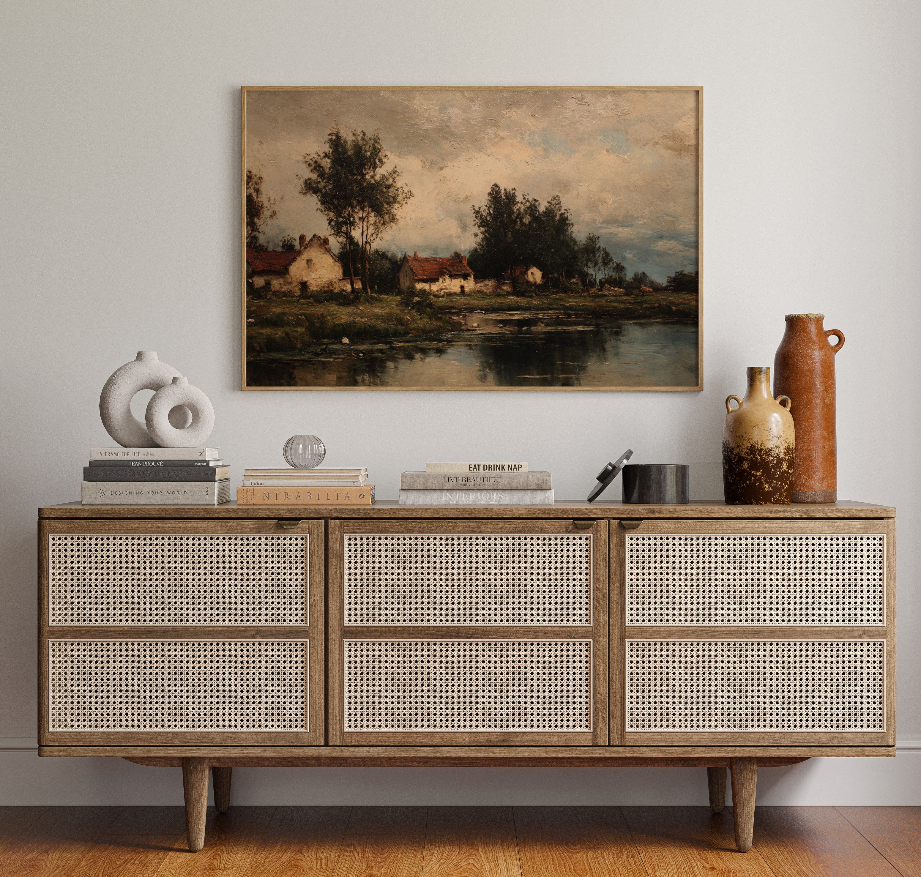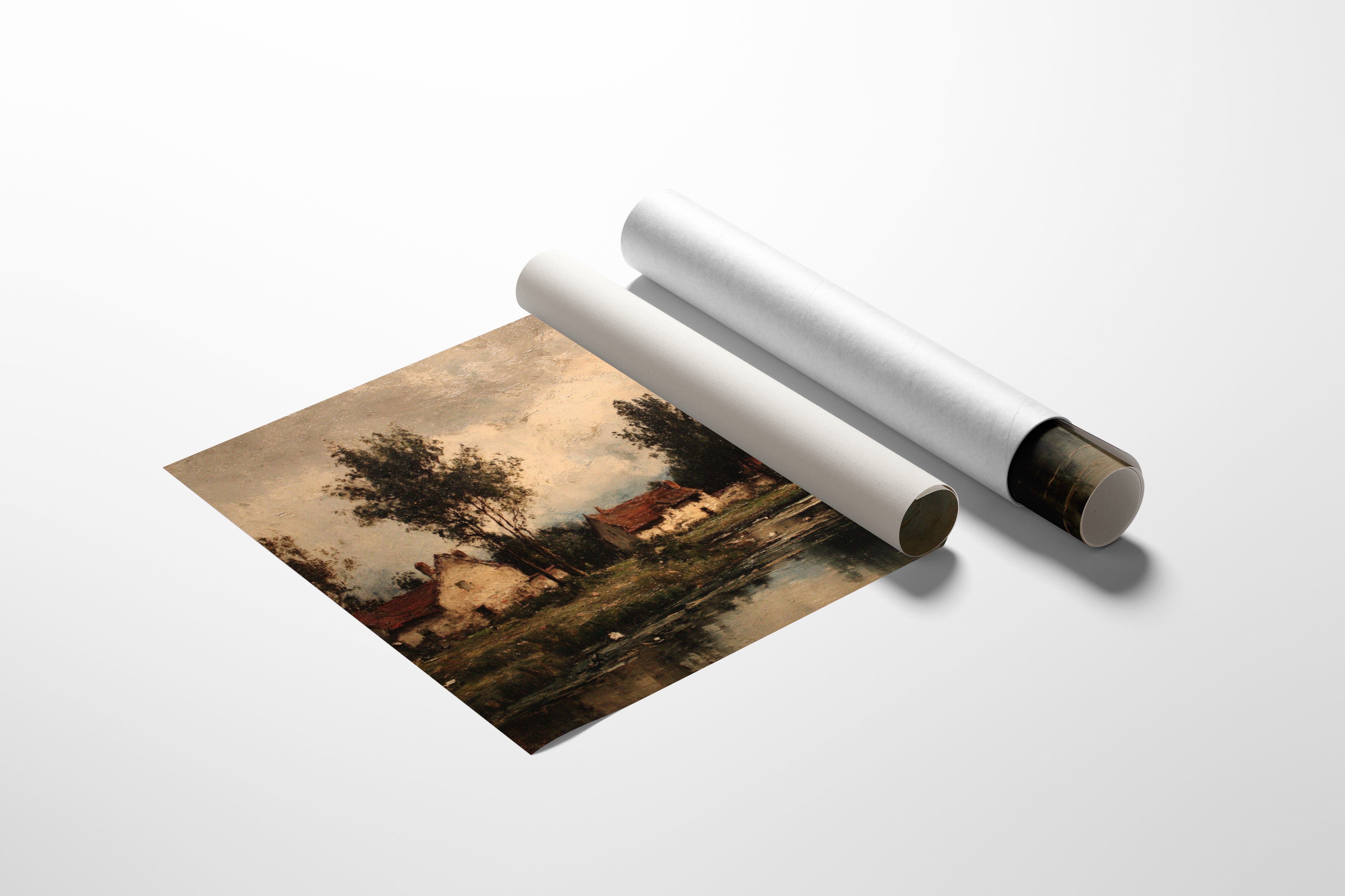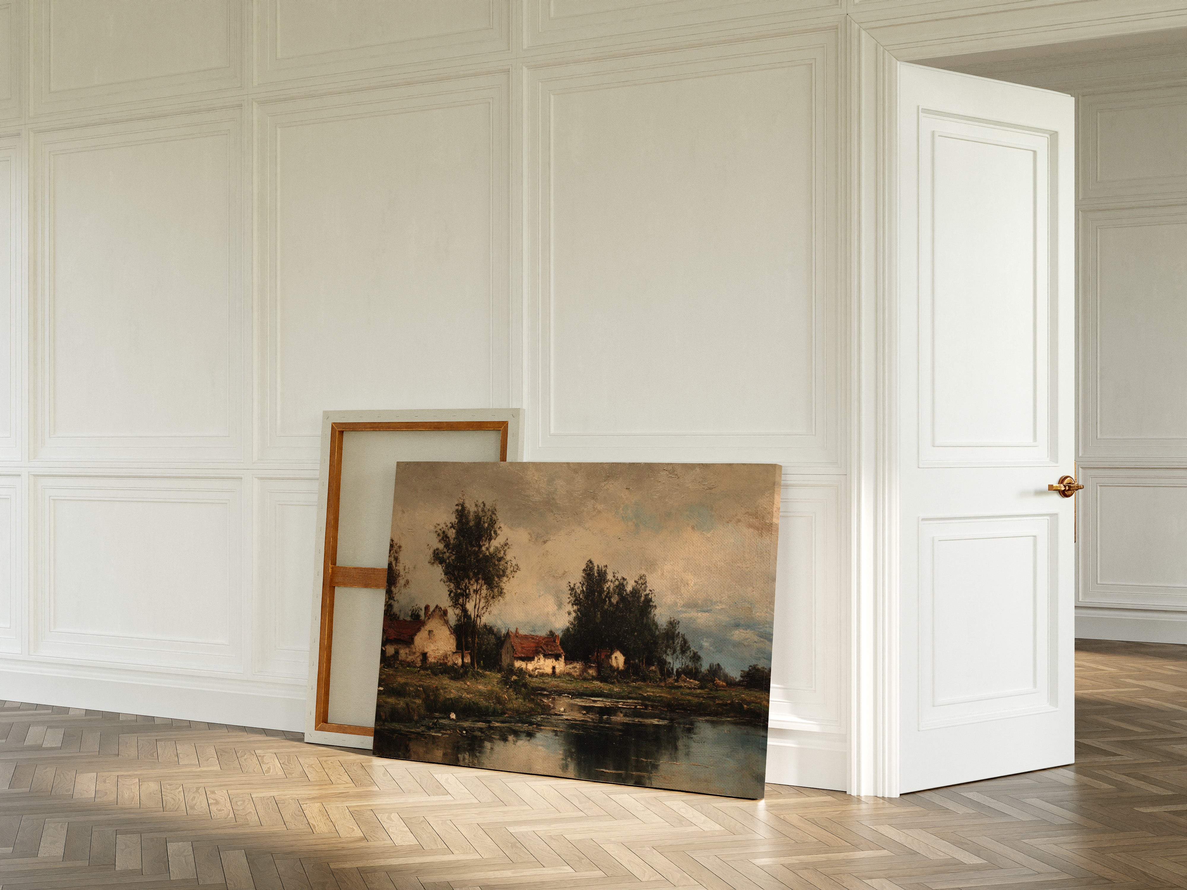 Time stands still along the peaceful riverbank, where weathered cottages with terracotta roofs huddle together like old friends sharing secrets. The moody sky above carries hints of approaching rain, while tall trees stand sentinel over the rustic scene. Rich impasto brushstrokes capture the textured walls of the whitewashed homes, their aged facades telling stories of generations past. The dark, reflective water creates a mirror world below, doubling the quiet drama of this pastoral moment. This contemplative piece brings timeless countryside charm to a study, reading nook, or any space seeking to evoke the tranquil essence of rural life.