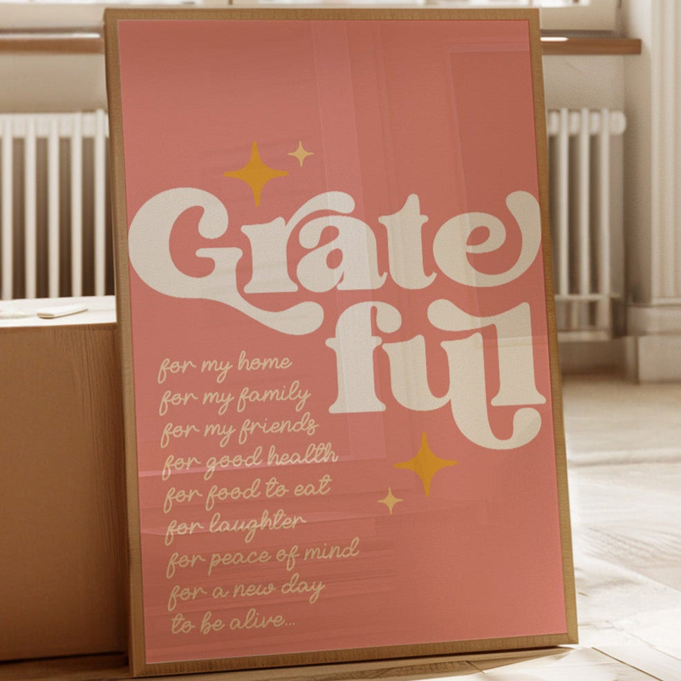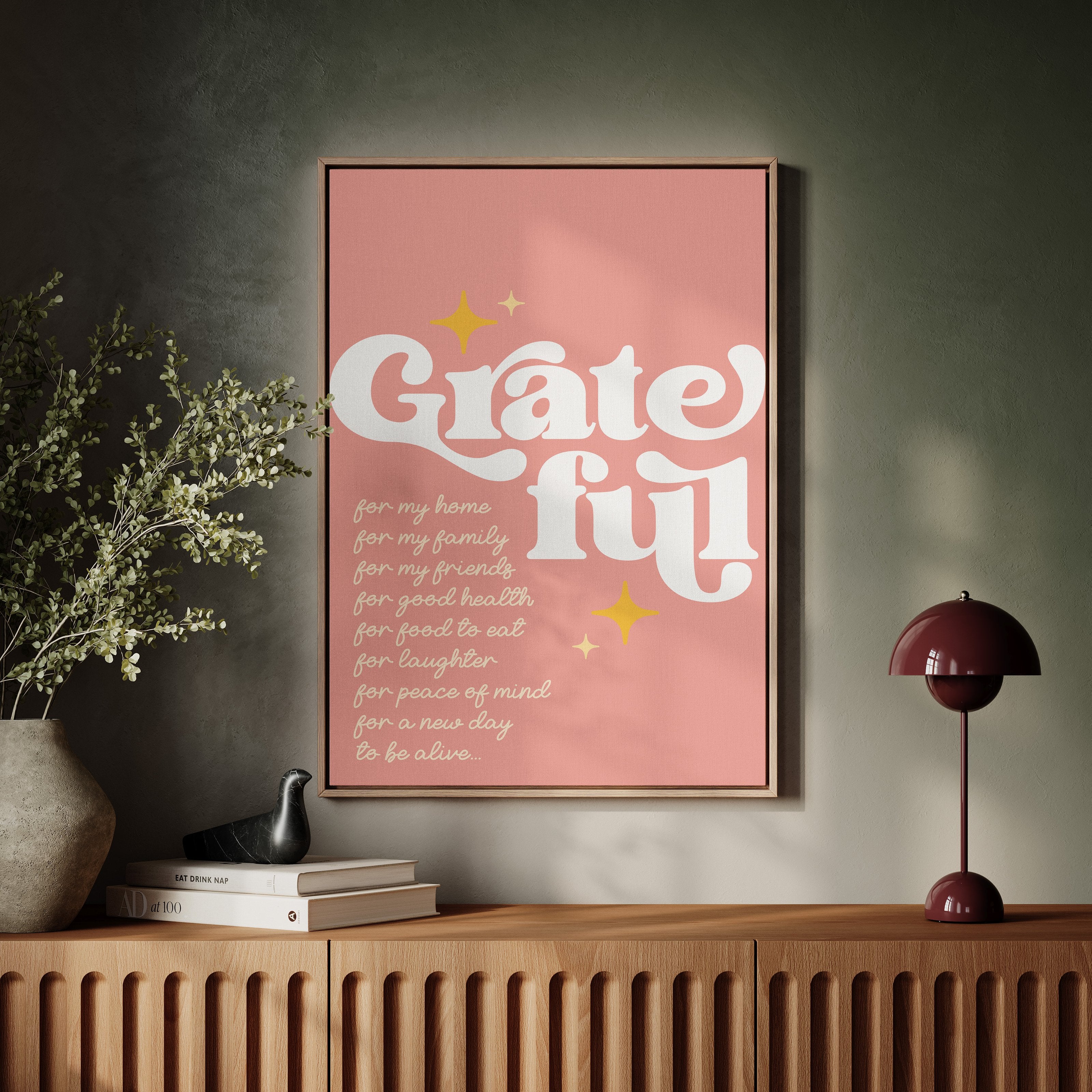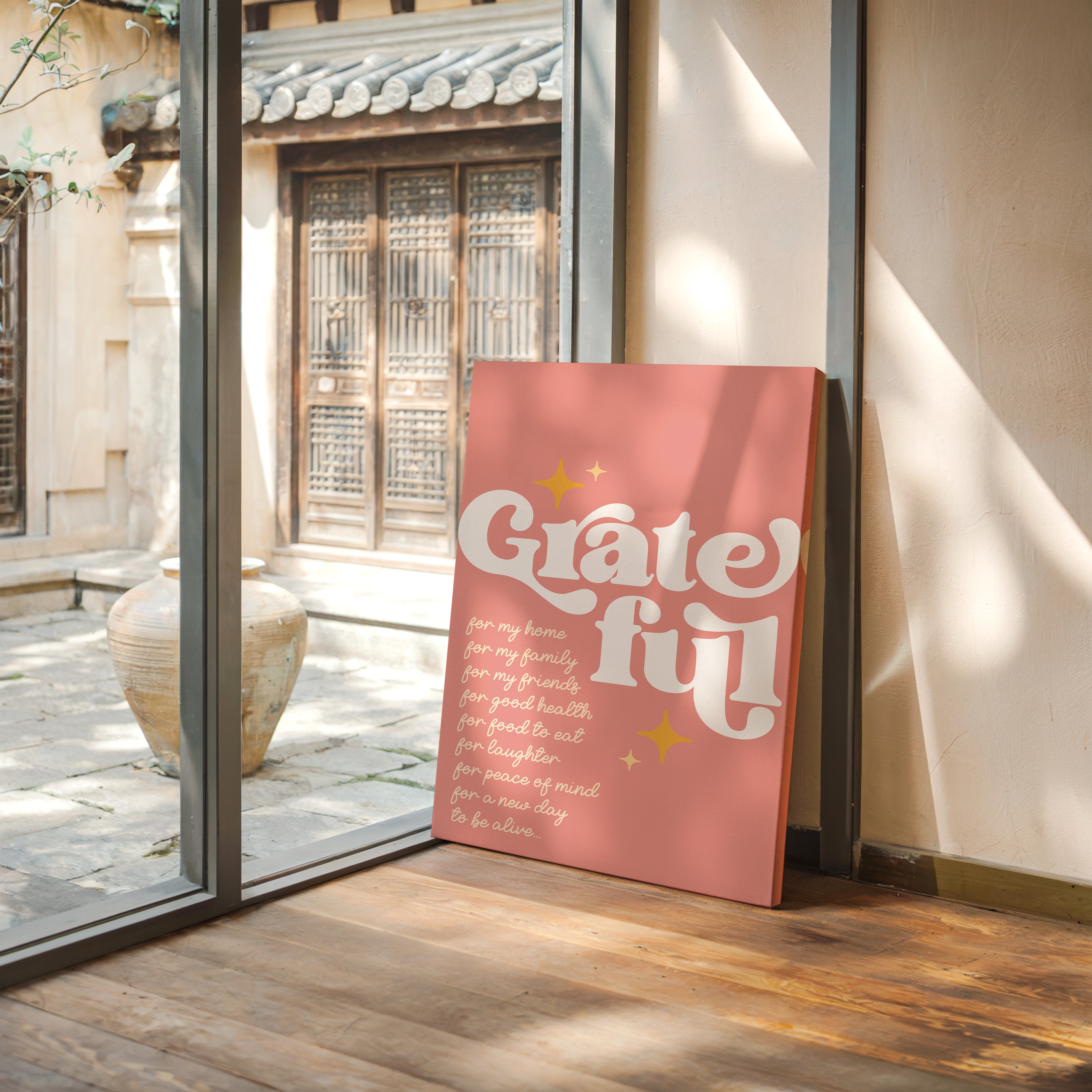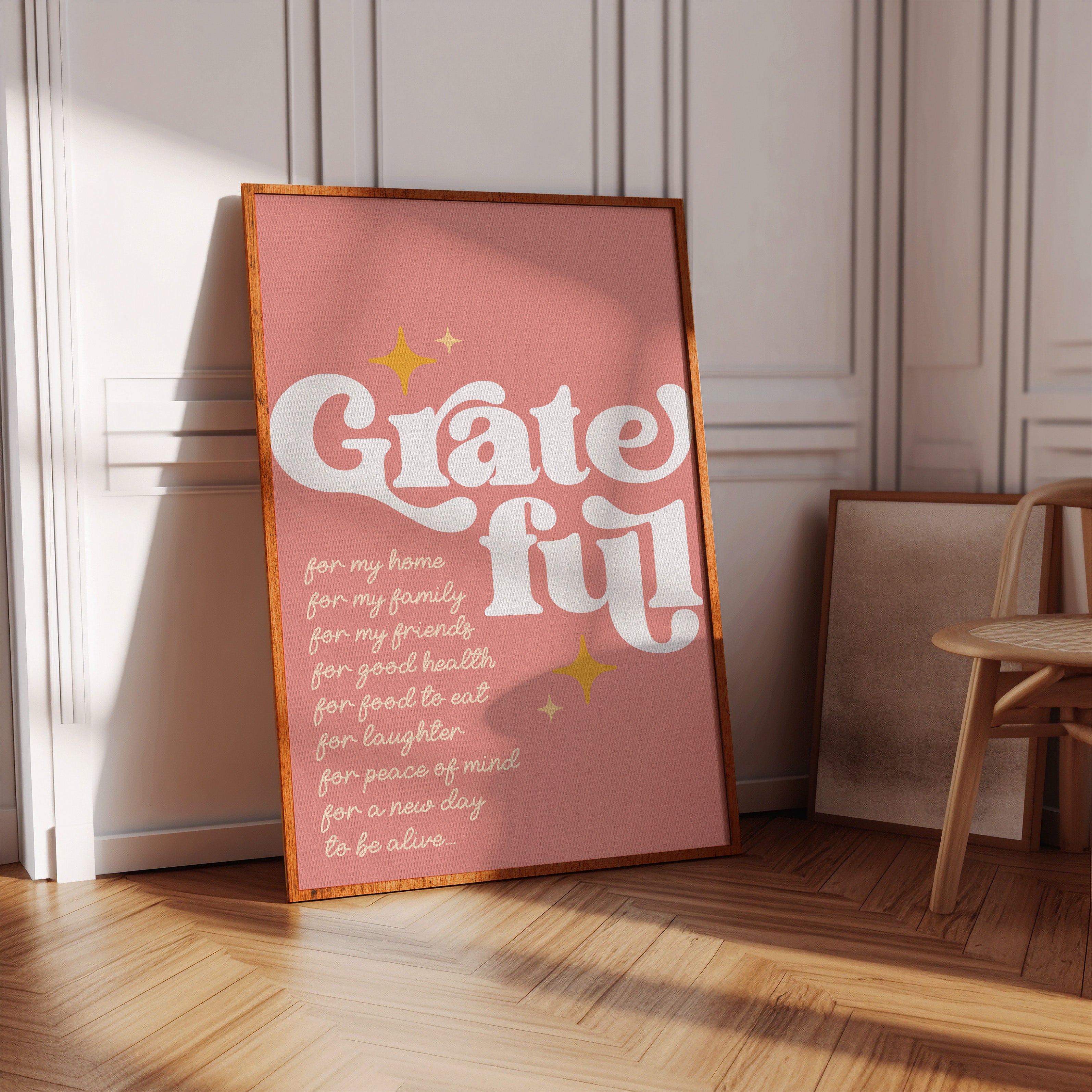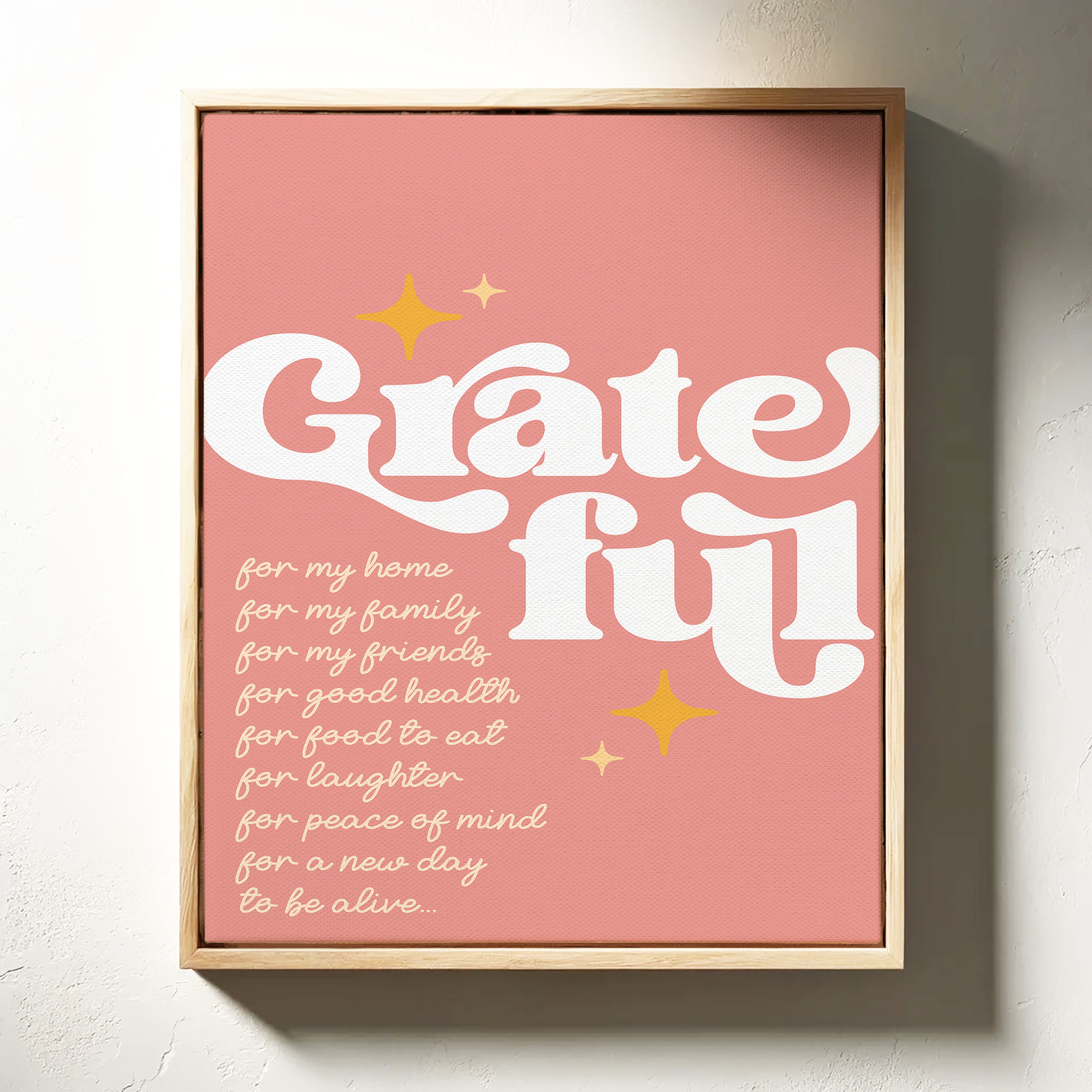Gentle words float against a warm coral backdrop, each line a tender reminder of life's simple treasures. This contemporary typography piece speaks to the heart of gratitude with its modern yet intimate design. The bold 'Grateful' anchors the composition while handwritten affirmations cascade below like a meditation, creating a visual rhythm of thankfulness. Stars twinkle with golden optimism, adding a touch of whimsy to this mindful manifesto. Perfect for creating a positive focal point in a breakfast nook, meditation space, or anywhere you begin your day. Let this piece serve as your daily reminder to pause and appreciate life's precious gifts.