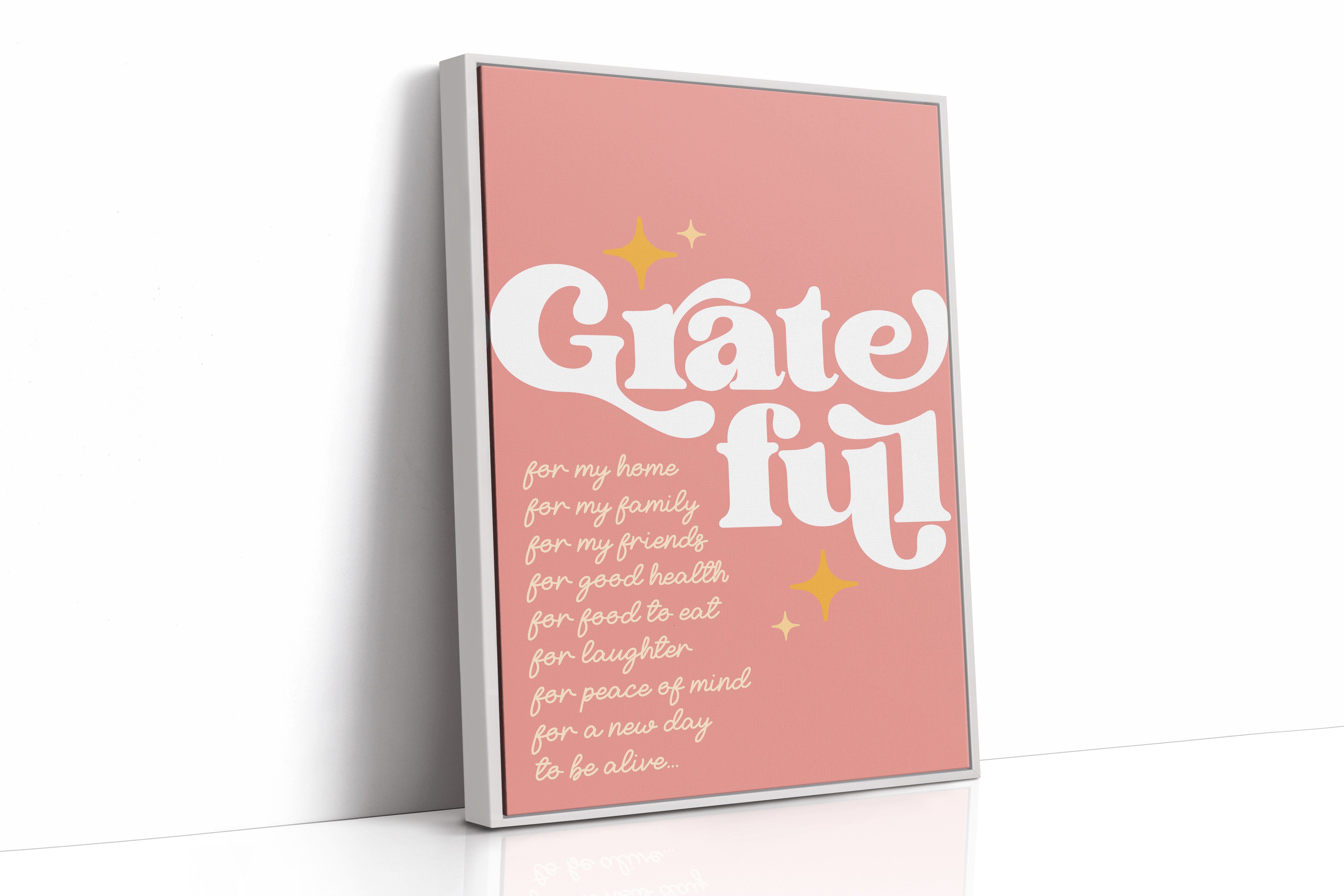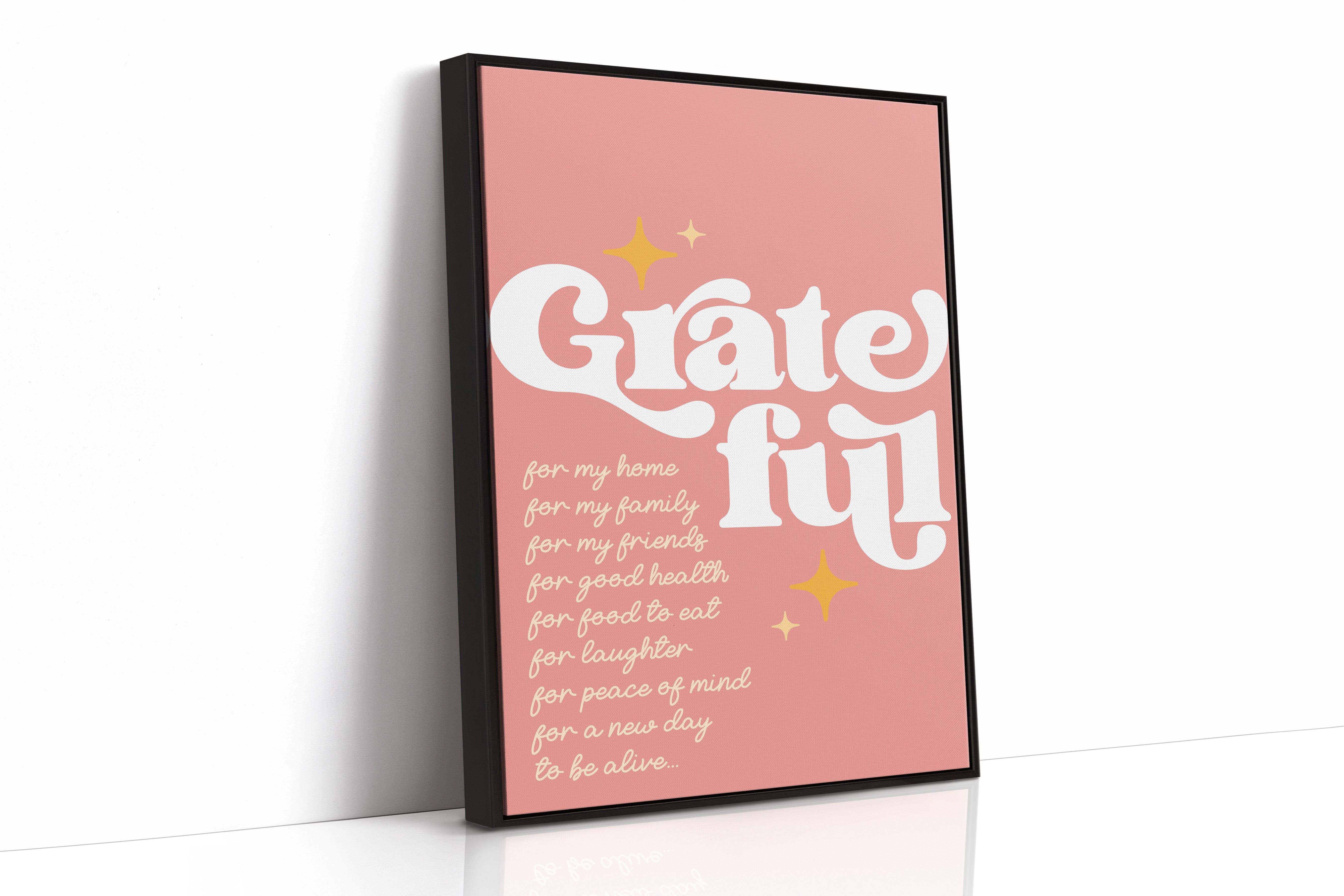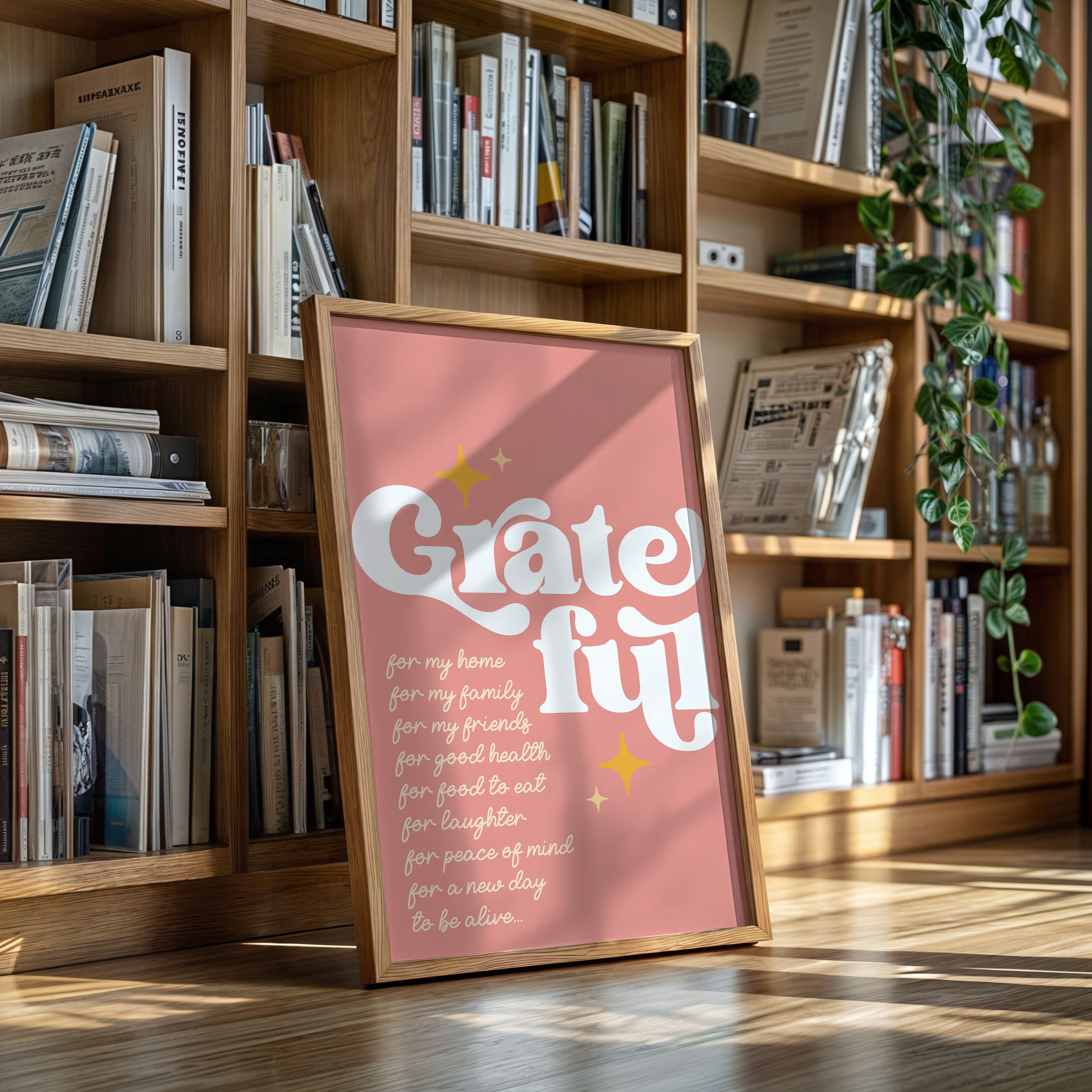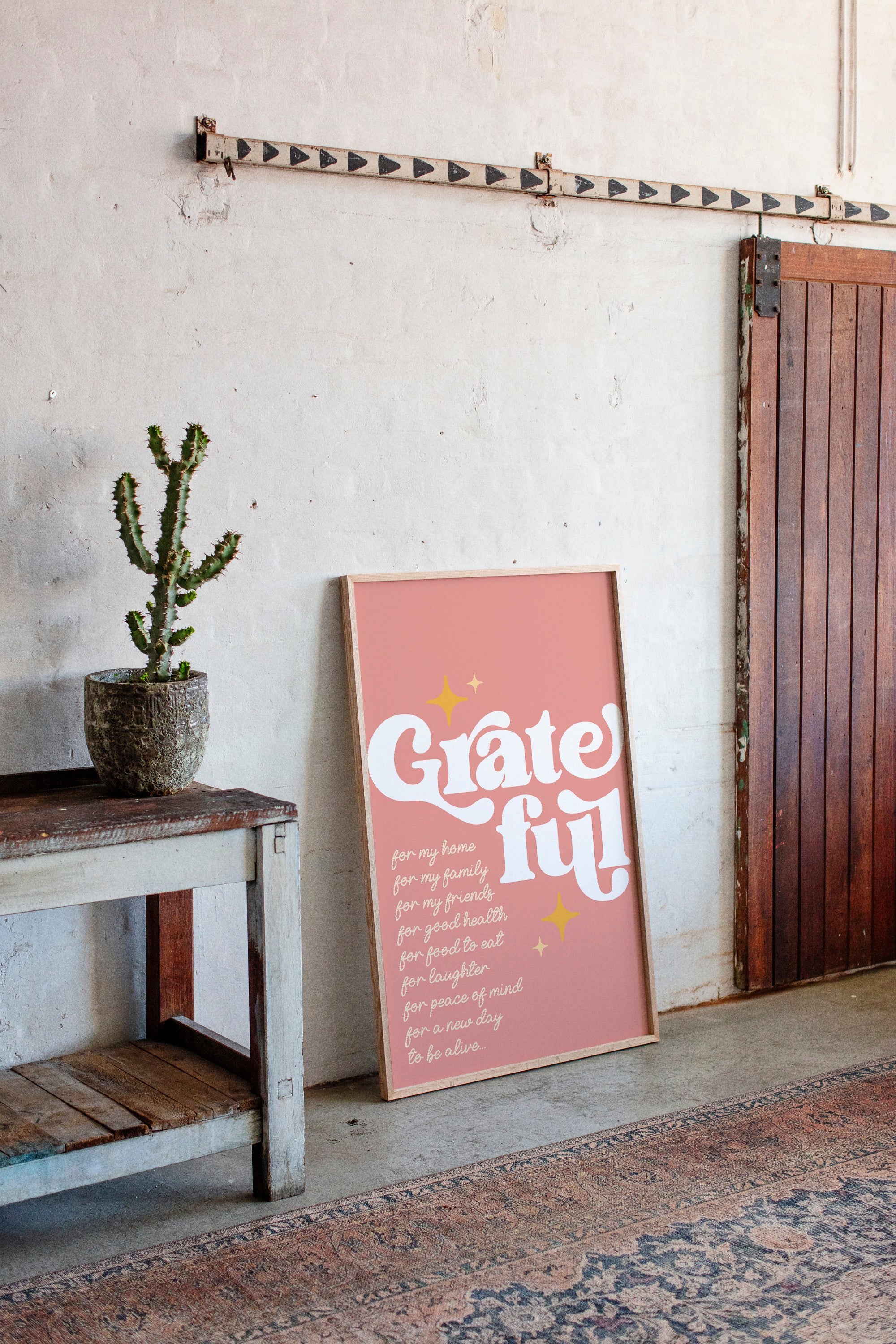 Gentle words float against a warm coral backdrop, each line a tender reminder of life's simple treasures. This contemporary typography piece speaks to the heart of gratitude with its modern yet intimate design. The bold 'Grateful' anchors the composition while handwritten affirmations cascade below like a meditation, creating a visual rhythm of thankfulness. Stars twinkle with golden optimism, adding a touch of whimsy to this mindful manifesto. Perfect for creating a positive focal point in a breakfast nook, meditation space, or anywhere you begin your day. Let this piece serve as your daily reminder to pause and appreciate life's precious gifts.